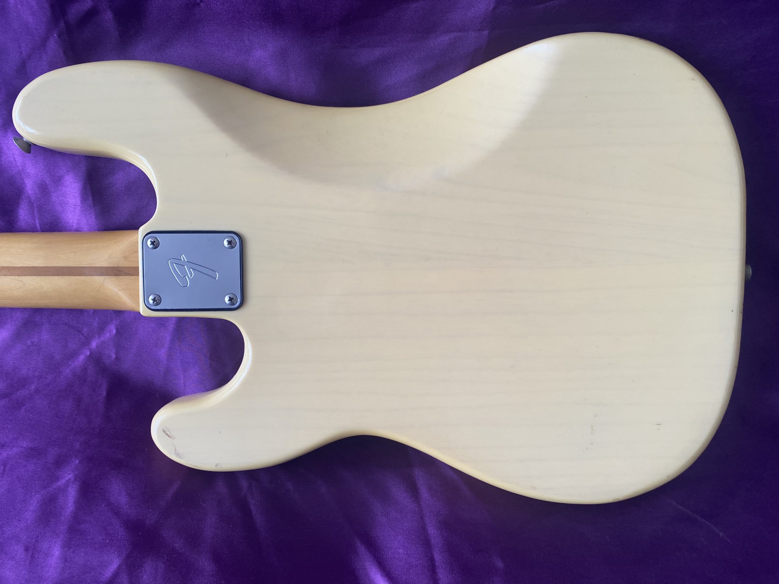 I undertook a great deal of research to try and get to the bottom of this guitar. This fretless Fender Precision was manufactured in 1977 and bought second hand by me in 1978. It is highly unusual in having a fretless ebony veneer fingerboard. At first, I thought that someone had taken a perfectly good workhorse Fender Precision bass, removed the standard rosewood fretted fingerboard and replaced it with an ebony fretless one. This was reinforced by the fact there are no fret markers and the dot markers on the edge of the neck are positioned where they normally are (between where the frets would be). It transpires that Precisions had very occasionally featured factory ebony fingerboards, rather than the more common rosewood or maple, going back to the 1950s, so there is precedent. As mentioned above, some came with fretless ebony fingerboards. Fender has released other Precisions with ebony fingerboards over the years, for instance the Tony Franklin Artist bass (also fretless). The conclusion is that the fingerboard is factory original to the guitar. Whether it was special order or not, I have no idea. It does, however, make this particular Precision either very rare or possibly unique (and cool). It seems ironic that a fretted bass to enable precise intonation is made in fretless specification that is inherently ‘imprecise’. Hey ho. While this isn’t quite in Jaco Pastorius territory (he played a fretless Fender Jazz Bass), the same vibe can be conjured up in a flash, especially with flatwound strings. There’s something about the instrument that means you play it differently. I wish I could do it justice. With the faded white (actually a creamy yellow) body and black scratchplate, the bare black fingerboard seems to blend oh so well to the eye. The original chrome pickup and bridge covers, as well as the thumb rest are also part of the package. As it isn’t a go‑to instrument, its condition is very, very good for its age. To think that back in the 1970s, I was contemplating stripping the polyester finish!