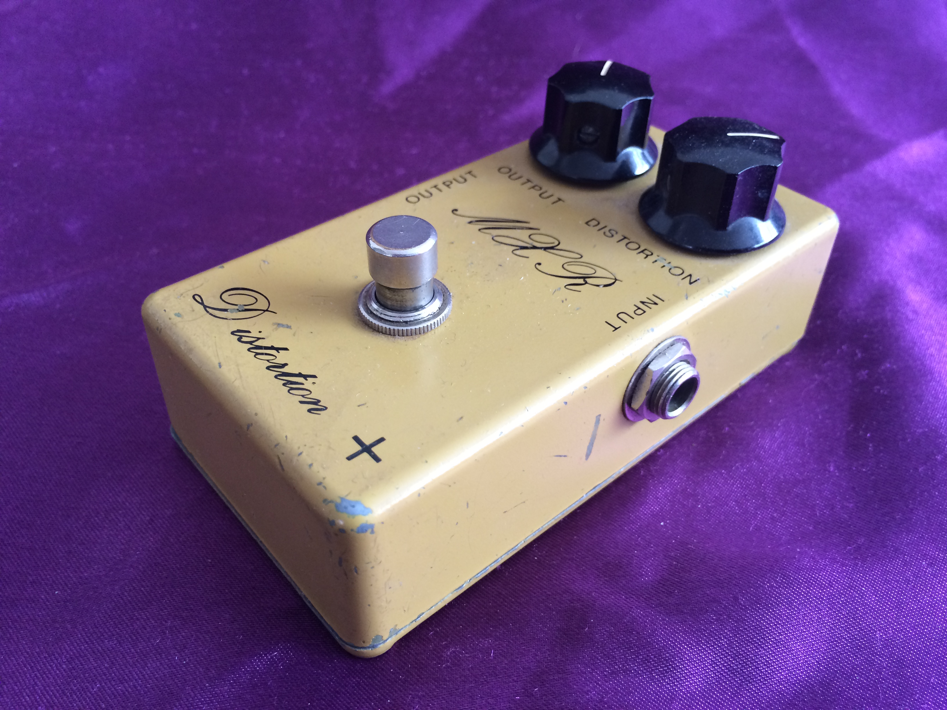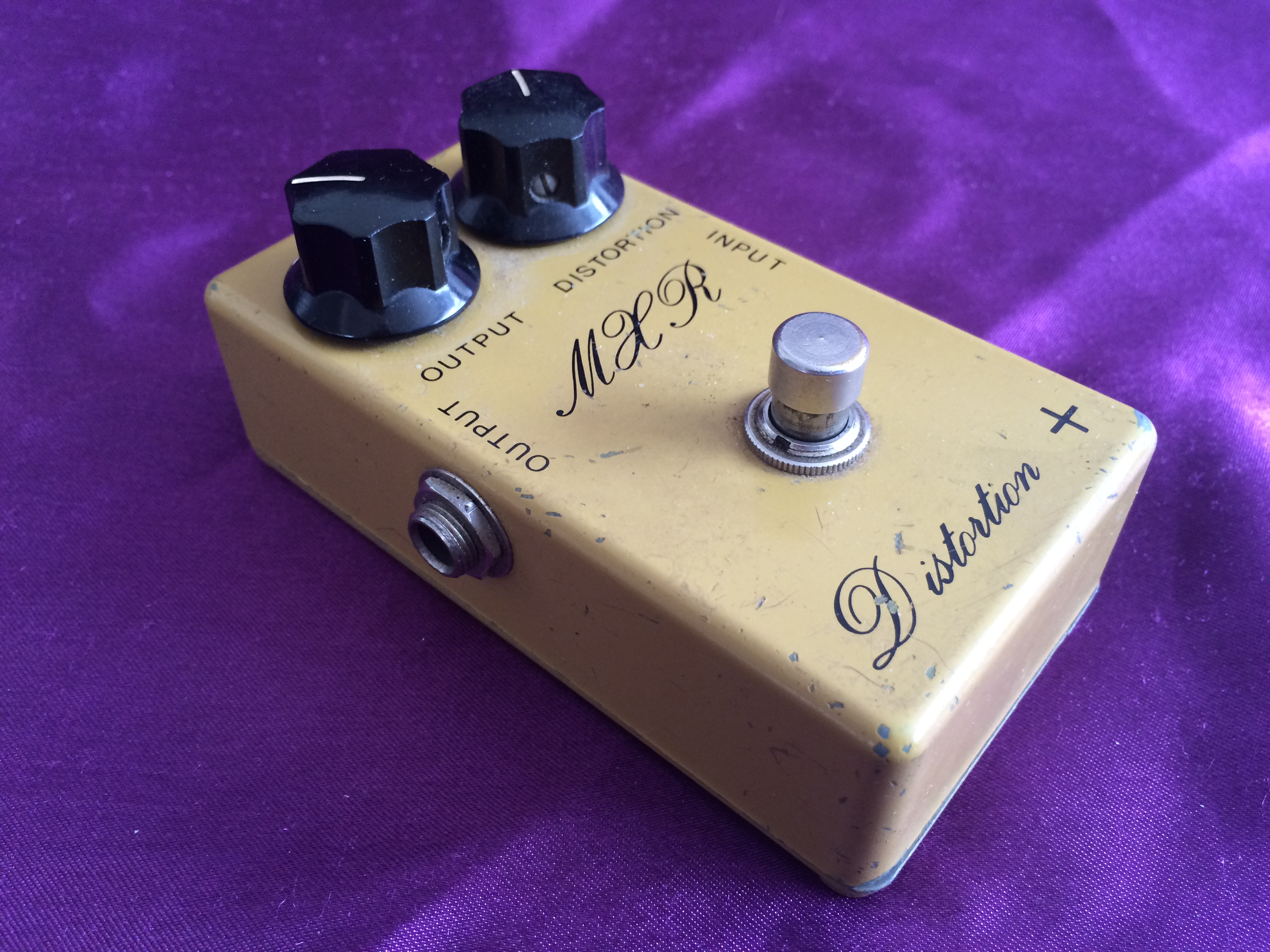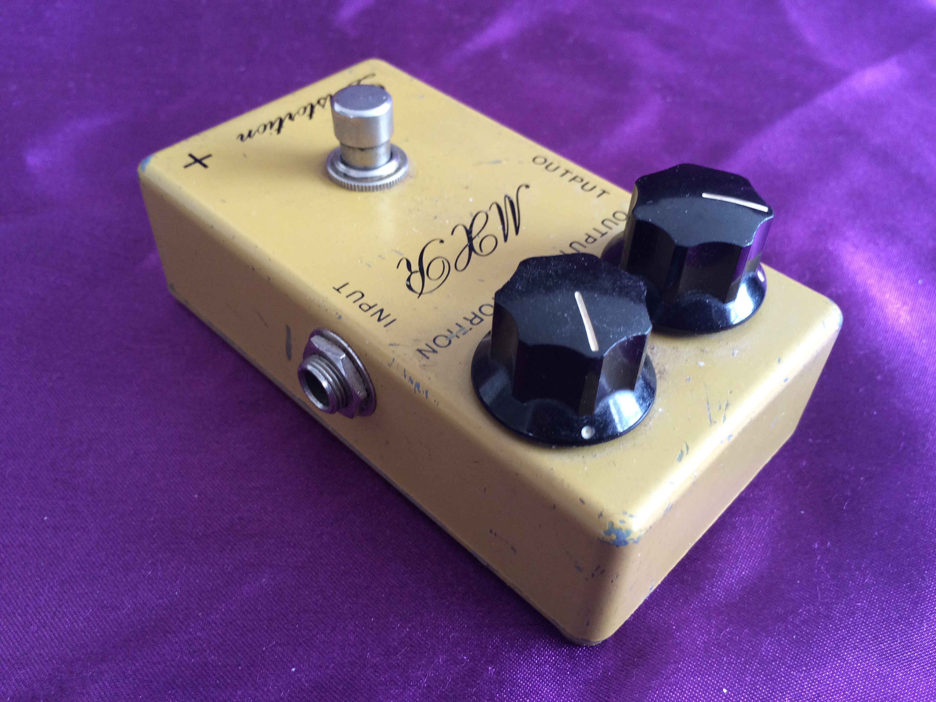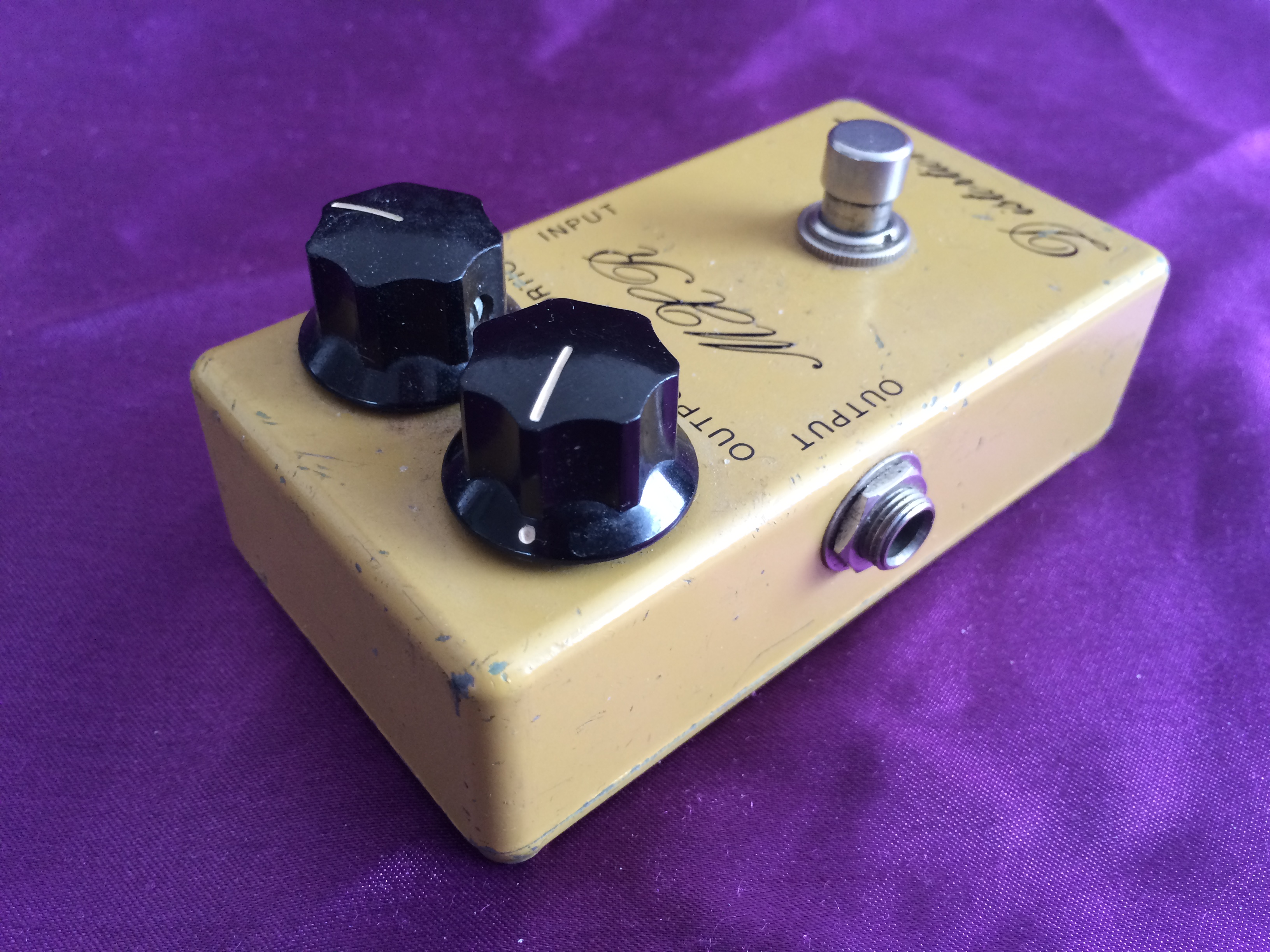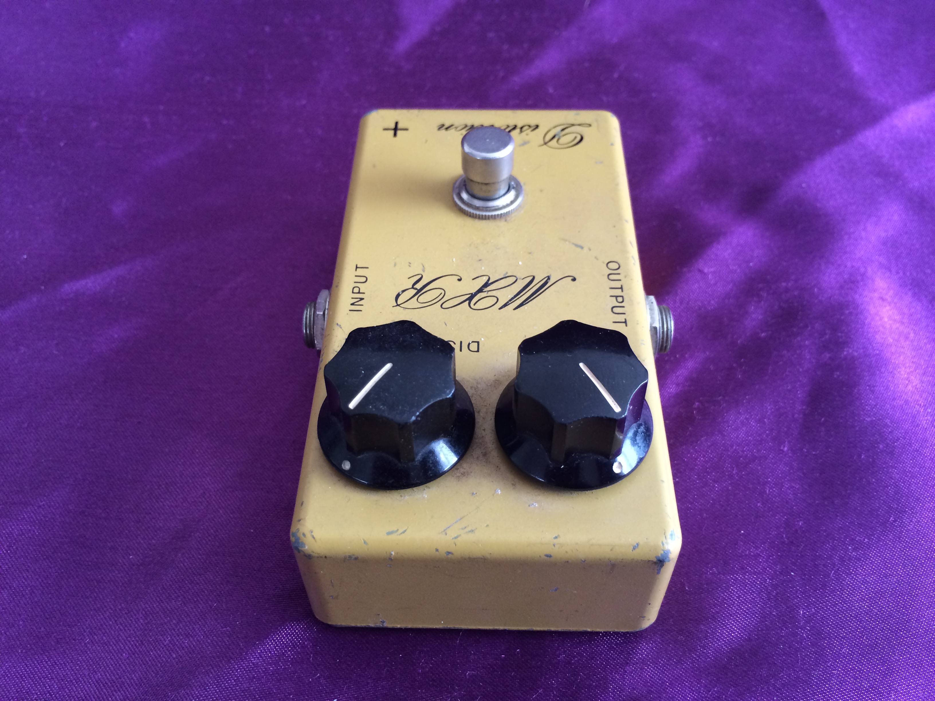 This rather special little ‘script logo’ MXR Distortion + from 1975 is dirty in both its colour and its tone. Despite its grubby hue, it is in pretty good shape for its age, being all‑original except for 3 missing baseplate screws. A previous owner has also kindly (not!) drilled two small holes in the base plate, presumably for pedalboard mounting, which is a shame. None of this affects the classic growls emanating from this diminutive box. The amount of gain available suits a wide range of musical styles and the simple design with no tone control possibly aids rather than hinders use. Setting the controls to low distortion and high volume give it a great clean‑ish boost. If you want to recreate the sounds of early 1970s rock, take a great vintage guitar, add a vintage valve amp, sprinkle with some vintage MXR grit and away you go. While not one the very earliest ‘Bud box’ models, this cool mid-1970s wild child is now a pretty hot property. Follow the script…