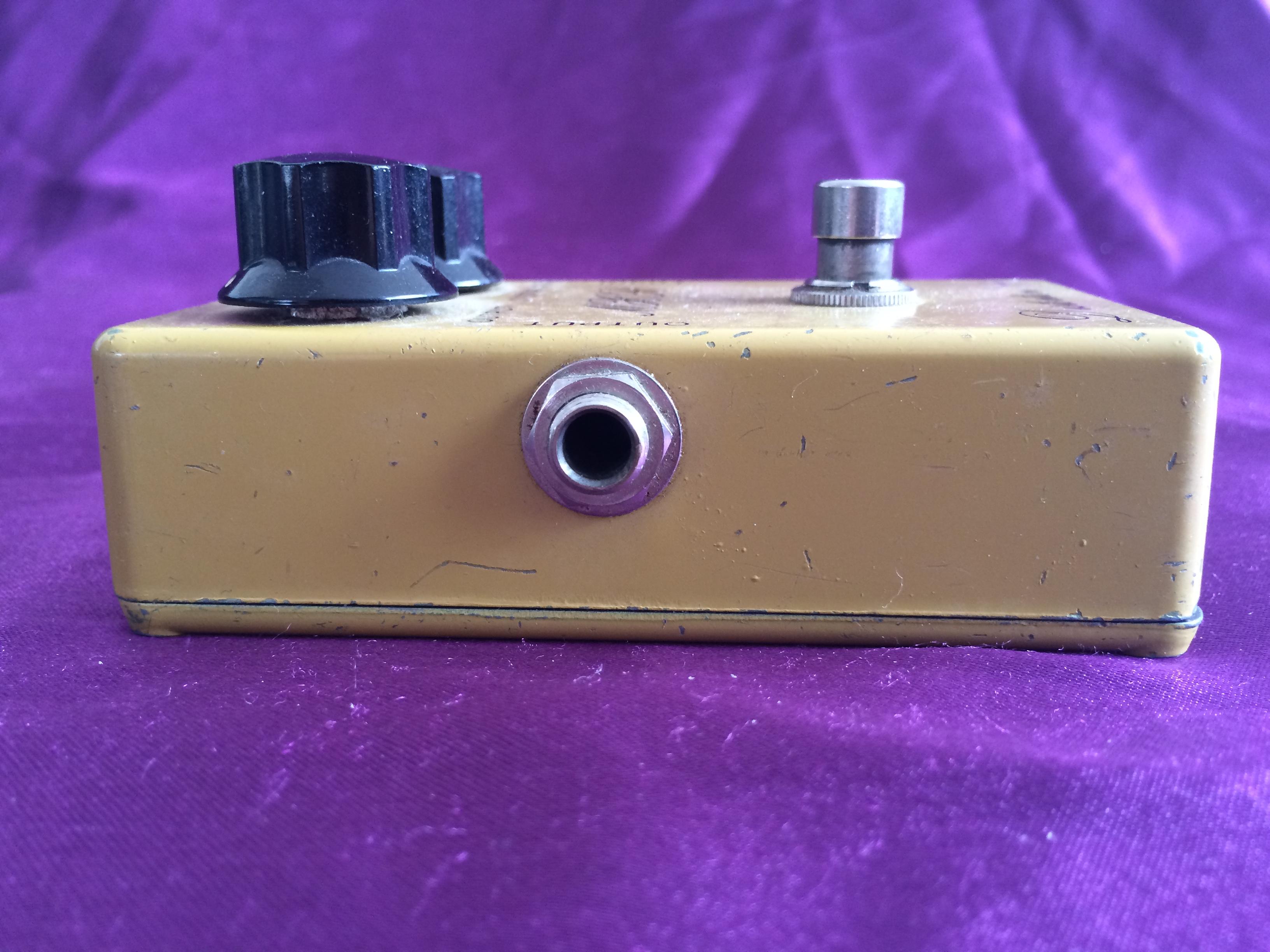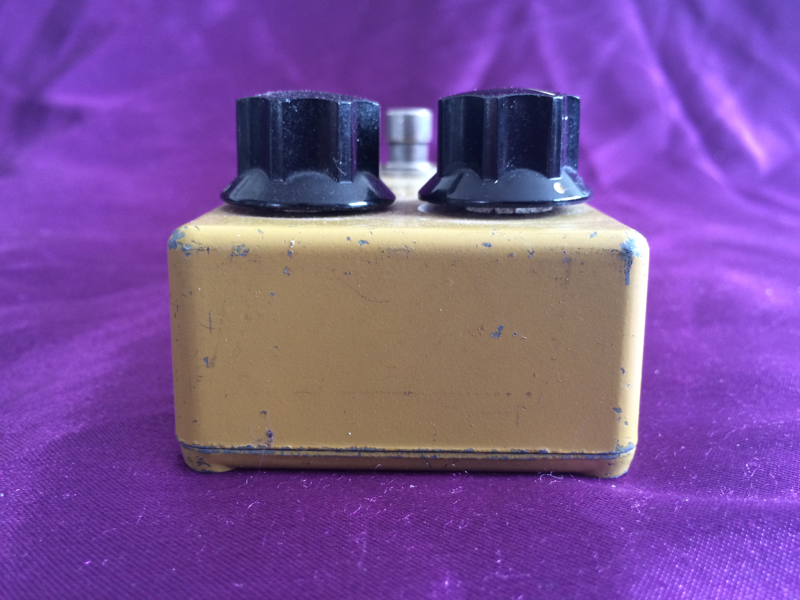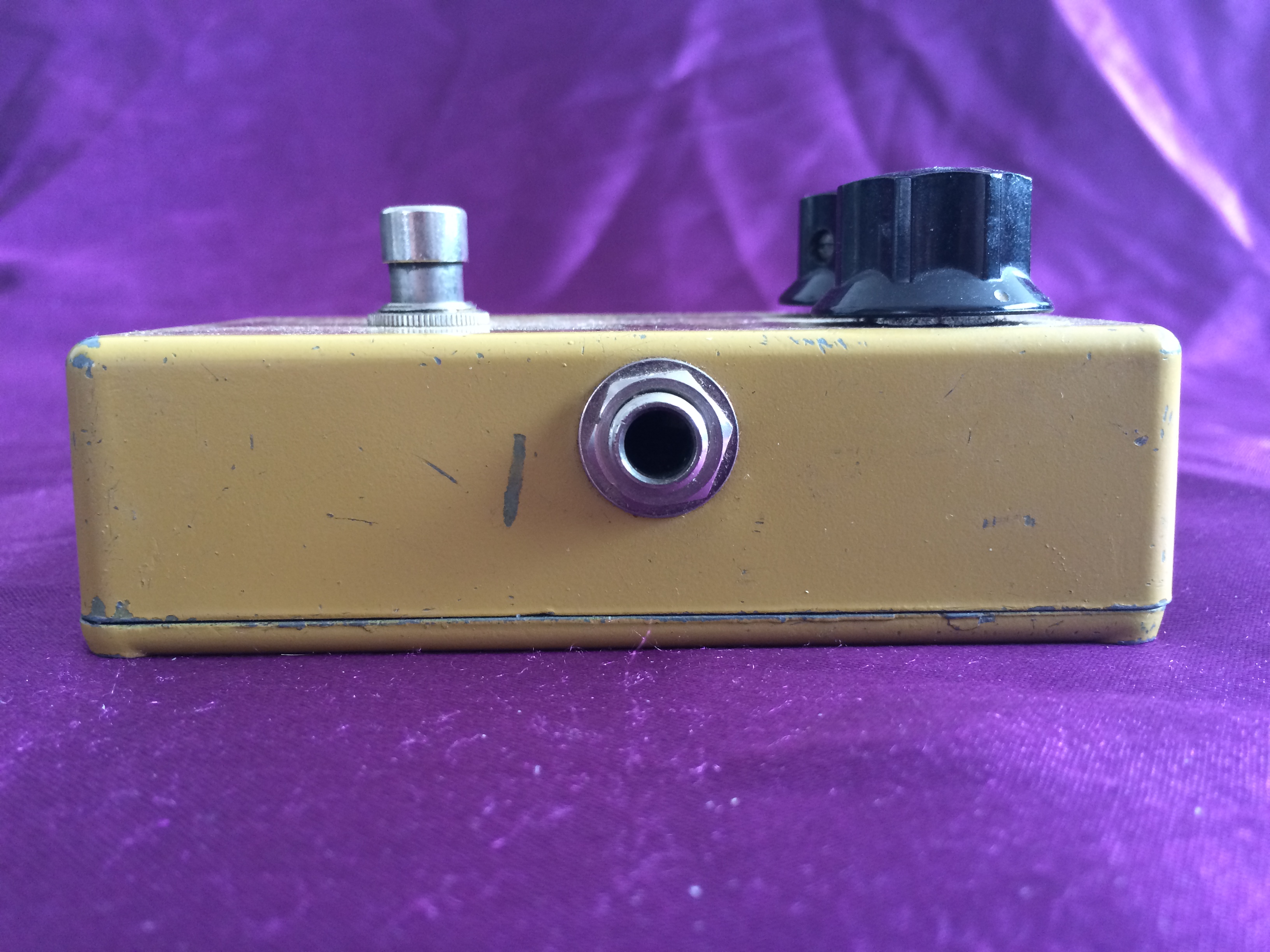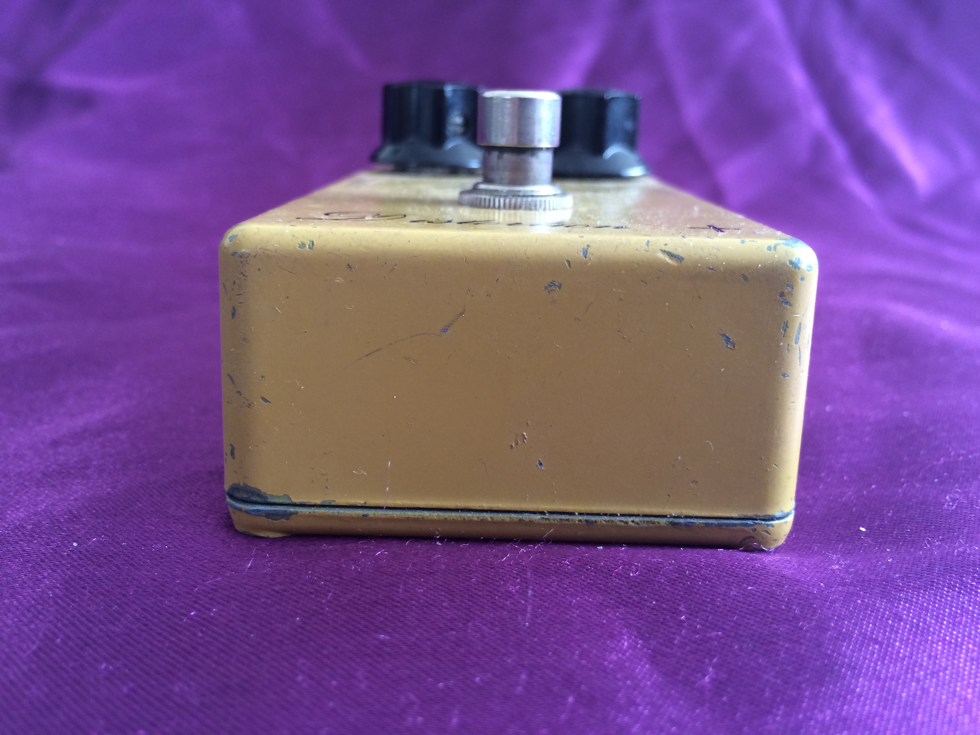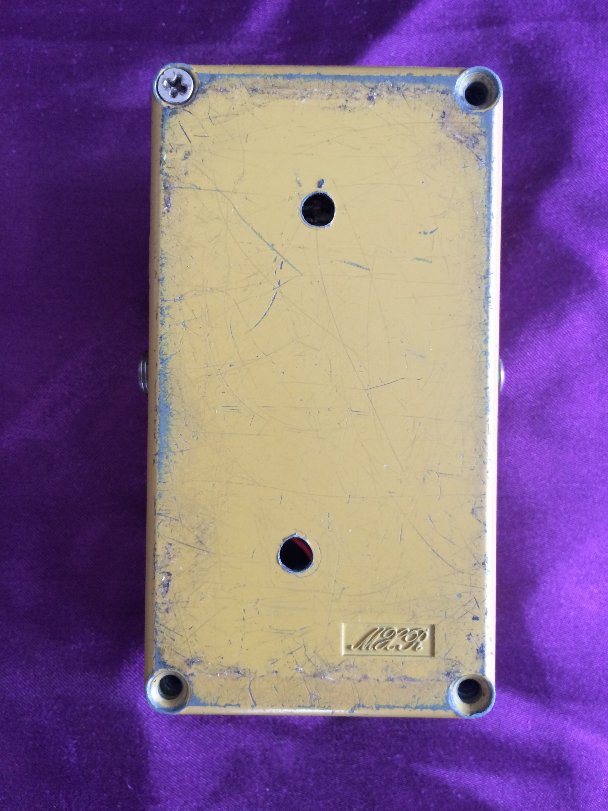 This rather special little ‘script logo’ MXR Distortion + from 1975 is dirty in both its colour and its tone. Despite its grubby hue, it is in pretty good shape for its age, being all‑original except for 3 missing baseplate screws. A previous owner has also kindly (not!) drilled two small holes in the base plate, presumably for pedalboard mounting, which is a shame. None of this affects the classic growls emanating from this diminutive box. The amount of gain available suits a wide range of musical styles and the simple design with no tone control possibly aids rather than hinders use. Setting the controls to low distortion and high volume give it a great clean‑ish boost. If you want to recreate the sounds of early 1970s rock, take a great vintage guitar, add a vintage valve amp, sprinkle with some vintage MXR grit and away you go. While not one the very earliest ‘Bud box’ models, this cool mid-1970s wild child is now a pretty hot property. Follow the script…