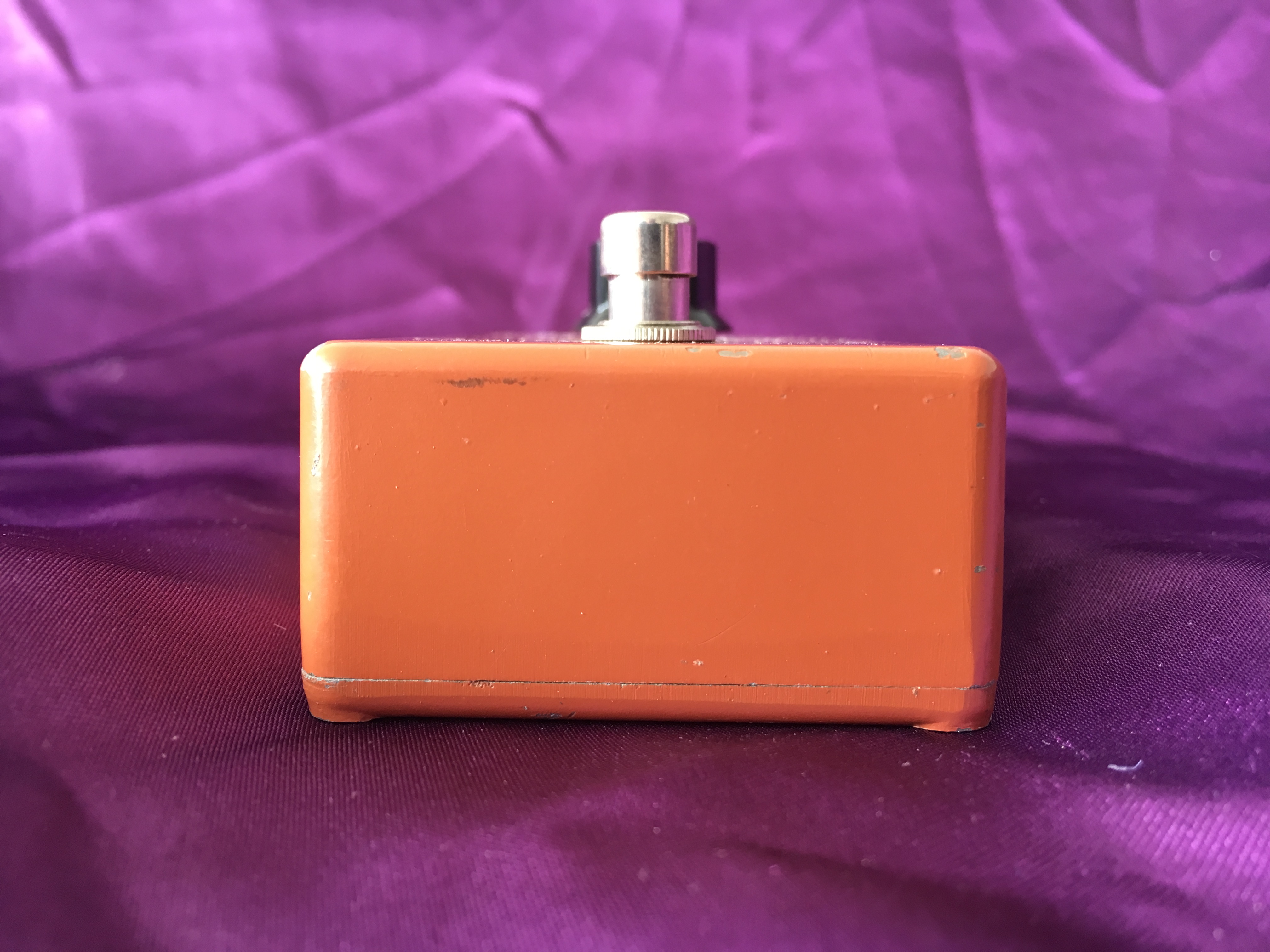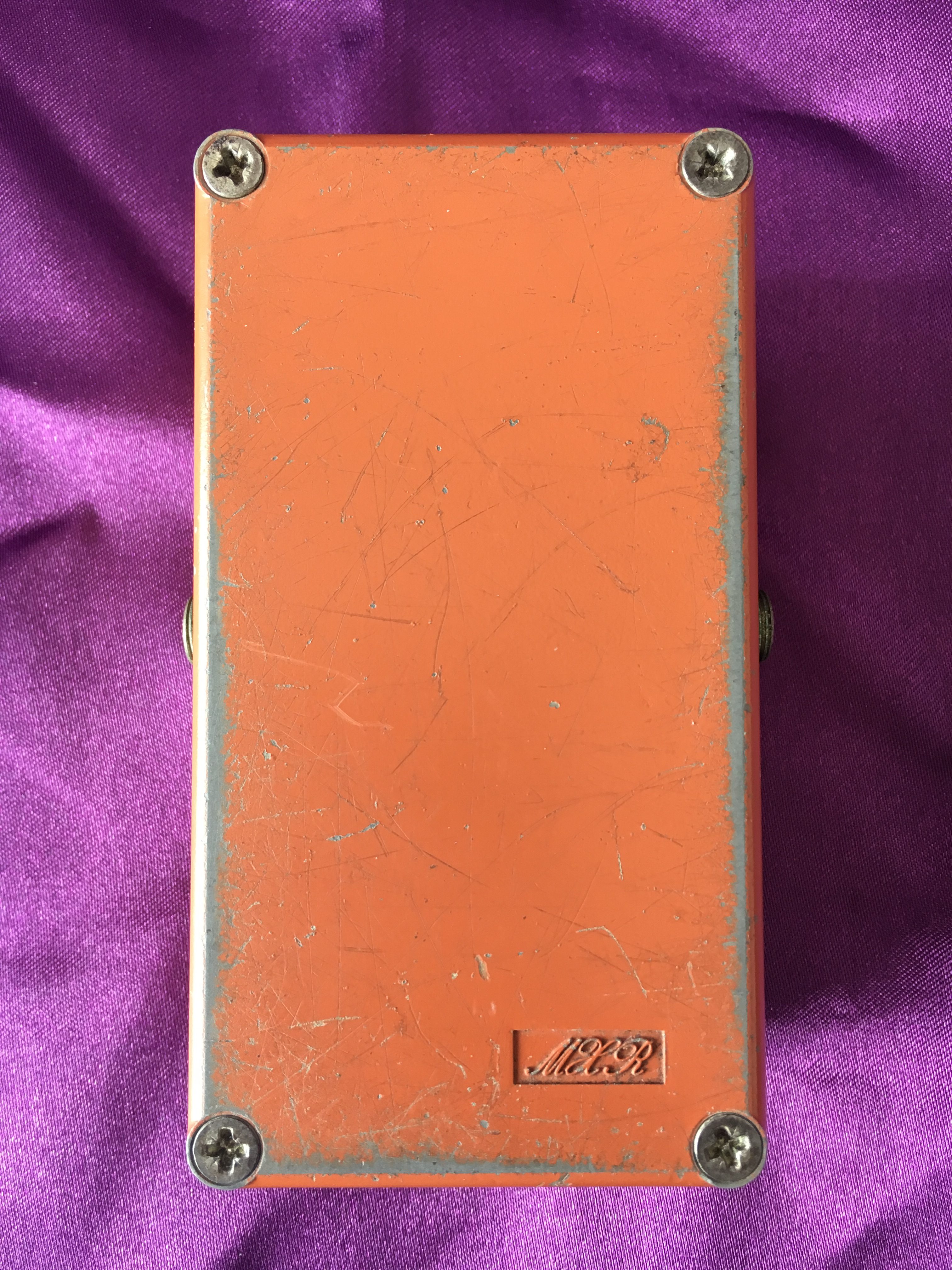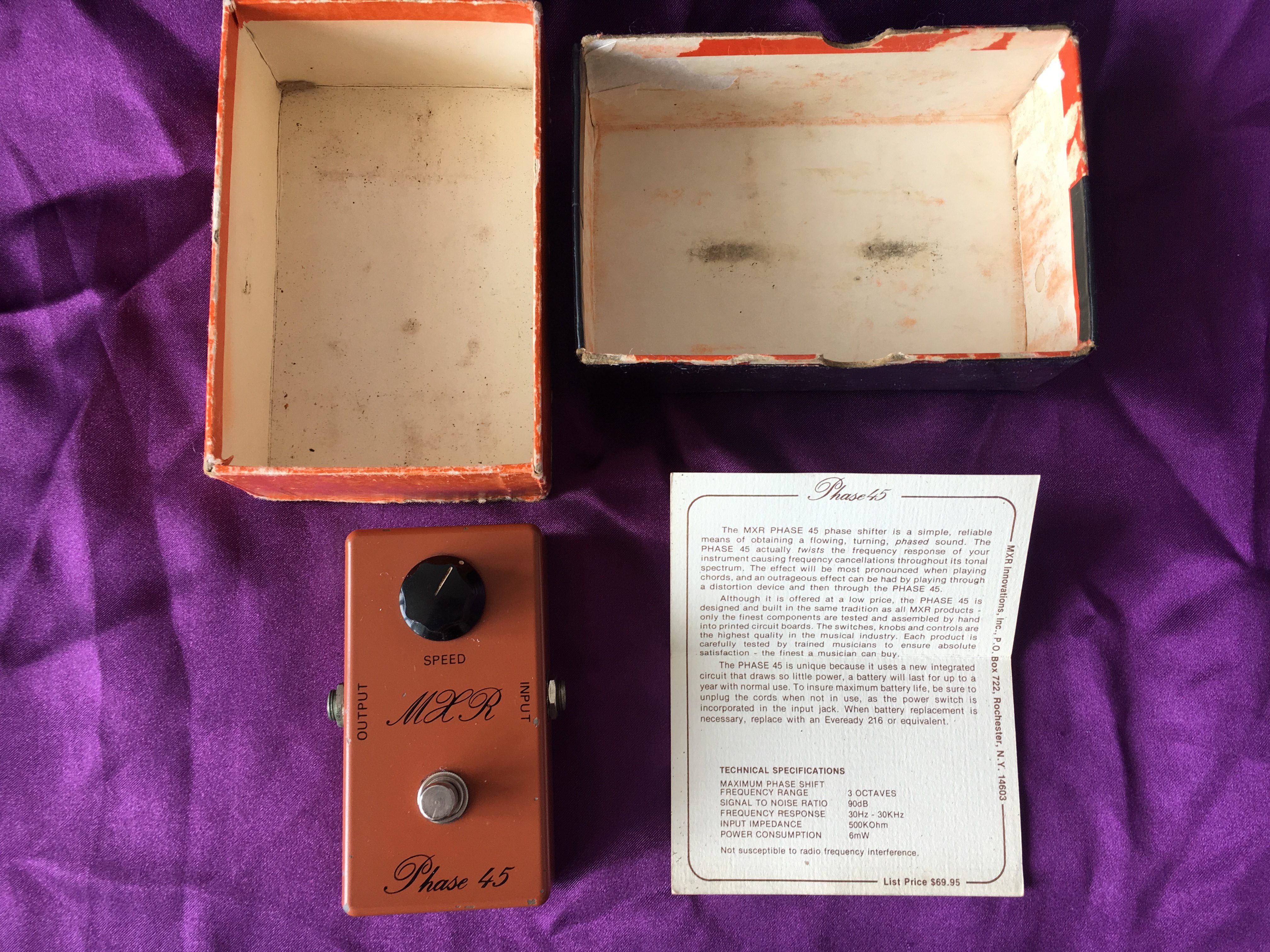 OK, so this solid little stomp box isn’t a Phase 90 but it is a fabulous all‑original ‘script’ logo MXR Phase 45 (MX‑105) – the pot actually dates to late 1975, so most likely it was built in 1976. The distinctive orange colour is apparently ‘Ditzler PPG M5148 Bold Orange’, as used by truck maker Ford in 1974. The dull tint is very characteristic of the early MXR pedals – later ones were presented in a much brighter hue. Compare this Phase 45 with CRAVE Guitars’ 1977 MXR Phase 90. Superficially, the only difference between the ‘45’ and the ‘90’ is the screen‑printed model number on the front. Internally and sonically, however, there are definitely some audible differences. The Phase 45 is more restrained while retaining the lovely subtle, sweet swirling analogue sounds for which the models are rightly renowned. The relatively shallow analogue phase sweep enhances the guitar’s tone and has superb chiming string definition without overpowering the original signal. The only control is the ‘speed’ knob to alter the rate of phase sweep and the pot works perfectly, nicely progressive with no sign of scratchiness. The Phase 45’s simplicity is also its strength and it is almost impossible to dial in a bad sound from it, even at extreme settings. It is easy to see why these effects have been seen on many discerning players’ pedalboards over the years. On the other hand, if you like tweaking and knob fiddling, this may not be the pedal for you. This particular example has been very well cared for and is in amazing unmolested original condition for its age, complete with all its original baseplate, screws and battery snap. It has only a few very minor surface marks to indicate that it has been around for more than four decades. Unusually, this one is also accompanied by its original box (albeit with the lid taped up) and documentation. To sum it up in one word… outstanding.