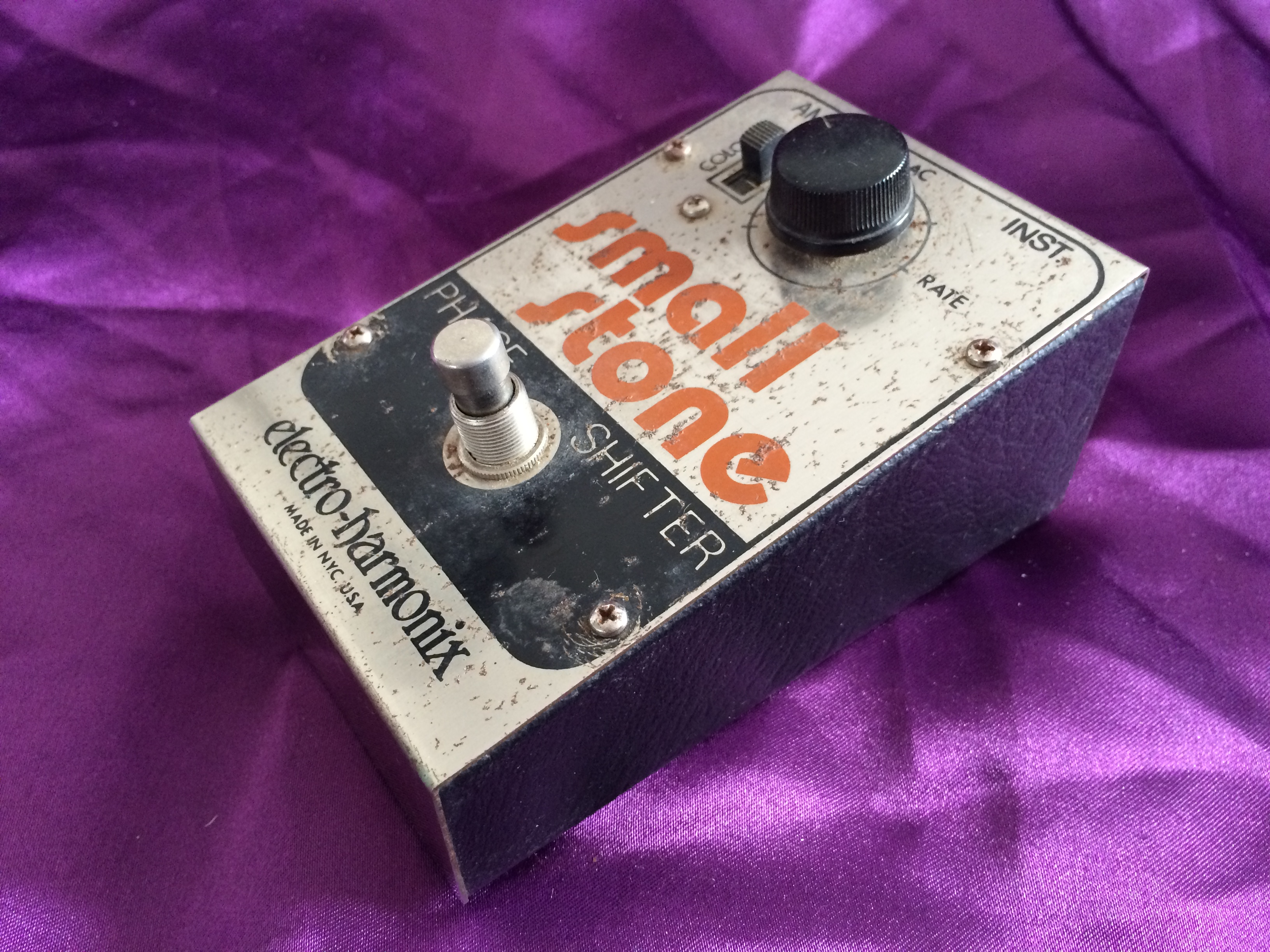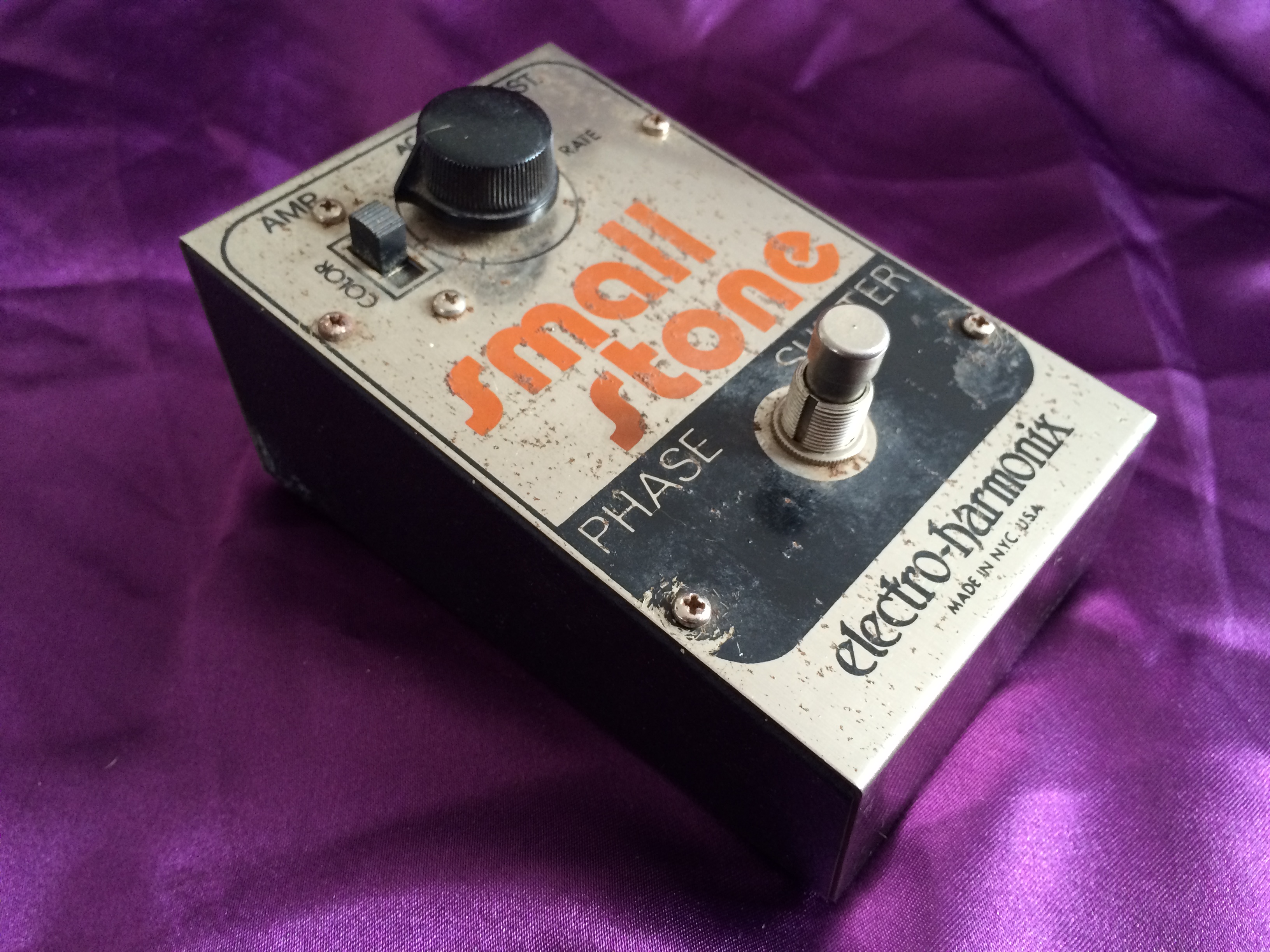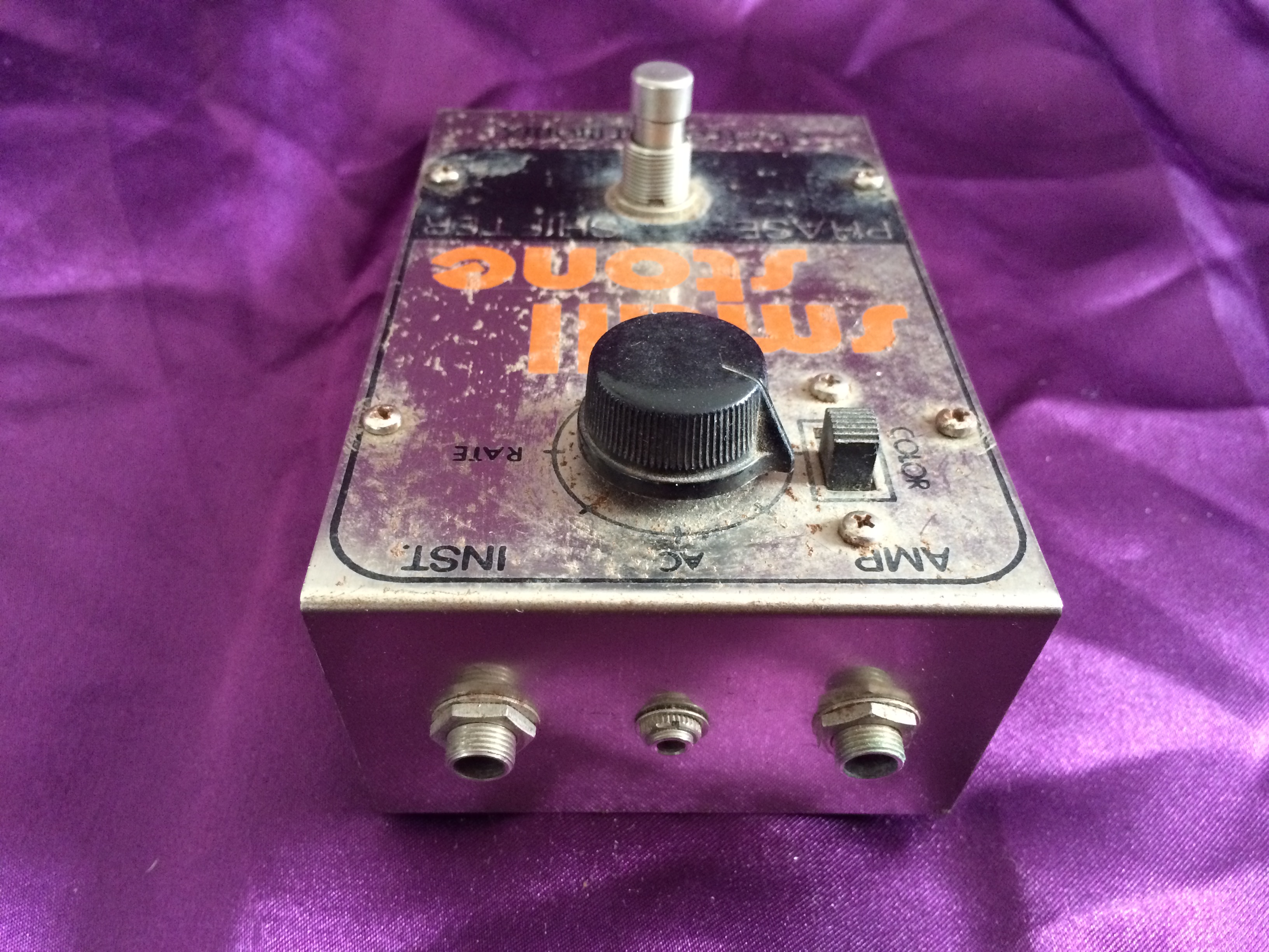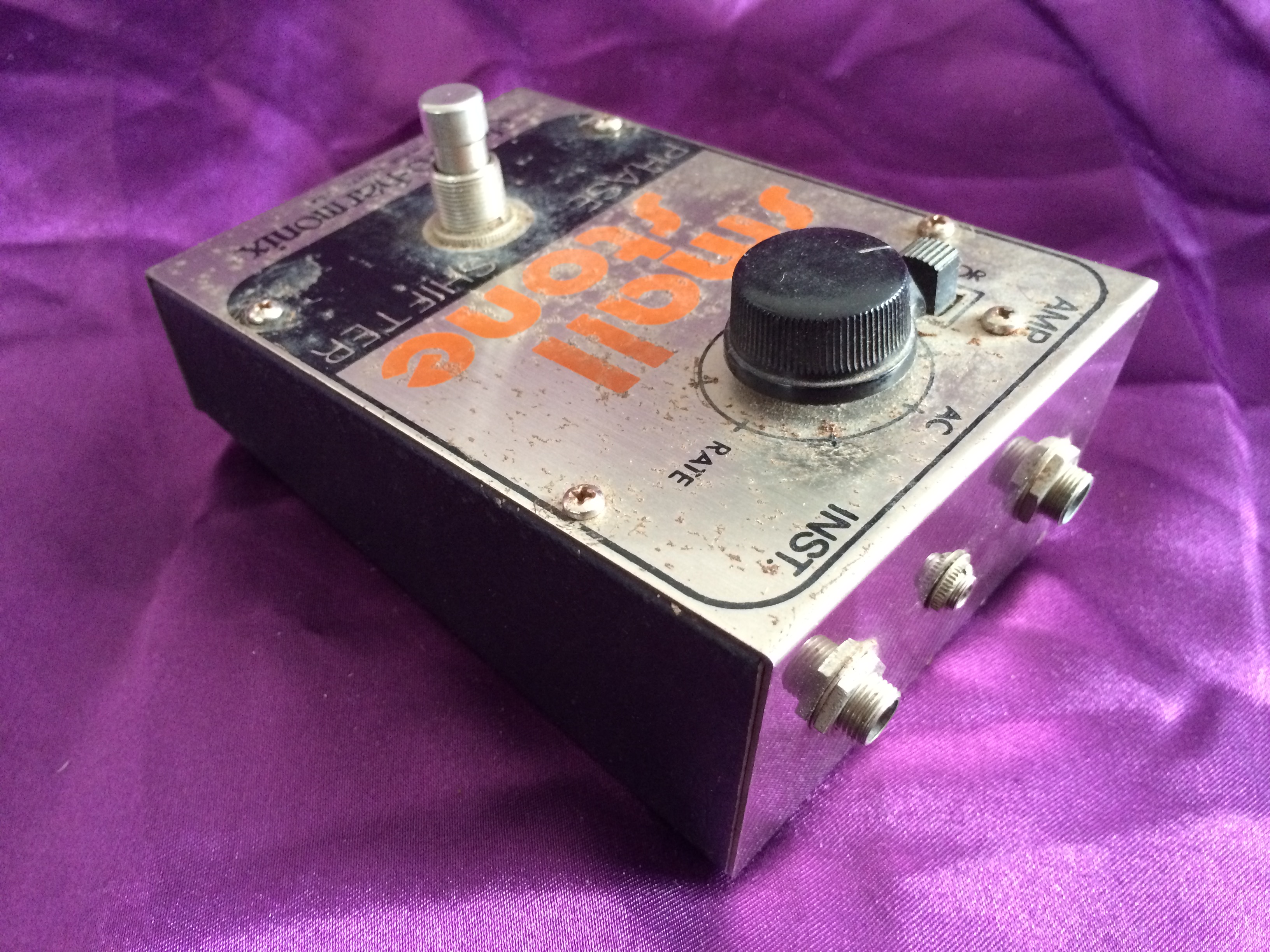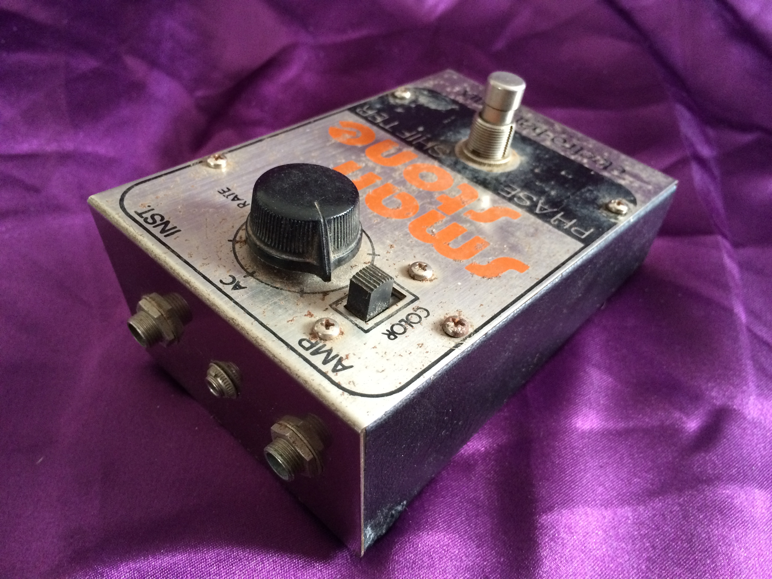 This Electro‑Harmonix Small Stone is another pedal that has been owned by me from new. I think this one is c.1977 or maybe 1978; it’s hard to tell after all this time. Whilst I admit to not being a great fan of phasers generally, the Electro‑Harmonix is something a bit special. There’s something about the Small and Bad Stone phasers that produces other worldly ambience like no other. This baby is all‑original and still works perfectly. The threads used to hold the pedal together have worn due to repeated battery replacement over the years but the original screws are amazingly still there (although loose). When I bought it, the shop didn’t have the original Small Stone box, so it came in an Electro‑Harmonix Y‑Triggered Filter box – I didn’t think twice about this at the time. Now, though, it would have been nice to have the matching box. Like Many 1970s Electro‑Harmonix stomp boxes, the chrome steel front is showing a smattering of small flecks of surface rust, despite it being well looked after. Minor cosmetics aside the Small Stone continues to provide those amazing vintage analogue sounds that have been heard on so many stages and recordings over the decades.