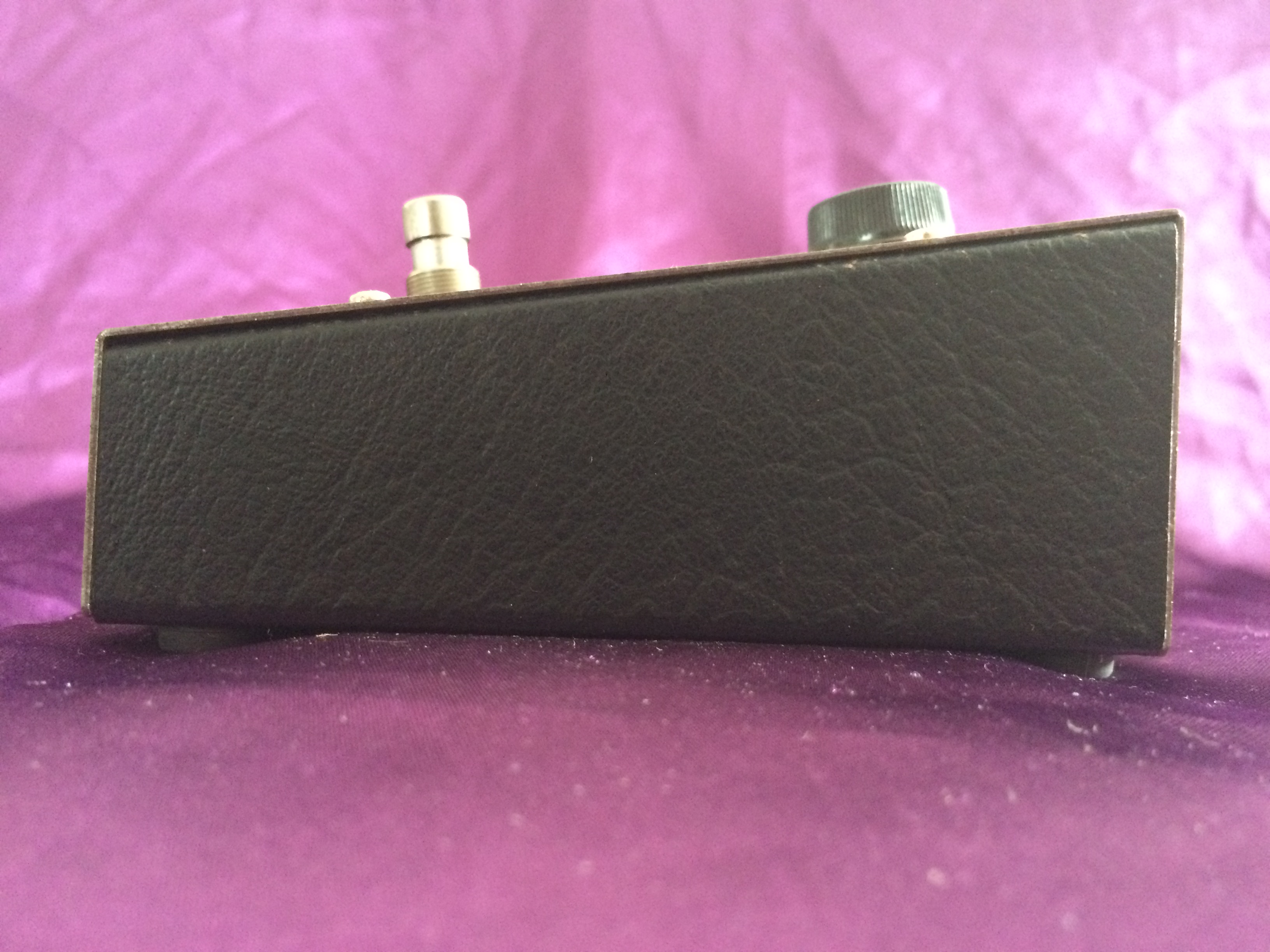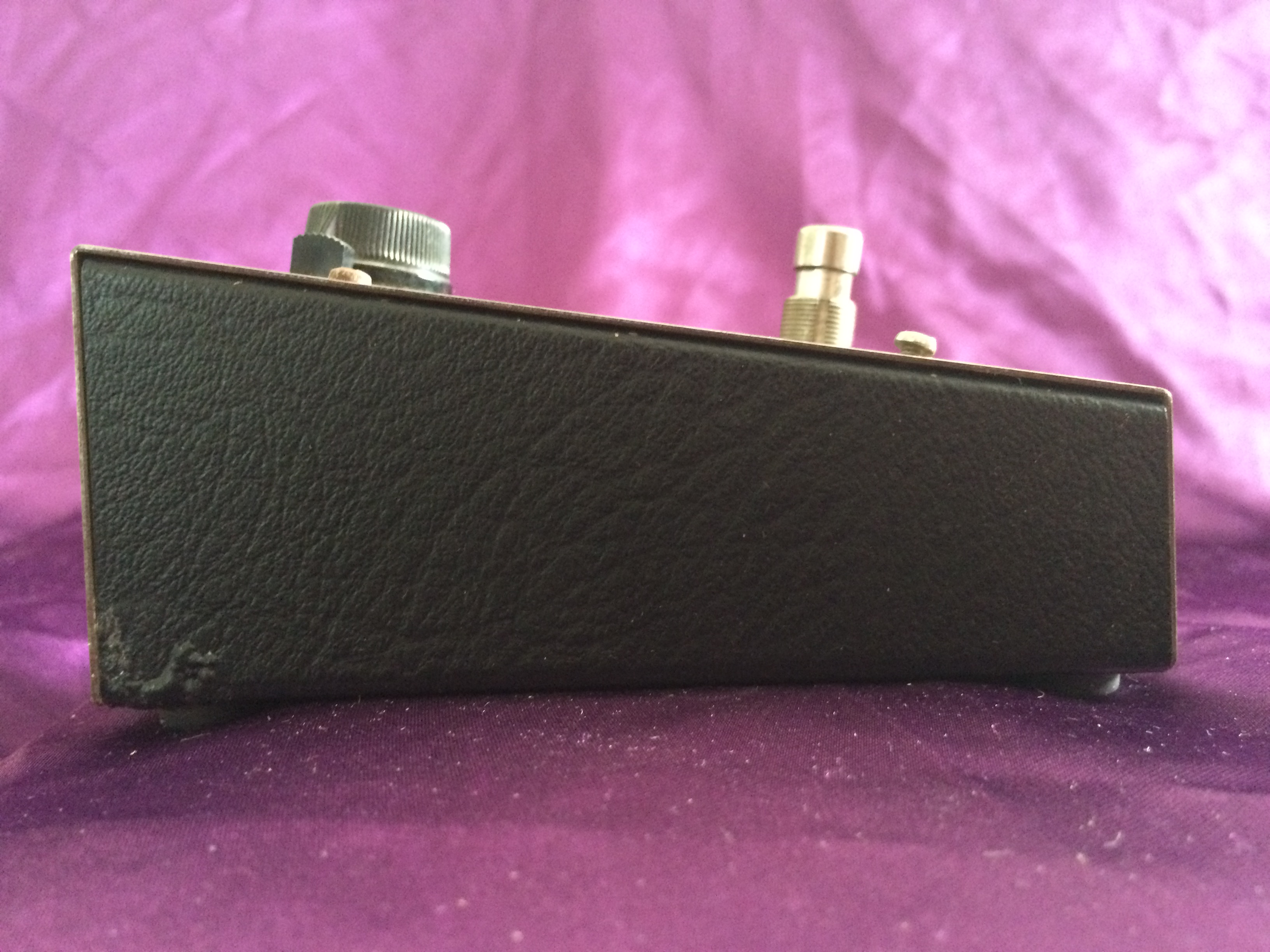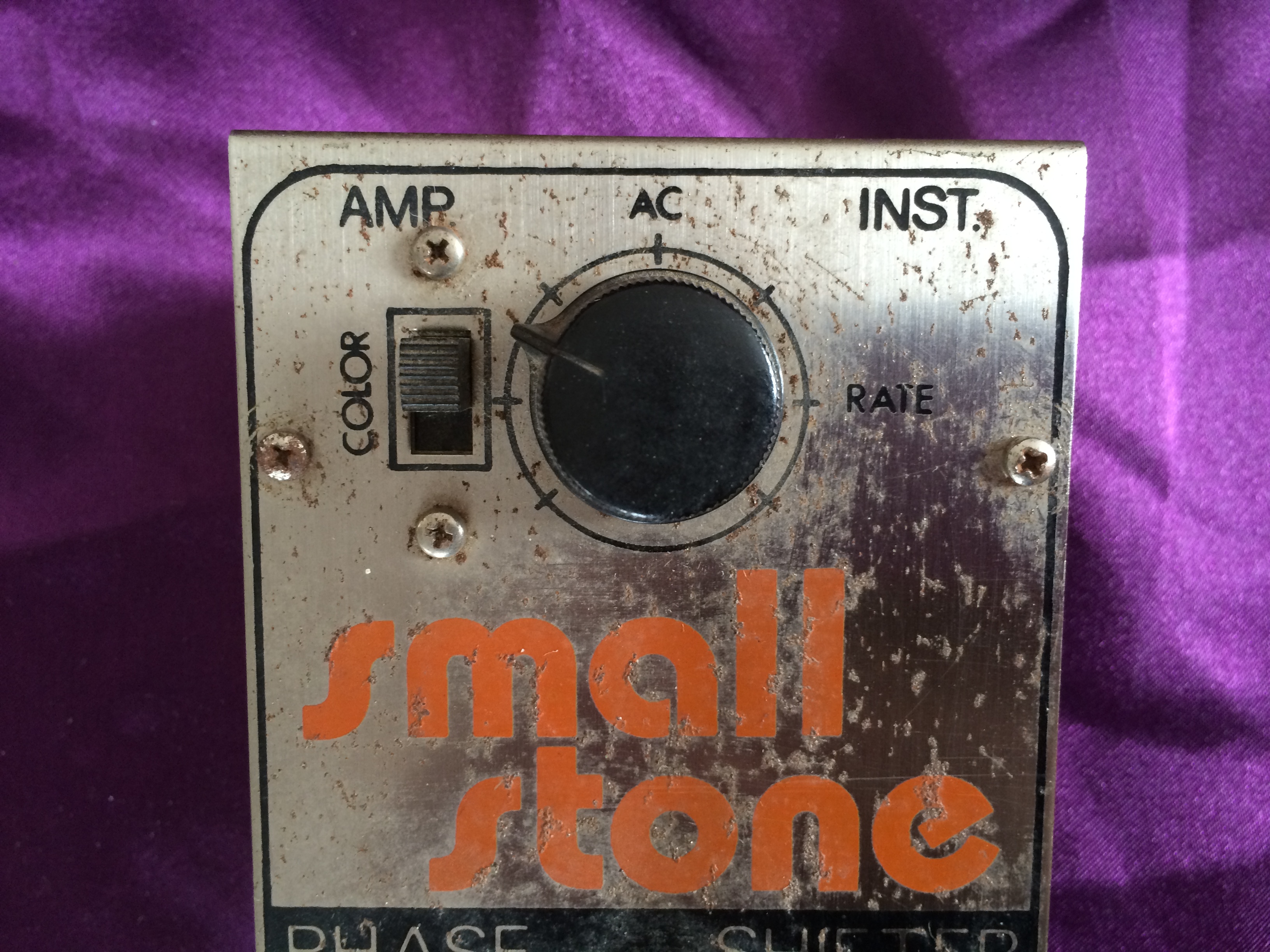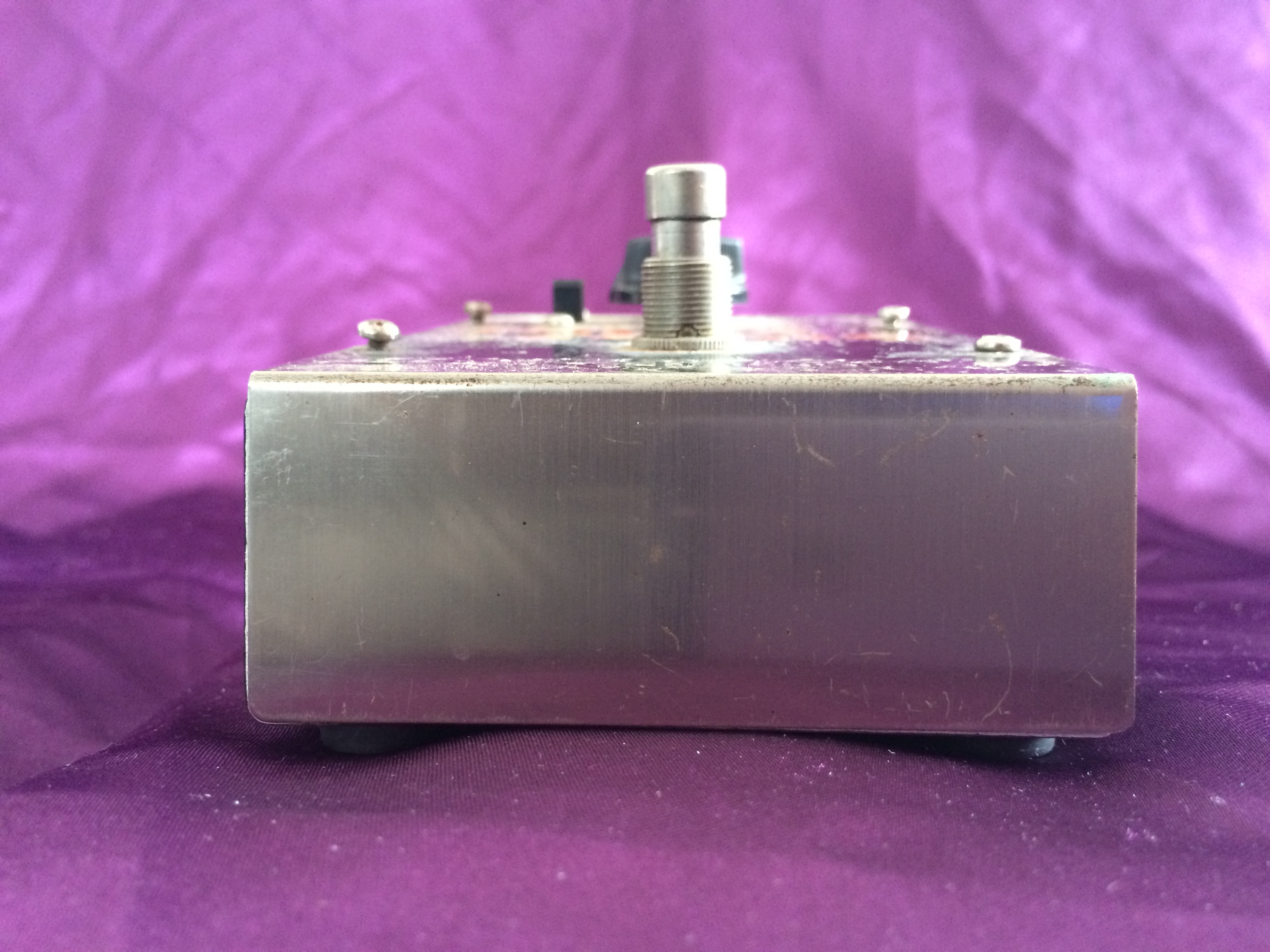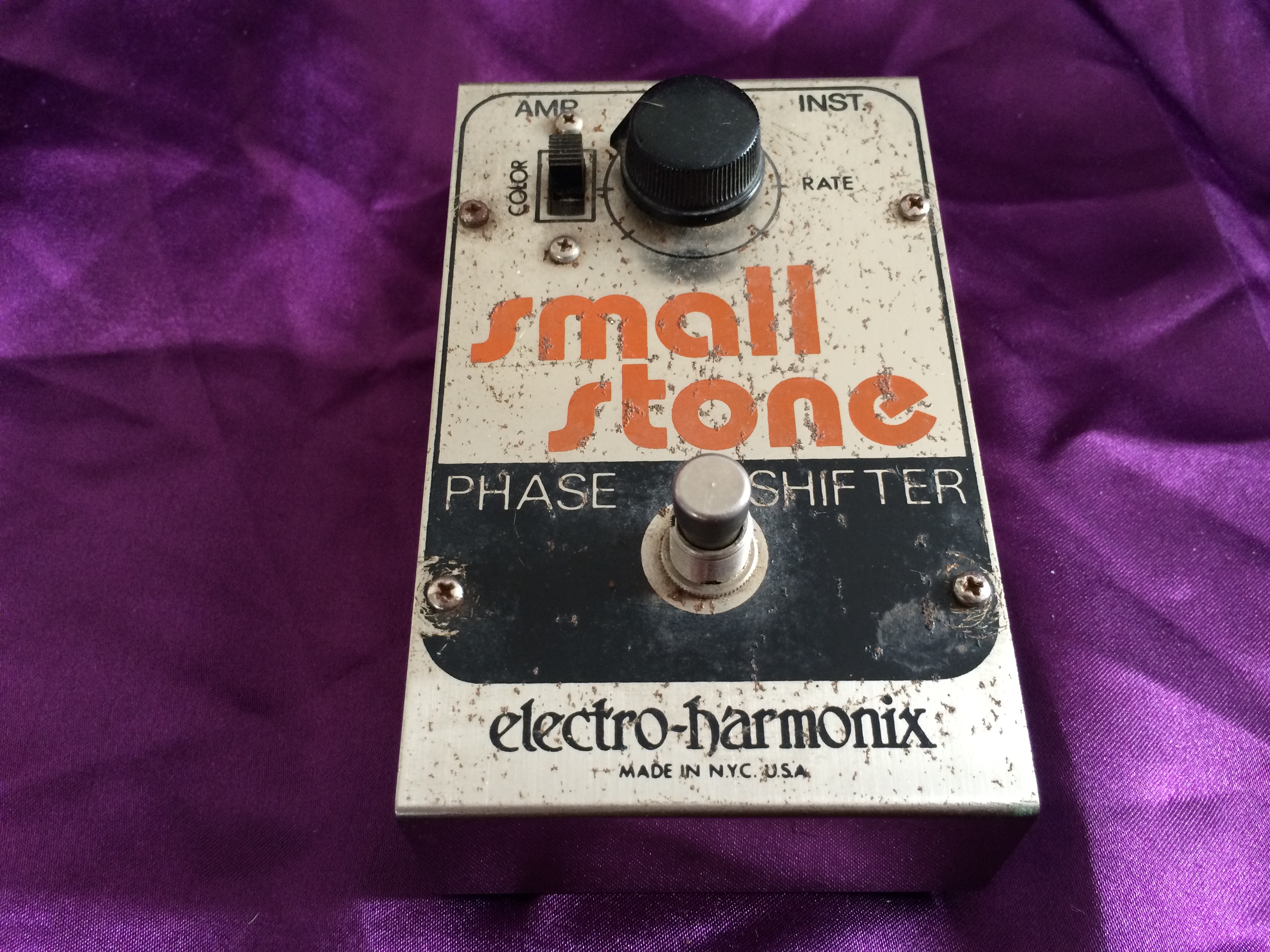 This Electro‑Harmonix Small Stone is another pedal that has been owned by me from new. I think this one is c.1977 or maybe 1978; it’s hard to tell after all this time. Whilst I admit to not being a great fan of phasers generally, the Electro‑Harmonix is something a bit special. There’s something about the Small and Bad Stone phasers that produces other worldly ambience like no other. This baby is all‑original and still works perfectly. The threads used to hold the pedal together have worn due to repeated battery replacement over the years but the original screws are amazingly still there (although loose). When I bought it, the shop didn’t have the original Small Stone box, so it came in an Electro‑Harmonix Y‑Triggered Filter box – I didn’t think twice about this at the time. Now, though, it would have been nice to have the matching box. Like Many 1970s Electro‑Harmonix stomp boxes, the chrome steel front is showing a smattering of small flecks of surface rust, despite it being well looked after. Minor cosmetics aside the Small Stone continues to provide those amazing vintage analogue sounds that have been heard on so many stages and recordings over the decades.