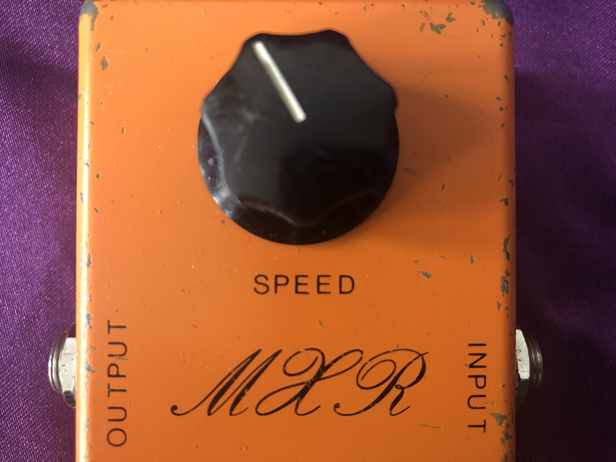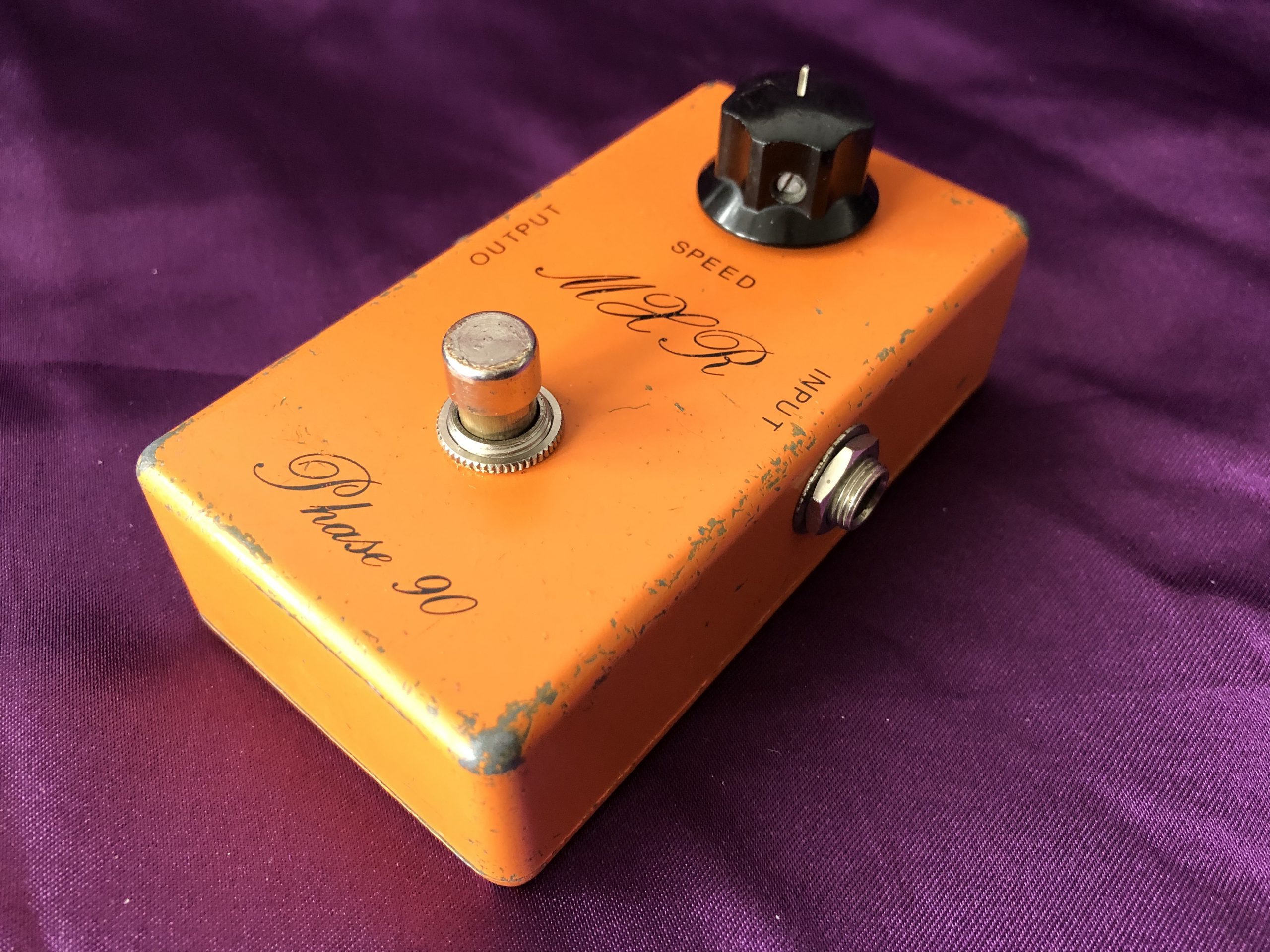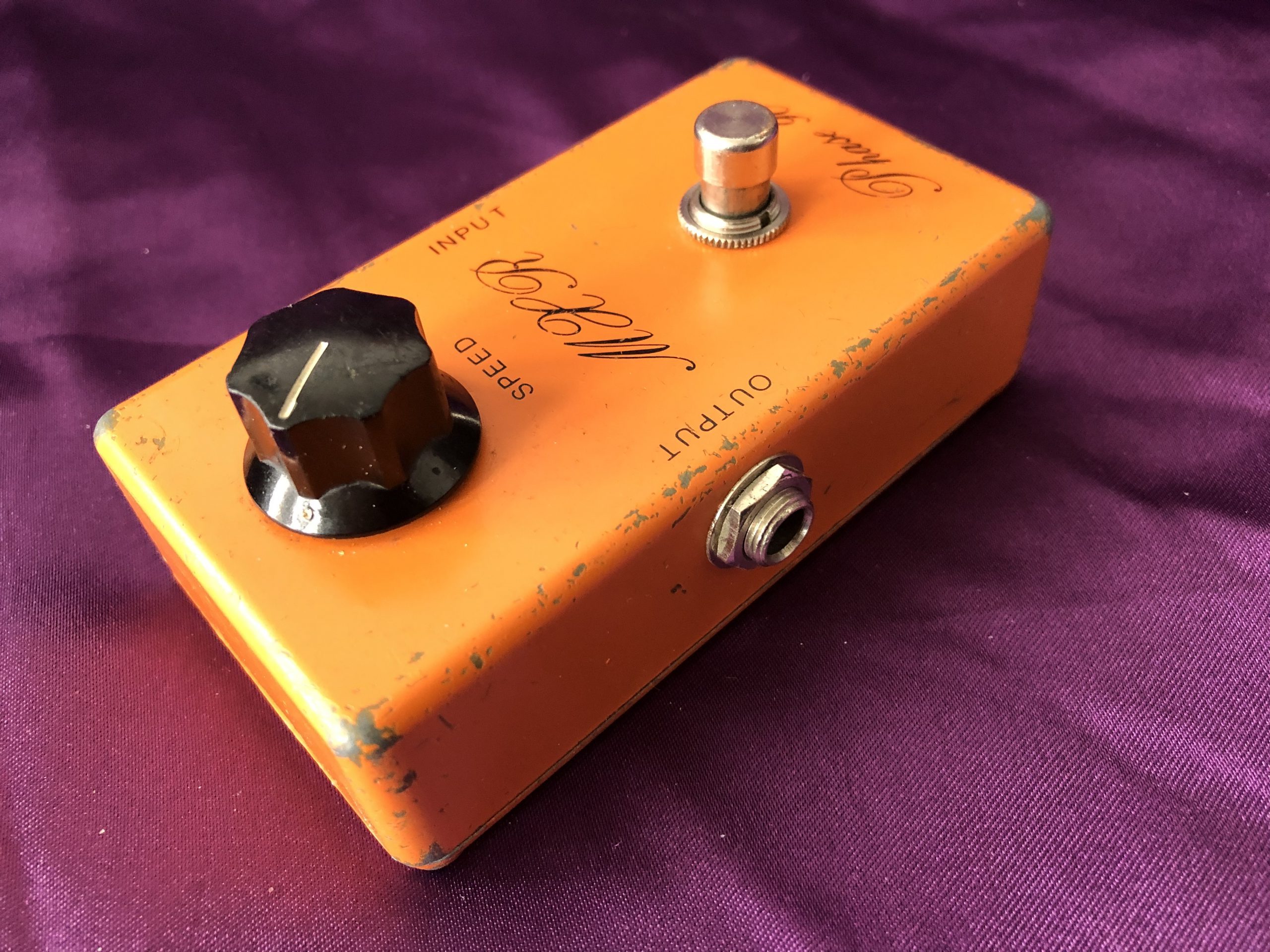 This sturdy, diminutive and surprisingly heavy bright orange MXR Phase 90 (MX‑101) was made in Rochester, New York around the time of the change of image c.1976/1977. Both the enclosure and the baseplate carry the early script logo. The pot dates the pedal to mid‑1977 perhaps indicating it was one of the last script logo Phase 90s to leave the factory. I also had a 1977 Phase 90 with the MXR ‘block’ logo, so there was clearly some overlap between the designs. There are no signs of modification, other than a replacement battery clip, a very common occurrence. The enclosure’s condition is certainly not virgin but is very good for its age with a few superficial scuffs for its many years of use. It works perfectly and sounds great, just like it would have done when it was made. Simplicity really is the key here – it is almost impossible to get a bad tone from the oh‑so‑cool Phase 90 – just stamp on the footswitch, set the ‘speed’ control to suit and wallow in its characteristic warm, sensuous, sweet, swirling alchemy. Lovely. I’m generally not a massive fan of phase pedals, although this one can perhaps persuade me otherwise. If pushed, my personal preference is actually the Phase 90’s bigger brother, the Phase 100. Whatever your choice of orange phasers, there is plenty here to indulge your senses.