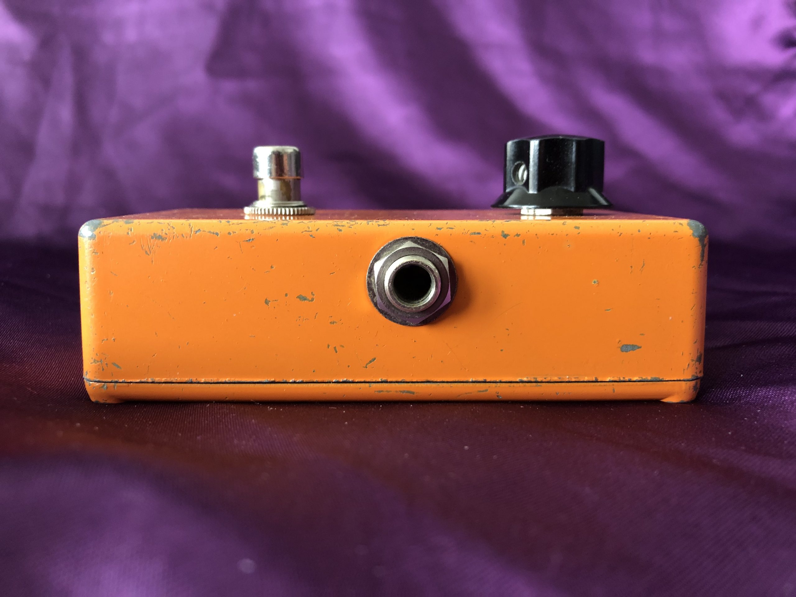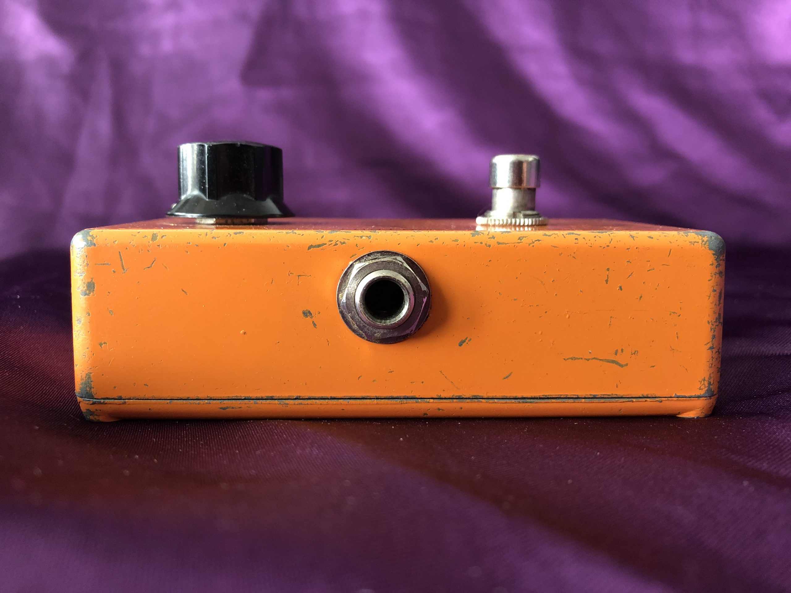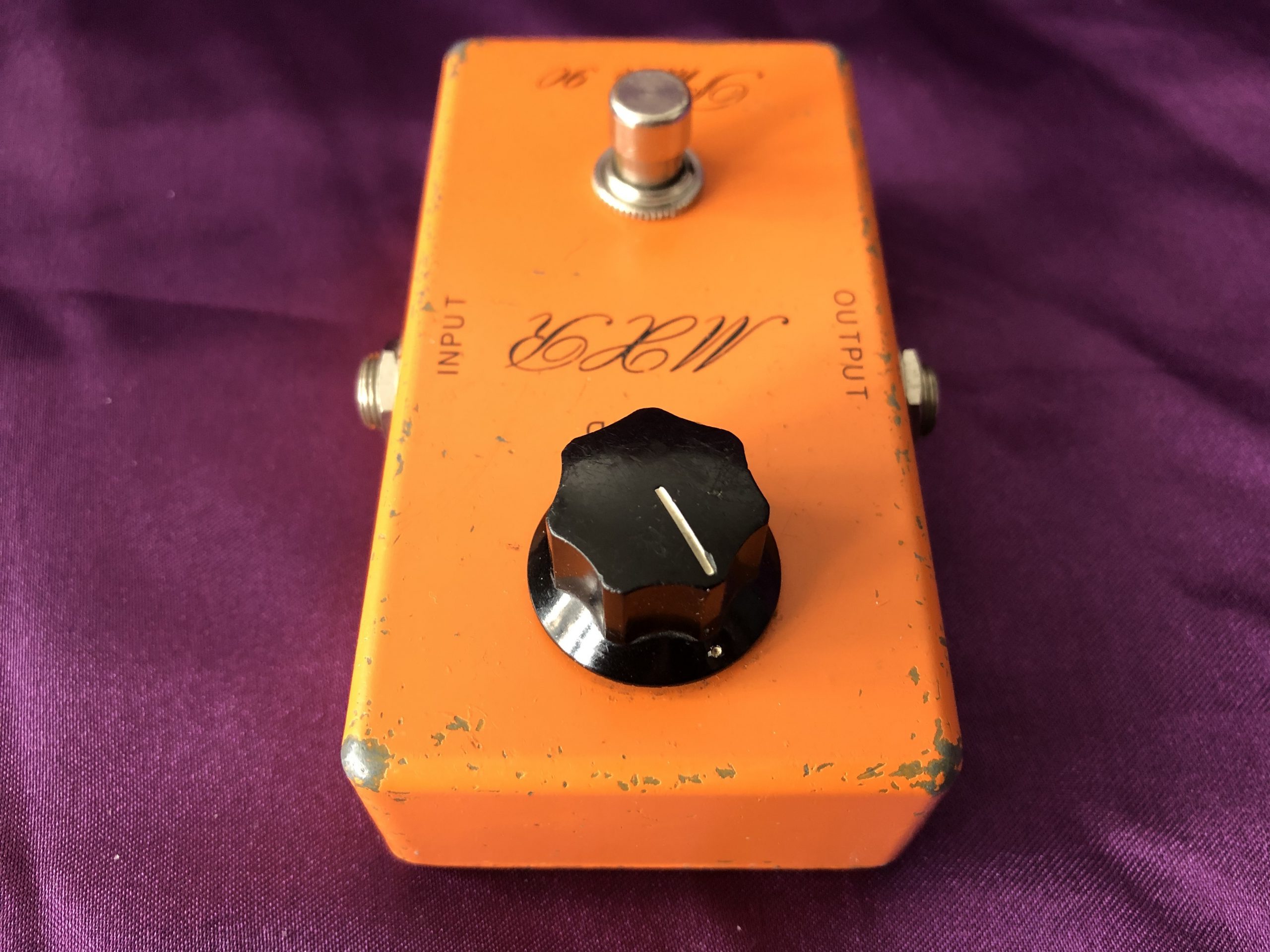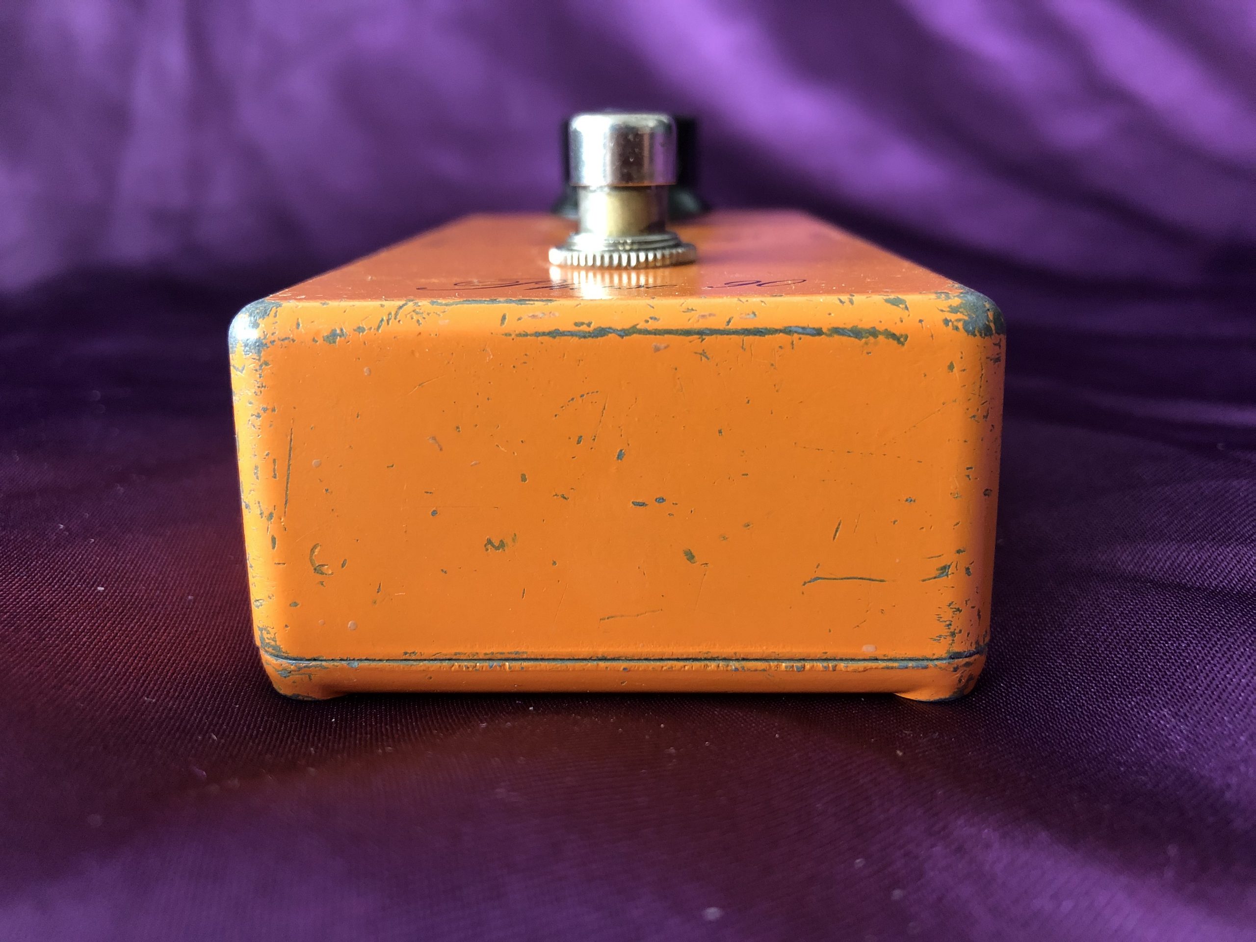 This sturdy, diminutive and surprisingly heavy bright orange MXR Phase 90 (MX‑101) was made in Rochester, New York around the time of the change of image c.1976/1977. Both the enclosure and the baseplate carry the early script logo. The pot dates the pedal to mid‑1977 perhaps indicating it was one of the last script logo Phase 90s to leave the factory. I also had a 1977 Phase 90 with the MXR ‘block’ logo, so there was clearly some overlap between the designs. There are no signs of modification, other than a replacement battery clip, a very common occurrence. The enclosure’s condition is certainly not virgin but is very good for its age with a few superficial scuffs for its many years of use. It works perfectly and sounds great, just like it would have done when it was made. Simplicity really is the key here – it is almost impossible to get a bad tone from the oh‑so‑cool Phase 90 – just stamp on the footswitch, set the ‘speed’ control to suit and wallow in its characteristic warm, sensuous, sweet, swirling alchemy. Lovely. I’m generally not a massive fan of phase pedals, although this one can perhaps persuade me otherwise. If pushed, my personal preference is actually the Phase 90’s bigger brother, the Phase 100. Whatever your choice of orange phasers, there is plenty here to indulge your senses.