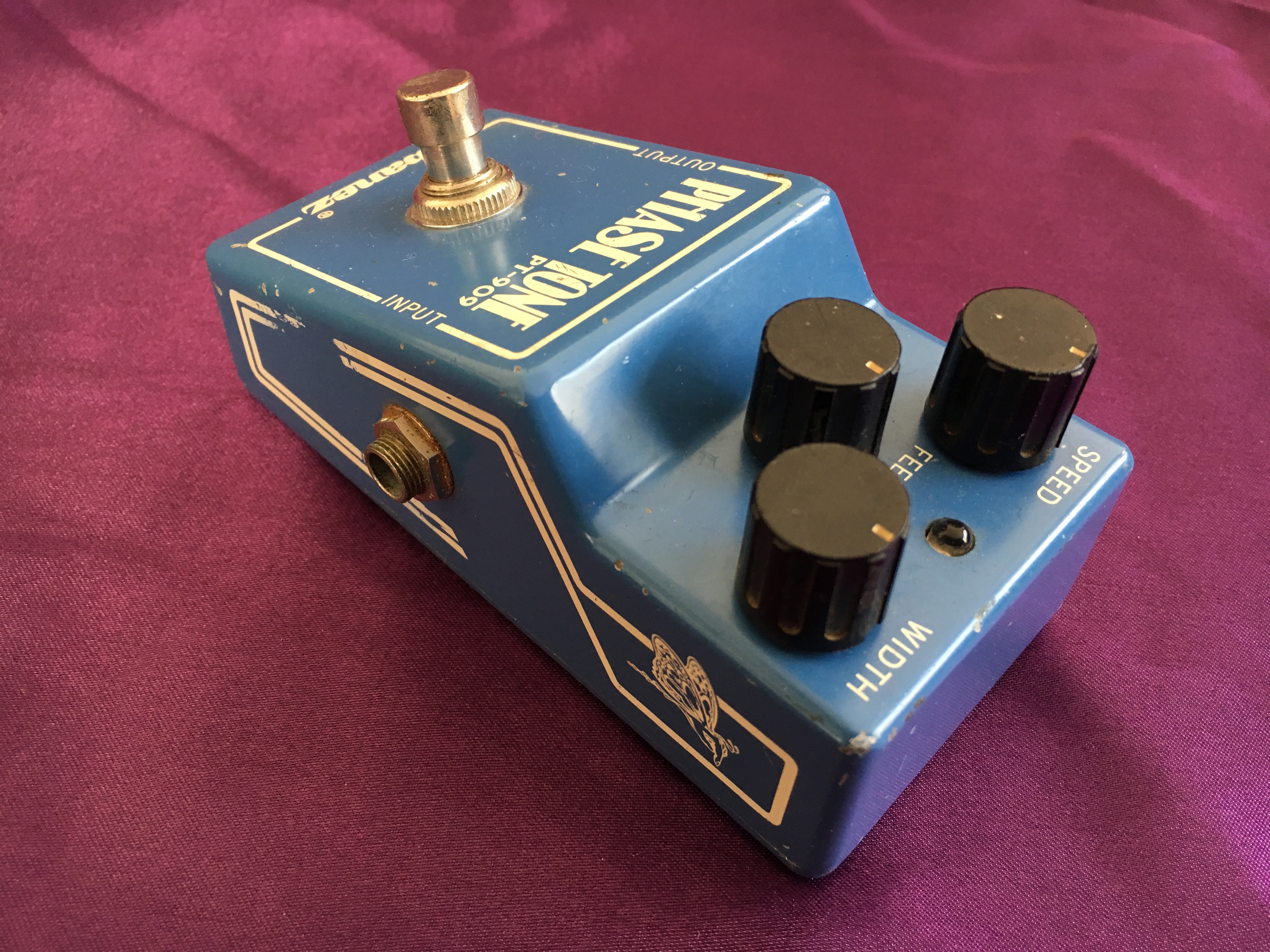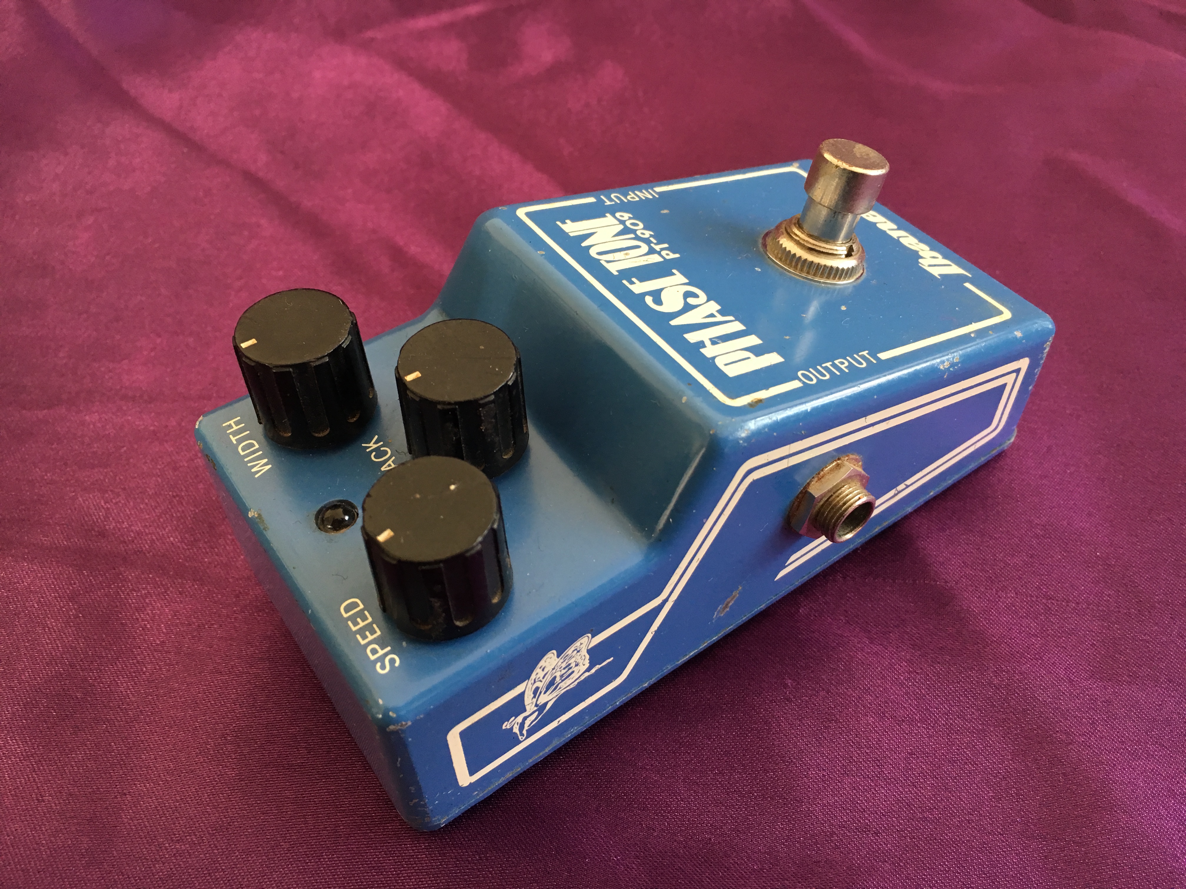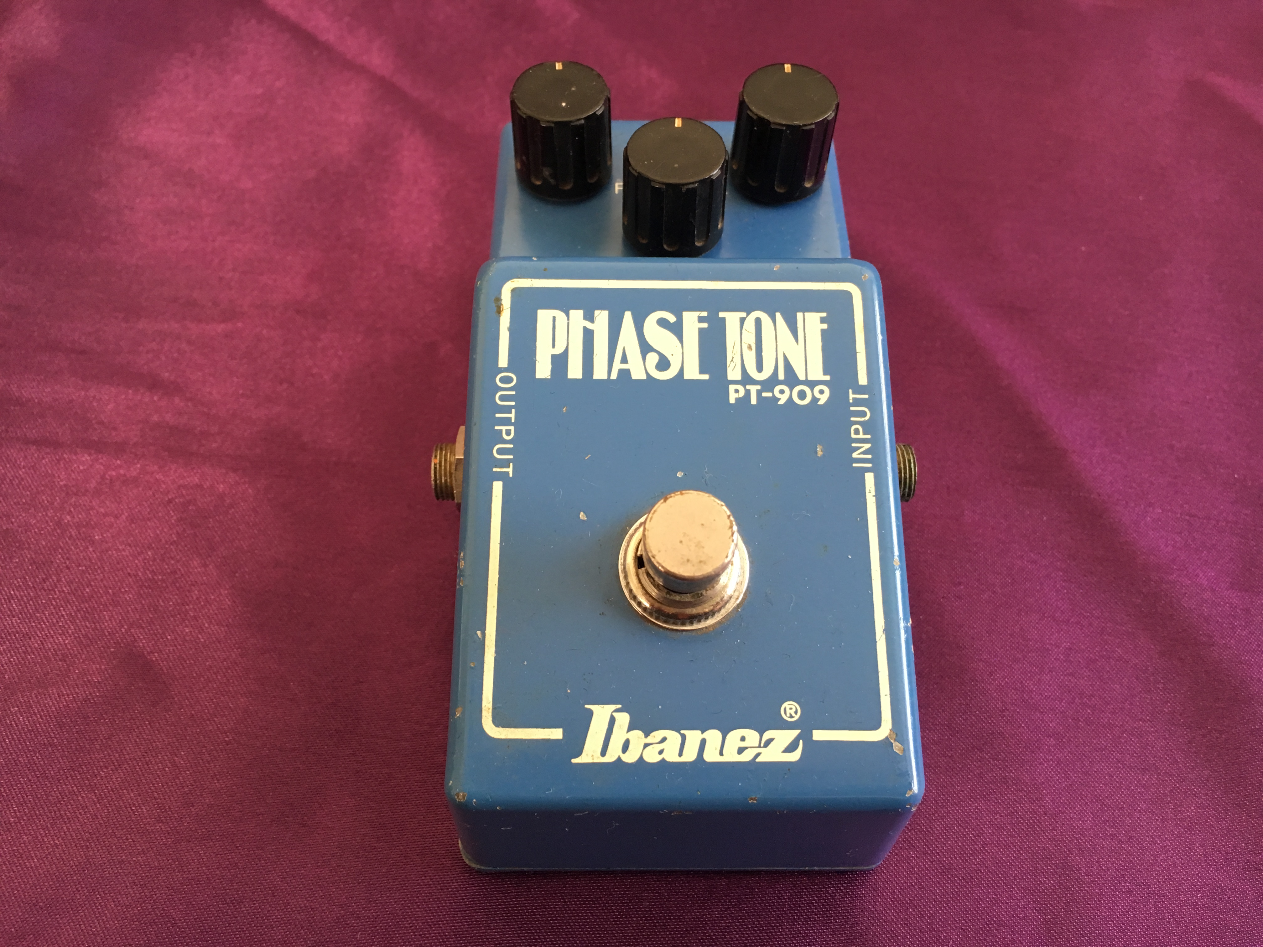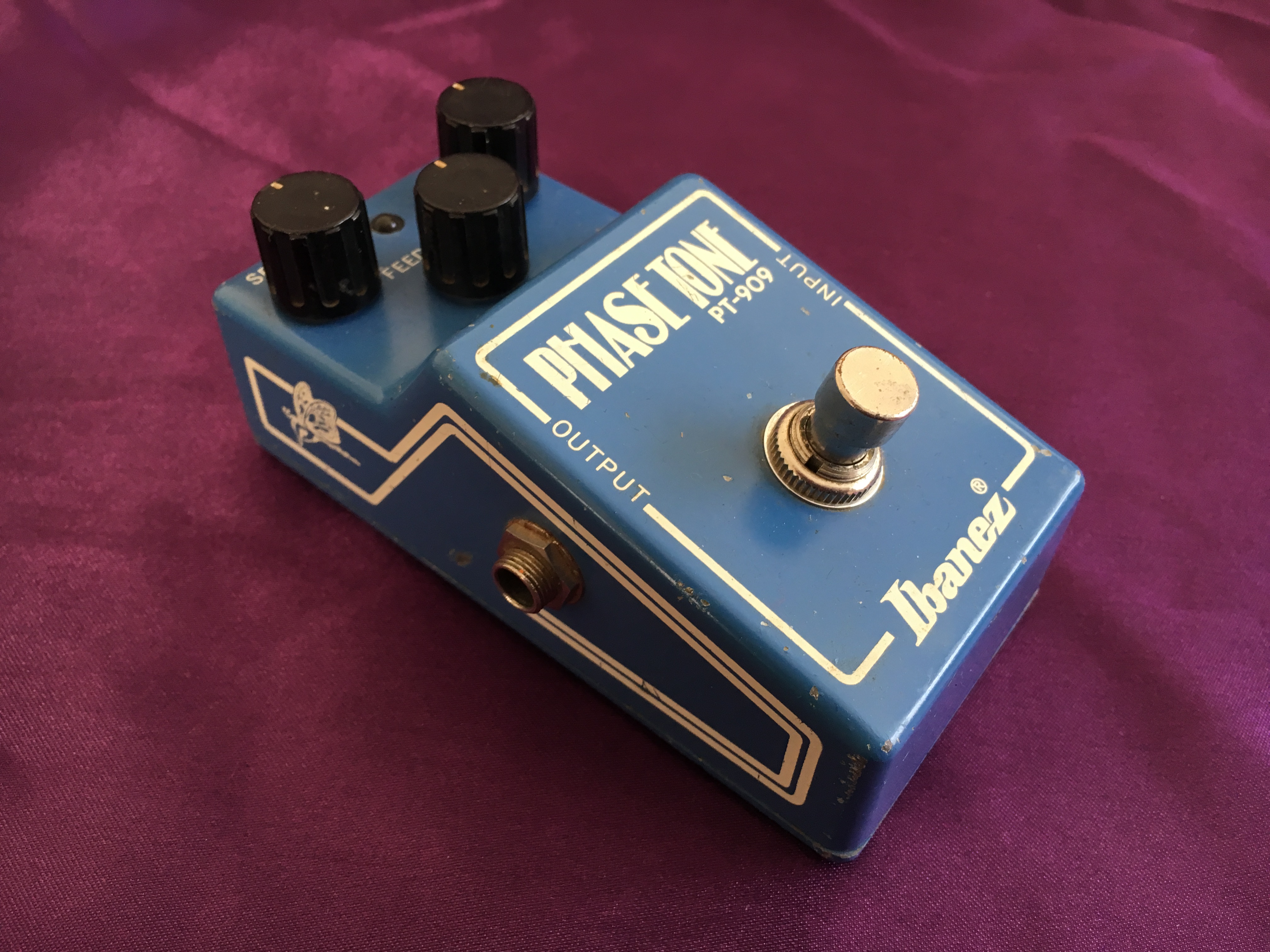 Between 1974 and 2002, Japanese Ibanez effect pedals were made and marketed internationally under a partnership agreement with another Japanese company, Maxon. Ibanez produced a wide variety of pedals in many different designs before their reputation peaked with the ‘0’ series pedals, which included the classic TS‑808 Tube Screamer overdrive pedal. The blue and white PT‑909 Phase Tone had its origins in the ‘first series’ (as the PT‑900 and PT-999 Phase Tone – 1974‑1976) and the ‘wide box’ (PT‑707 Phase Tone II – 1976‑1980), as well as the ‘narrow box’ PT-909 pedals with the normal round footswitch (1977‑1979) or with the familiar square footswitch (1979‑1980). Even the ‘narrow box’ PT‑909 pedals had 4 different incarnations in 4 years before the standard ‘0’ series boxes were introduced in c.1980. Ibanez further refined the offer in the form of the orange PT9 (1982‑1984). Two versions of the early ‘narrow box’ PT‑909 carried a ‘flying fingers’ graphic comprising a stylised hand with butterfly wings on the side of the pedal, firstly without and then with external power supply inputs. Commercially, being a bit work-in-progress, it wasn’t hugely successful but then again it was up against some very stiff competition from the likes of BOSS, Electro‑Harmonix and MXR.