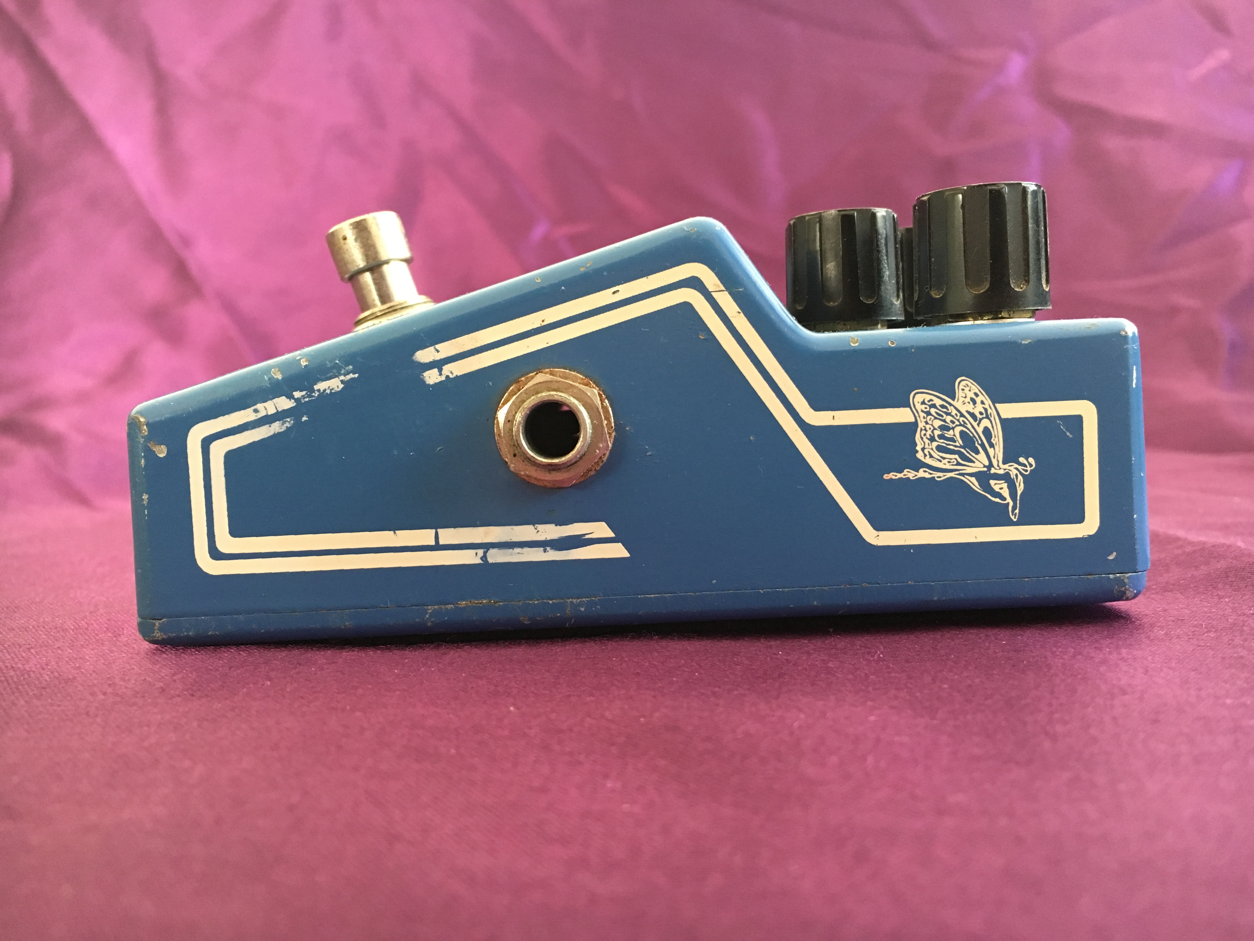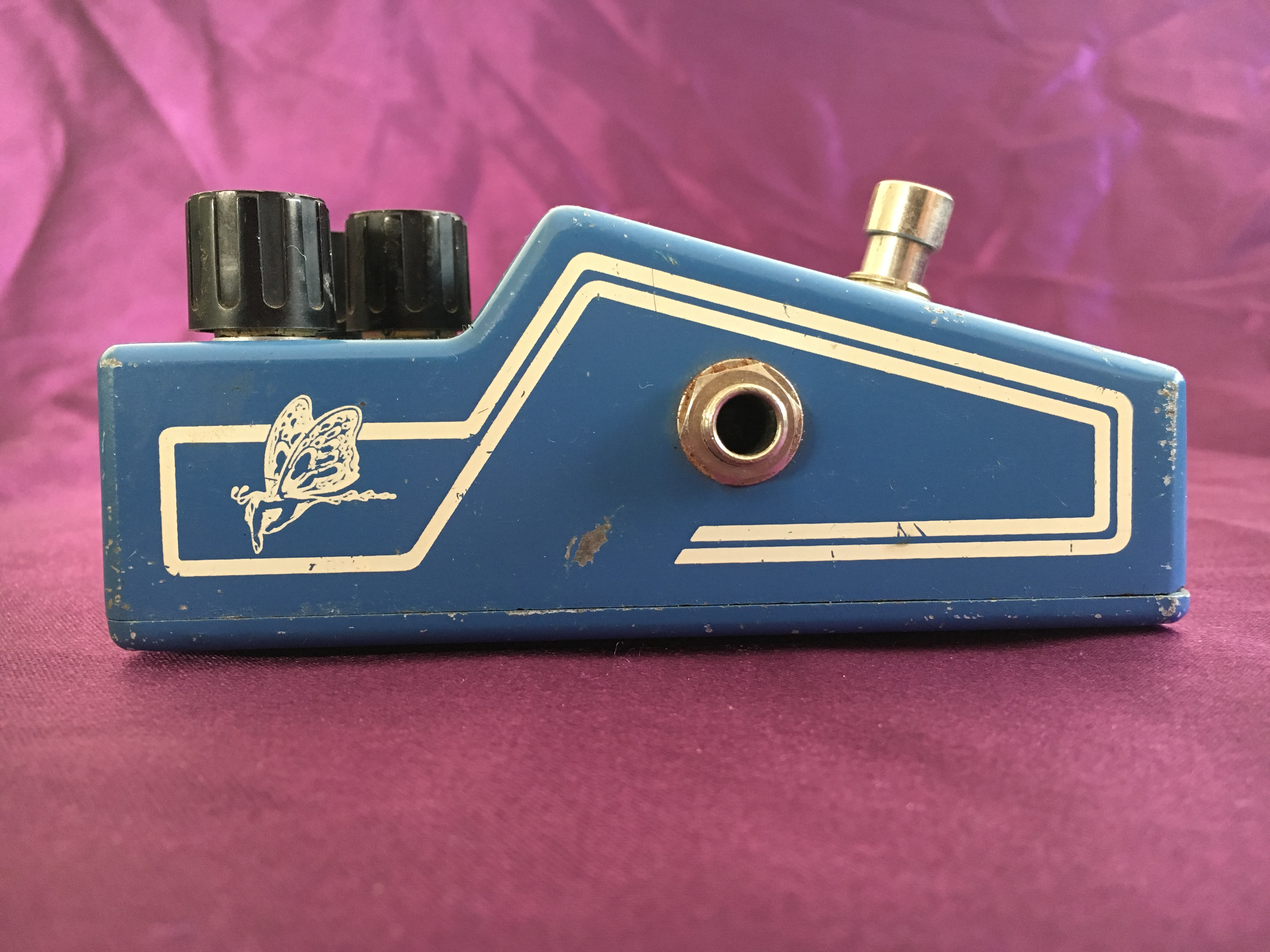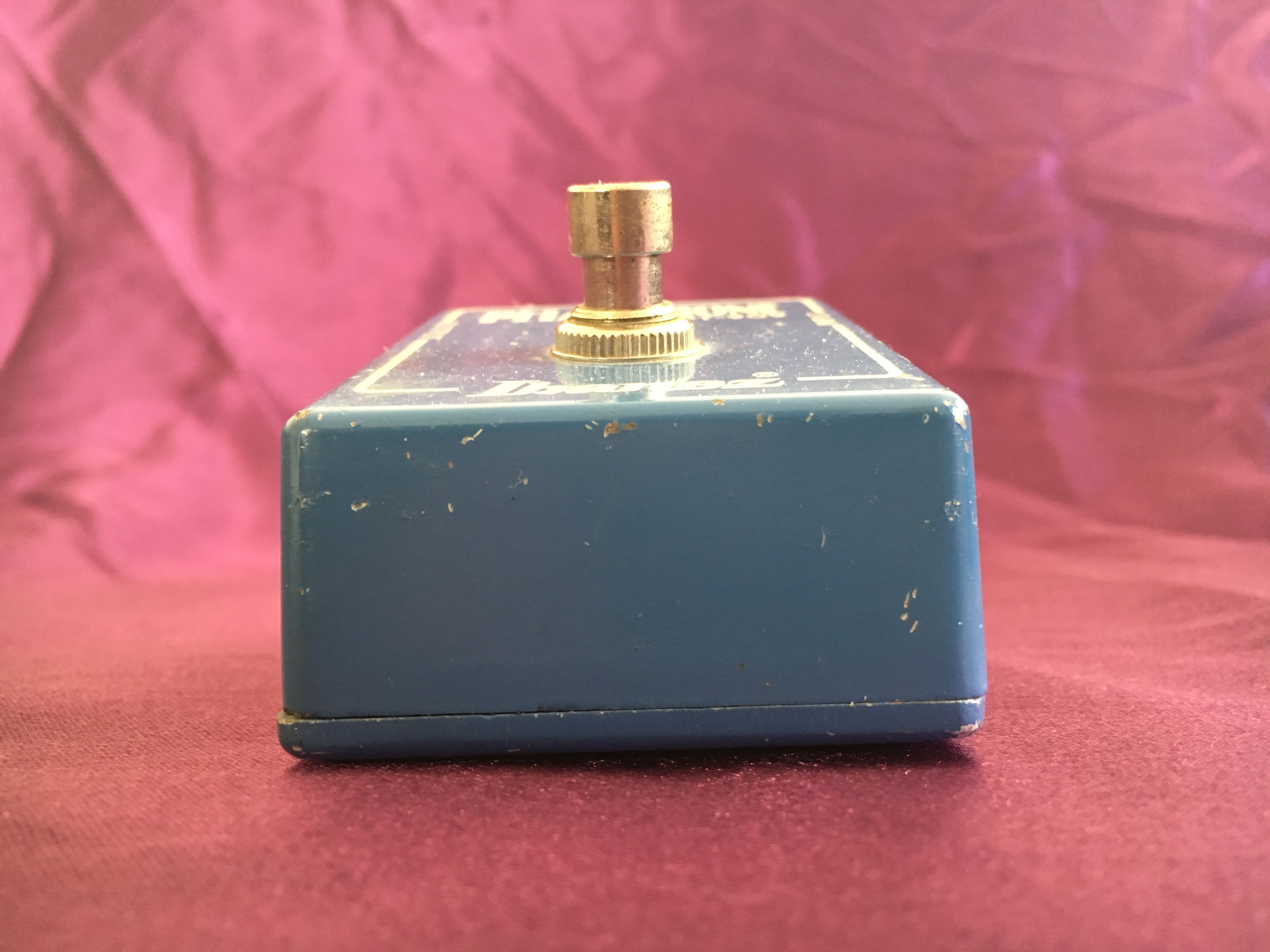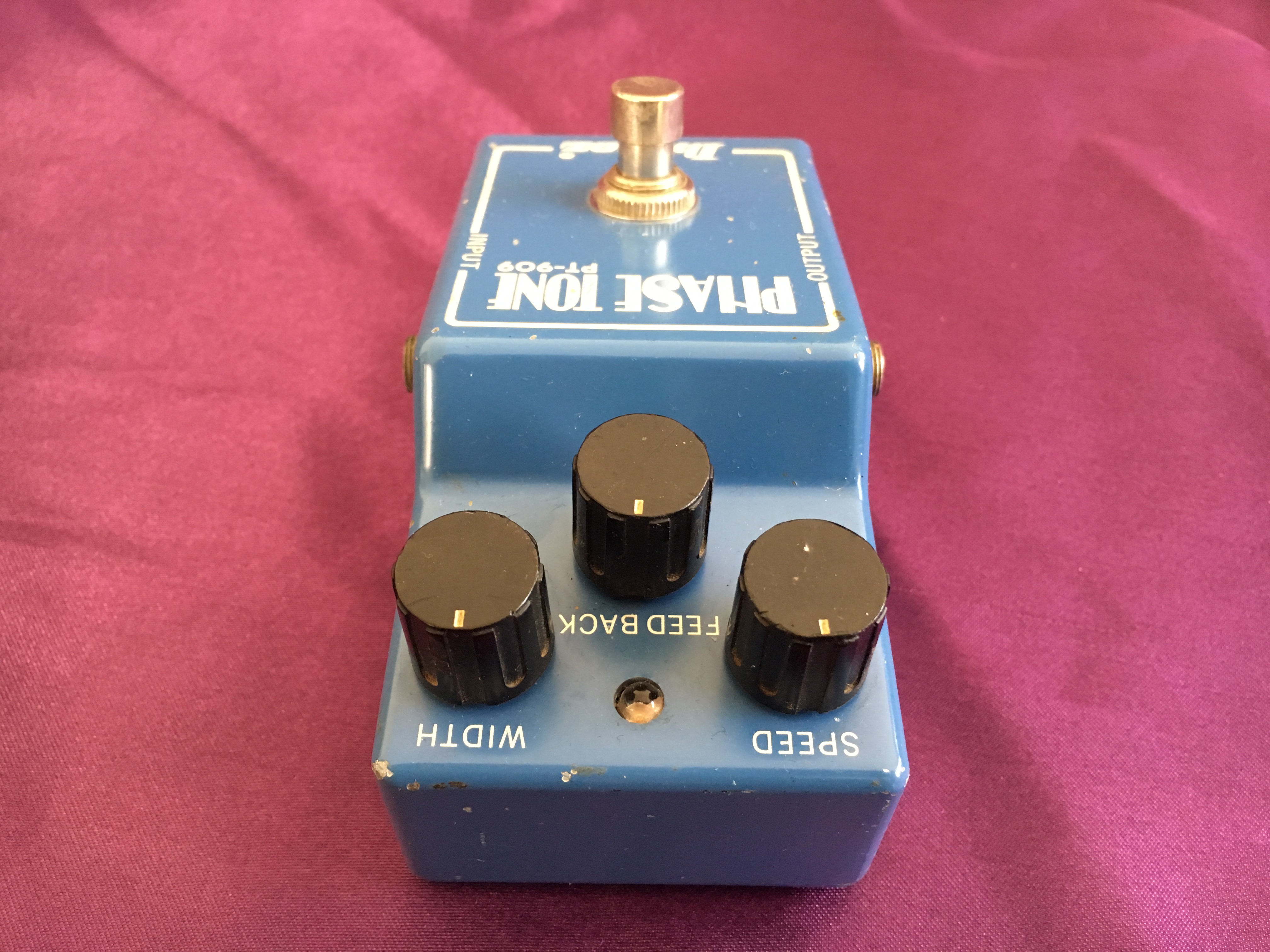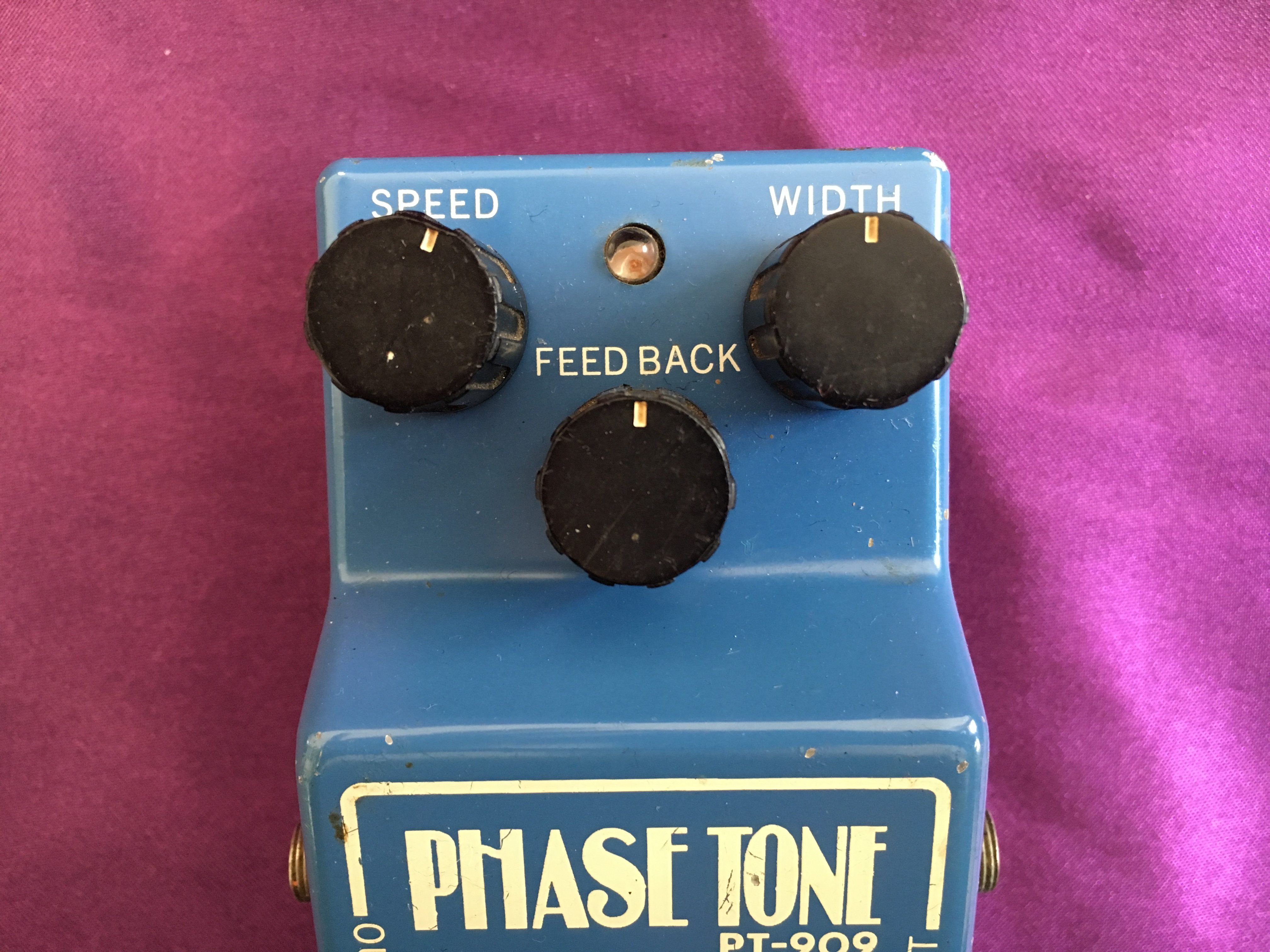 Between 1974 and 2002, Japanese Ibanez effect pedals were made and marketed internationally under a partnership agreement with another Japanese company, Maxon. Ibanez produced a wide variety of pedals in many different designs before their reputation peaked with the ‘0’ series pedals, which included the classic TS‑808 Tube Screamer overdrive pedal. The blue and white PT‑909 Phase Tone had its origins in the ‘first series’ (as the PT‑900 and PT-999 Phase Tone – 1974‑1976) and the ‘wide box’ (PT‑707 Phase Tone II – 1976‑1980), as well as the ‘narrow box’ PT-909 pedals with the normal round footswitch (1977‑1979) or with the familiar square footswitch (1979‑1980). Even the ‘narrow box’ PT‑909 pedals had 4 different incarnations in 4 years before the standard ‘0’ series boxes were introduced in c.1980. Ibanez further refined the offer in the form of the orange PT9 (1982‑1984). Two versions of the early ‘narrow box’ PT‑909 carried a ‘flying fingers’ graphic comprising a stylised hand with butterfly wings on the side of the pedal, firstly without and then with external power supply inputs. Commercially, being a bit work-in-progress, it wasn’t hugely successful but then again it was up against some very stiff competition from the likes of BOSS, Electro‑Harmonix and MXR.