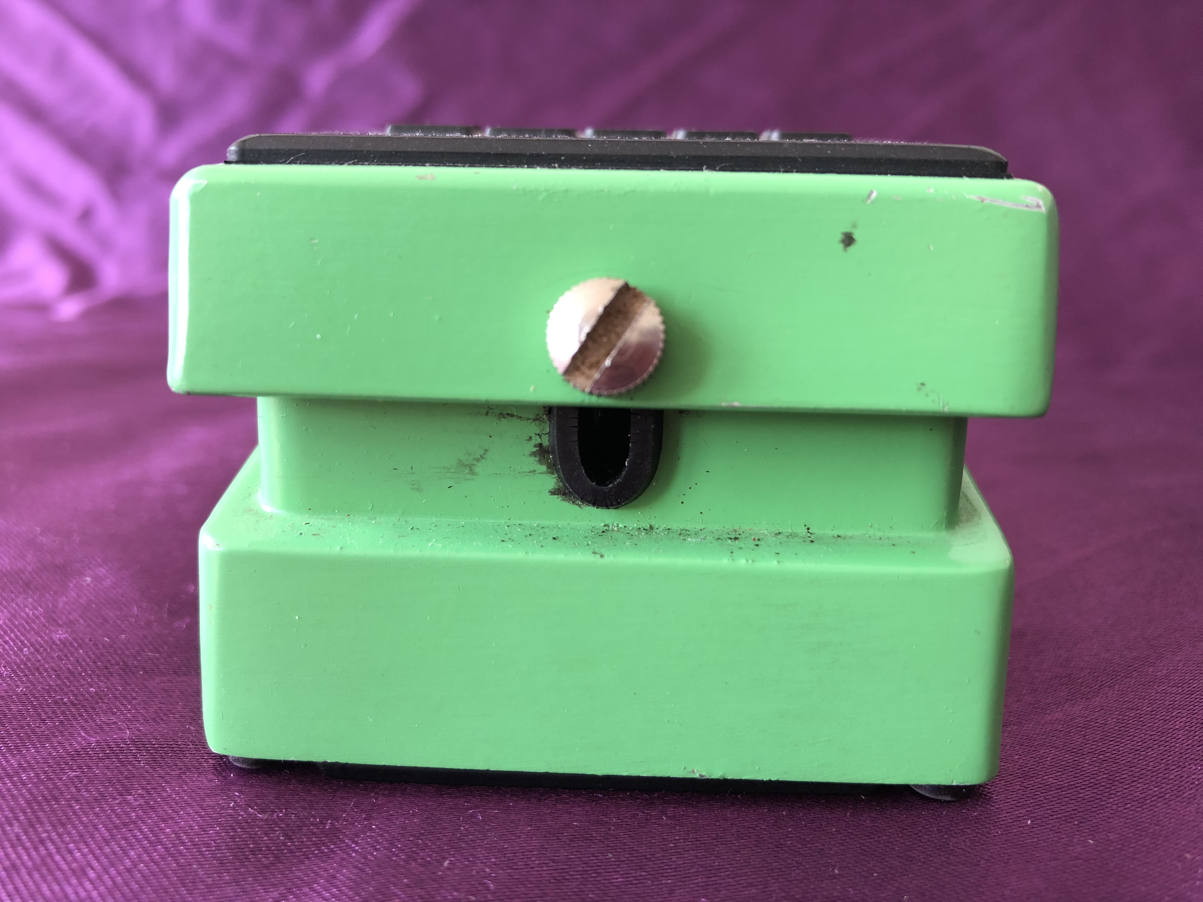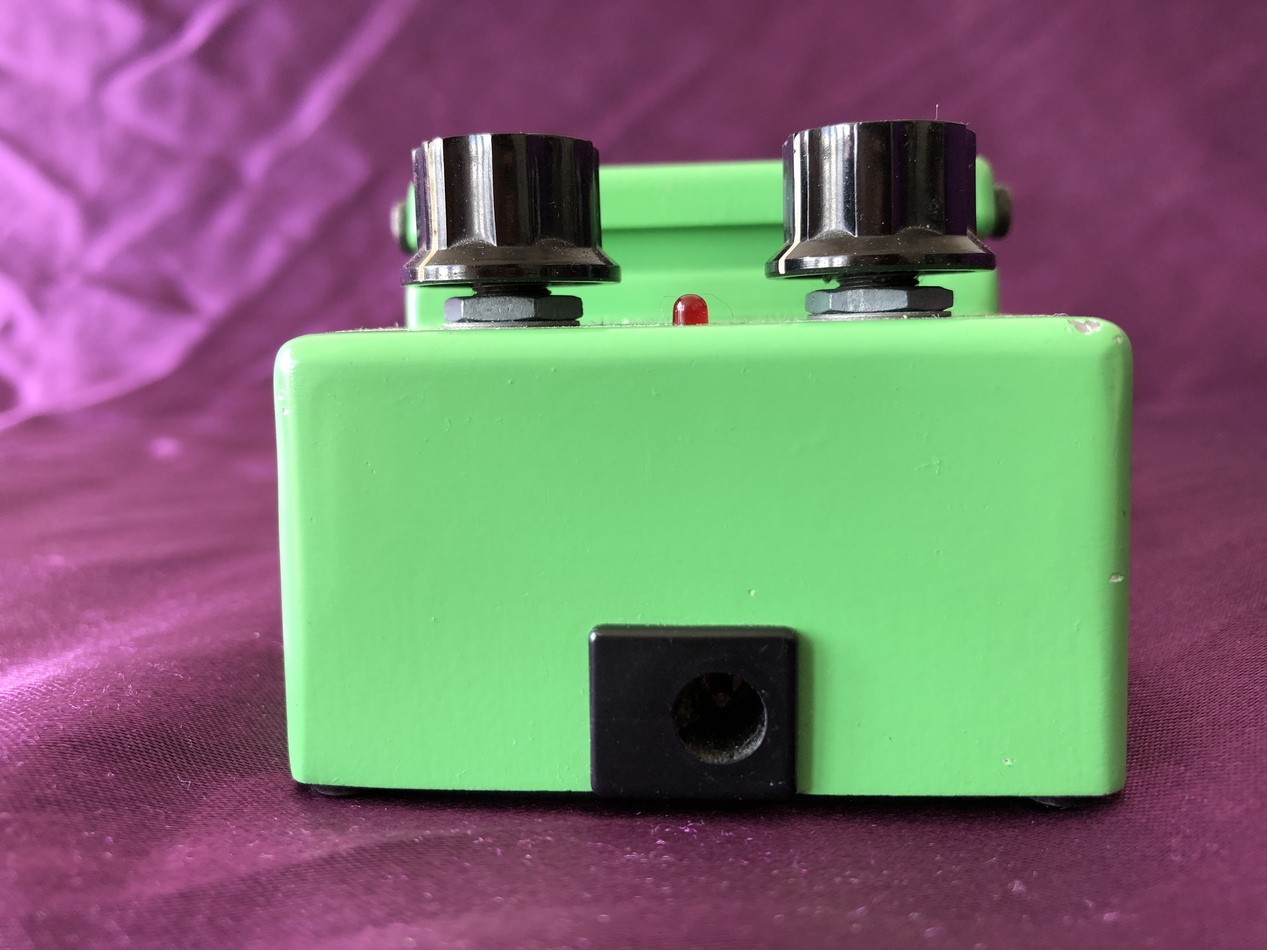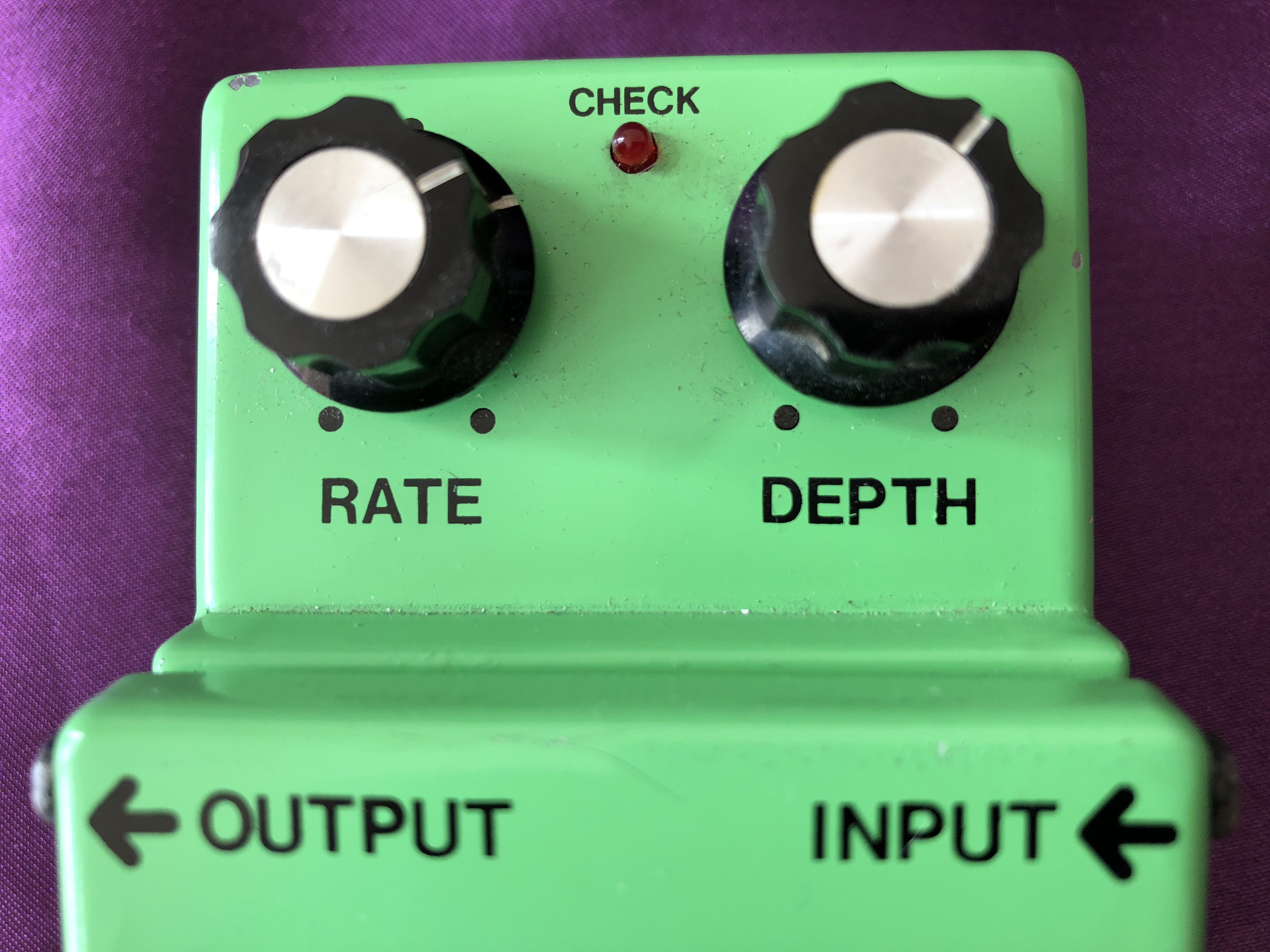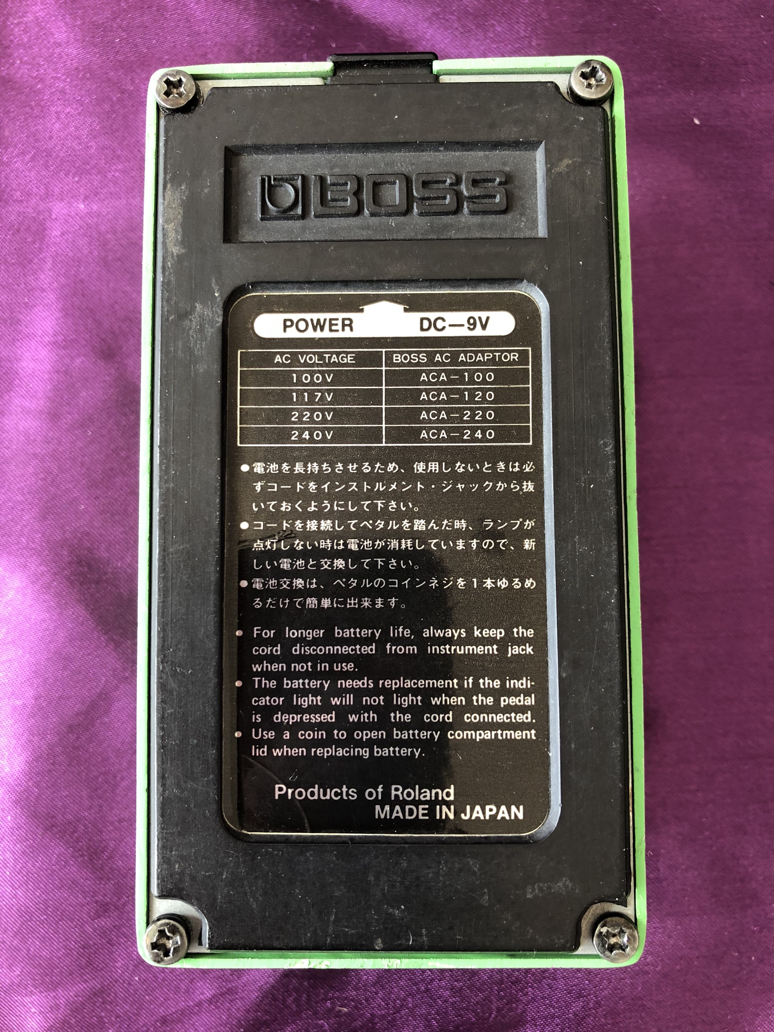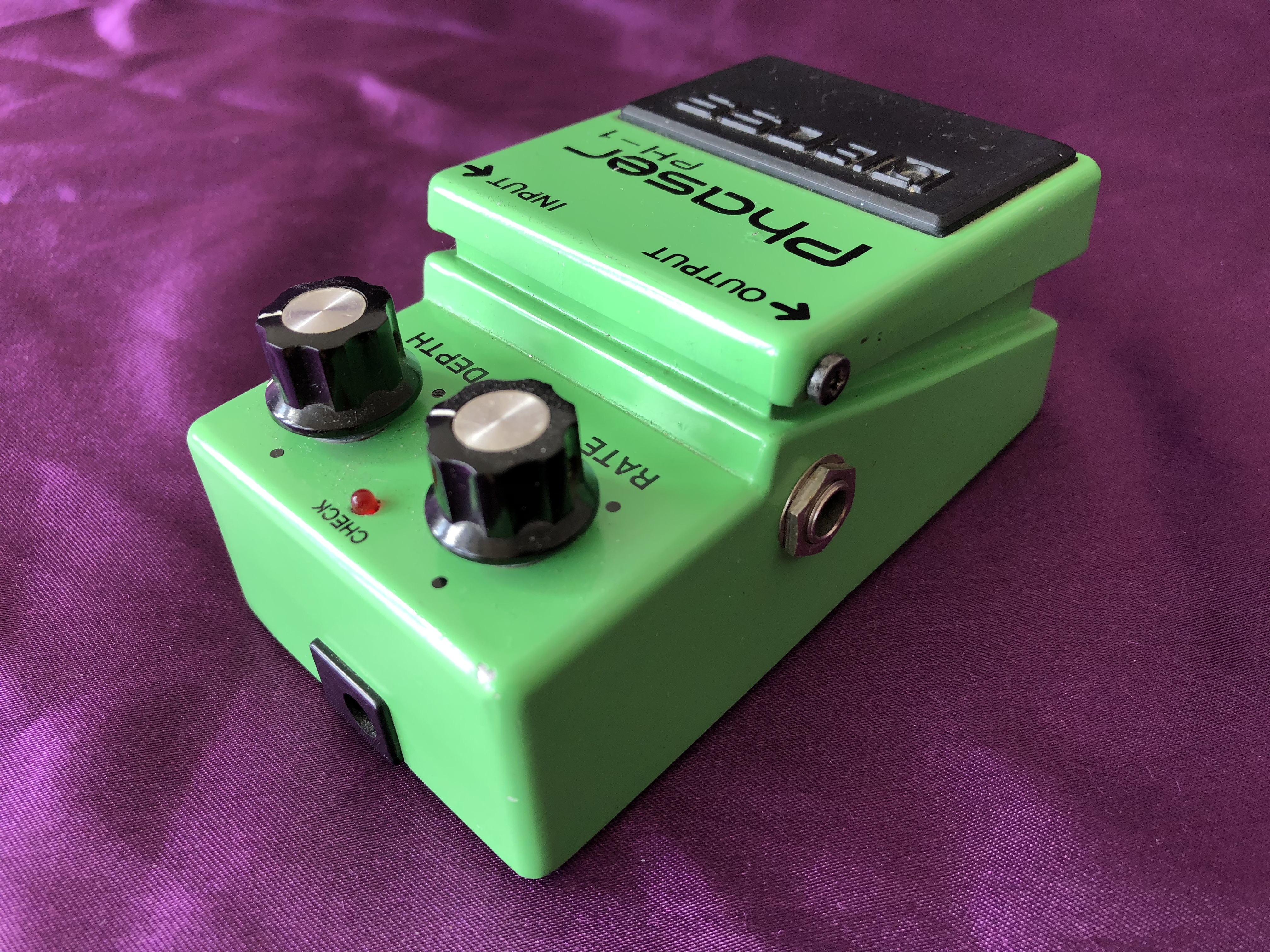 The bright green 2-knob PH-1 Phaser is very typical of the BOSS family, testament to the strength of the original BOSS design that has endured now almost unchanged for quite a few decades since the late 1970s. For the record, many of the ‘collectable’ features are present and correct here; the battery compartment’s silver screw, the ‘long-dash’ model number, the black ‘Made In Japan’ baseplate label and the ink-stamped ‘serial’ number, which dates this pedal to February 1979. In use, it produces some lovely warm subtle sounds, although not as prominent as, say, the iconic MXR Phase 90, so expect gentle undulations rather than soaring swooshes or wild warbles. To me, it sounds more like the MXR Phase 45, which was only a 2‑stage phaser. I have to admit that, while it is a perfectly good all‑round effect, it is not my favourite phaser – it’s a bit too ‘polite’ and ‘nice’ for my liking, compared with my preferred Electro‑Harmonix phasers. Like all BOSS pedals, it is solidly built and remains in very good original condition with only the battery connector having been replaced. The LED light doesn’t stay lit as it should when the effect is on but that’s only a minor irritation and what really matters – the processed sound – works just as it should. So then, this early PH-1 is a dependable classic, although perhaps it doesn’t represent the pinnacle of excellence in my view. It also makes a relatively risk free entry point into the world of vintage analogue stomp boxes.