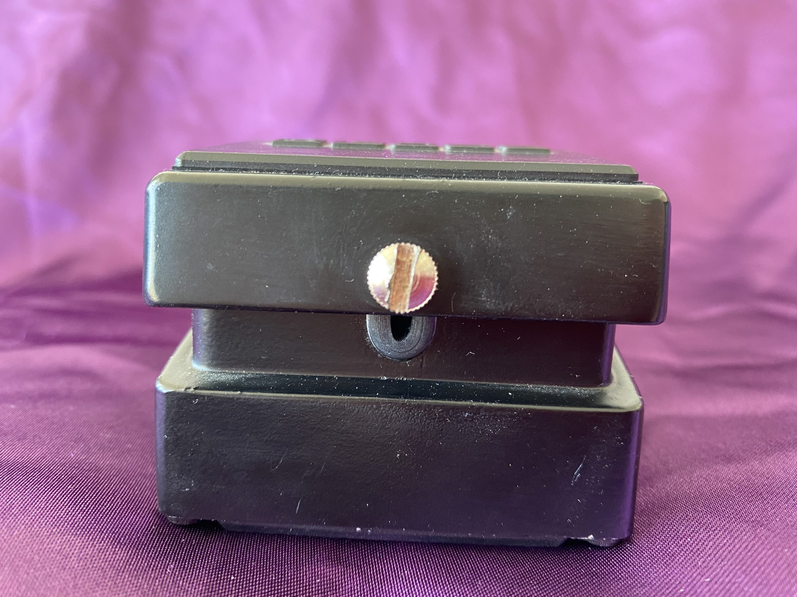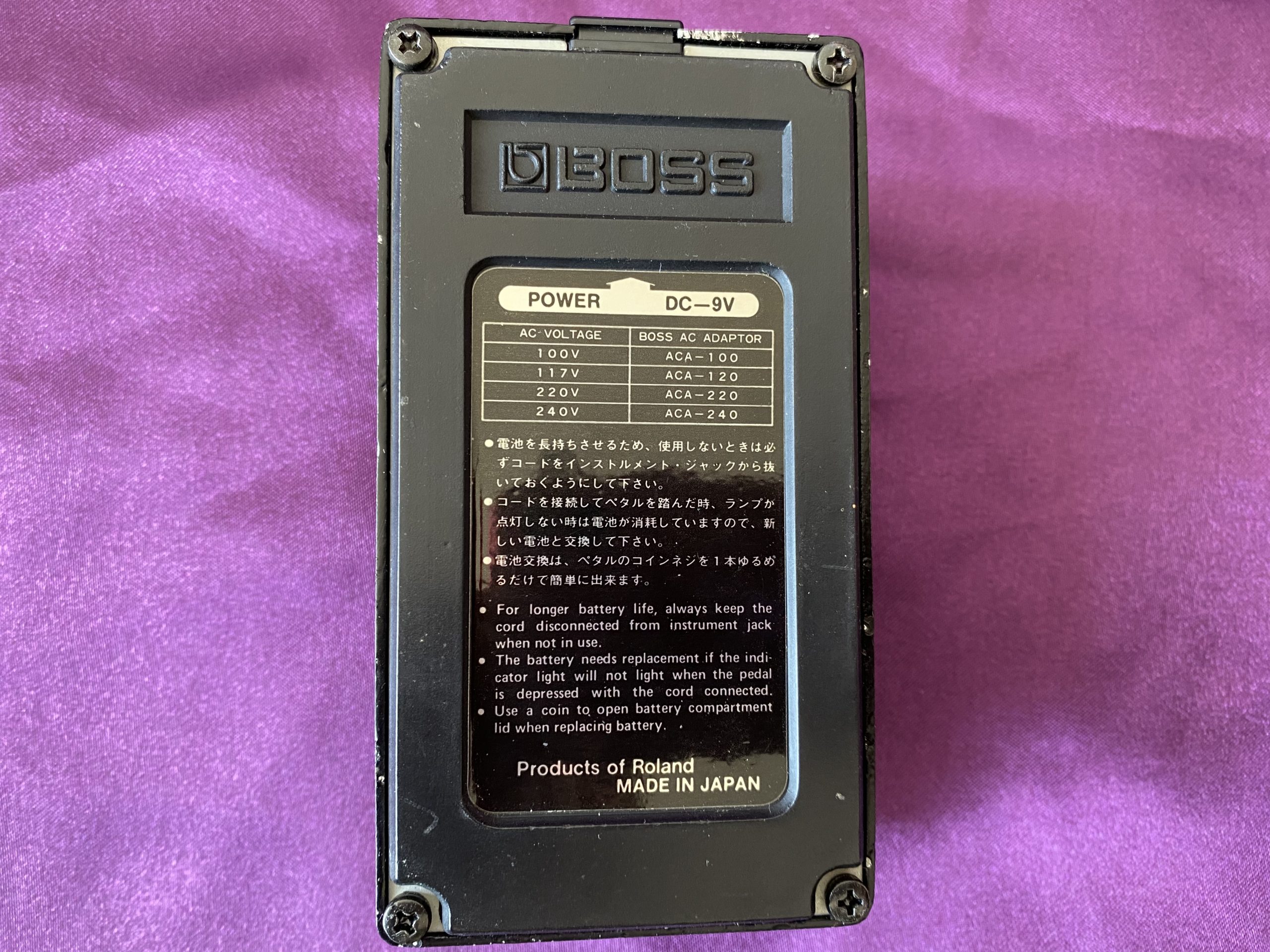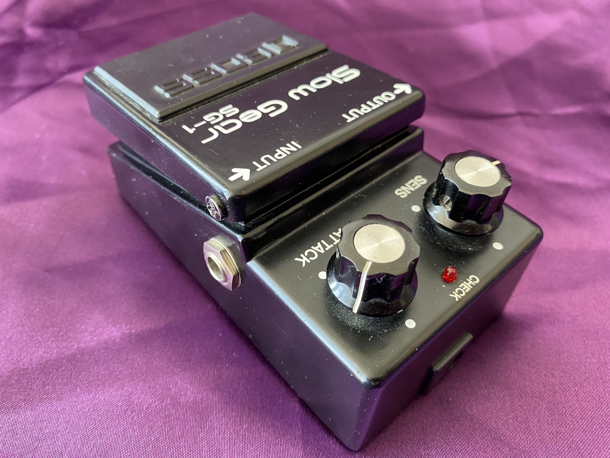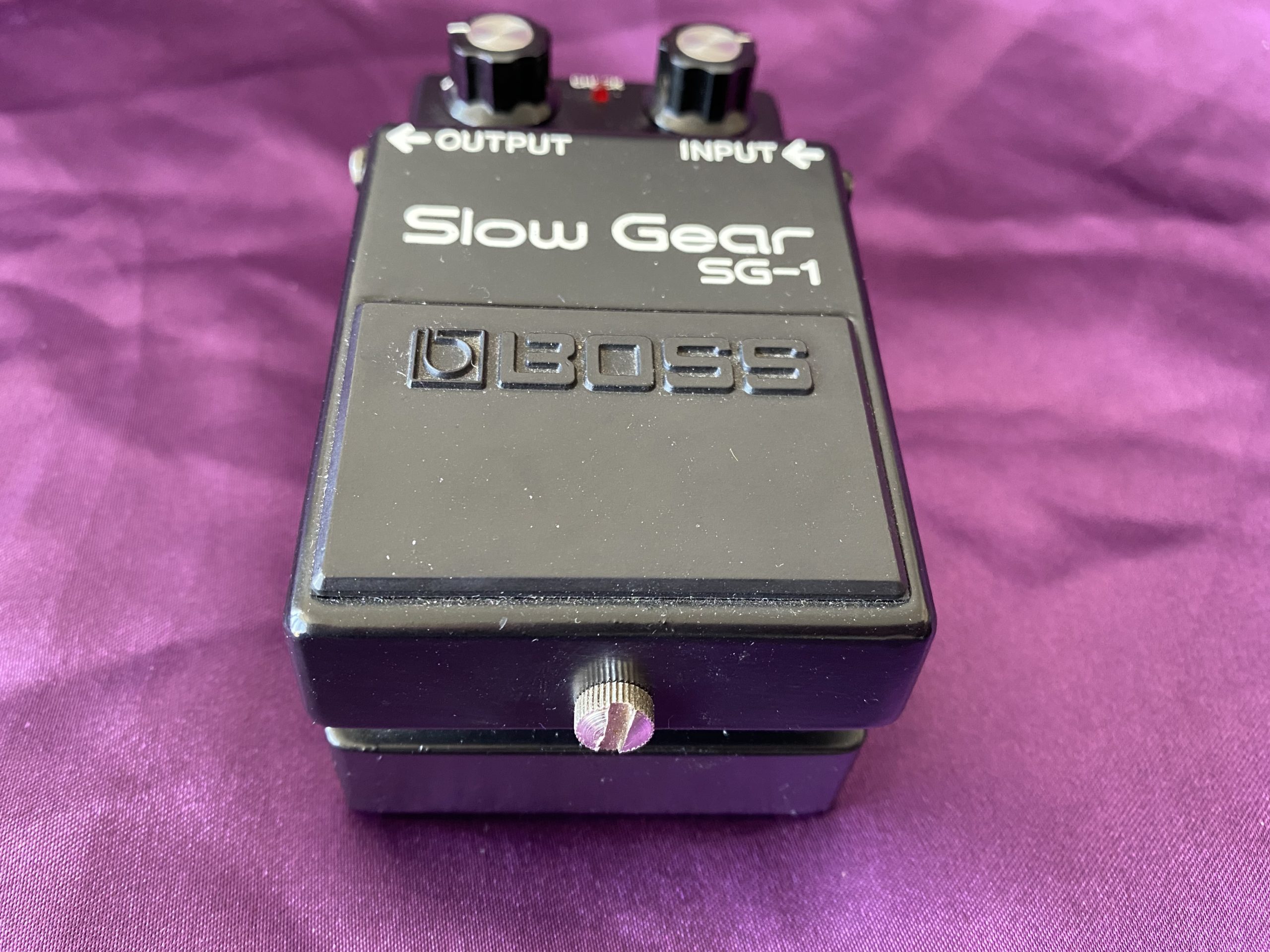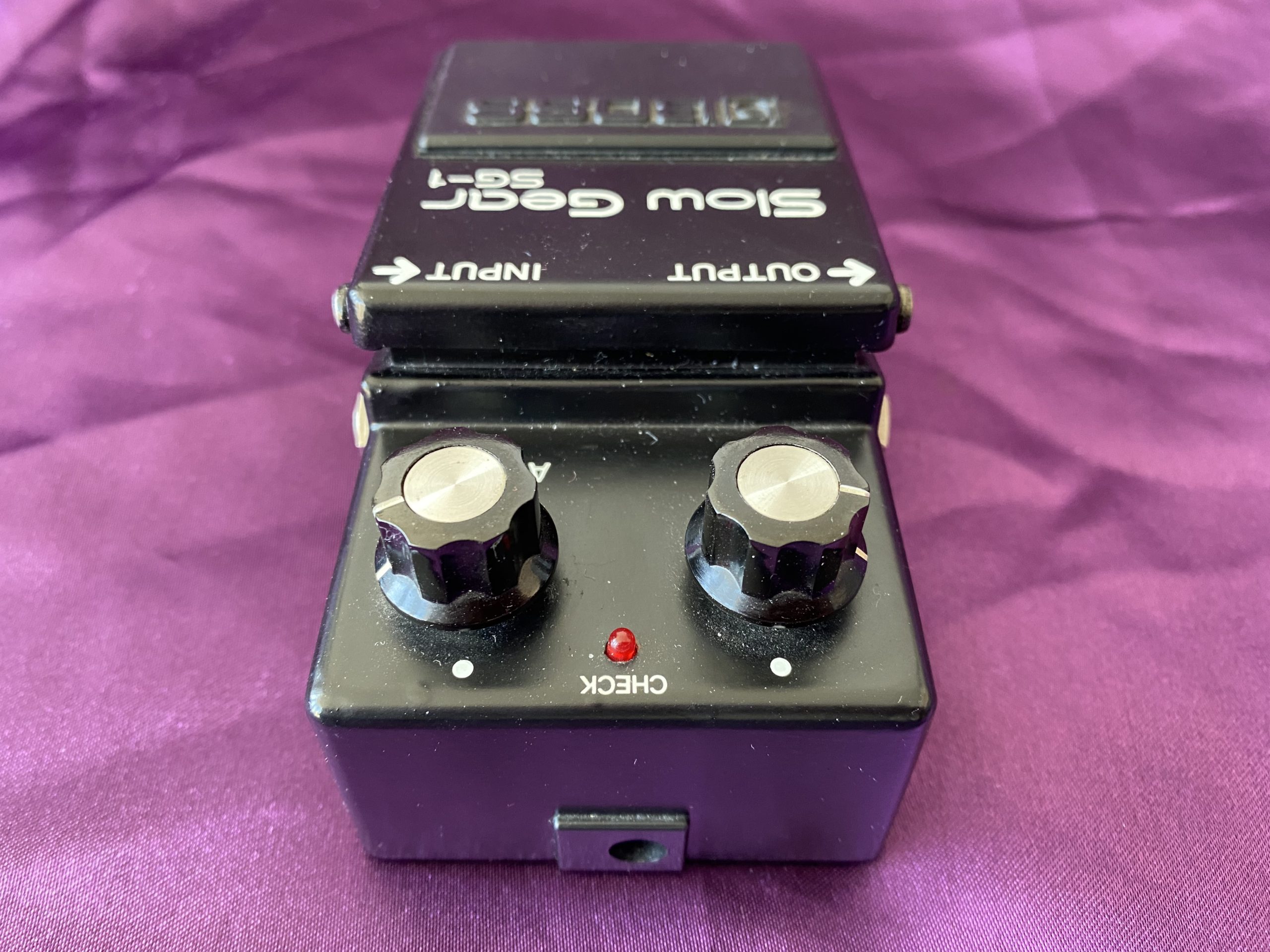 Working its way into your consciousness is this demure little 1979 BOSS SG‑1 Slow Gear from the first year of its manufacture. This example is in superbly pristine condition, looking just like new, even after several decades. As a collectable pedal, the only snag is the lack of its original box and instruction manual. There seem to be two schools of thought regarding the mysterious characteristics of the SG‑1. The naysayers suggest that it is an ineffective, overrated and overly expensive one‑trick pony that does little more than a poorly implemented auto‑swell. Conversely, the yea-sayers realise that its strength lies not in itself but the way it interacts with other effects. What it works with and what it doesn’t depends on your musical imagination and the other resources you have to hand. It isn’t the easiest of effects to get ‘right’ and it will have a ‘sweet spot’ dependent on what it is partnered with. Playing style and dynamics are also key to success, for instance continuous heavy playing is pointless because the filter doesn’t have time to reset. Similarly, weak single coil pickups may not have sufficient oomph to work the filter hard enough. For the unwitting, it may behave erratically or awesomely, suggesting that some thought and care is needed in operation. The annoying momentary LED ‘Check’ light only adds to the puzzle. This lack of predictability is odd, given that there are only two controls to contend with. As a result, the Slow Gear has a finicky reputation and it requires a lot of experimentation and technical practice to create unique sounds. I agree that, on its own, it seems to be a pretty limited effect, which may partly explain why its detractors readily dismiss it, especially within the context of exorbitantly high values on the vintage effect market. However, with time, patience and persistence, the SG‑1 can earn its place on a creative artist’s pedalboard. It’s worth it. No wonder it has been a weapon of choice for alternative and indie rock guitarists over the years. In fact, its paradoxical and sometimes mercurial qualities are part of its appeal to the adventurous and open‑minded musician. Yes, it is a collector’s curiosity but it is also a distinctive musical tool. It may look like so many other BOSS stomp boxes out there but it really is in a class of its own. So… to summarise, the SG‑1 is clearly not for everyone, which is just as well, given that it is far from ubiquitous, at least until BOSS deems it deserving for an overdue reissue. Cool and rare? Absolutely!