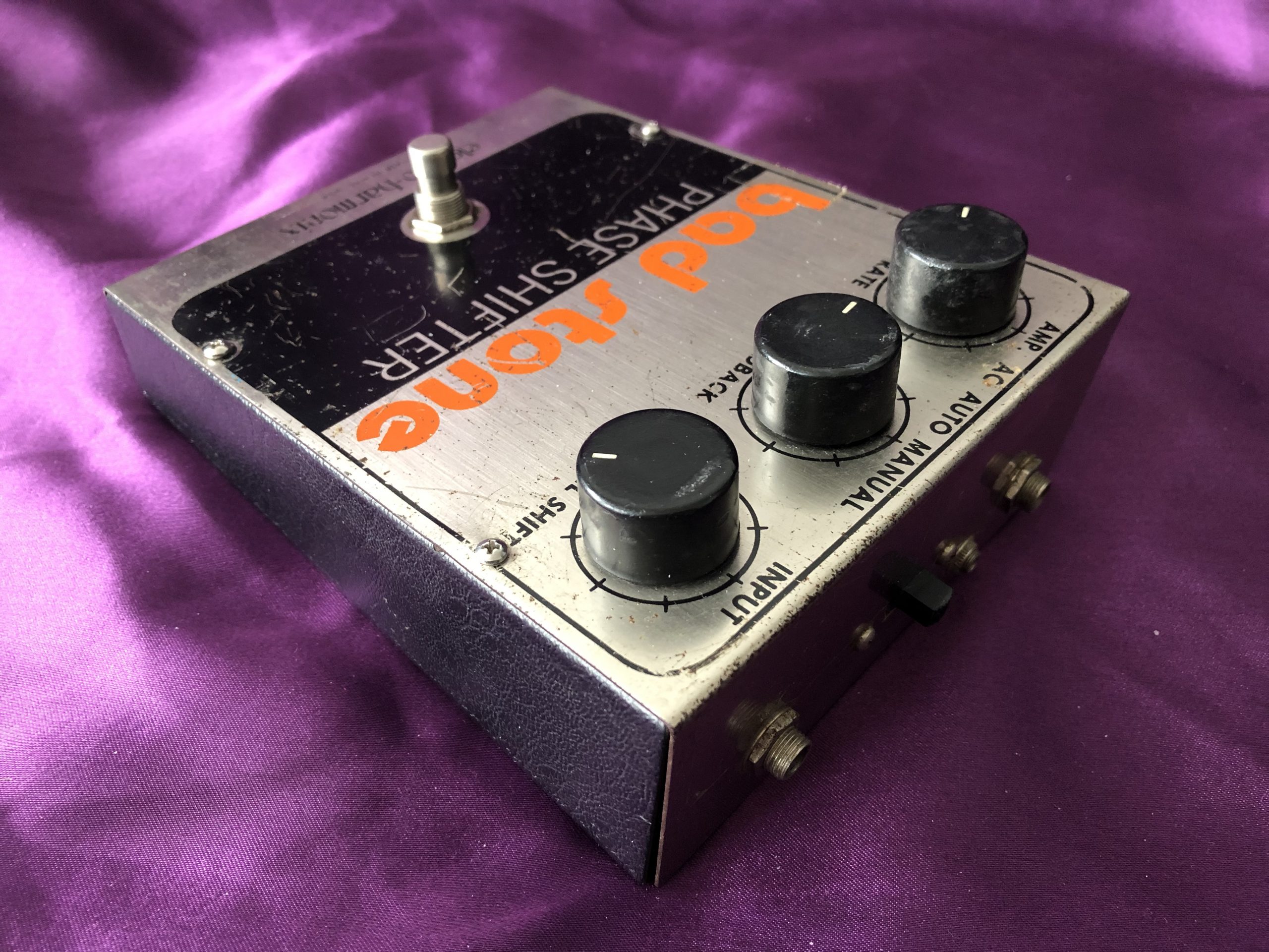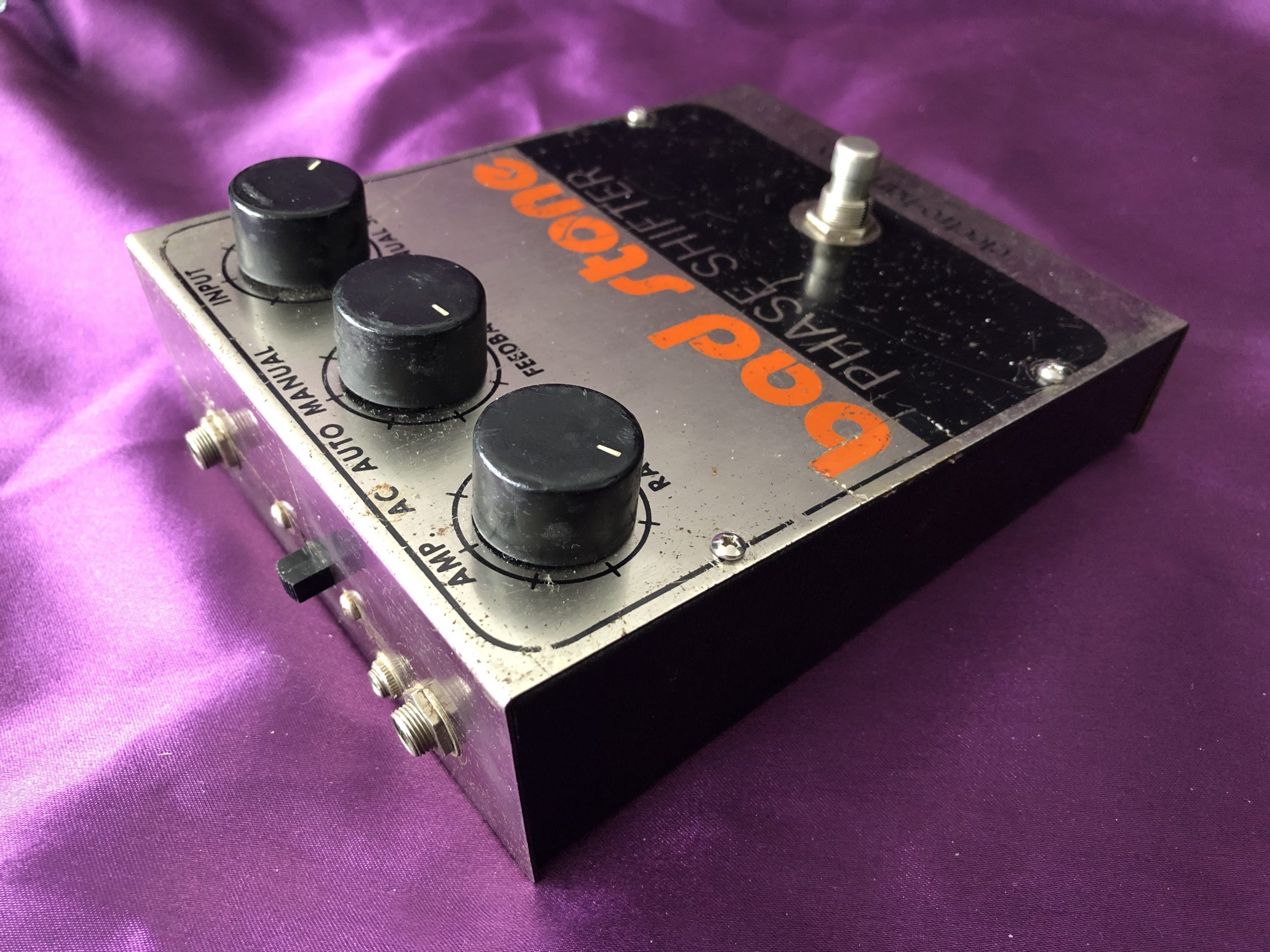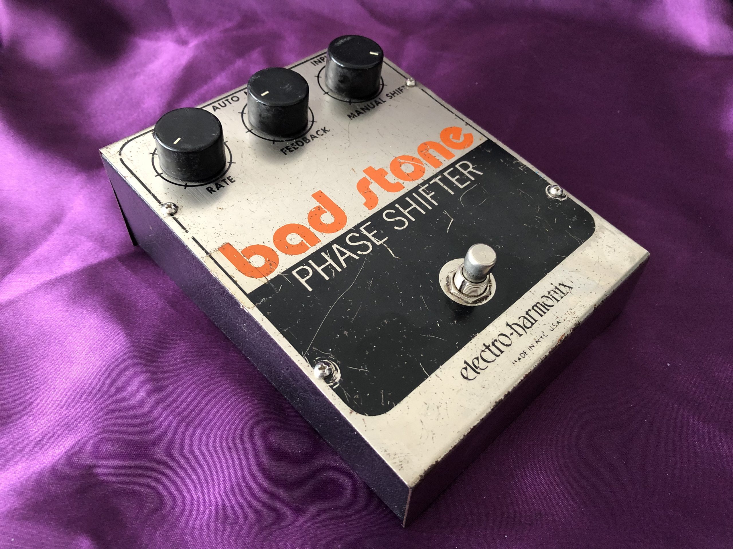 Back in the day, I used to have one of these late 1970s Electro‑Harmonix Bad Stone Phase Shifter’s, owned from new. At the time, it didn’t seem to a novice guitarist that it offered much more than the smaller and simpler Small Stone, so the latter remained and the Bad Stone went. Now, a Bad Stone is back in the family and thoroughly deserves its pride of place. As with many of the chrome plated and screen printed pressed steel enclosures of the time, they are showing signs of age and use. However, this cool scruffy aesthetic belies the underlying robustness of the Electro‑Harmonix enclosure, which has actually endured well. The battery clip is a replacement but everything else is original and working very well. The LFO tips over into continuous hum at the extreme of the ‘Rate’ control, which I don’t recall the original doing, so it may need a bit of TLC at some point. The Bad Stone is a different animal when contrasted with its Small Stone sibling or the MXR pedals. The swirly sounds are typical of 1970s analogue phase pedals which, on the surface, seems to belittle its characteristics but is actually a backhanded compliment – this really is a classic of its era and rightly so. The amount of control over the effect is significant, especially compared to the Phase 90’s single ‘Speed’ knob, or even the Small Stone’s limited feedback/depth control. Modern phase effects can sound all too clinical, while these older all‑analogue pedals just seem to get better over the years, relatively speaking. Despite the faithful reissues and copies that have appeared along the way, the originals still stand up very well, if a touch noisy at times.