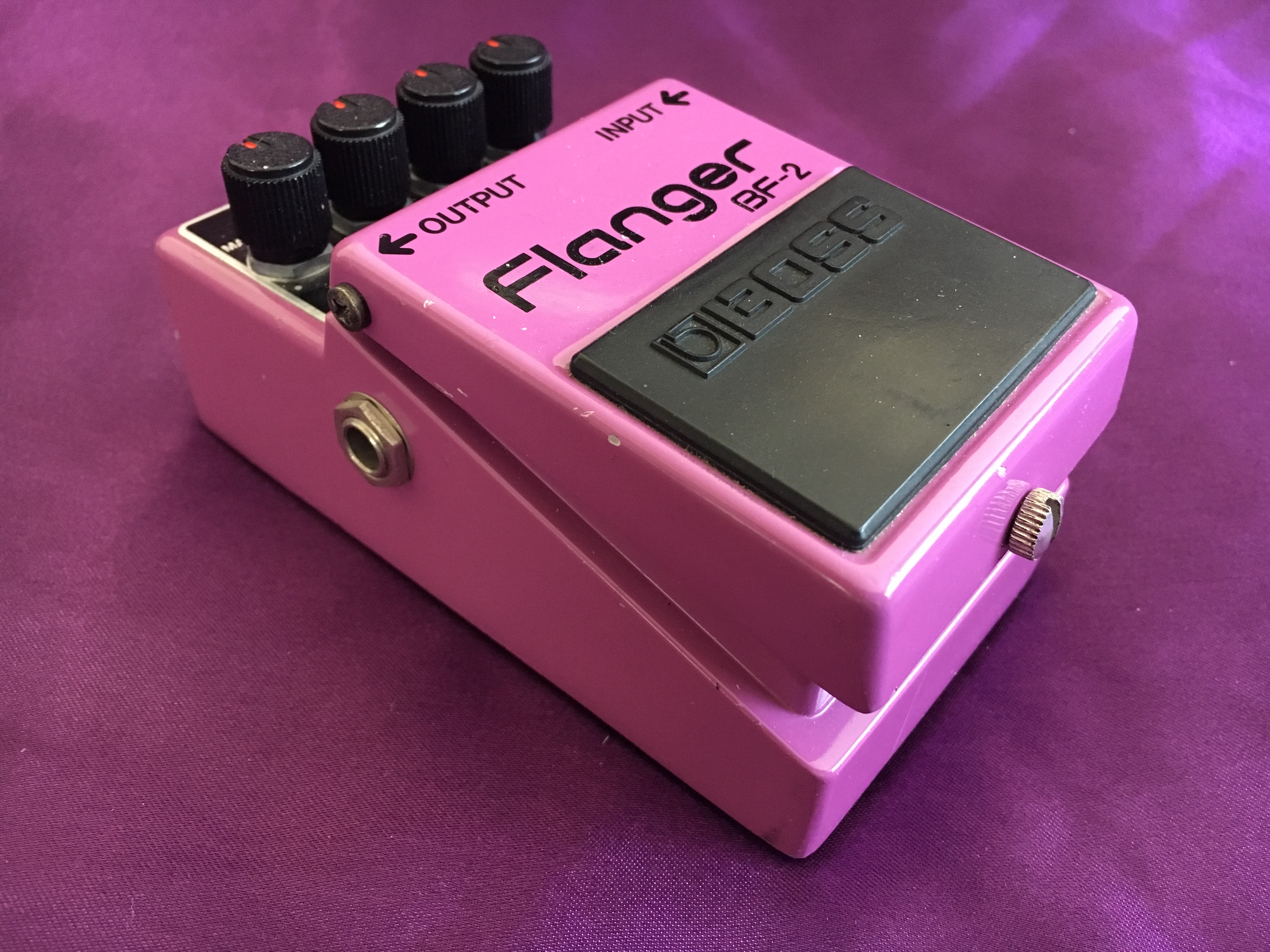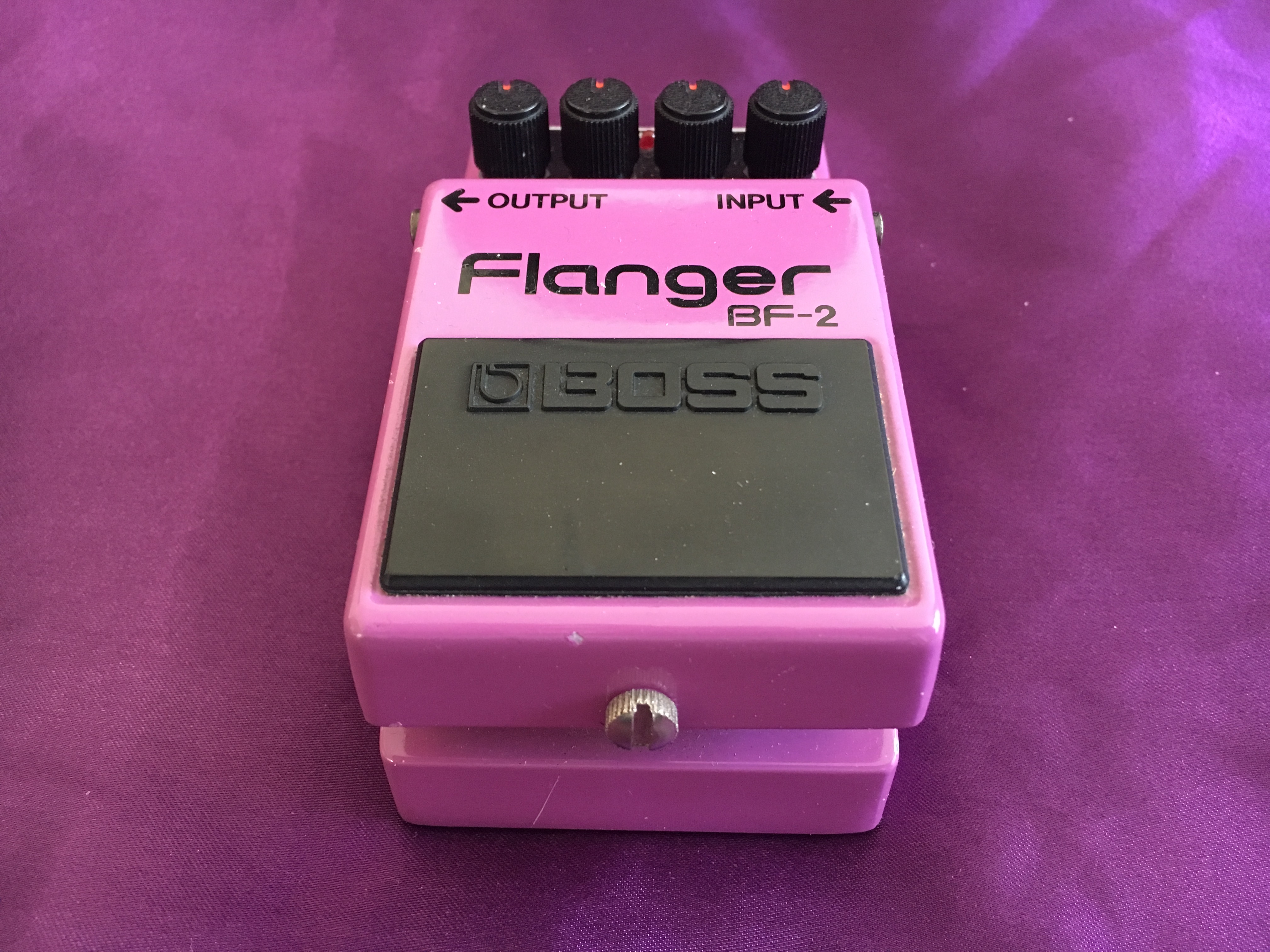 In many ways the 1980s was a great decade, including rapid innovation and adventurous development of guitar effect pedals. Analogue flanger pedals first appeared in the late 1970s and fall into the category of modulation effects. They work by combining the original input signal with an electronically delayed signal. The flanging effect is probably best known its distinctive soaring ‘jet‑engine’ sound, as well as a wide variety of short delay, chorus and vibrato effects. The compact BOSS BF‑2 Flanger replaced the somewhat bulky and utilitarian BF‑1 in June 1980 and stayed in production almost unchanged, except for a few cosmetic differences, for over 20 years until it was replaced in December 2001 by the BF‑3. Production began in Japan and was moved to Taiwan from c.1990. The BOSS BF‑2, born in the 1980s, is one of those pedals that genuinely warrant being called an ‘industry standard’ and a genuine classic.