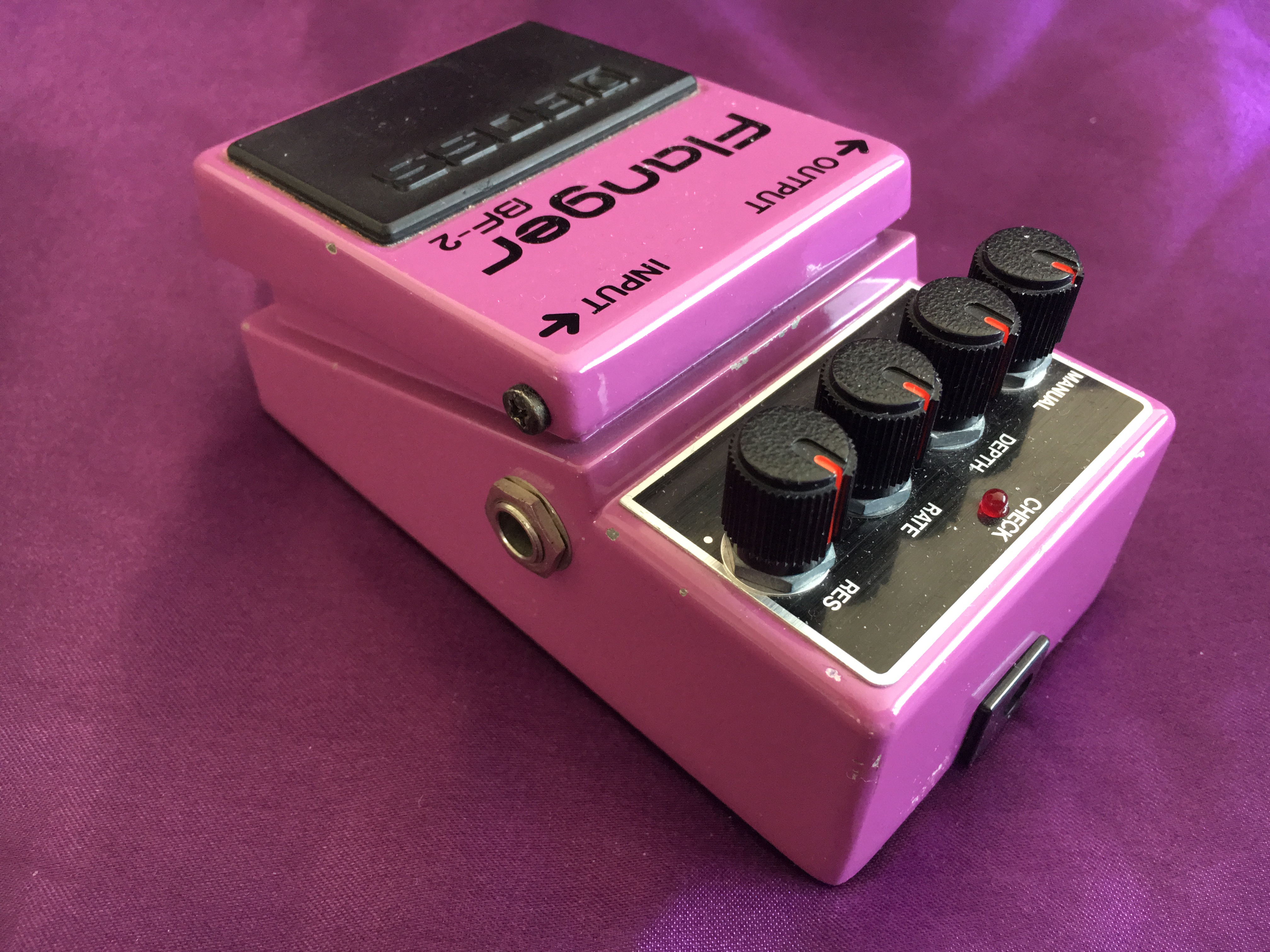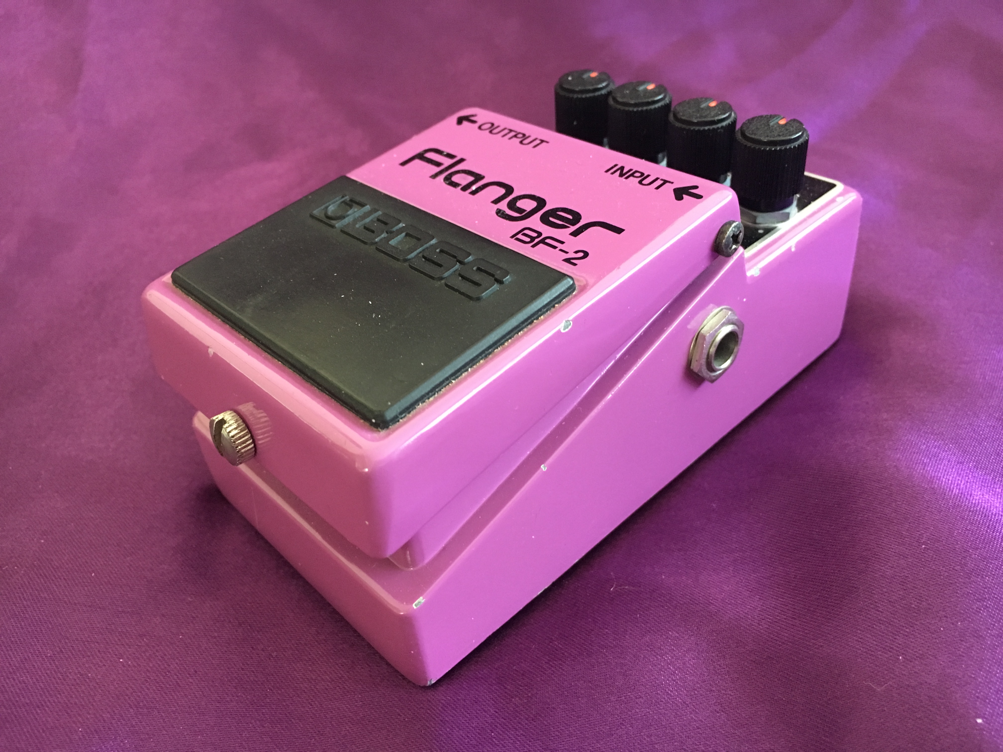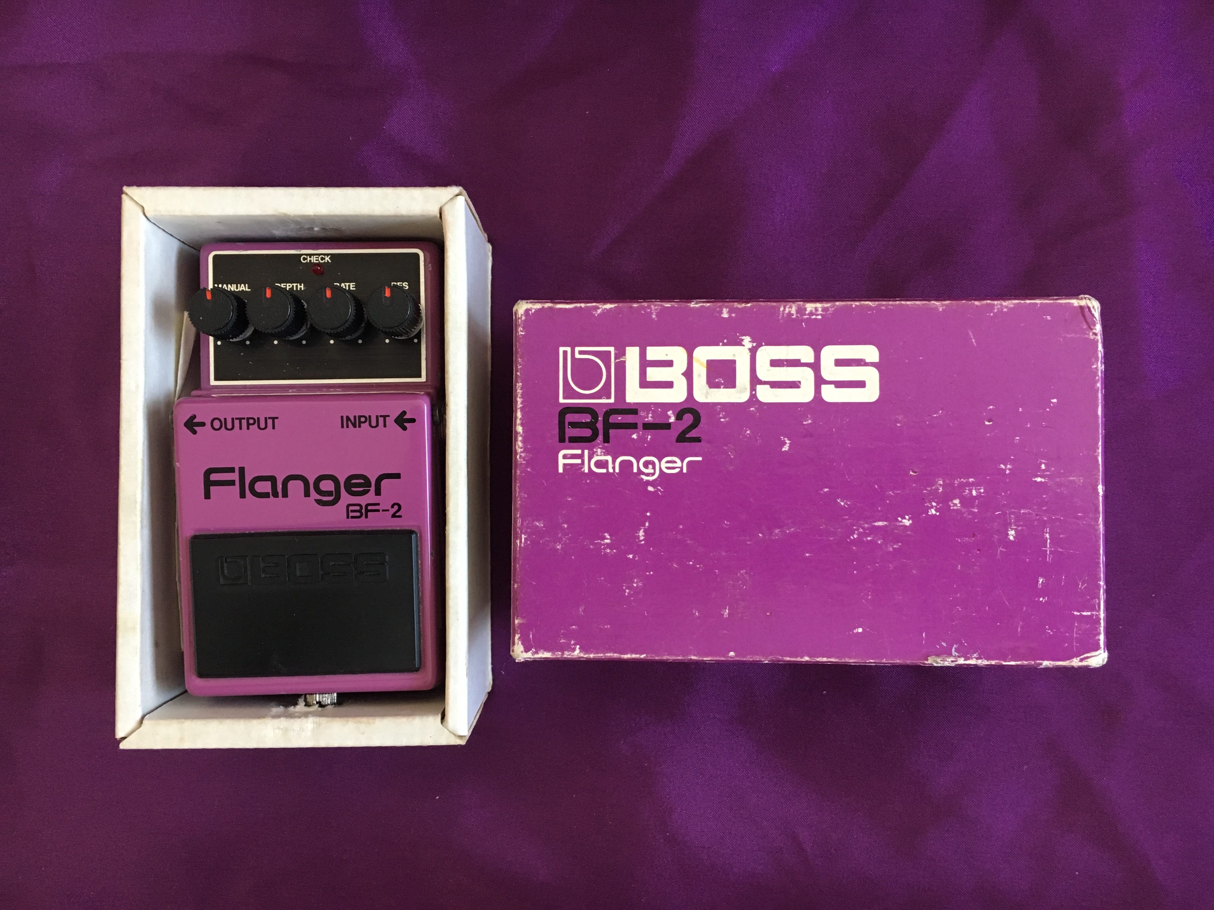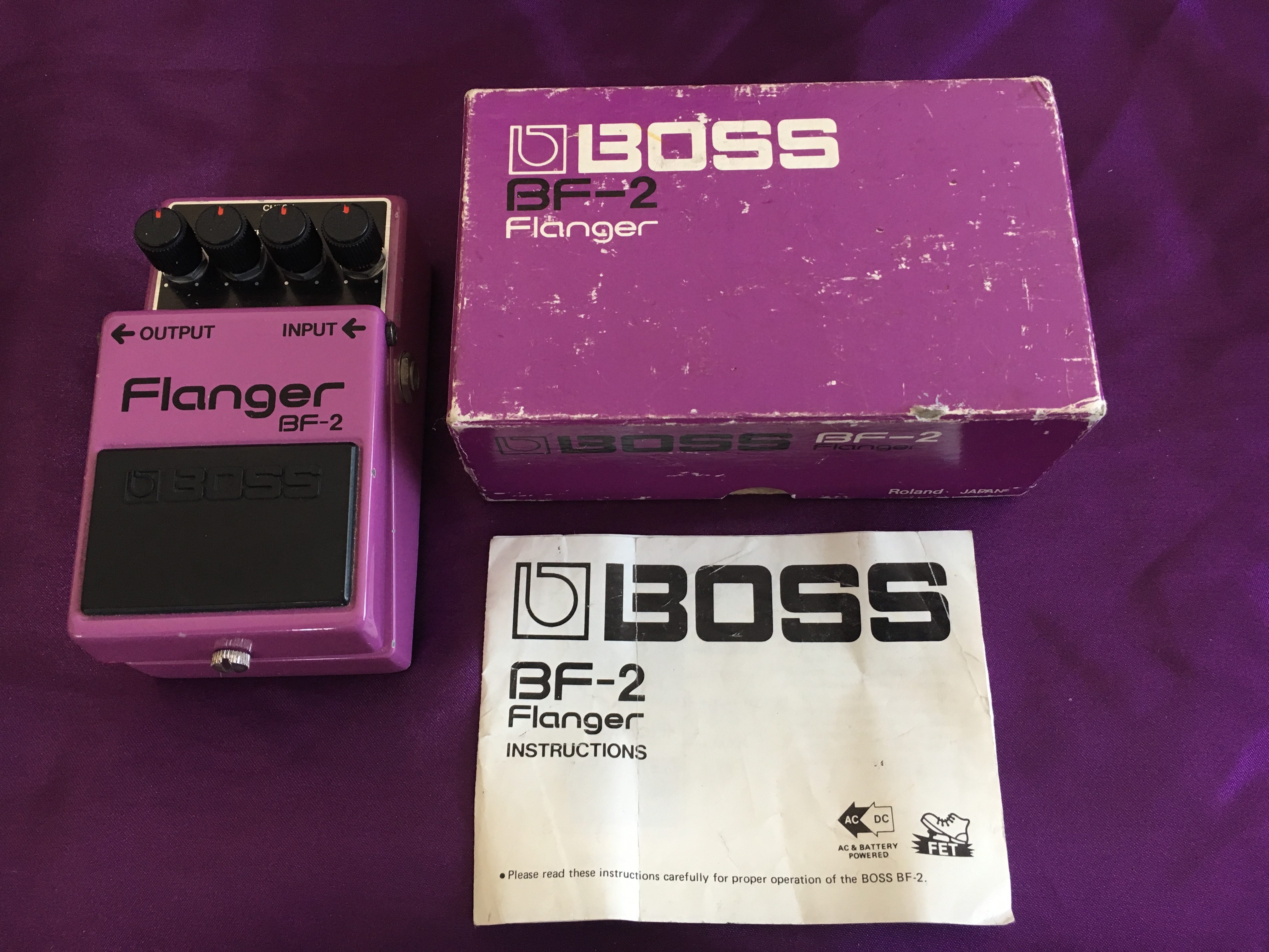 This particular purple pedal is a relatively rare early example, made in April 1981 by the Roland Corporation. It has many of the features of the (best) early BOSS pedals including the black ‘Made in Japan’ label on the base of the unit, the sought after early BOSS ‘silver screw’ and the stamped batch number in the battery compartment. As far as I know, no BF‑2s feature the ‘long dash’ model name. The 4-knob control layout is quite modern compared to the traditional 2/3‑knob pedals of this period and the knobs themselves are the original all‑black ones, unlike the later pedals that came with white‑tops. The evocative warm vintage analogue sounds are amongst the best of their breed, well up with the Electro‑Harmonix Electric Mistress. This particular stomp box is in fantastic condition with hardly a mark to indicate its age. Unusually, it comes complete with its original box and instructions. These early ‘silver screw’ BOSS BF‑2s are quite uncommon in this condition and are rapidly becoming future collectibles, attracting vintage market values to match.
