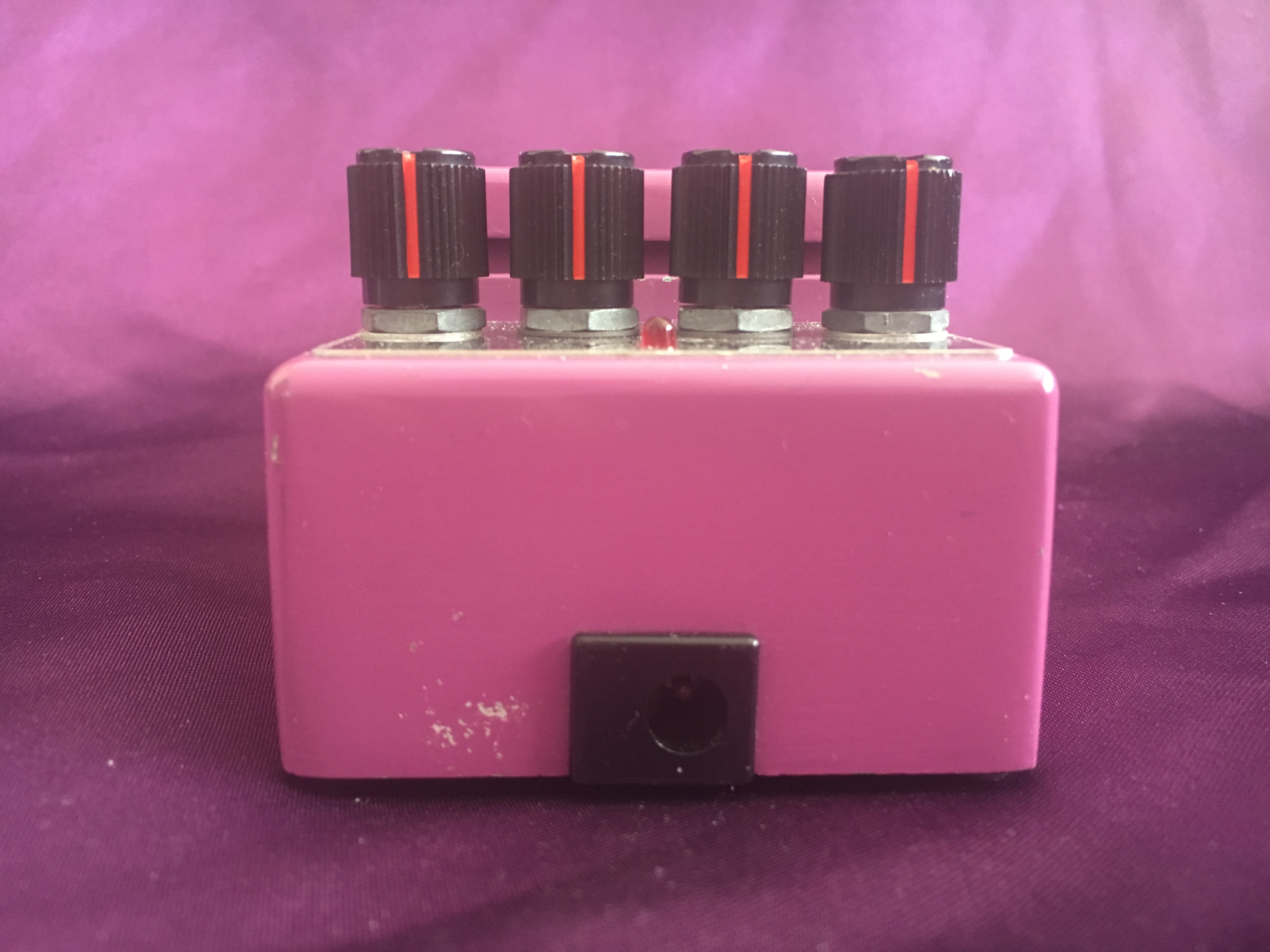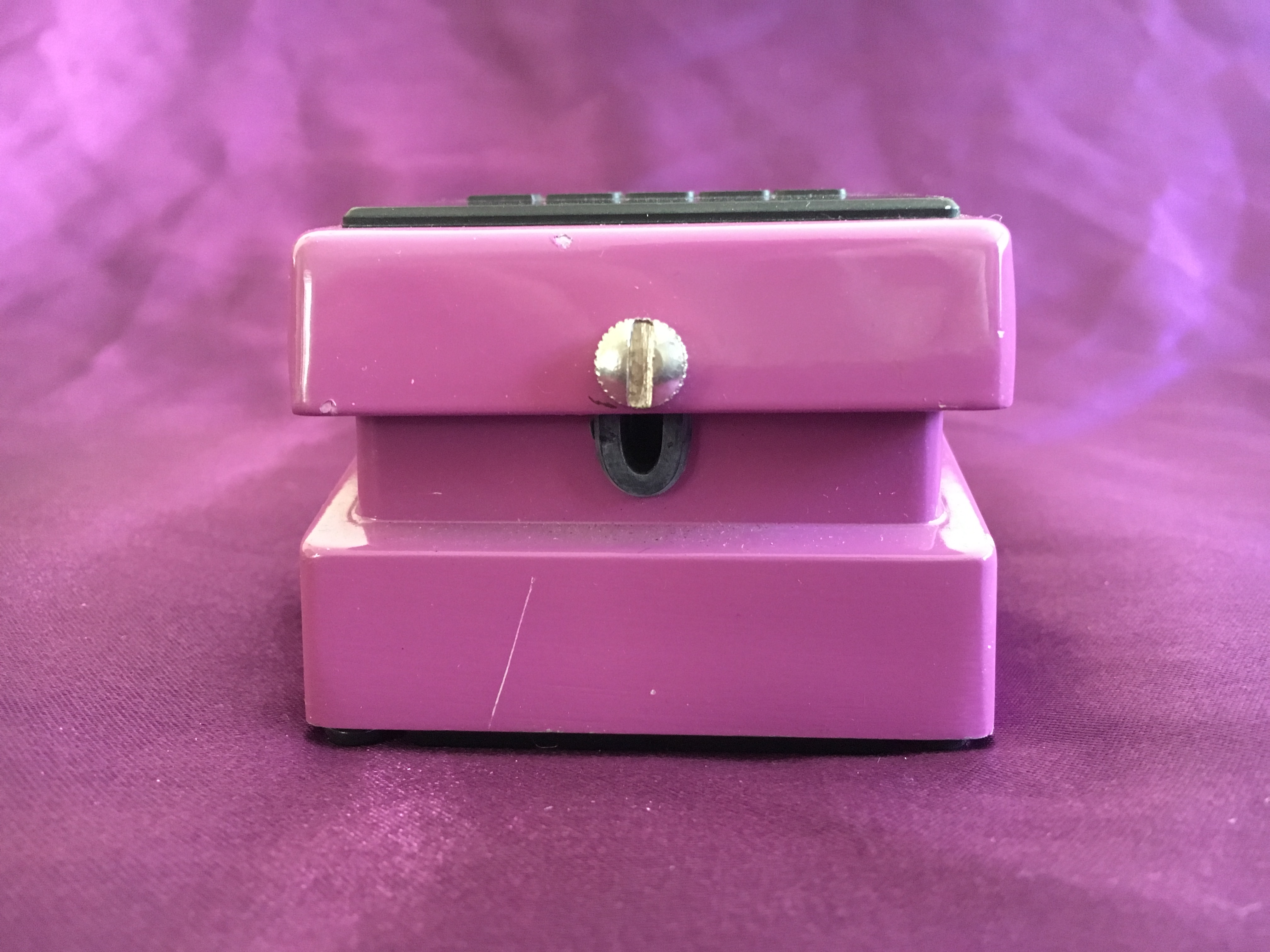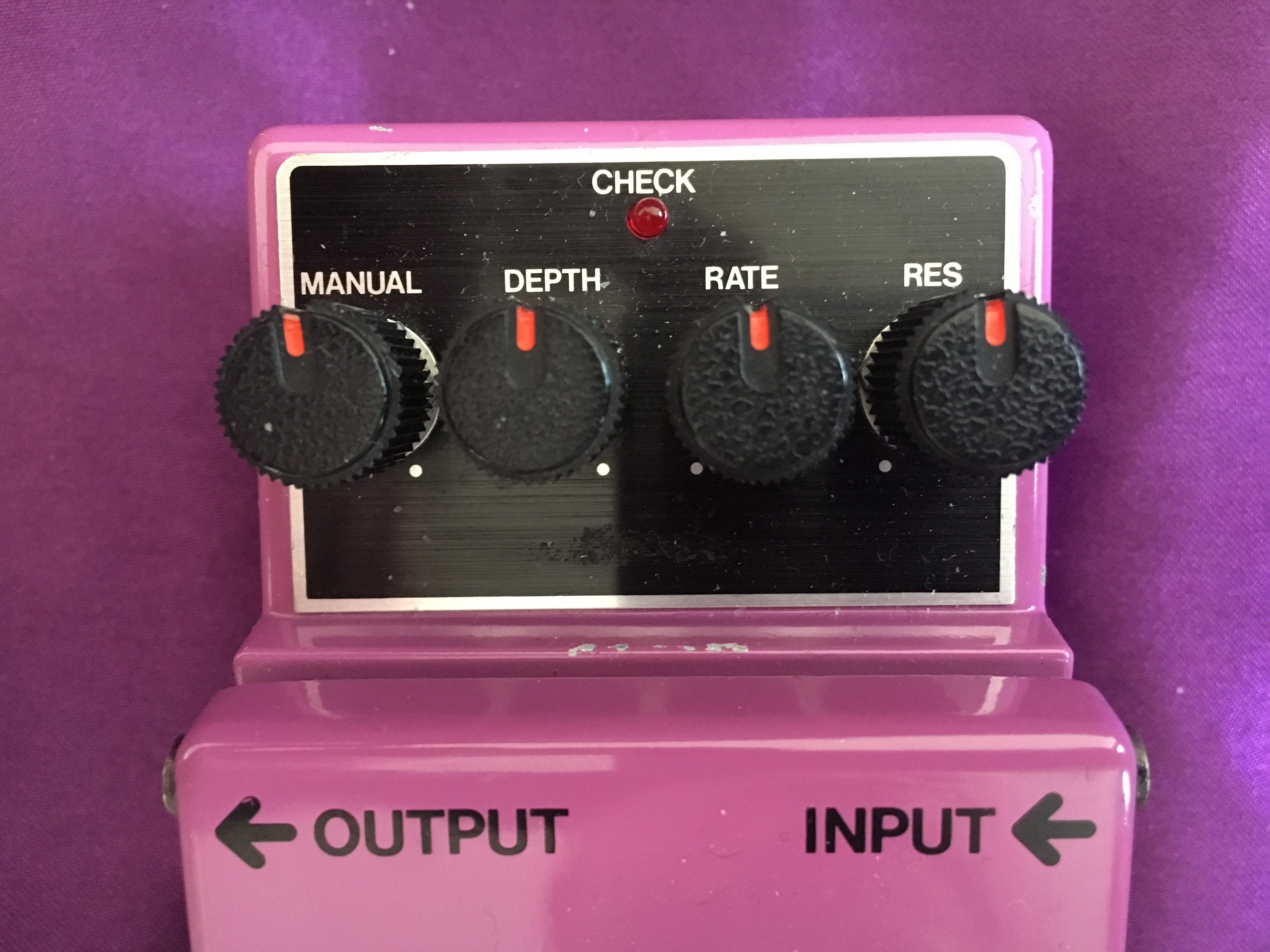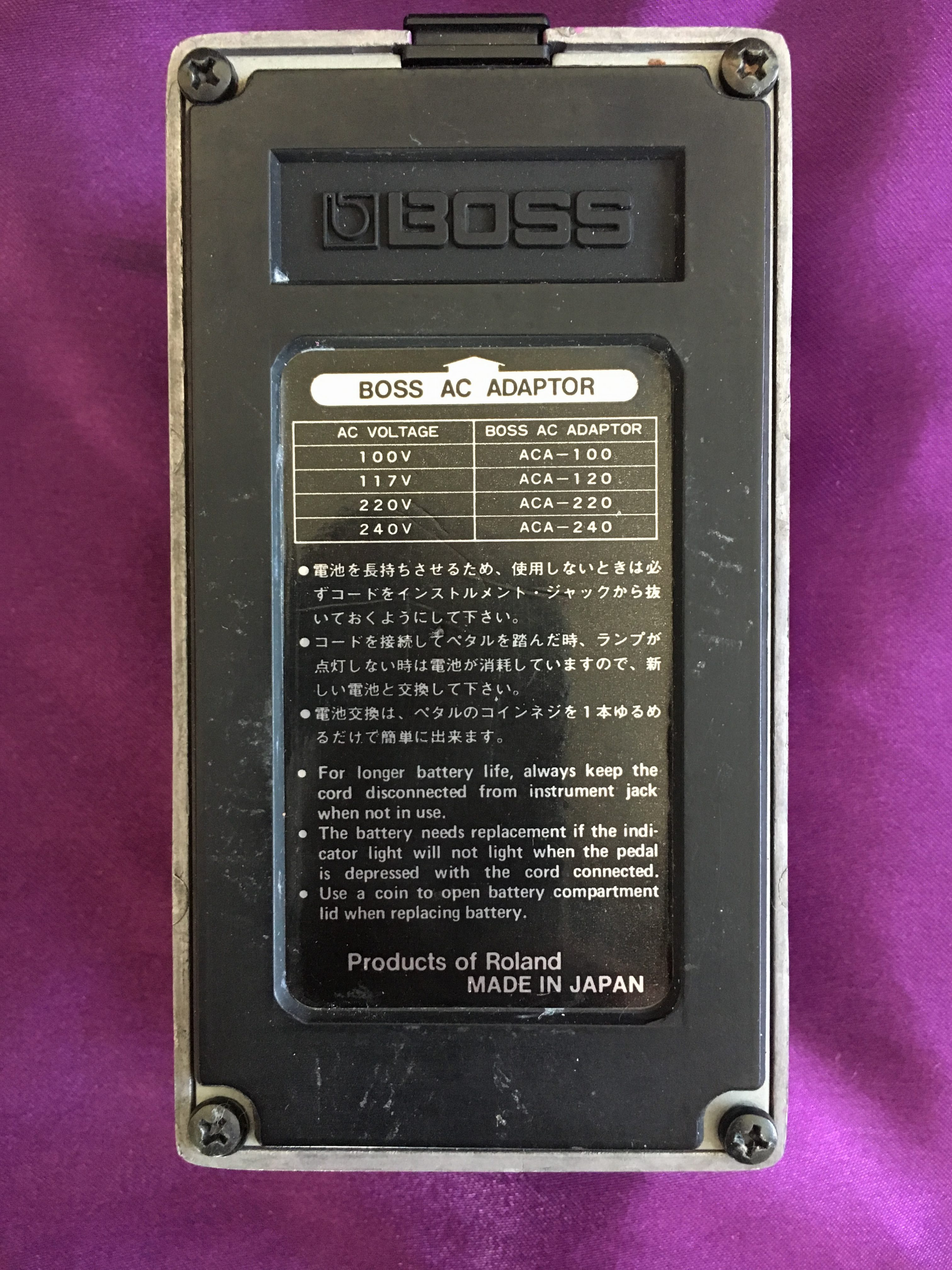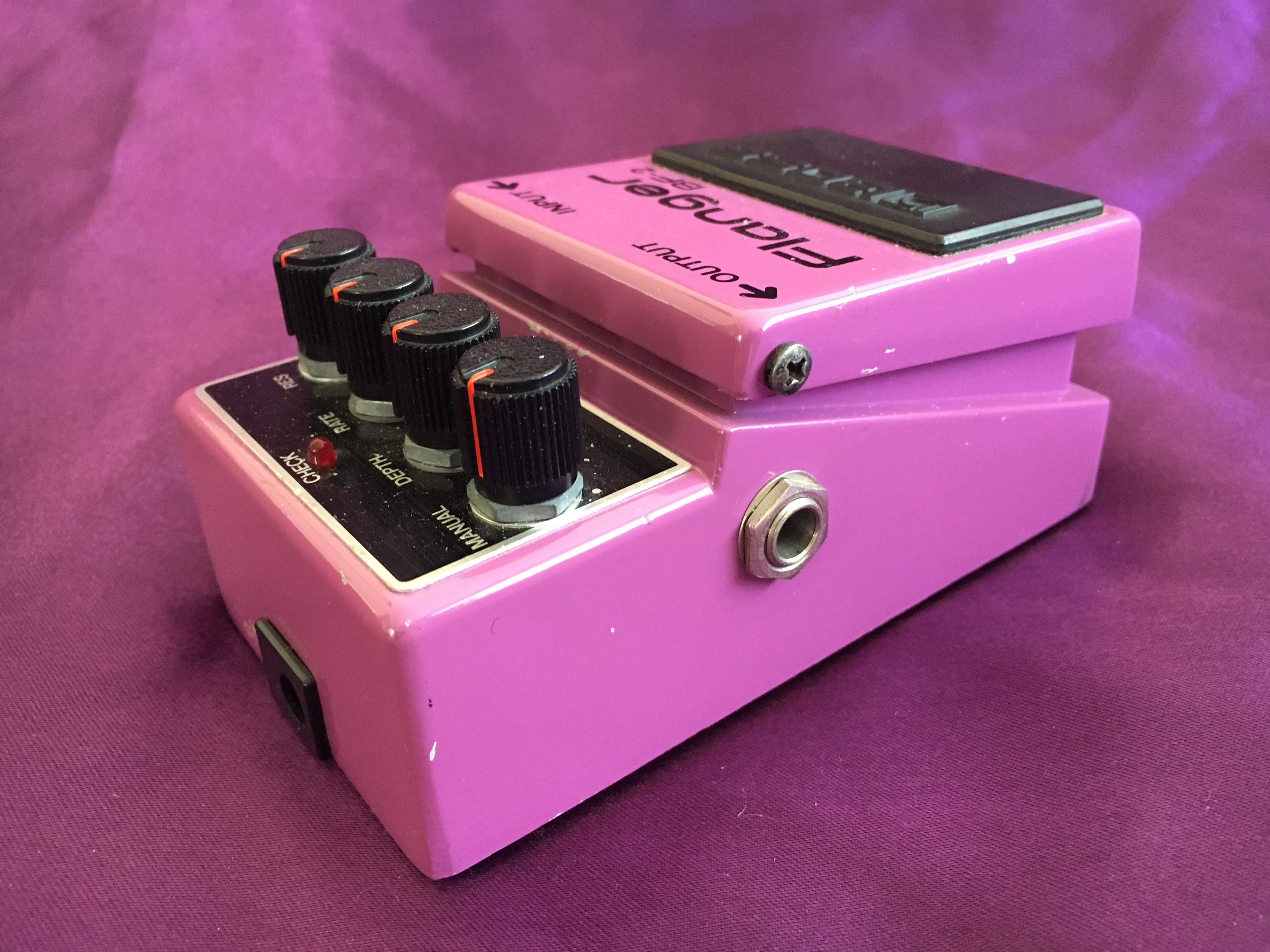 This particular purple pedal is a relatively rare early example, made in April 1981 by the Roland Corporation. It has many of the features of the (best) early BOSS pedals including the black ‘Made in Japan’ label on the base of the unit, the sought after early BOSS ‘silver screw’ and the stamped batch number in the battery compartment. As far as I know, no BF‑2s feature the ‘long dash’ model name. The 4-knob control layout is quite modern compared to the traditional 2/3‑knob pedals of this period and the knobs themselves are the original all‑black ones, unlike the later pedals that came with white‑tops. The evocative warm vintage analogue sounds are amongst the best of their breed, well up with the Electro‑Harmonix Electric Mistress. This particular stomp box is in fantastic condition with hardly a mark to indicate its age. Unusually, it comes complete with its original box and instructions. These early ‘silver screw’ BOSS BF‑2s are quite uncommon in this condition and are rapidly becoming future collectibles, attracting vintage market values to match.