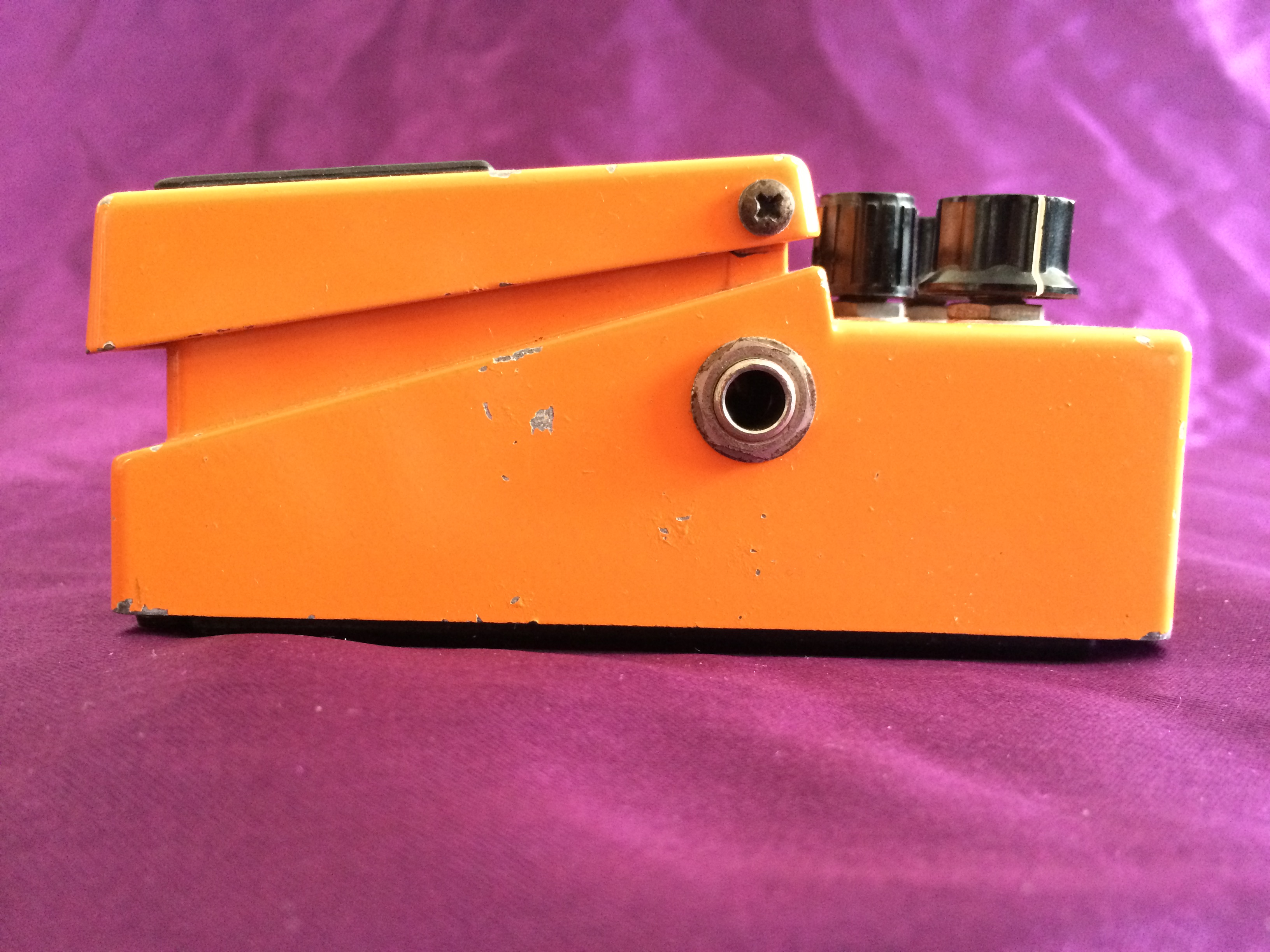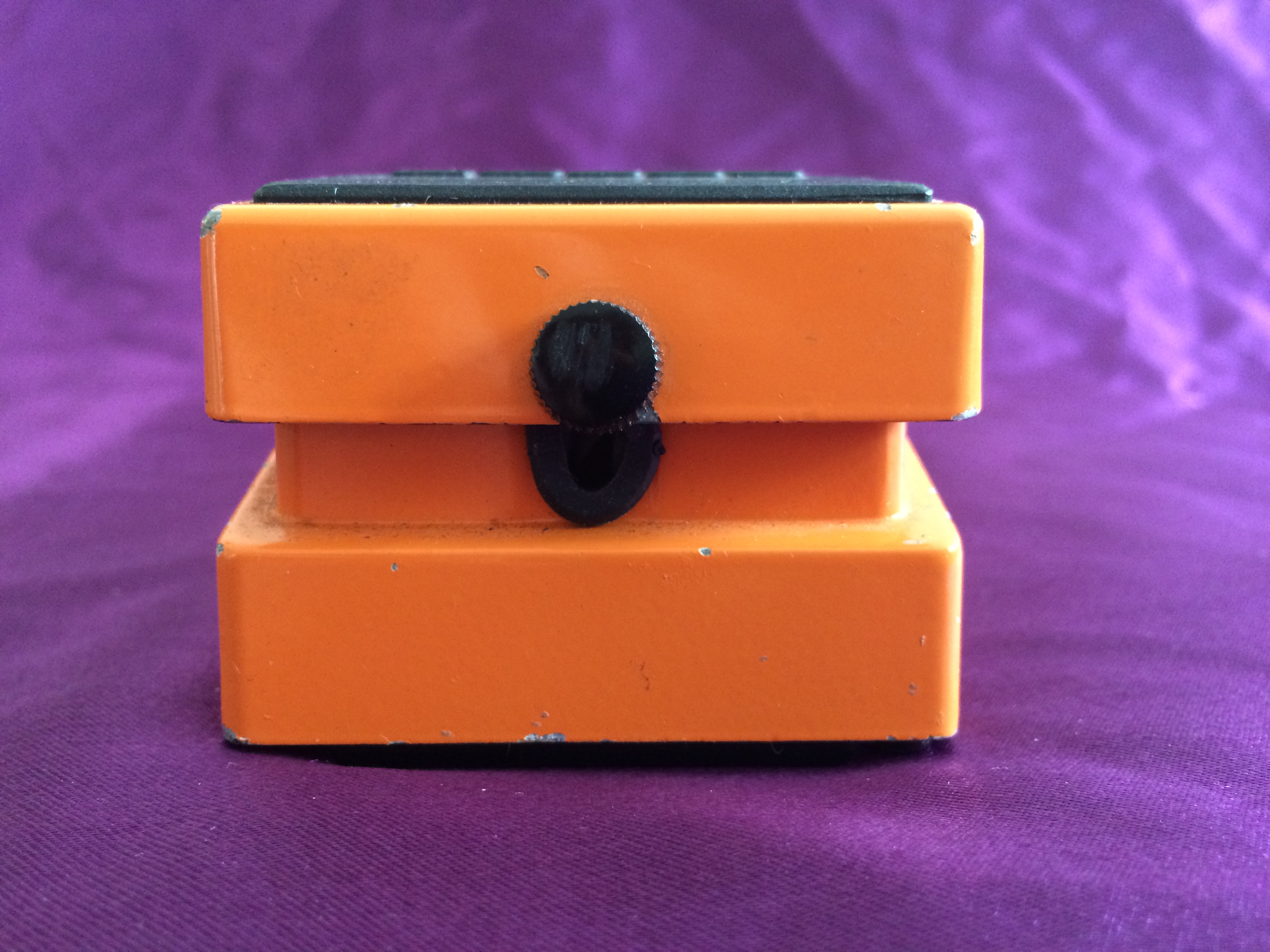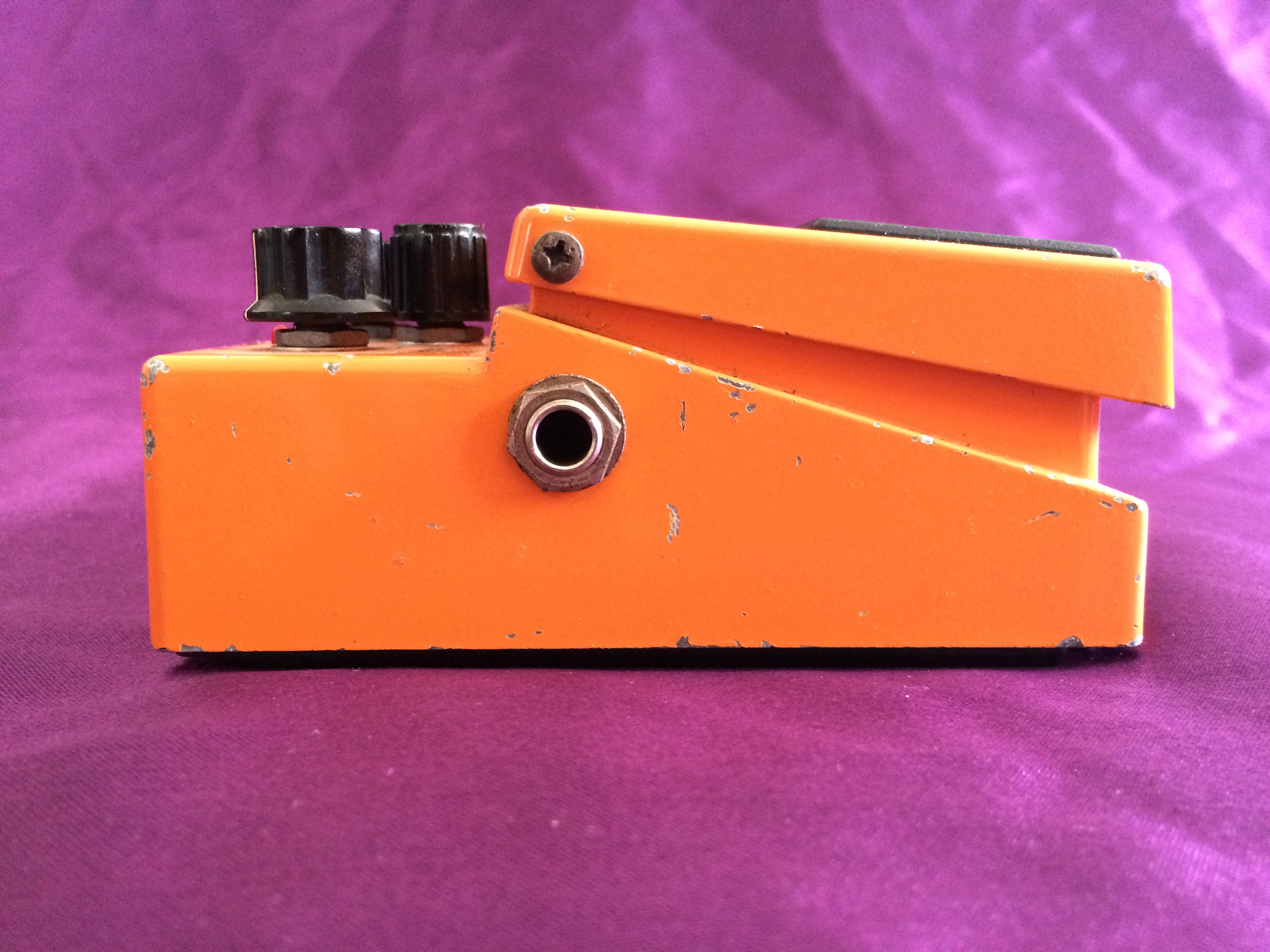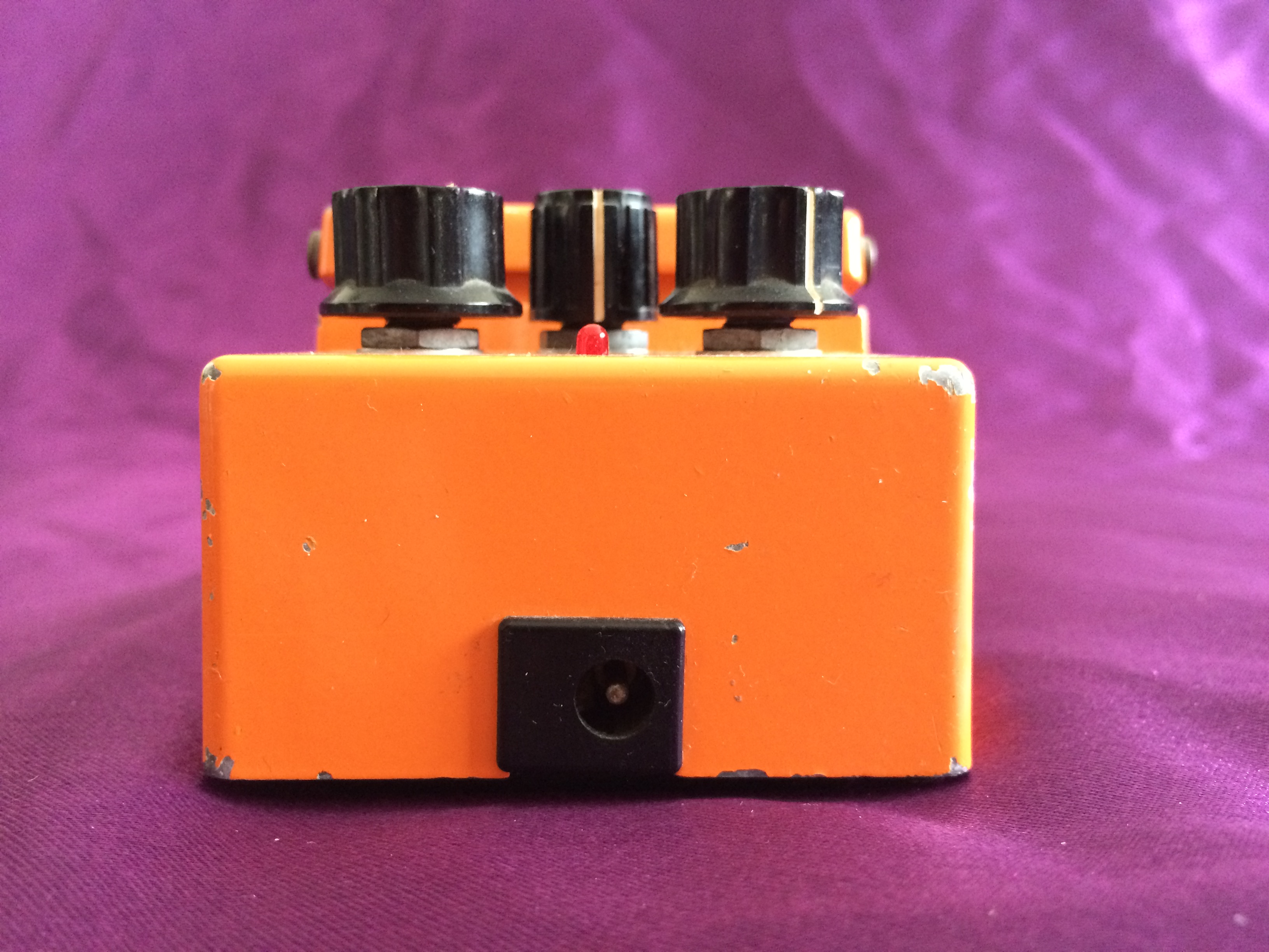 This BOSS DS‑1 Distortion may be described as a ‘transition’ model – it has the much‑coveted black ‘Made in Japan’ label and the ‘long dash’ in the model name (the letter ‘D’ sits directly beneath the letter ‘t’ in distortion, rather than the ‘i’ on later short-dash models). On the other hand, it has the normal black thumb screw for the battery compartment and the printed serial number label. Although it is difficult to be definitive, the serial number indicates that it was manufactured in August 1981, around the time that BOSS tweaked the design. None of this affects the sound, of course, which is ‘in your face’ – definitely one for savvy tone heads. Although it has clearly been ‘used’, this DS‑1 is in very good condition for its age with just a few marks to its brazen orange paintwork. If looked after, this pedal will last for many more decades yet. Grab a classic piece of 20th century distorted cool while you can.