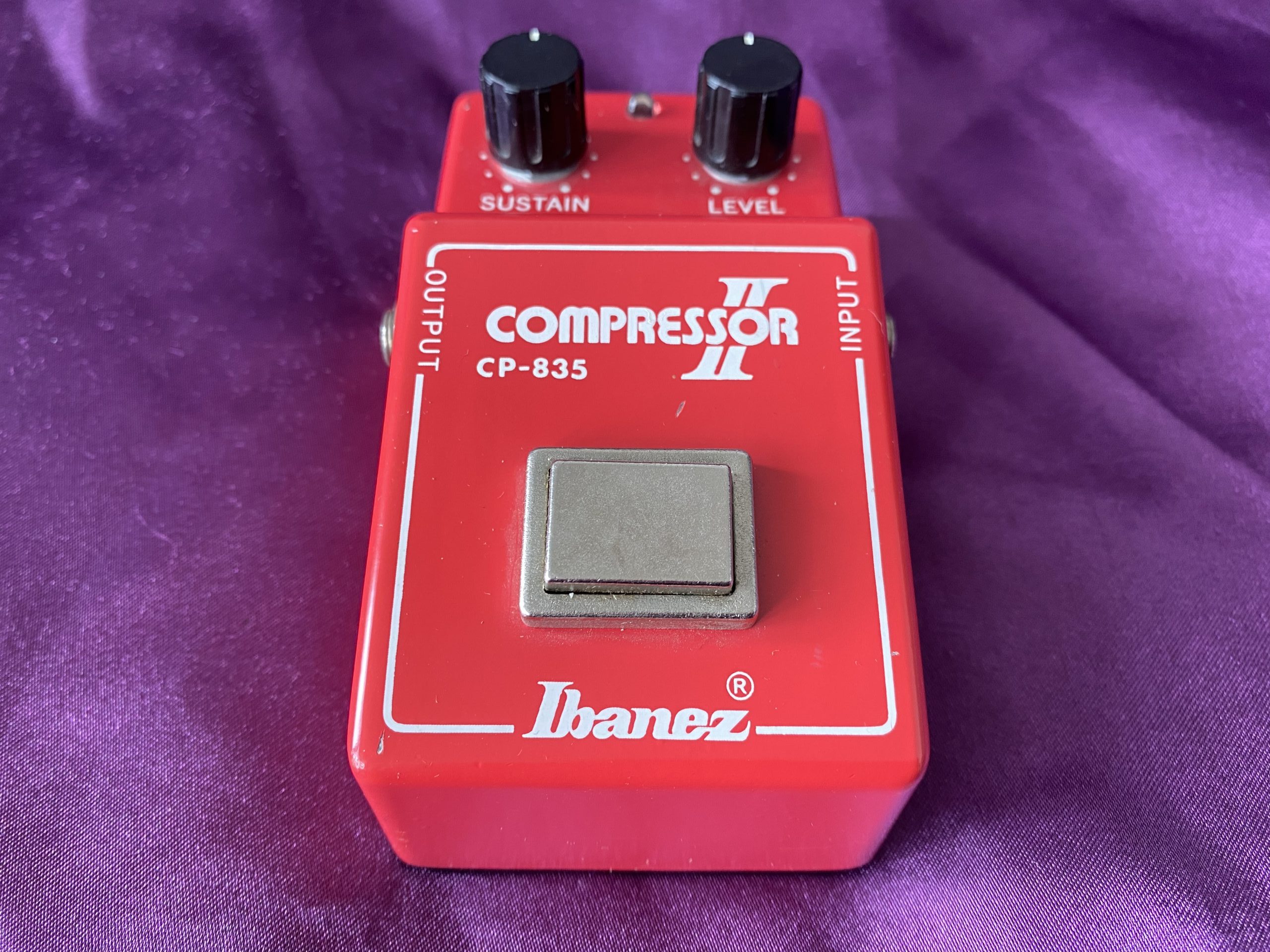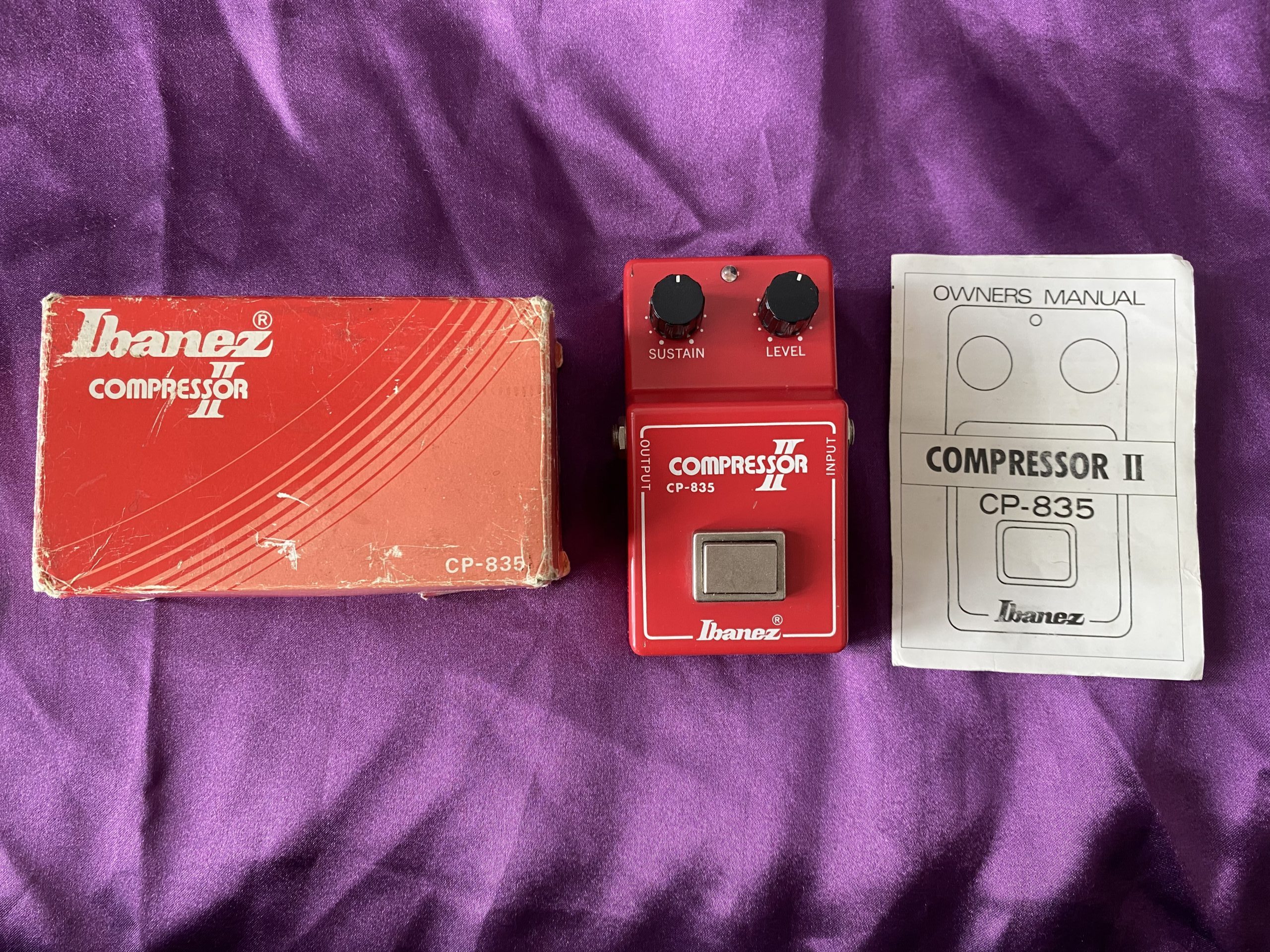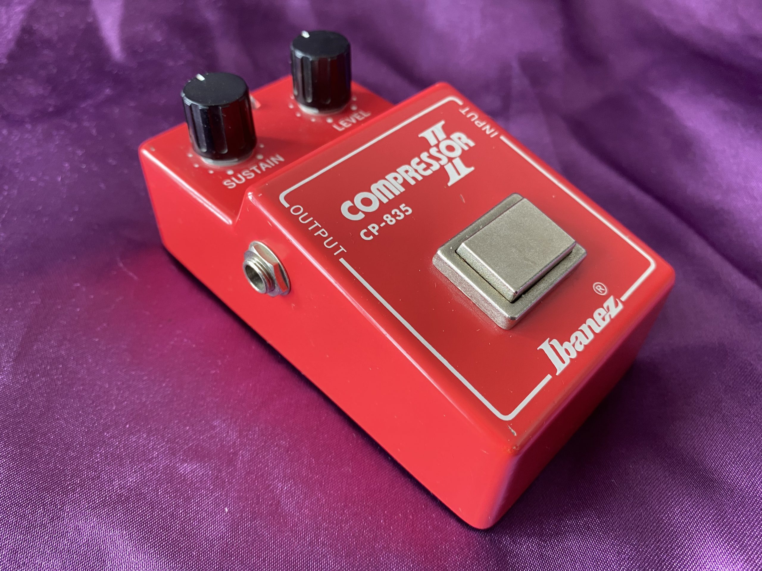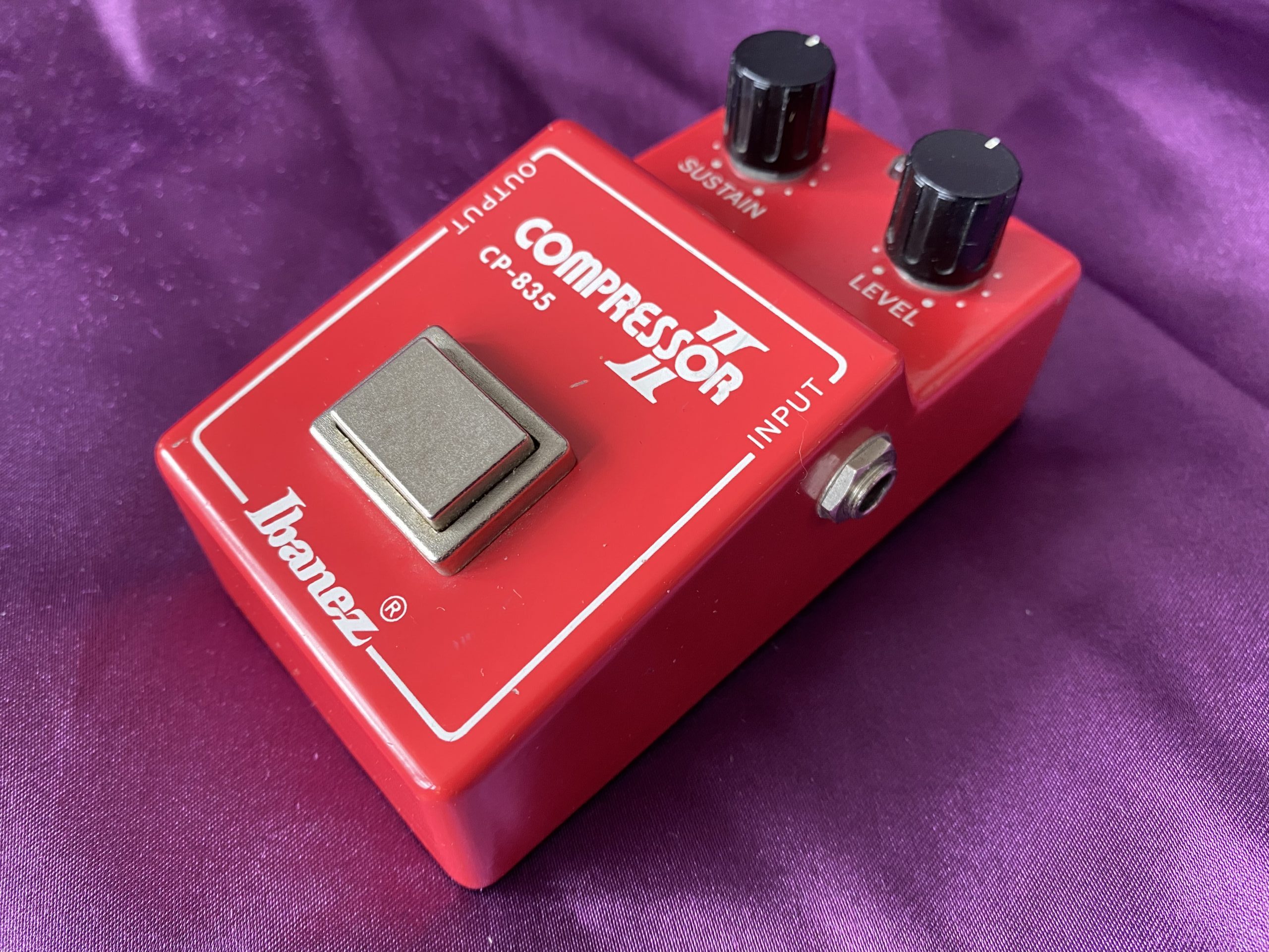This all‑original bright red 1981 Ibanez CP ‑835 Compressor II is in excellent condition and looks almost new. The enclosure shows barely any signs of use. It also comes with its original box and instruction manual, which is always a bonus for these older pedals. In addition, this CP‑835 has the features that effect collectors look for, including the ® above the ‘z’ in its logo, the black ‘Made in Japan’ label on the baseplate and the original Maxon battery compartment cover. Ibanez continually changed its specifications at the time and this one is apparently the 3rd incarnation of the CP‑835, which has the standard width box, a plain DC input jack and white level markers around the knobs. The simpler approach used by the CP‑835 makes it a great deal easier to dial in an effective, musical sustain, even though it doesn’t have quite the flexibility of control that the CP9 possesses. Personally, I prefer the back‑to‑basics approach, as used by the MXR Dyna Comp. Set the level and choose the amount of sustain, which at higher levels gives a lovely, lush bloom to the tone without it being too oppressive. It also gives a lovely sounding attack to picked notes. The Compressor II is one of those pedals that adds some ‘spit and polish’ effect on a signal, rather than mangling it into something else altogether. Many users swear by compact stomp box compressors as an always‑on tone enhancer to smooth out playing dynamics, to refine the sound, to boost a clean signal and to give an impression of increased sustain. Compressors work particularly well for guitar slide playing, although they are equally effective for many other styles. A compressor’s impact really only becomes apparent when it is switched off after playing through one for some time. The Ibanez CP ‑835 Compressor II is not one for the compulsive knob‑twiddlers out there, just a simple solution to sweet sonic smoothness.