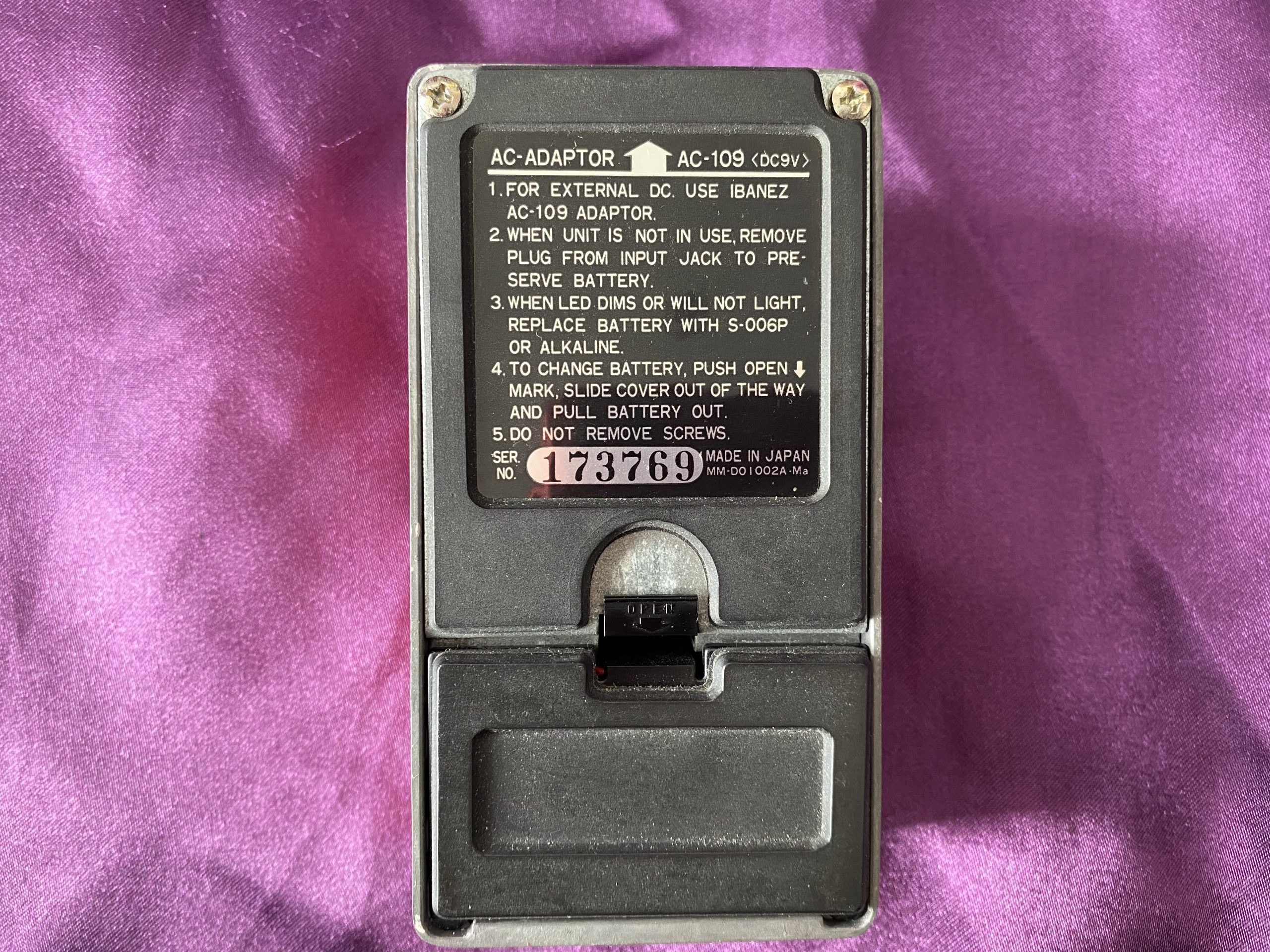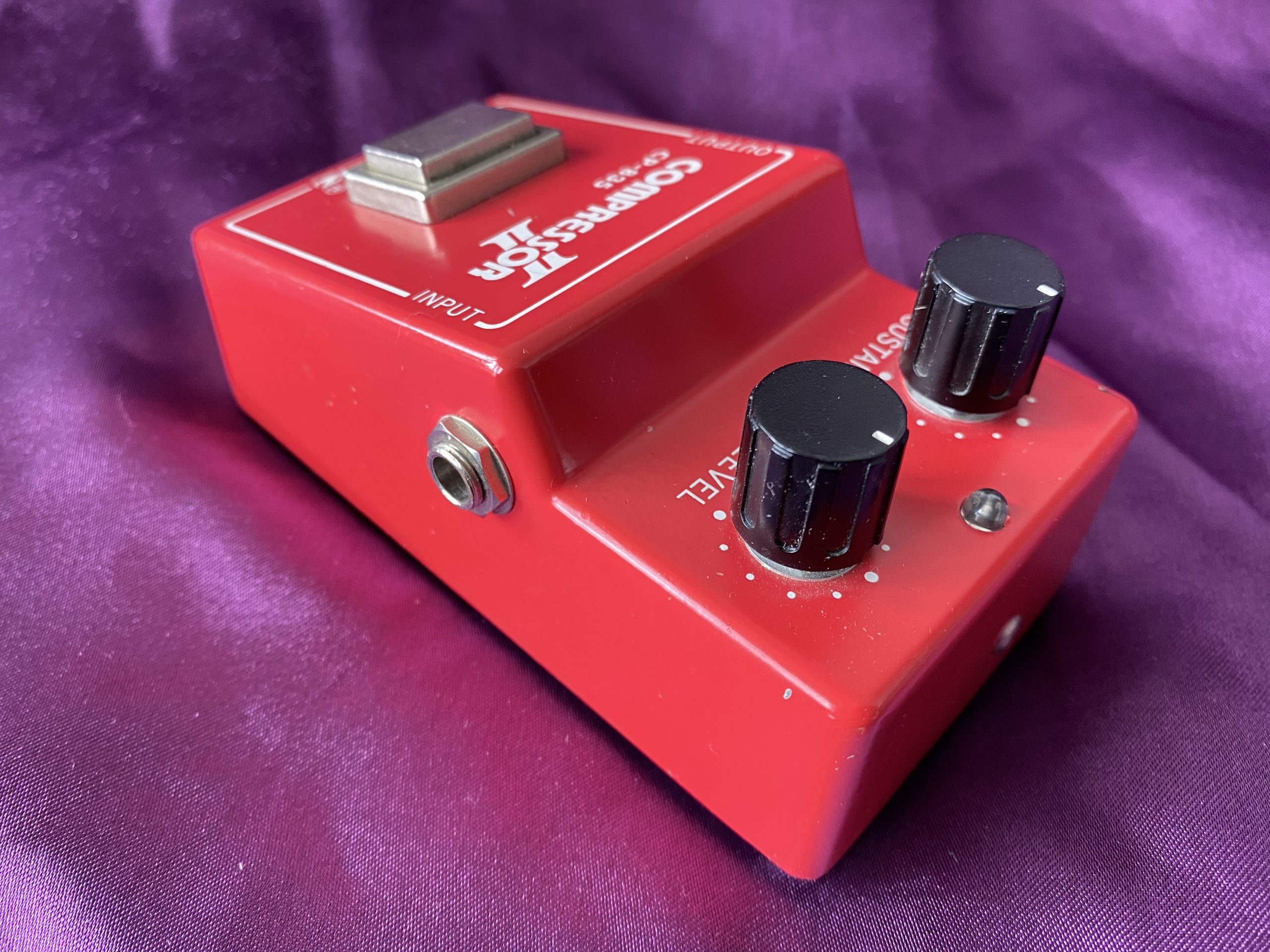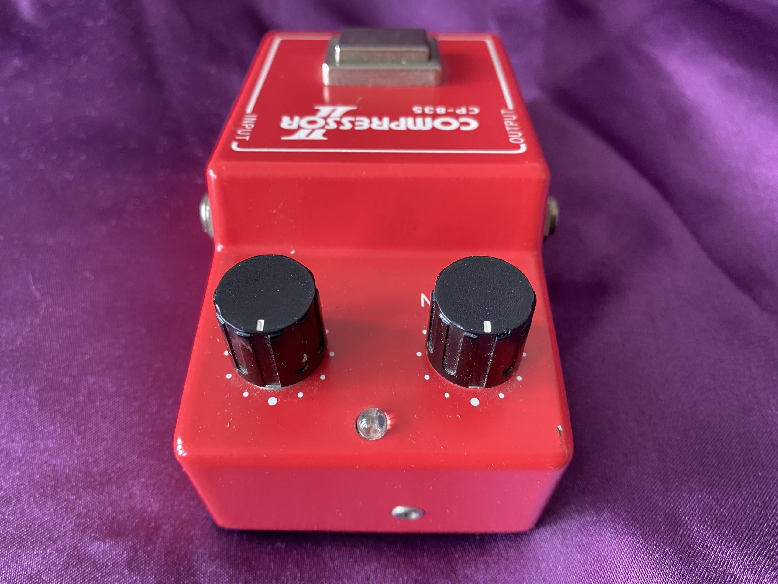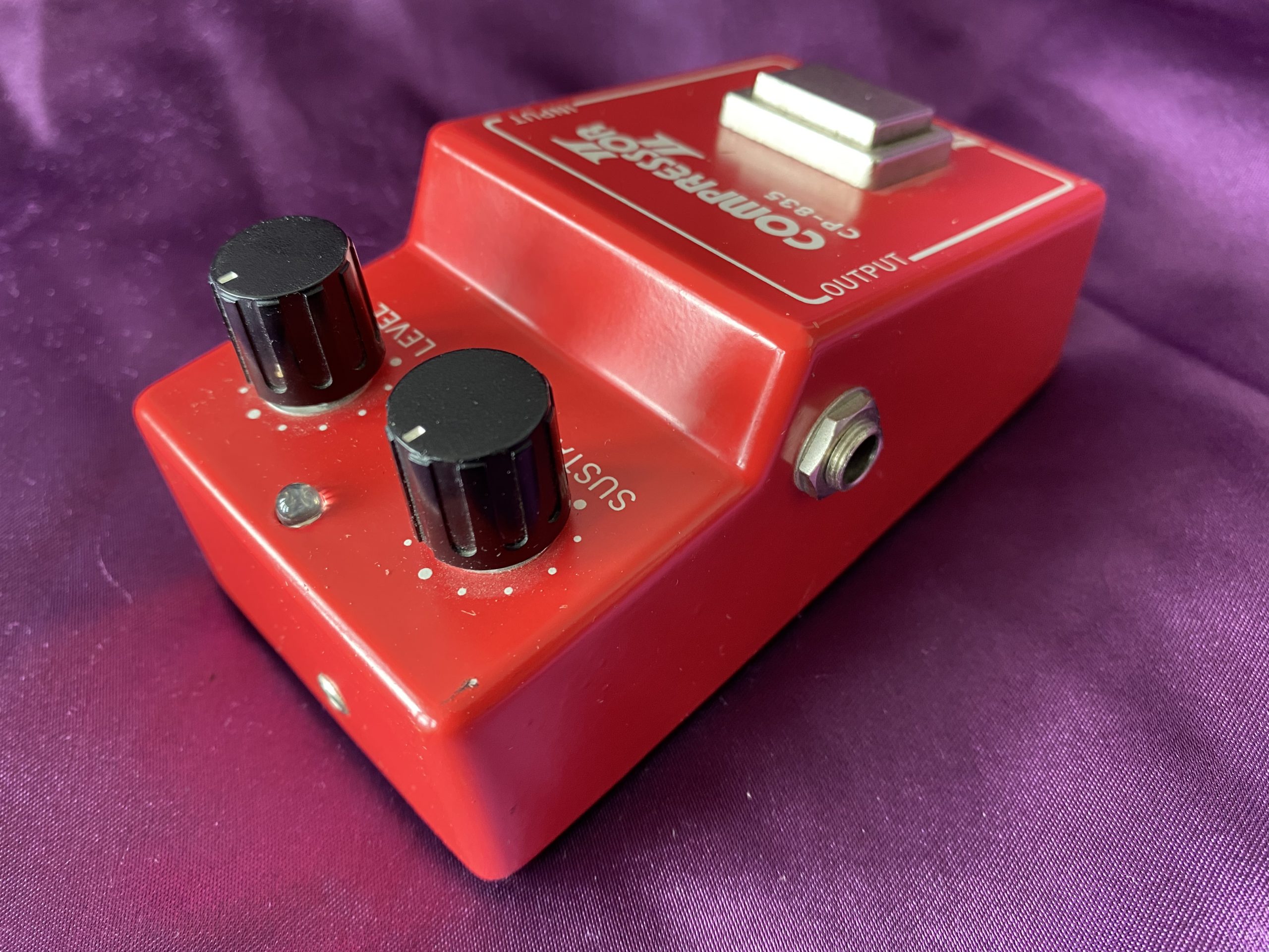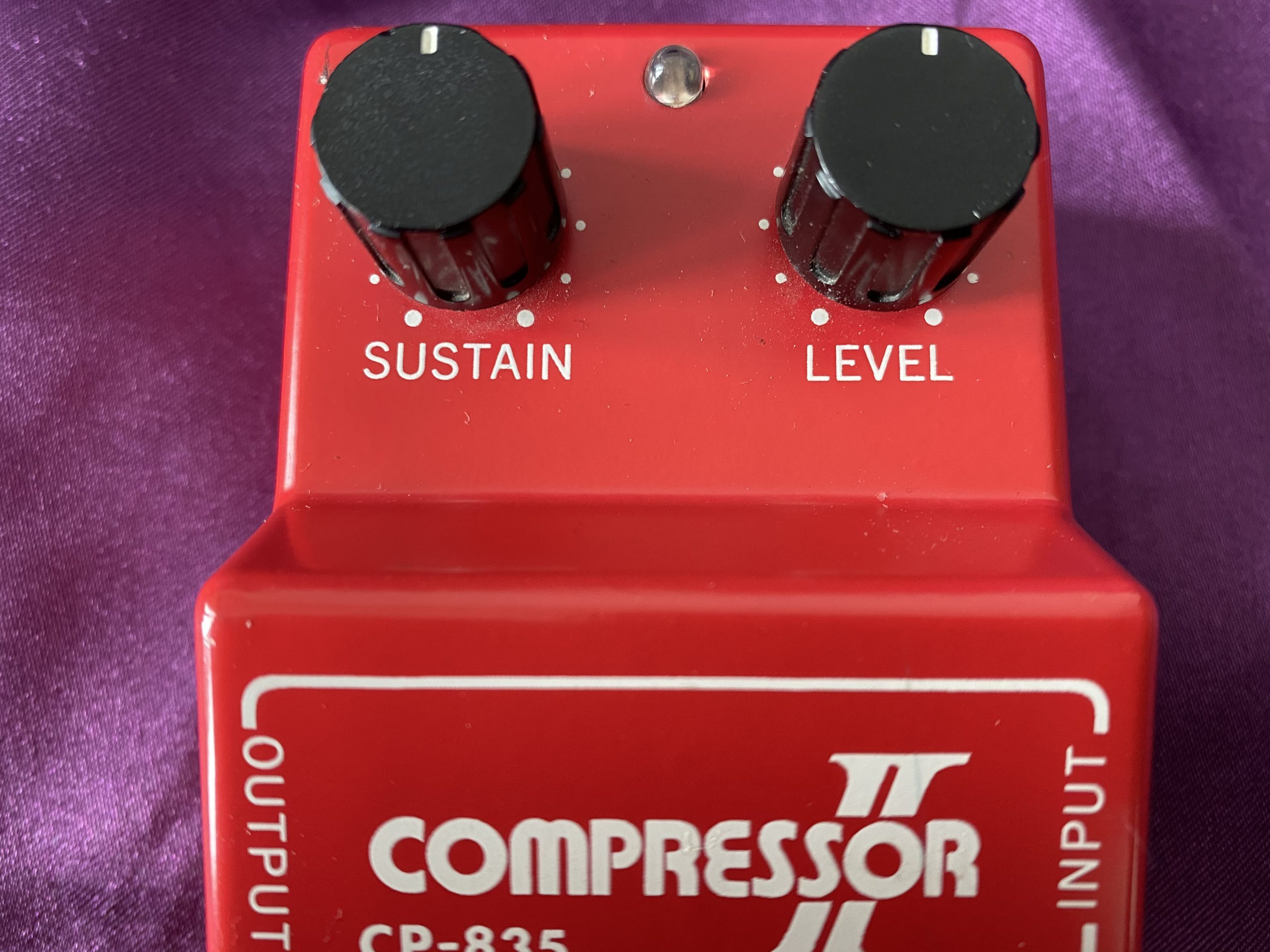 This all‑original bright red 1981 Ibanez CP ‑835 Compressor II is in excellent condition and looks almost new. The enclosure shows barely any signs of use. It also comes with its original box and instruction manual, which is always a bonus for these older pedals. In addition, this CP‑835 has the features that effect collectors look for, including the ® above the ‘z’ in its logo, the black ‘Made in Japan’ label on the baseplate and the original Maxon battery compartment cover. Ibanez continually changed its specifications at the time and this one is apparently the 3rd incarnation of the CP‑835, which has the standard width box, a plain DC input jack and white level markers around the knobs. The simpler approach used by the CP‑835 makes it a great deal easier to dial in an effective, musical sustain, even though it doesn’t have quite the flexibility of control that the CP9 possesses. Personally, I prefer the back‑to‑basics approach, as used by the MXR Dyna Comp. Set the level and choose the amount of sustain, which at higher levels gives a lovely, lush bloom to the tone without it being too oppressive. It also gives a lovely sounding attack to picked notes. The Compressor II is one of those pedals that adds some ‘spit and polish’ effect on a signal, rather than mangling it into something else altogether. Many users swear by compact stomp box compressors as an always‑on tone enhancer to smooth out playing dynamics, to refine the sound, to boost a clean signal and to give an impression of increased sustain. Compressors work particularly well for guitar slide playing, although they are equally effective for many other styles. A compressor’s impact really only becomes apparent when it is switched off after playing through one for some time. The Ibanez CP ‑835 Compressor II is not one for the compulsive knob‑twiddlers out there, just a simple solution to sweet sonic smoothness.
