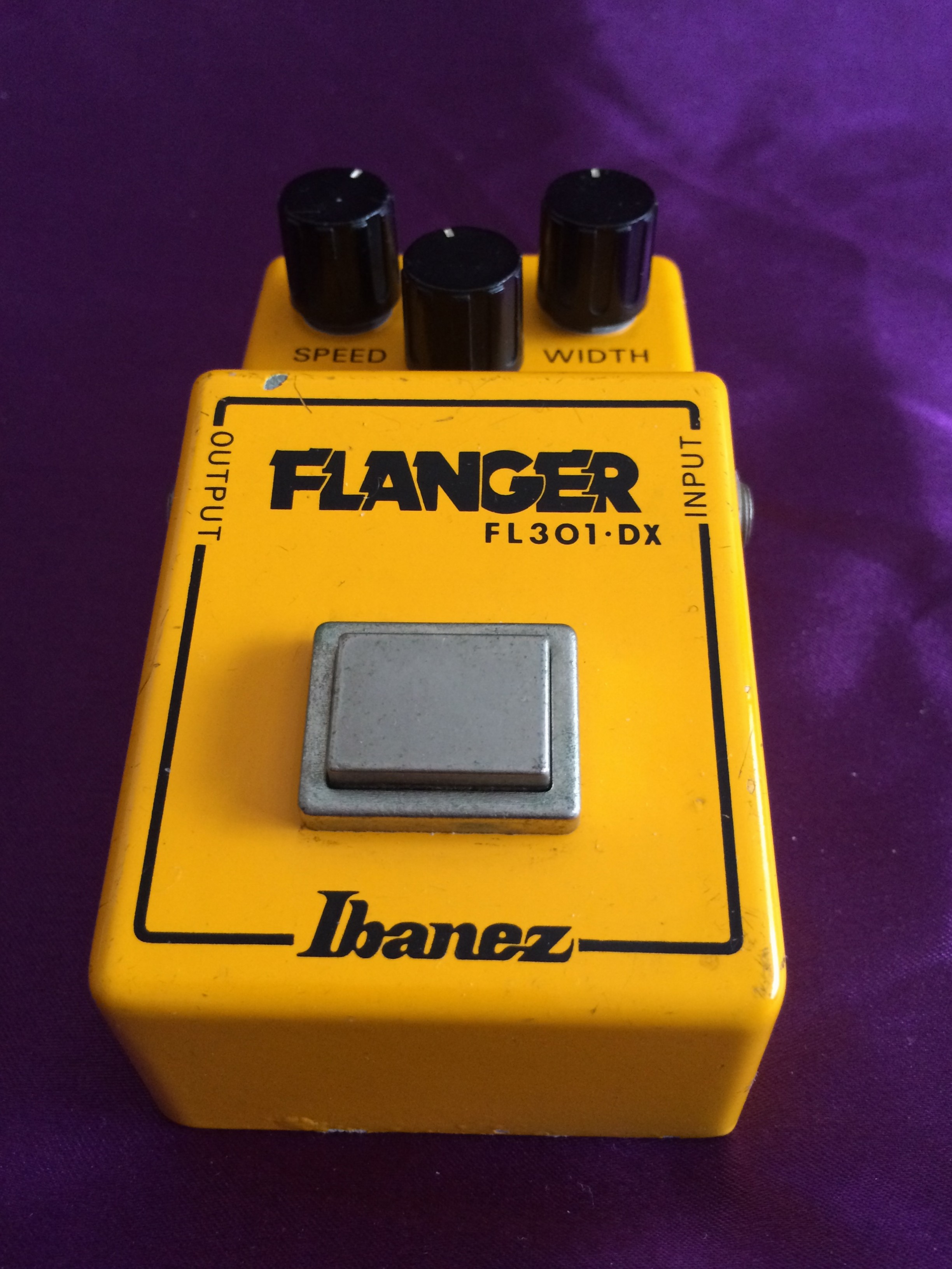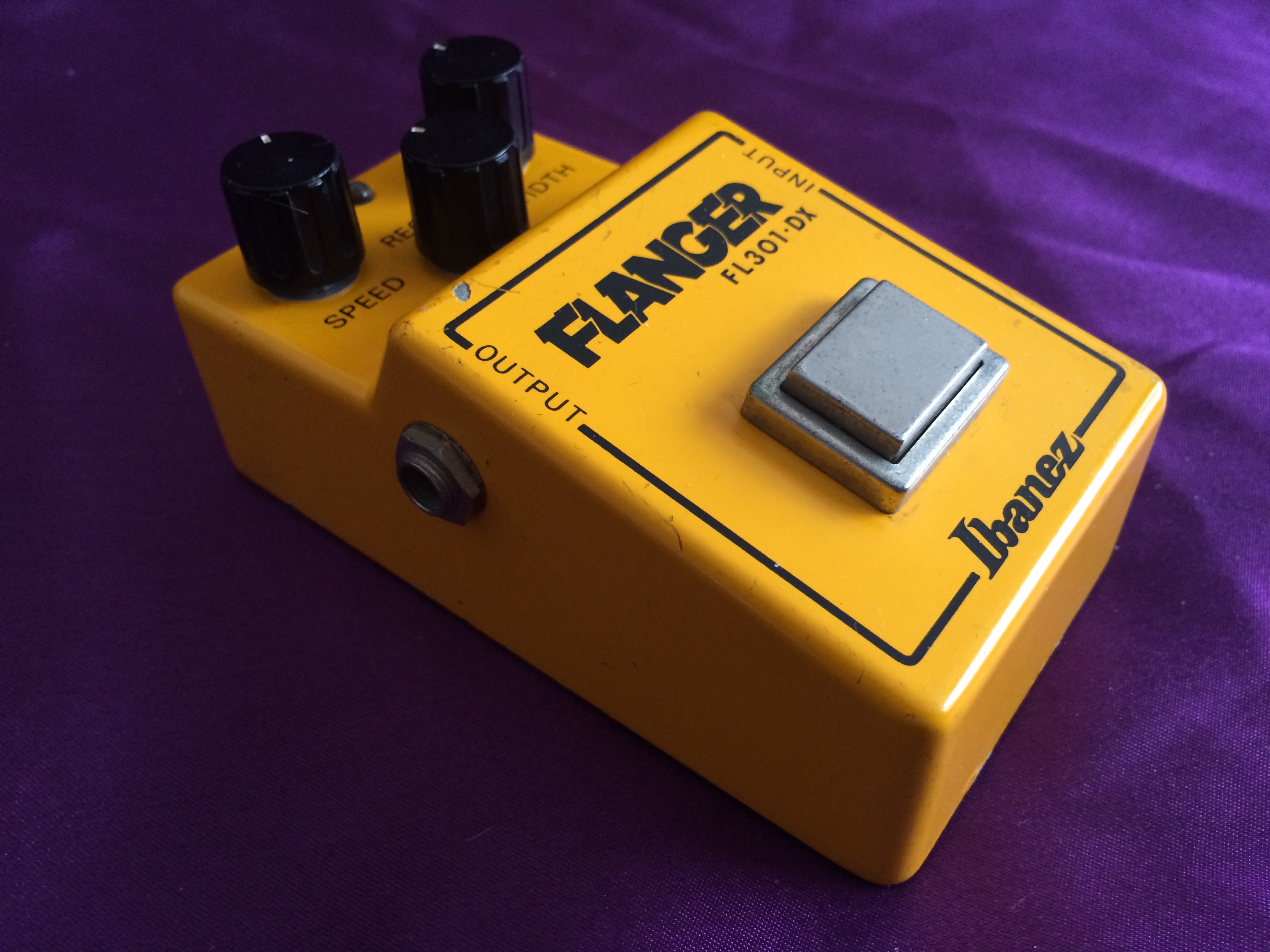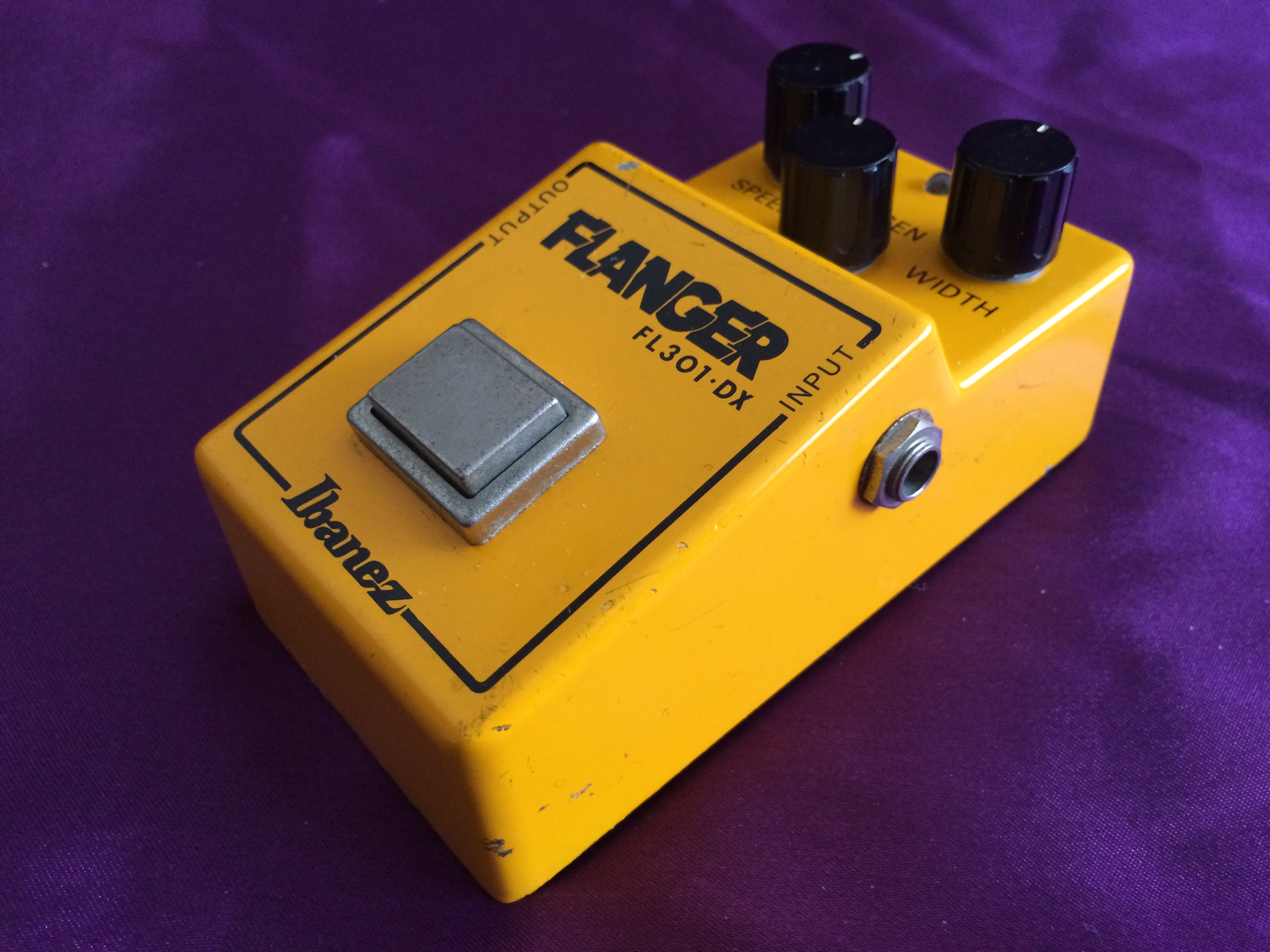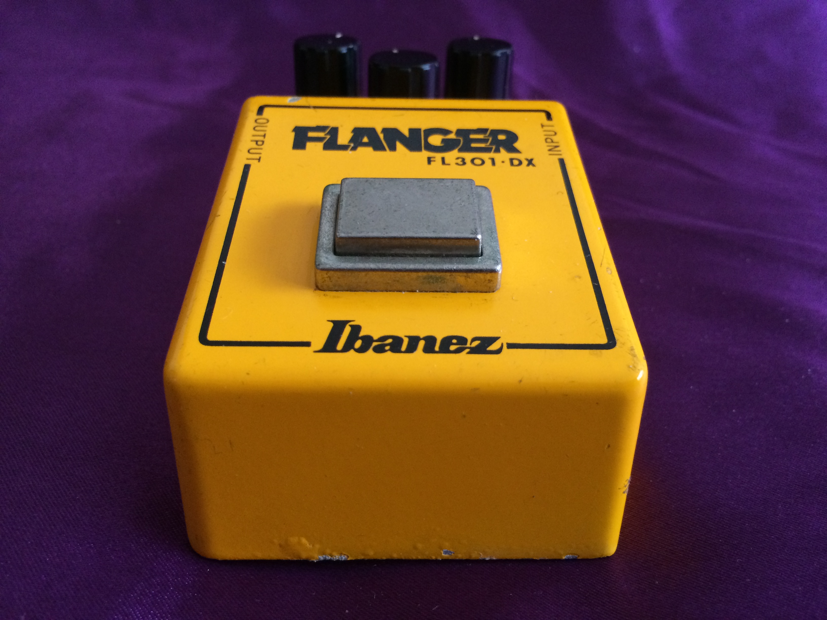 Now… there are vintage effects pedals and there is this solid yellow and black ‘brick’, the Ibanez FL301‑DX Flanger built by Maxon in Japan in the late 1970s and early 1980s. The DX (i.e. DeluXe) version of the FL301 is slightly tweaked to reduce noise levels. While the (green) TS‑808 Tube Screamer Pro is the iconic Ibanez stomp box, this bright banana‑coloured baby rocks under the vintage collectors’ radar. The sturdy construction of the FL301‑DX is of the same ‘0’ series models as the TS‑808 with the familiar proprietary Ibanez small rectangular on/off ‘silent Q switch’. These older models were replaced by the ‘9’ series in 1982, in this case the four knob FL9 Flanger.
