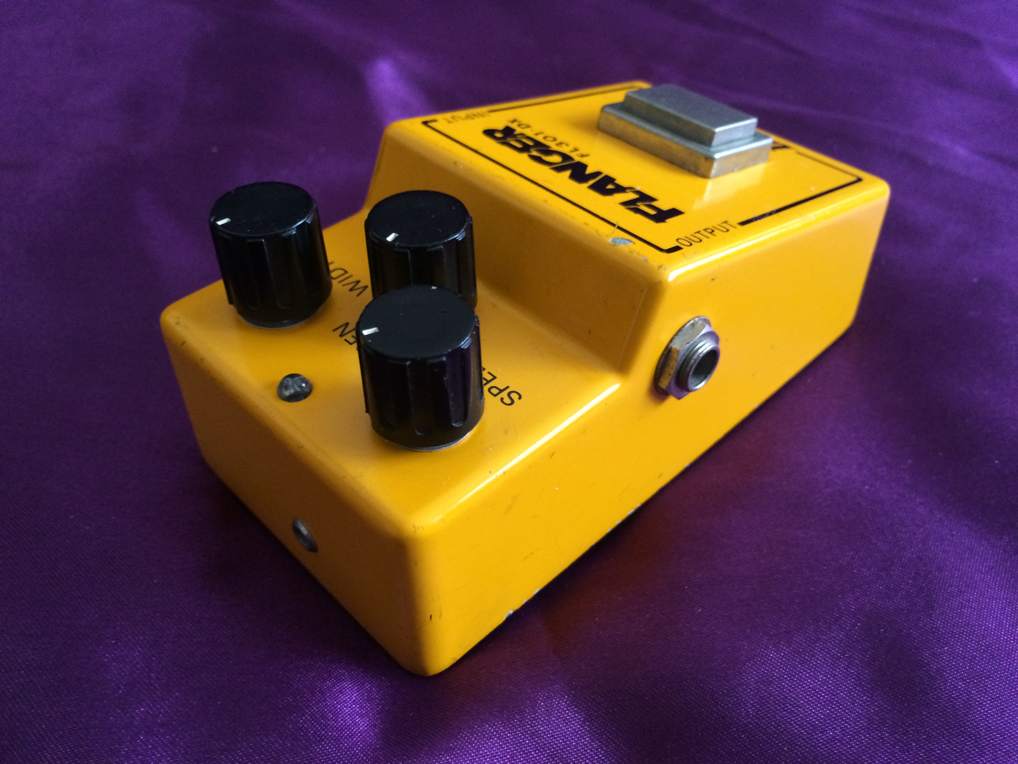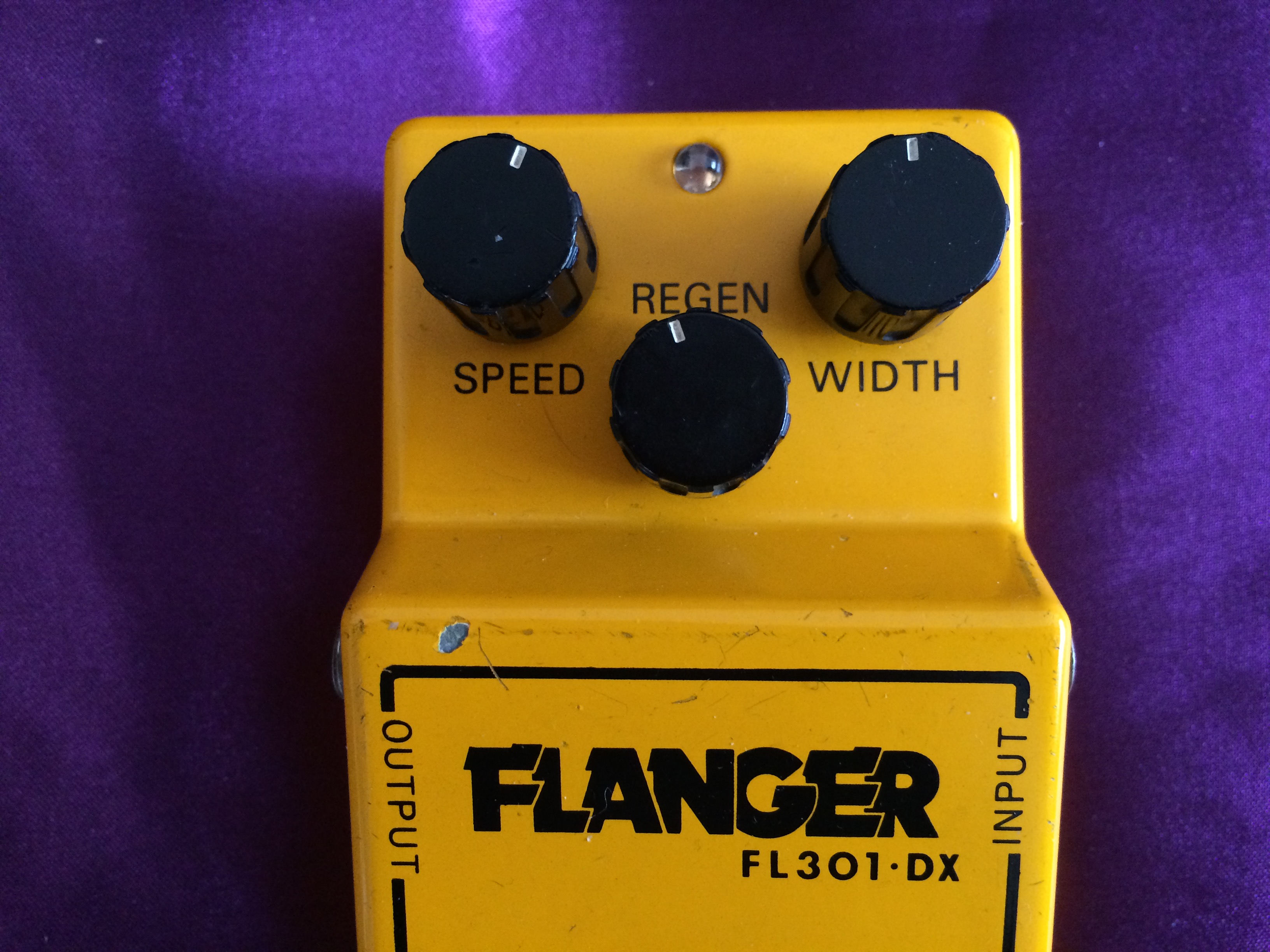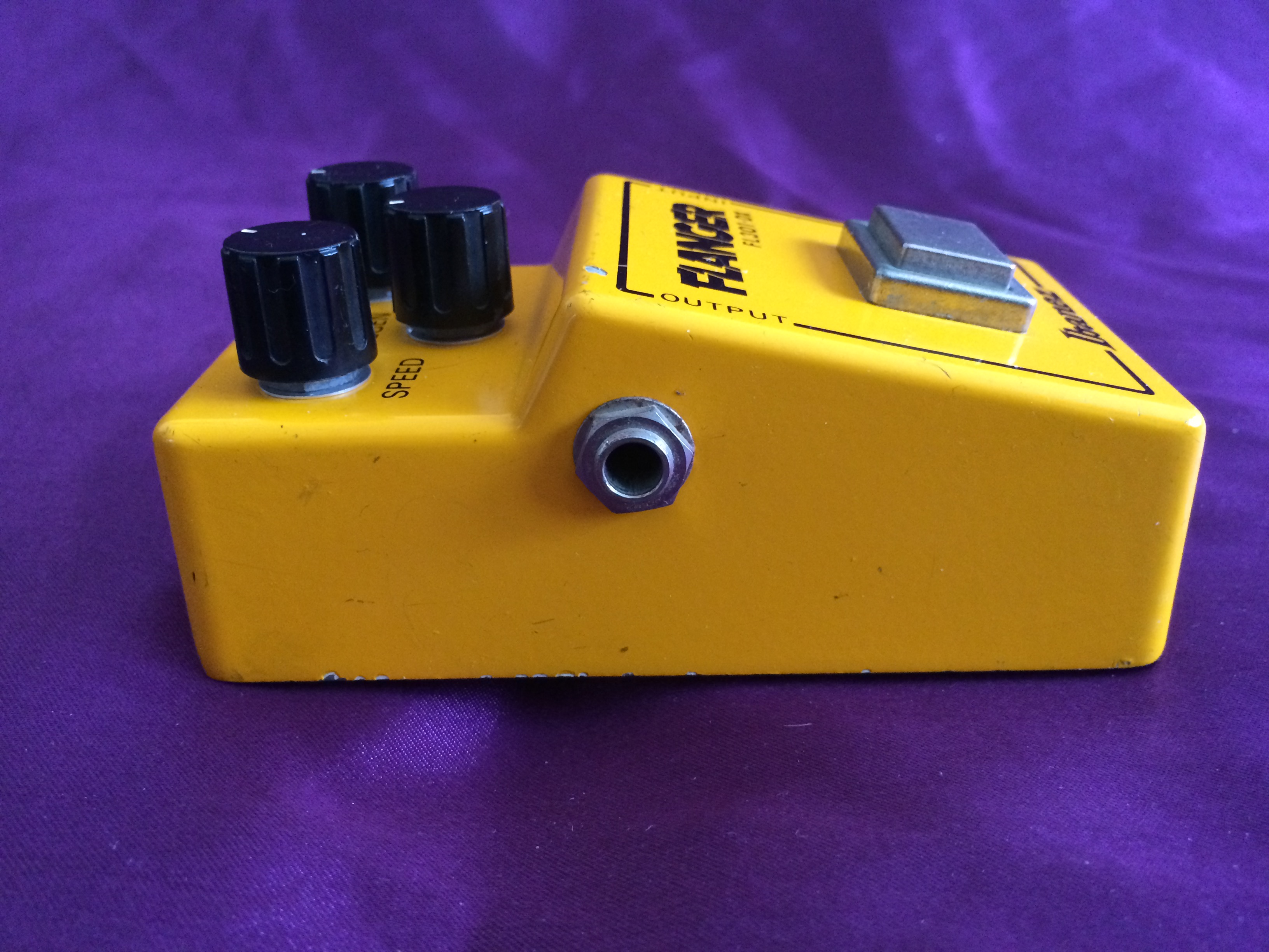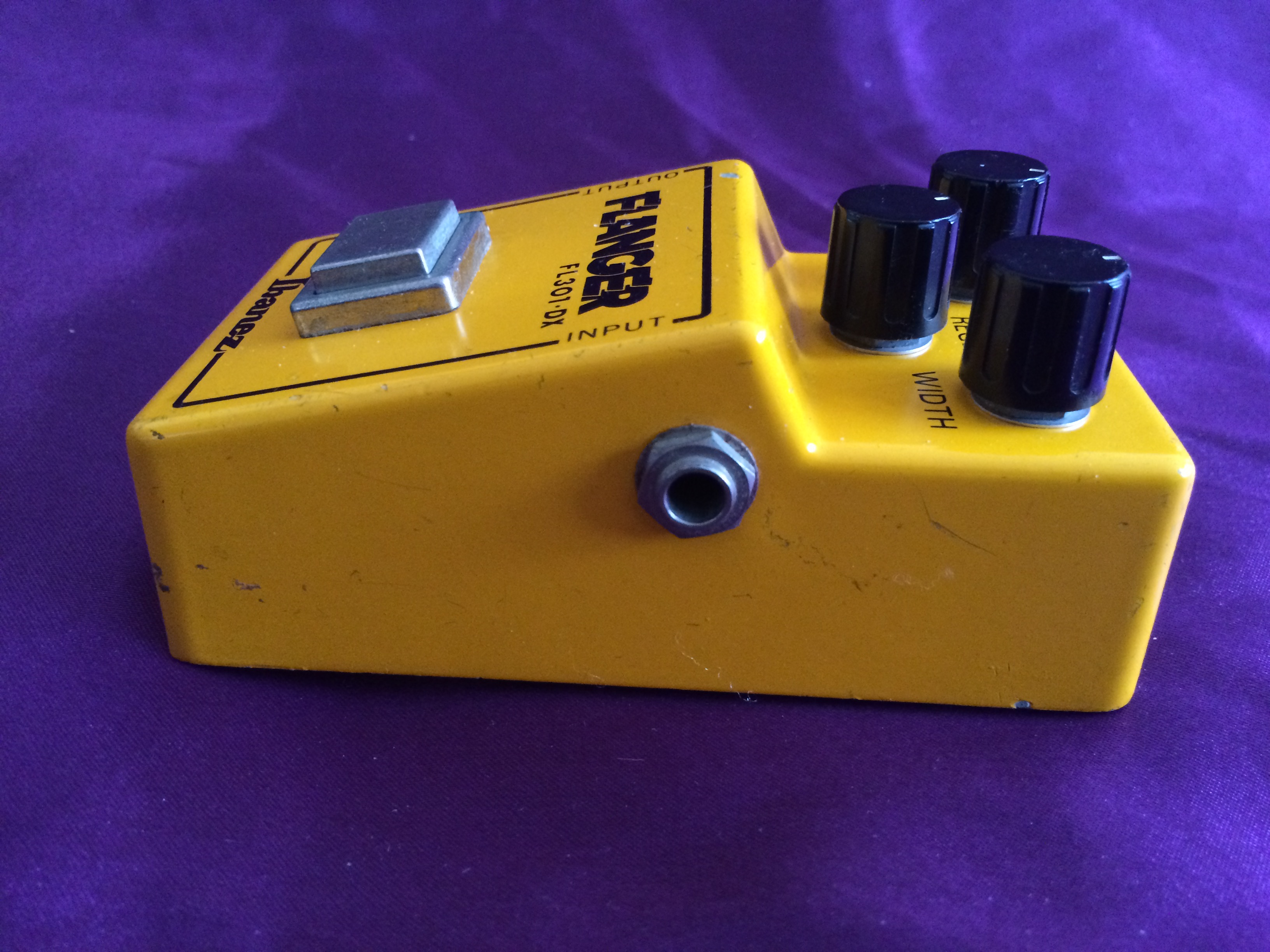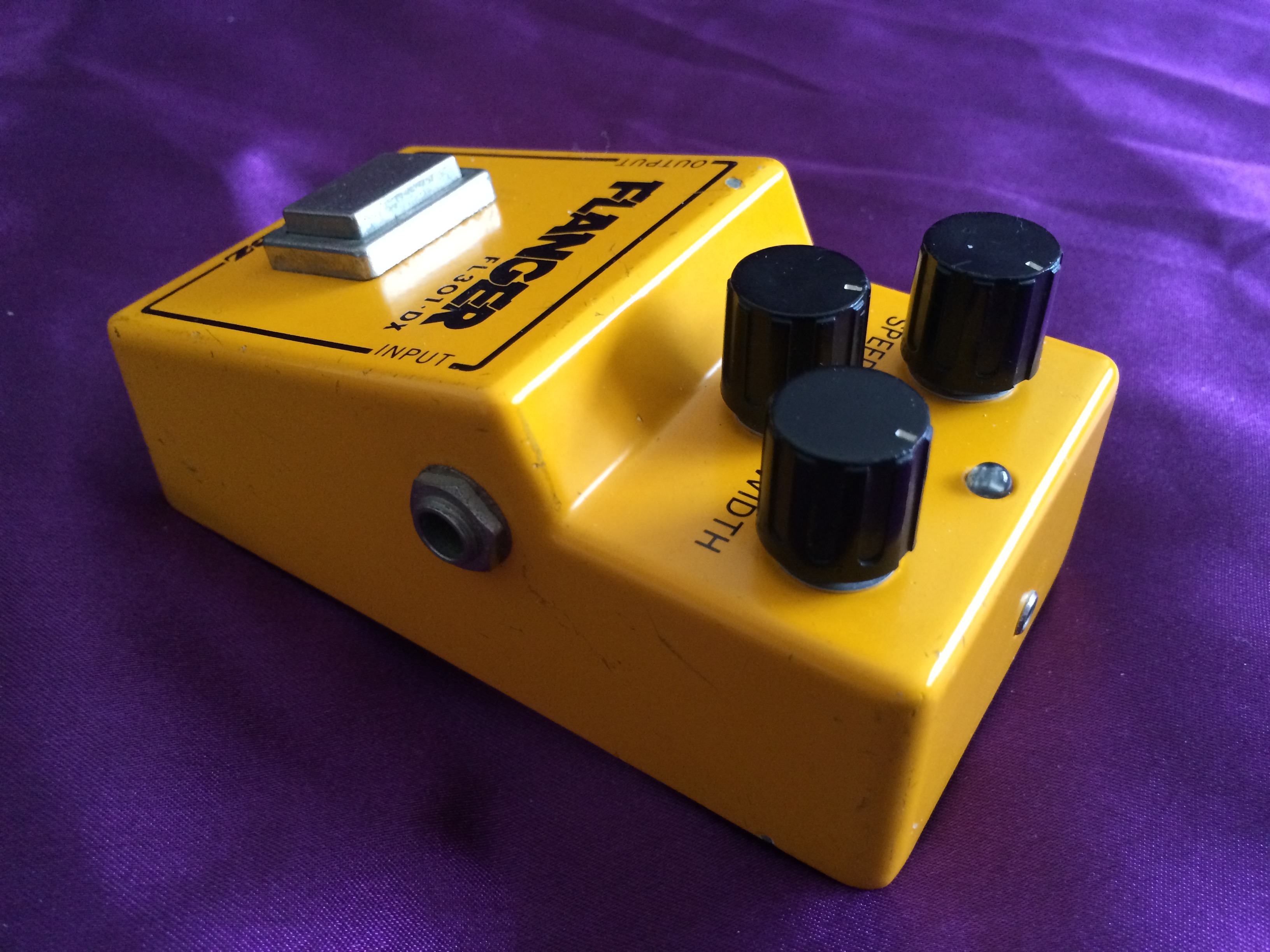 Now… there are vintage effects pedals and there is this solid yellow and black ‘brick’, the Ibanez FL301‑DX Flanger built by Maxon in Japan in the late 1970s and early 1980s. The DX (i.e. DeluXe) version of the FL301 is slightly tweaked to reduce noise levels. While the (green) TS‑808 Tube Screamer Pro is the iconic Ibanez stomp box, this bright banana‑coloured baby rocks under the vintage collectors’ radar. The sturdy construction of the FL301‑DX is of the same ‘0’ series models as the TS‑808 with the familiar proprietary Ibanez small rectangular on/off ‘silent Q switch’. These older models were replaced by the ‘9’ series in 1982, in this case the four knob FL9 Flanger.