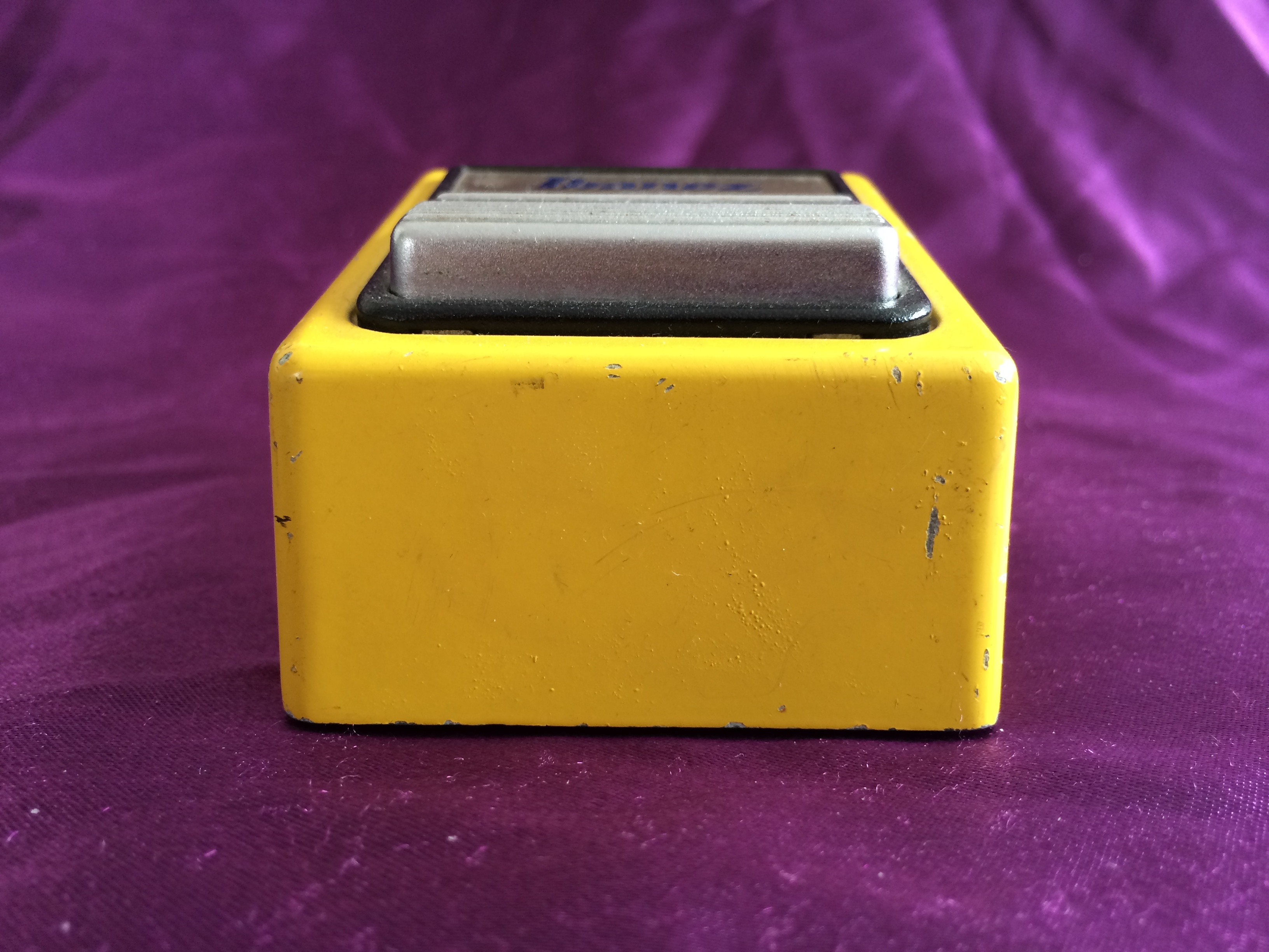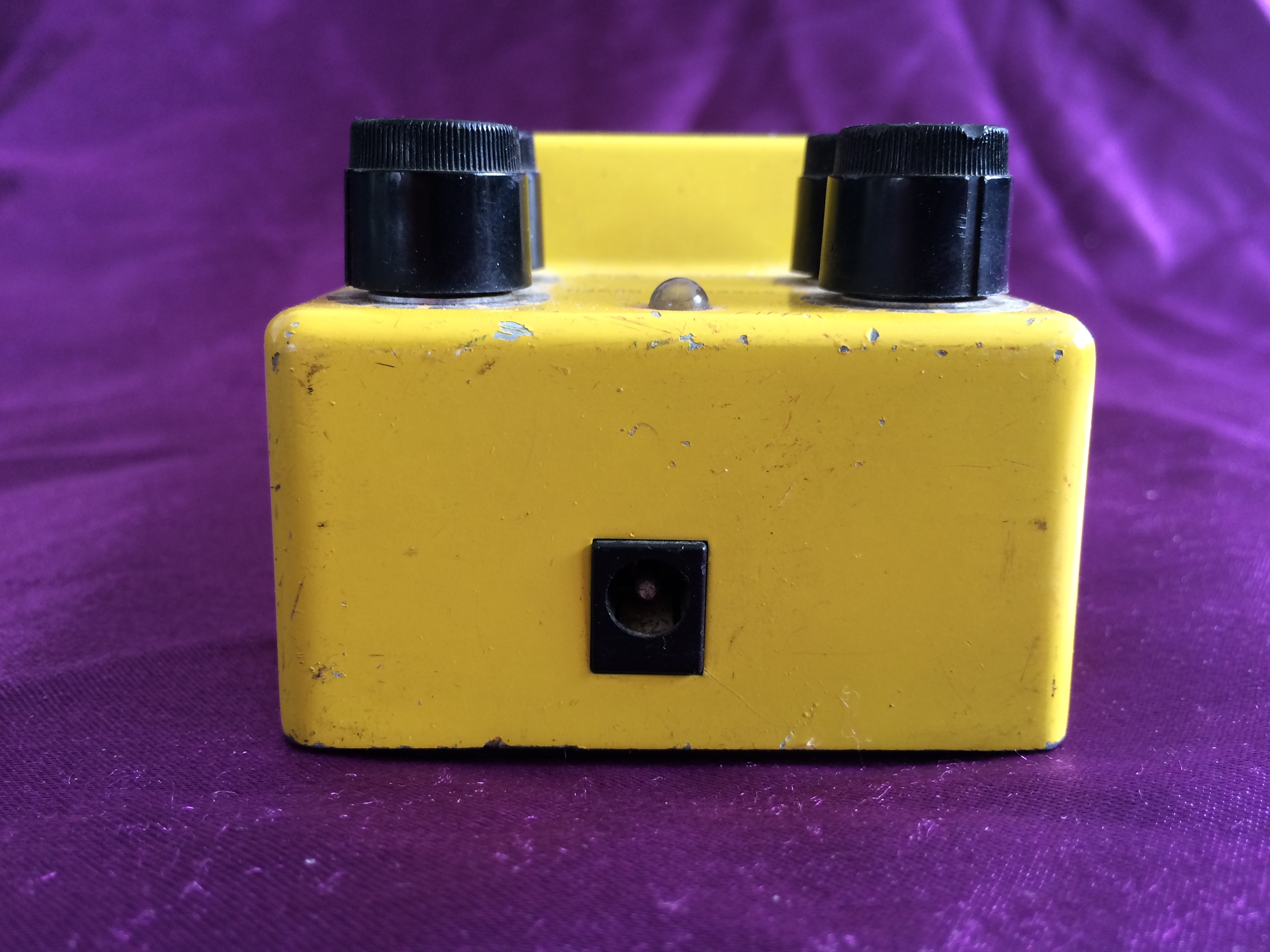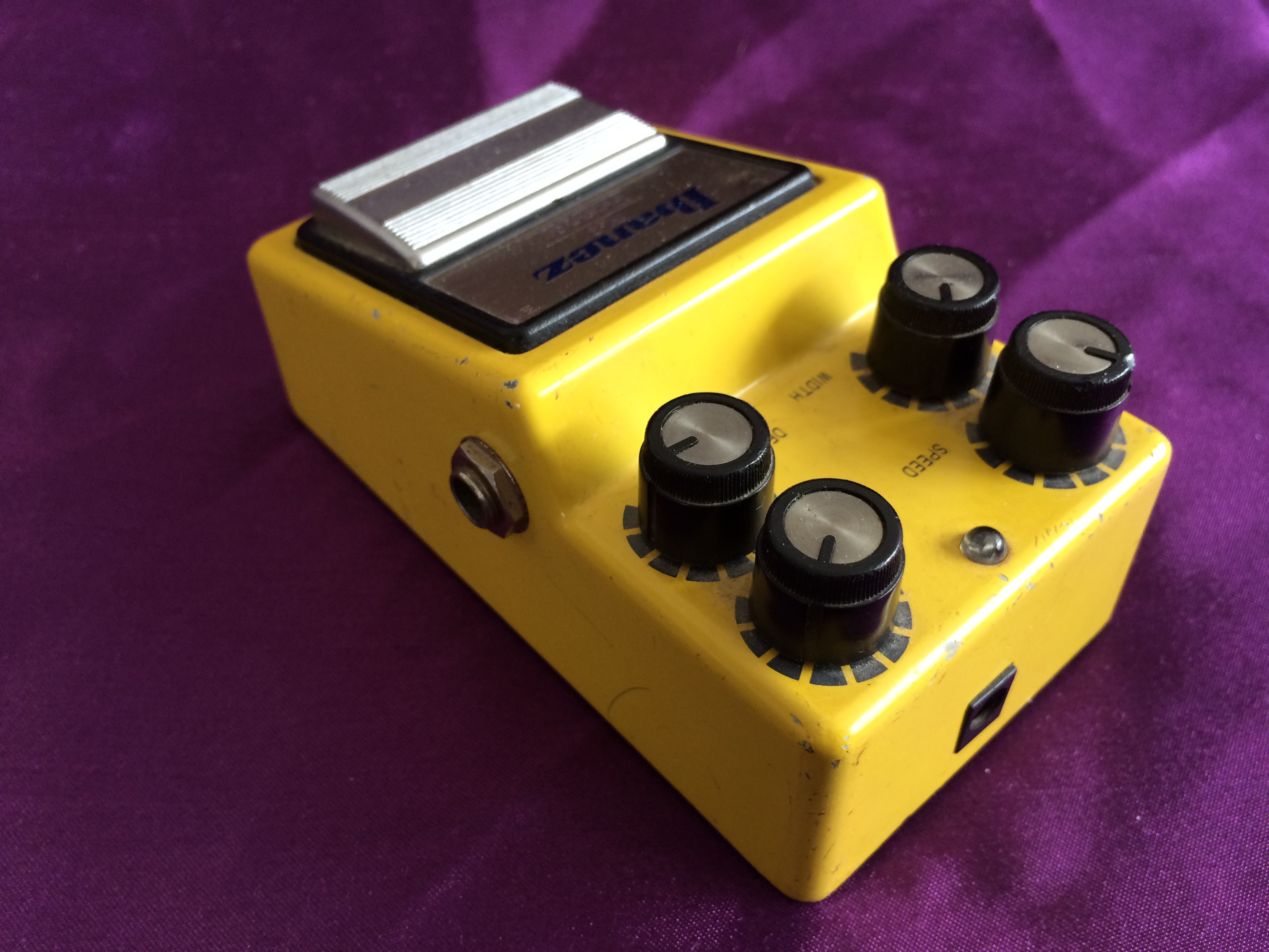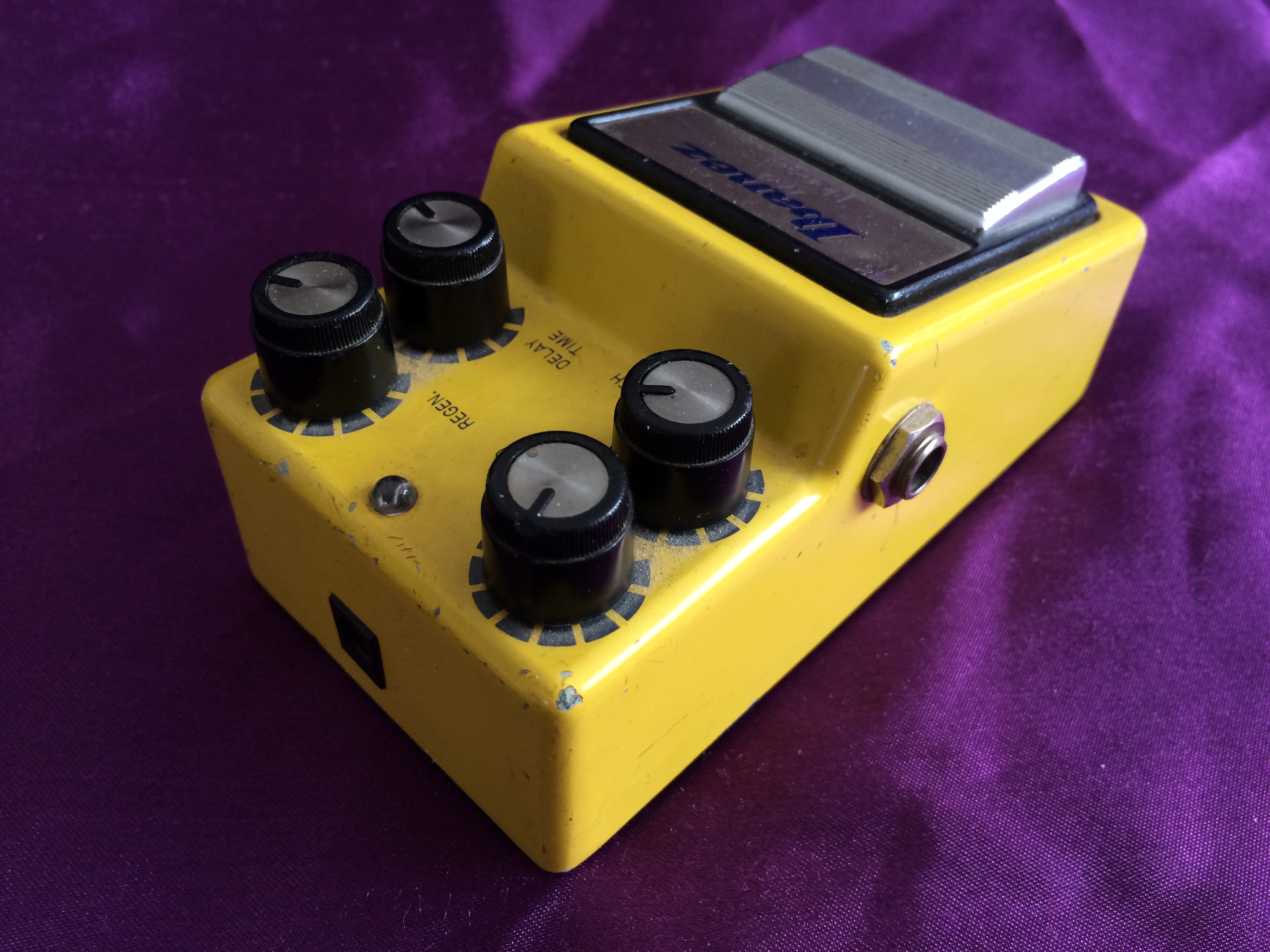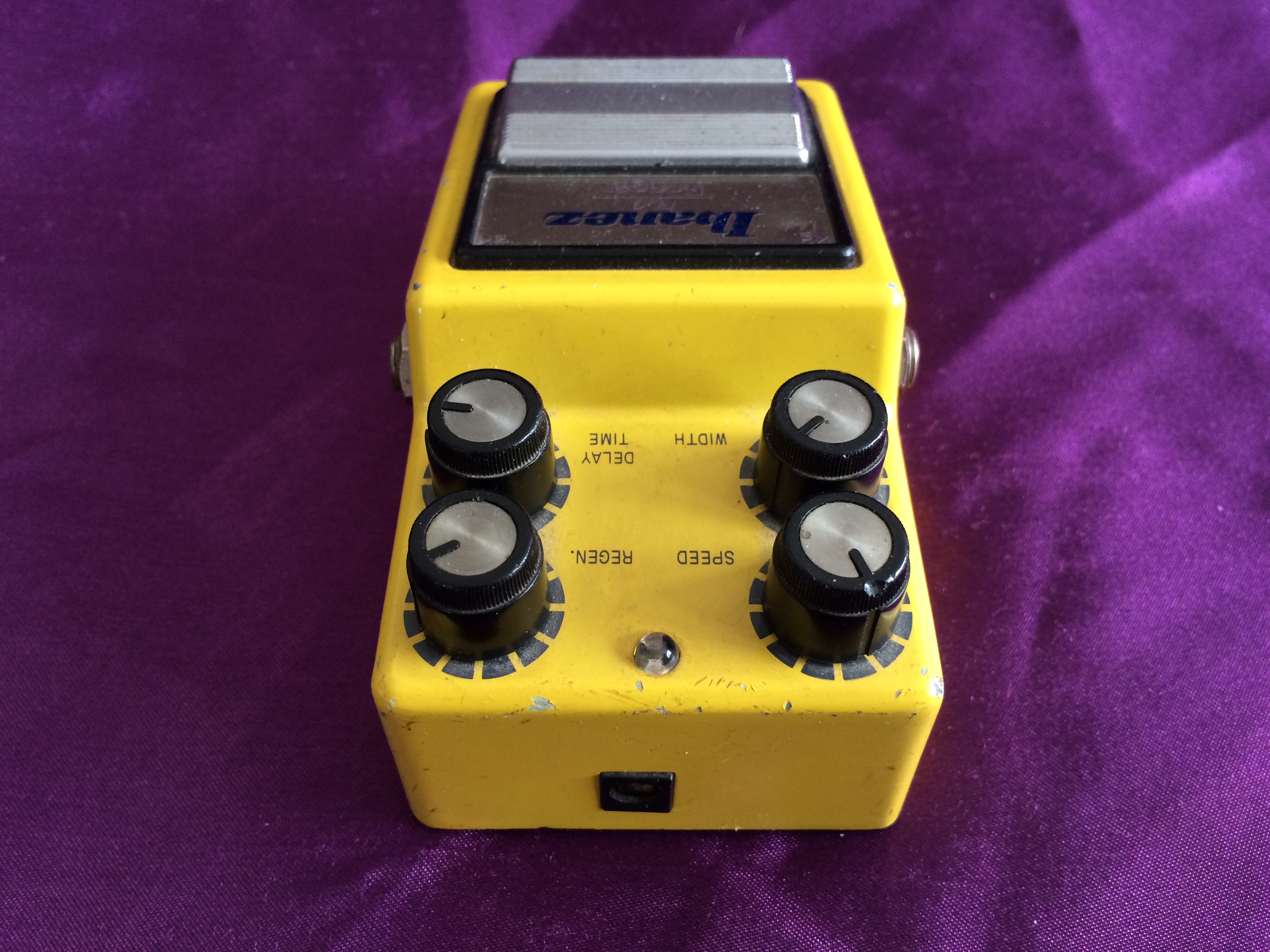 Here’s a cute banana‑coloured 1982 Ibanez FL9 Flanger, a direct descendent of the earlier FL301. I have to say that, for me, the complication of the fourth knob just makes it more difficult to dial in the exact sound you might be after – there is something to be said for simplicity. I prefer playing guitars, rather than having to fiddle with knobs just to find ‘that’ sound. However, when you hit the sweet spot(s), the sounds are lush and enticingly captivating. It is definitely a pedal that rewards spending a little time to get to know, in order to get the best out of it. This particular pedal is in fabulous all‑original condition with some very minor scratches and a minor cosmetic ding. It has the black ‘Made In Japan’ label on the base and the serial number indicates a c.1982 date.