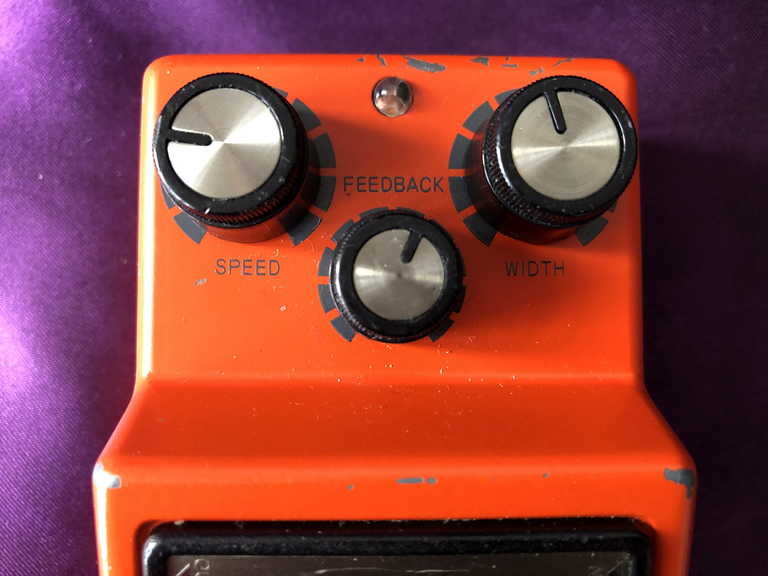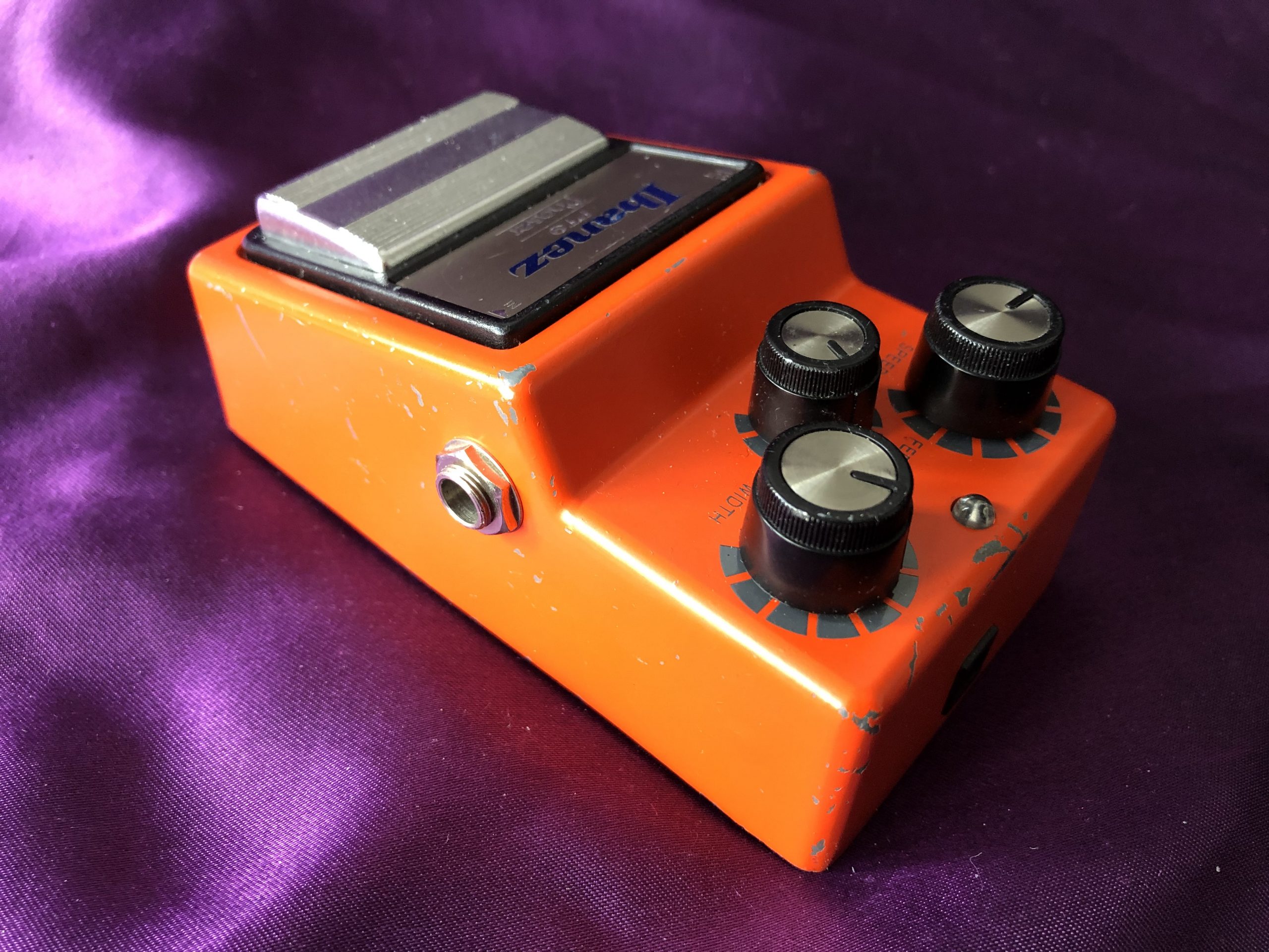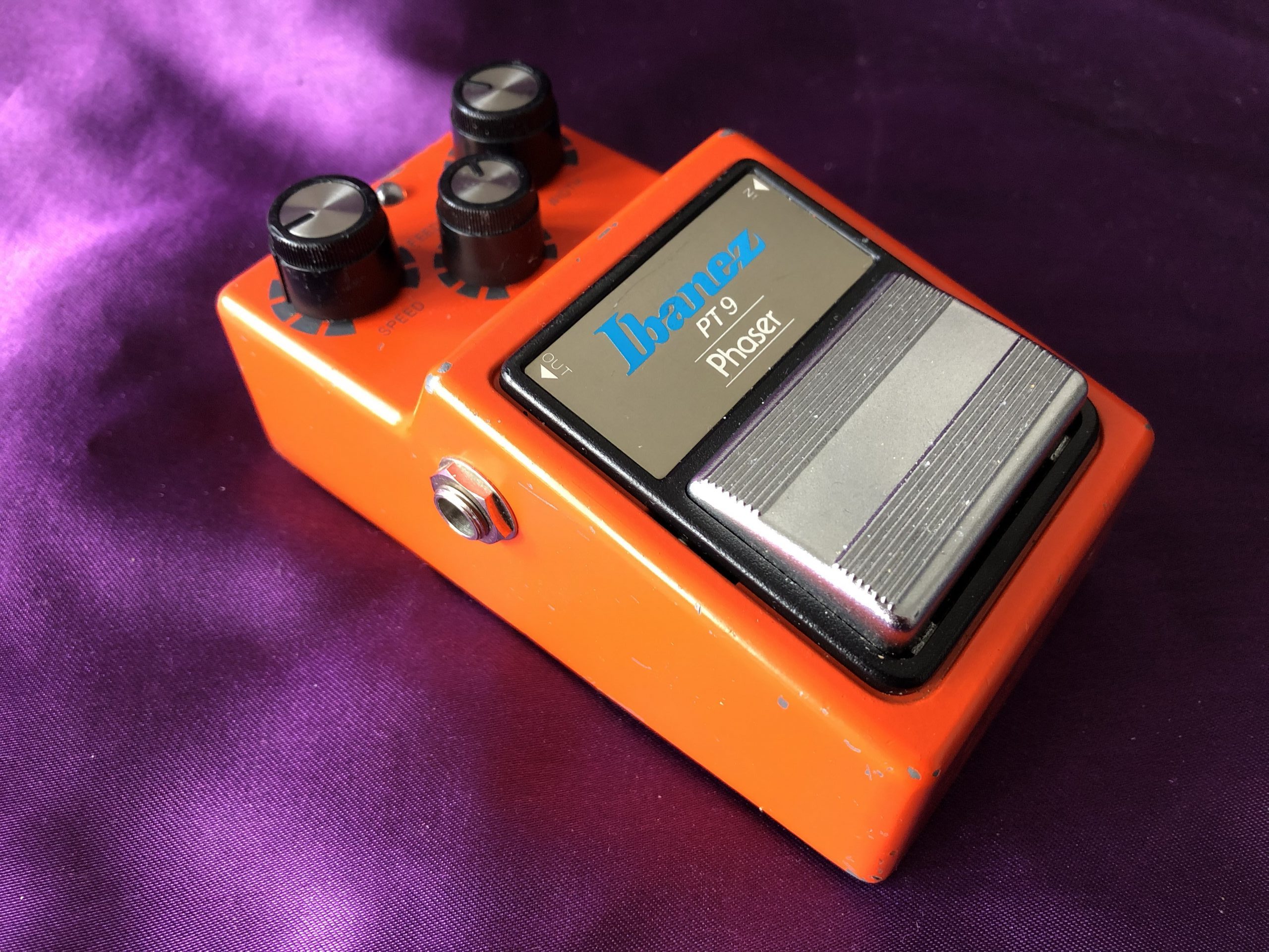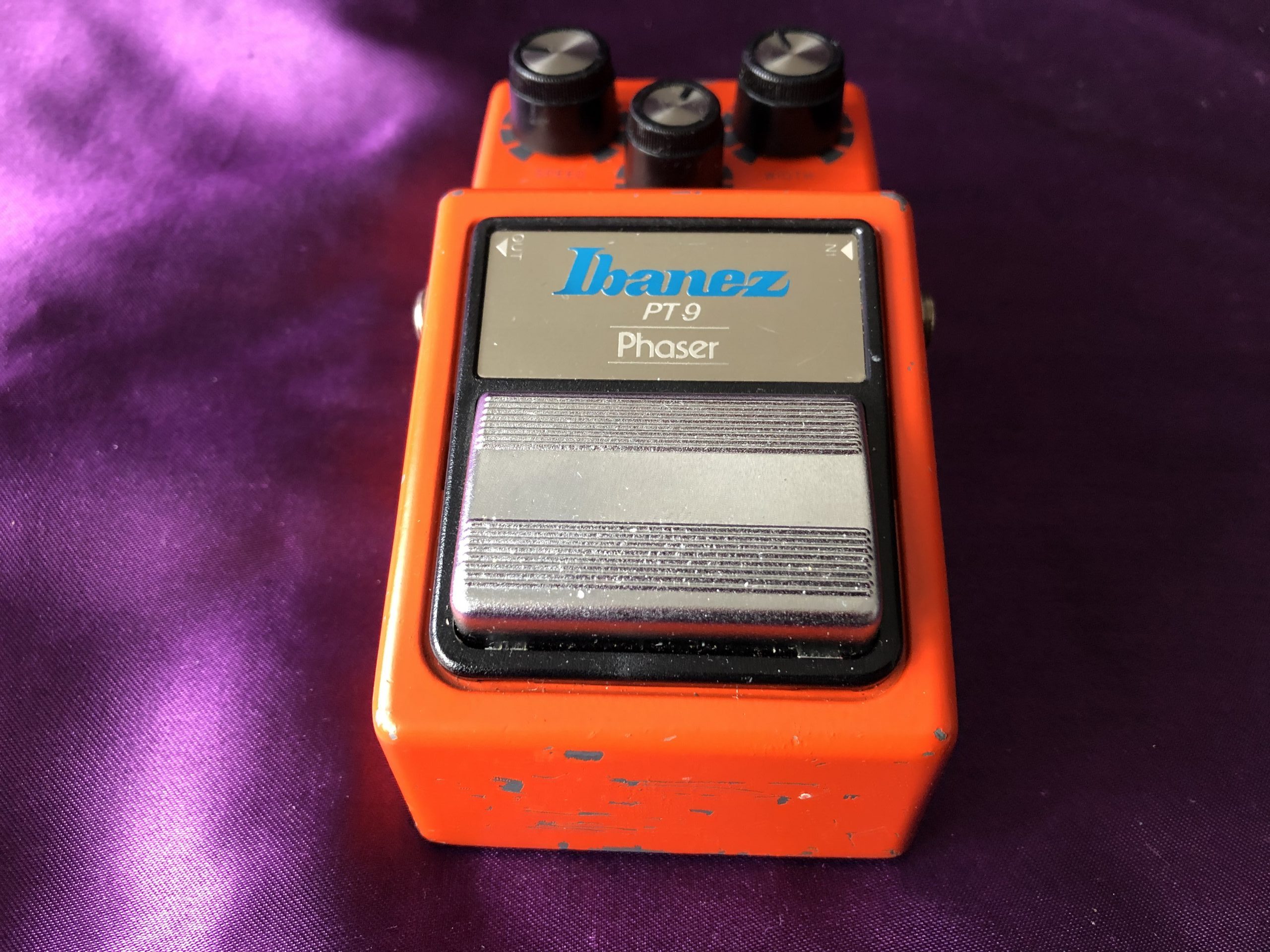 The orange Ibanez PT9 was a core model in the extensive ‘9’ series pedals, comprising 16 different effects. The PT9 shares many standardised characteristics with its peers, which make it familiar to so many guitarists. The solid and compact PT9, made in Japan by partner company Maxon, replaced the outgoing blue ‘0’ series’ PT‑909 Phase Tone in 1982 and lasted in production until 1984 before being superseded. One wonders if Ibanez changed the colour from the blue of the PT‑909 to orange of the PT9 to compete head on with the industry‑leading MXR phasers. By the early‑mid 1980s, phaser pedals were becoming de facto, with manufacturers seemingly obliged to include a model in their line ups with little to differentiate between them. Under the skin, the PT9 uses a 4‑stage analogue modulation circuit to give it a remarkably smooth phase sound. In keeping with its predecessor, it uses three control knobs to adjust the effect. For whatever reason, the reputation of the PT9 never reached the giddy heights of the MXR (Phase 45, 90 & 100) and Electro‑Harmonix phasers (Small Stone and Bad Stone), so they are still relatively ubiquitous and affordable on the vintage effect market. Perhaps because it wasn’t a big hit first time around, Ibanez has not seen fit to reissue the PT9 to‑date.
