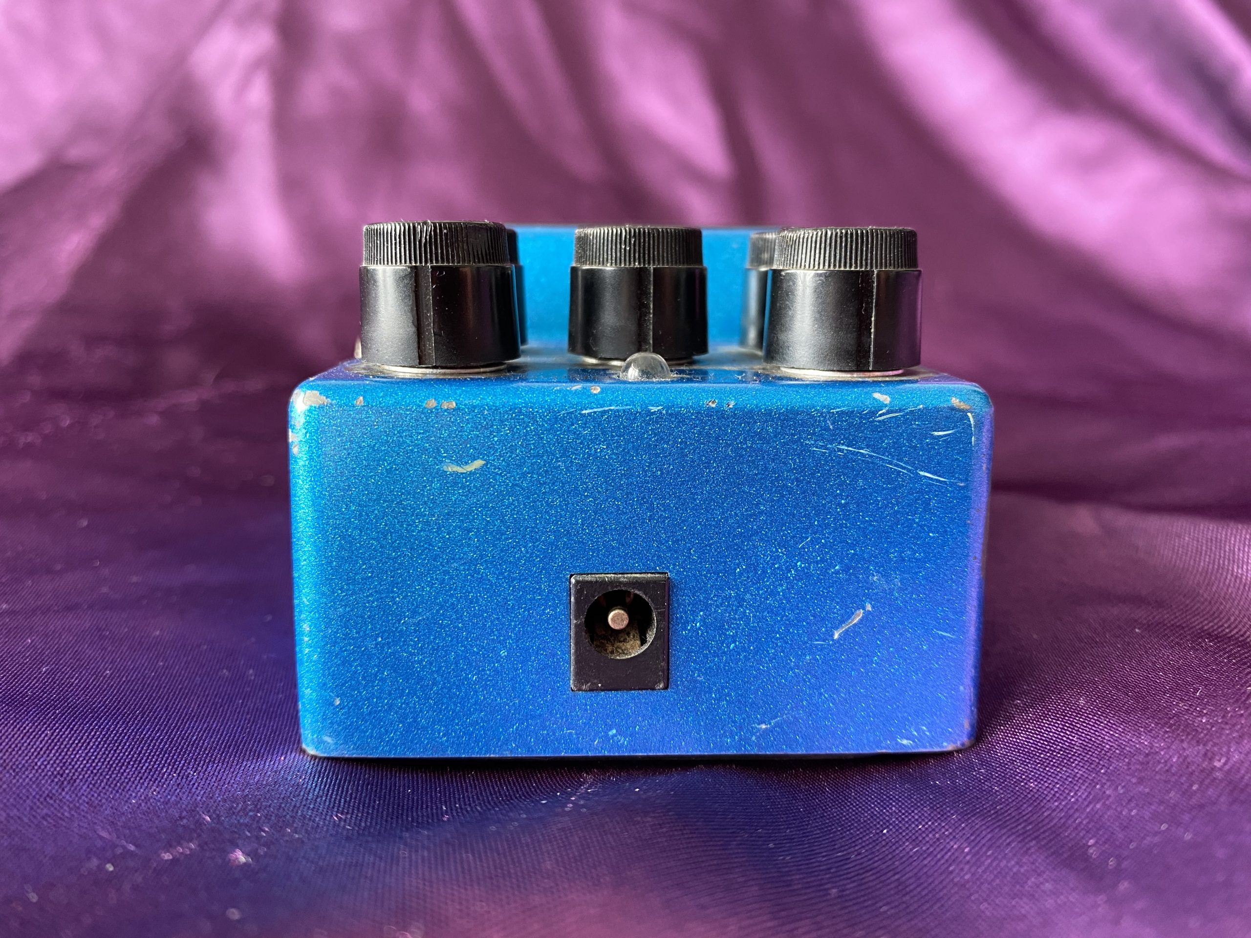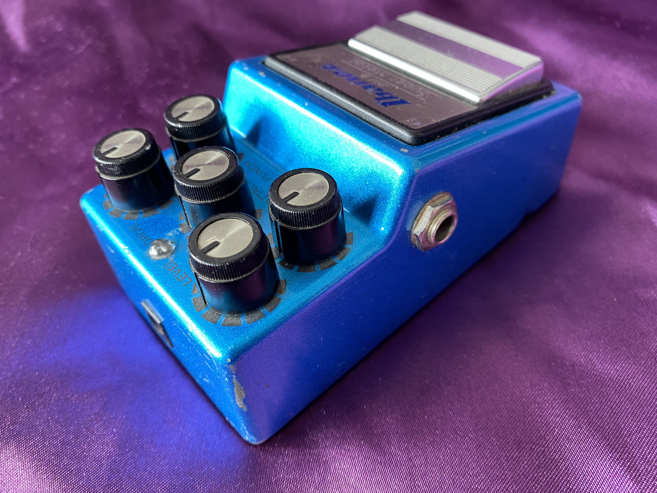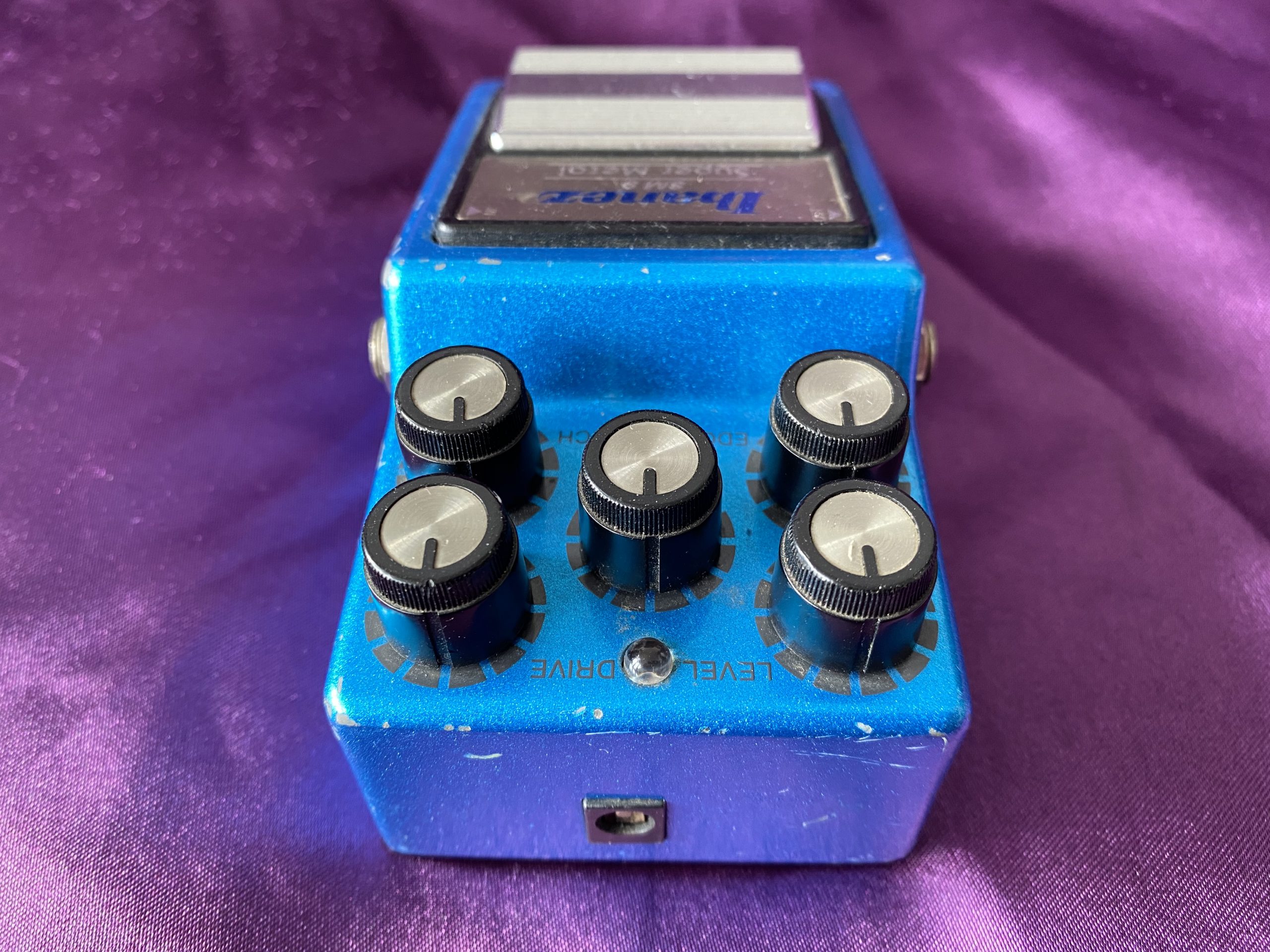Here we have a bright blue metallic monster of an effect pedal, a cool and rare 1984 Ibanez SM9 Super Metal, adorned with no less than 5 controls for the avid knob twiddler out there. To my ears, it definitely fits into overdrive/distortion territory, rather than more savage scooped metallic fuzziness. Think 1980s big‑hair arena rock, rather than the incisive excesses of 21st century thrash or doom metal. I wouldn’t describe it as brutal or fierce, which may or may not disappoint the niche guitarist looking for that elusive demonic ultra‑heavy metal edge. The controls provide plenty of flexibility over tone although they can be a bit confusing in use – a better arrangement and clearer labelling would help a great deal. Don’t get me wrong, the level of overdrive/distortion is pretty good for this sort of pedal, although falling short of awesomeness. It may be my personal taste that I seem to find standard analogue solid state overdrive/distortion pedals lacking a little, well, oomph. If we are going down this rocky road, give me a good frothy fuzz pedal any day. This SM9 is all‑original and in good overall condition; there are a few surface scuffs that might just have resulted from some fashionable (at the time) 1980s platform boots. It works perfectly well and with a little patience produces some satisfying grit, grunt, grind and growl. Oh, and it also looks very pretty too – I love that colour. The SM9 seems to occupy the same kind of ballpark as other 1980s Ibanez leftfield oddities, like the SD9 Sonic Distortion and the very rare ST9 Super Tube Screamer. If you find you need a bit more welly and wallop than the popular mainstream overdrive/distortion pedals can give you, this may well be what you’re after. Either way, this pedal can provide a ‘whole lotta love’ if you’re in the right mood. Bluetiful!