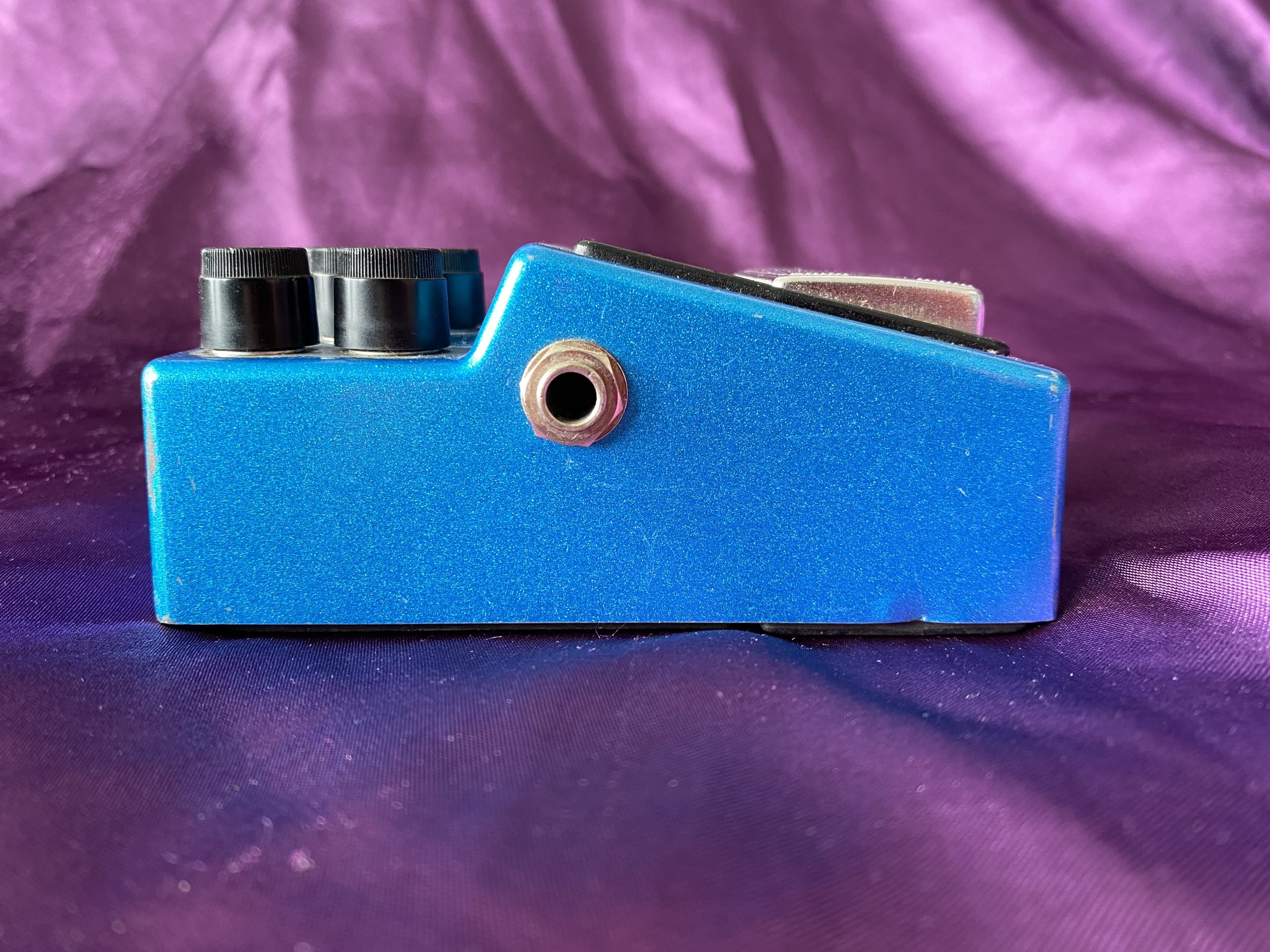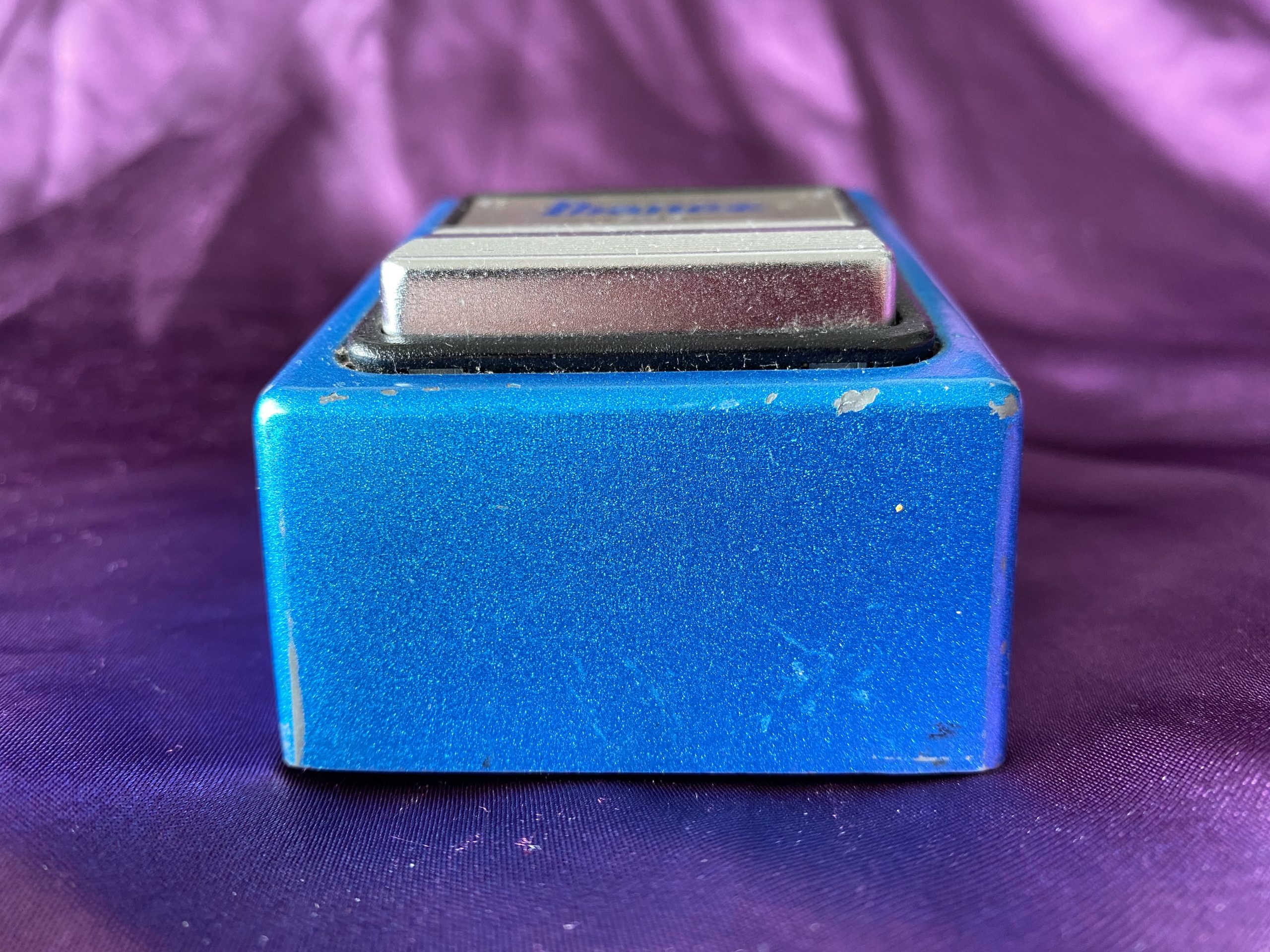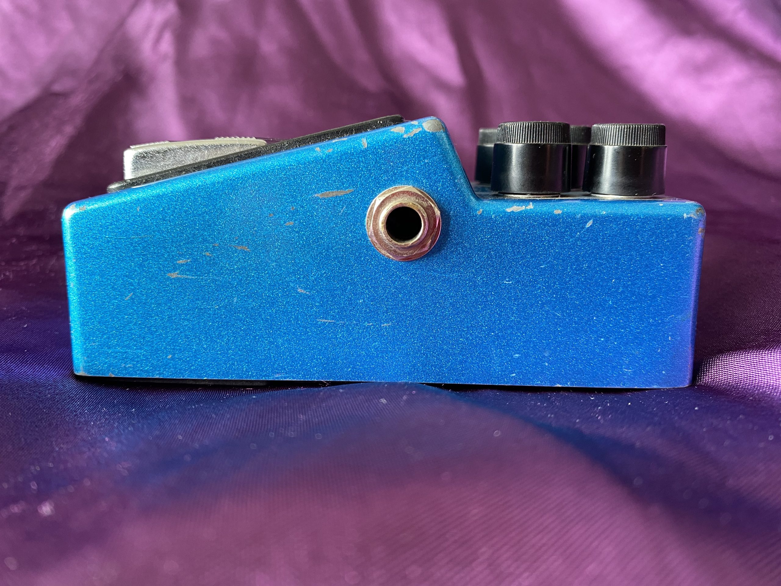 Here we have a bright blue metallic monster of an effect pedal, a cool and rare 1984 Ibanez SM9 Super Metal, adorned with no less than 5 controls for the avid knob twiddler out there. To my ears, it definitely fits into overdrive/distortion territory, rather than more savage scooped metallic fuzziness. Think 1980s big‑hair arena rock, rather than the incisive excesses of 21st century thrash or doom metal. I wouldn’t describe it as brutal or fierce, which may or may not disappoint the niche guitarist looking for that elusive demonic ultra‑heavy metal edge. The controls provide plenty of flexibility over tone although they can be a bit confusing in use – a better arrangement and clearer labelling would help a great deal. Don’t get me wrong, the level of overdrive/distortion is pretty good for this sort of pedal, although falling short of awesomeness. It may be my personal taste that I seem to find standard analogue solid state overdrive/distortion pedals lacking a little, well, oomph. If we are going down this rocky road, give me a good frothy fuzz pedal any day. This SM9 is all‑original and in good overall condition; there are a few surface scuffs that might just have resulted from some fashionable (at the time) 1980s platform boots. It works perfectly well and with a little patience produces some satisfying grit, grunt, grind and growl. Oh, and it also looks very pretty too – I love that colour. The SM9 seems to occupy the same kind of ballpark as other 1980s Ibanez leftfield oddities, like the SD9 Sonic Distortion and the very rare ST9 Super Tube Screamer. If you find you need a bit more welly and wallop than the popular mainstream overdrive/distortion pedals can give you, this may well be what you’re after. Either way, this pedal can provide a ‘whole lotta love’ if you’re in the right mood. Bluetiful!