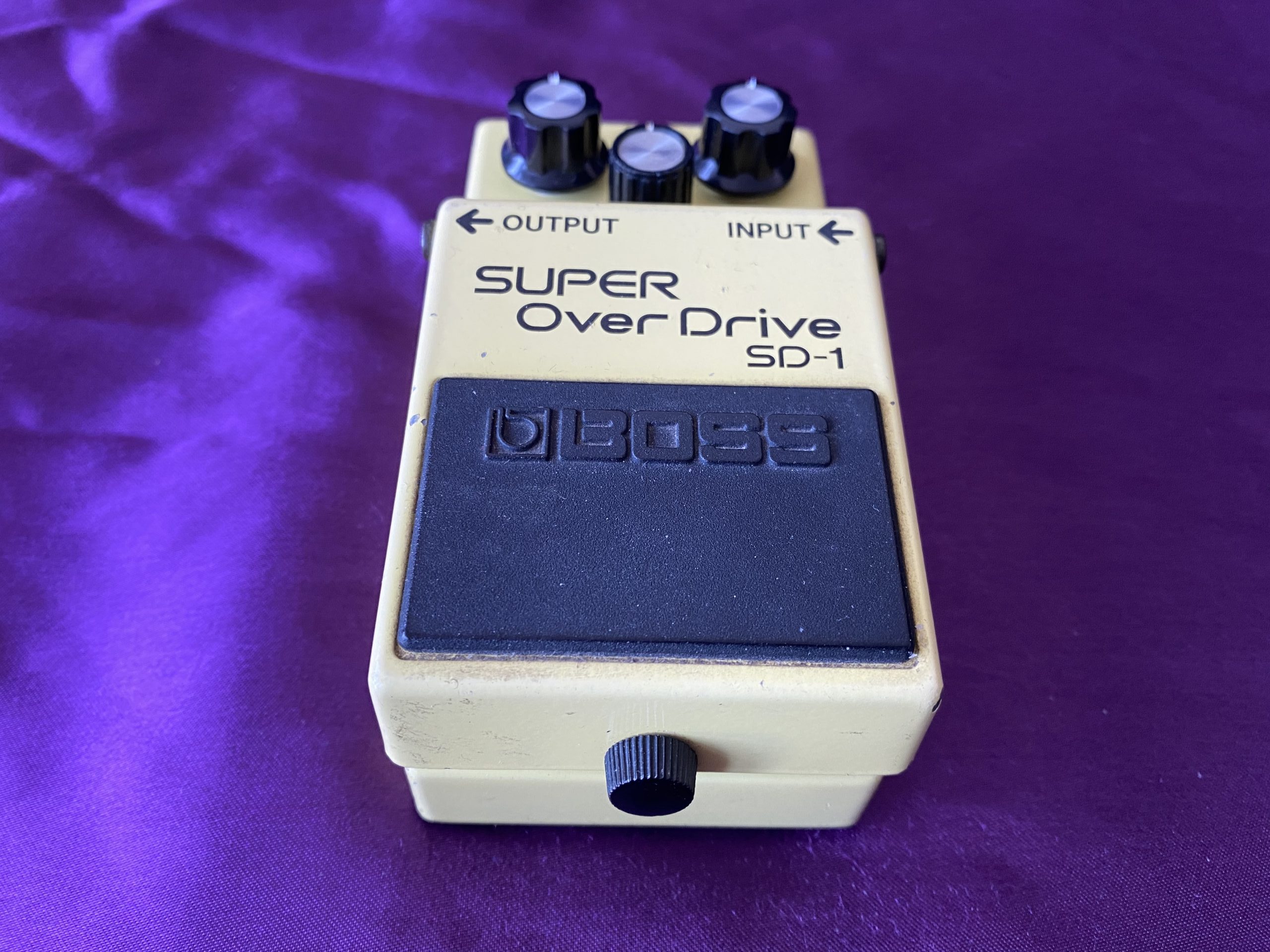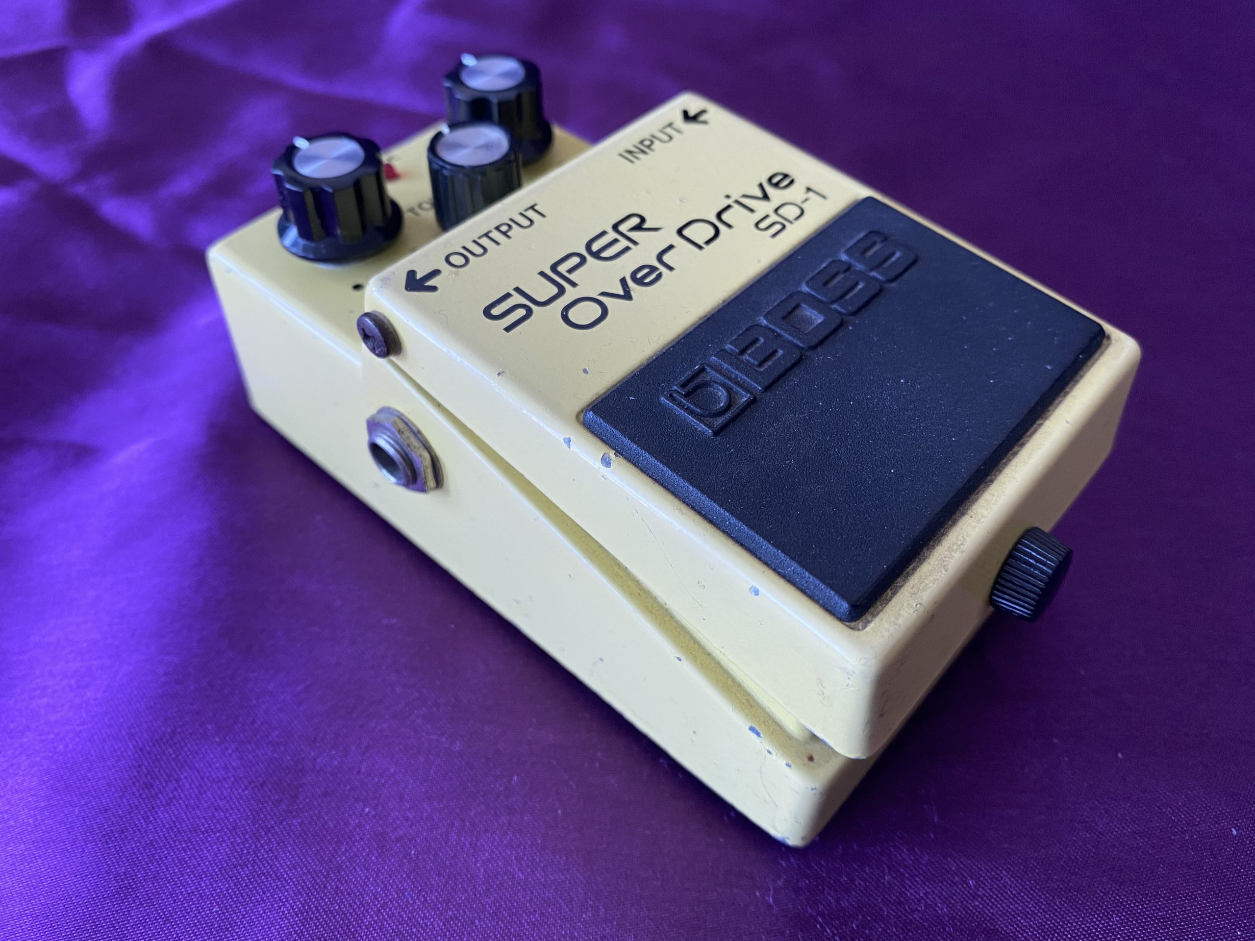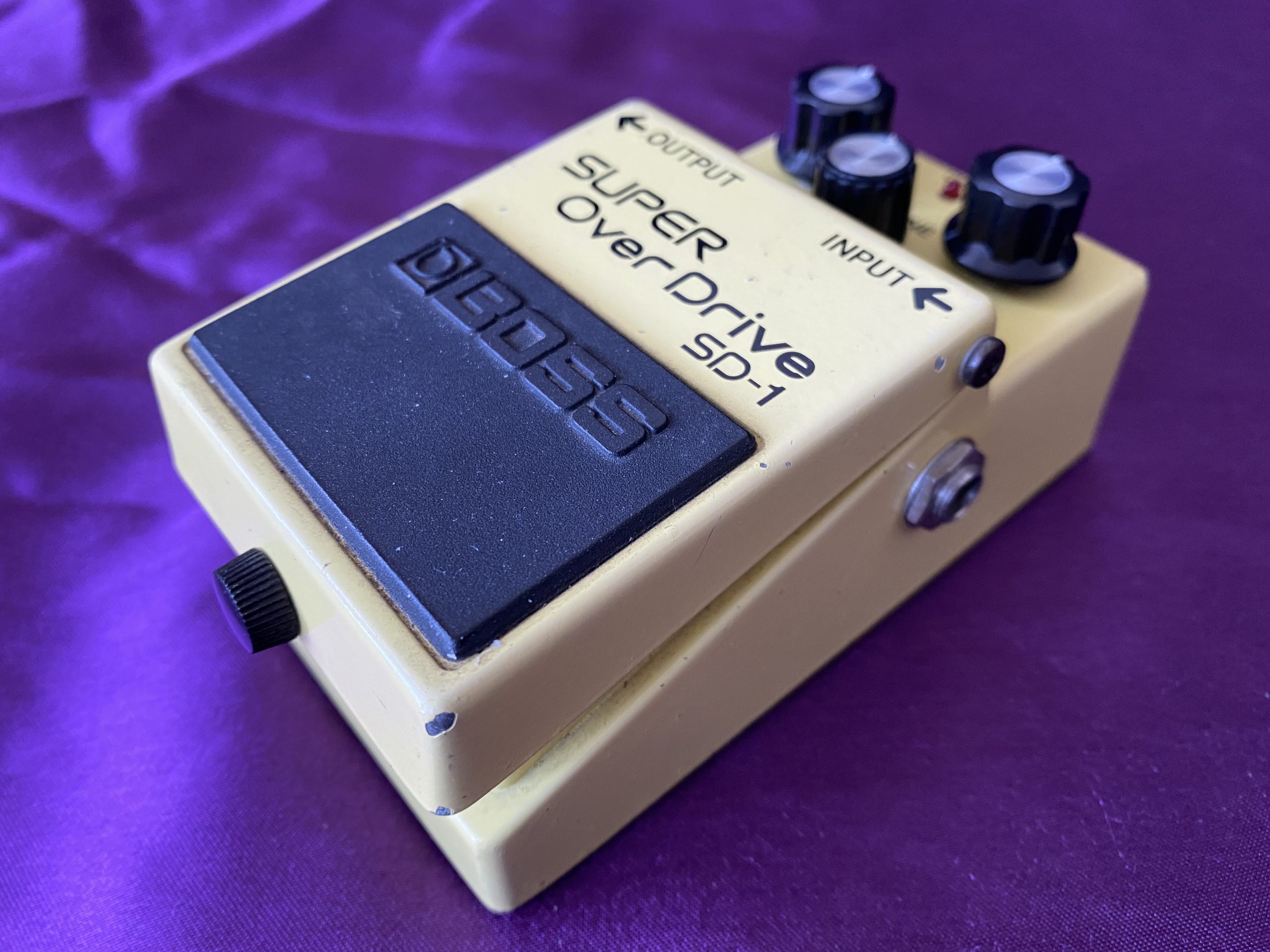 The highly popular BOSS SD‑1 Super Over Drive was introduced in 1981 and has not been withdrawn to‑date. The SD‑1 wasn’t, however BOSS’s original or only overdrive pedal. The seemingly very similar BOSS OD‑1 Over Drive was introduced in c.1977. Crucially, the difference between the two is that the SD‑1 adds a variable tone control. This addition was necessitated by strong competition from the legendary Ibanez TS‑808 Tube Screamer Pro, which also featured a tone control. The ability to fine-tune the tone of the effect was seen as important and something that the original OD‑1 simply could not do. Quite why BOSS didn’t simply update the existing model remains a mystery (BOSS later introduced the OD‑2 and OD‑3). The SD‑1 uses the same patented asymmetric overdrive circuit as the OD‑1, which sets its tone apart from that of the TS‑808. The SD‑1 is often regarded as a benchmark for dynamic and smooth overdrive tones. At lower gain levels, the SD‑1 works well as a clean boost effect for driving the input circuits of valve amplifiers. The OD‑1 and SD‑1’s ability to maintain the natural tone of the guitar and the guitarist’s playing style has become widely recognised. Nevertheless, it still remains in the shadow of the Ibanez TS‑808. Many illustrious guitarists have become associated with the SD‑1 over the years. As the humble, yet classic BOSS SD‑1 Super Over Drive has been in continuous production from 1981 until today, good vintage examples can be found relatively cheaply on the vintage effect guitar market.