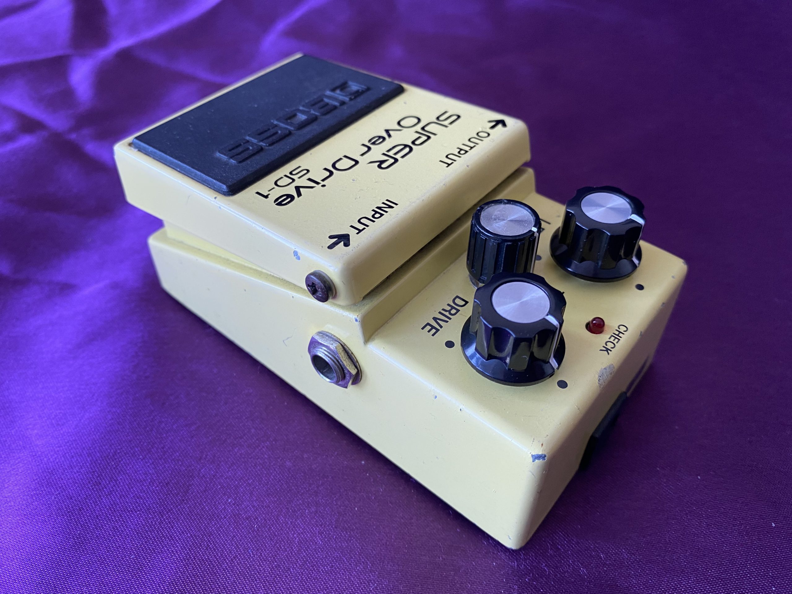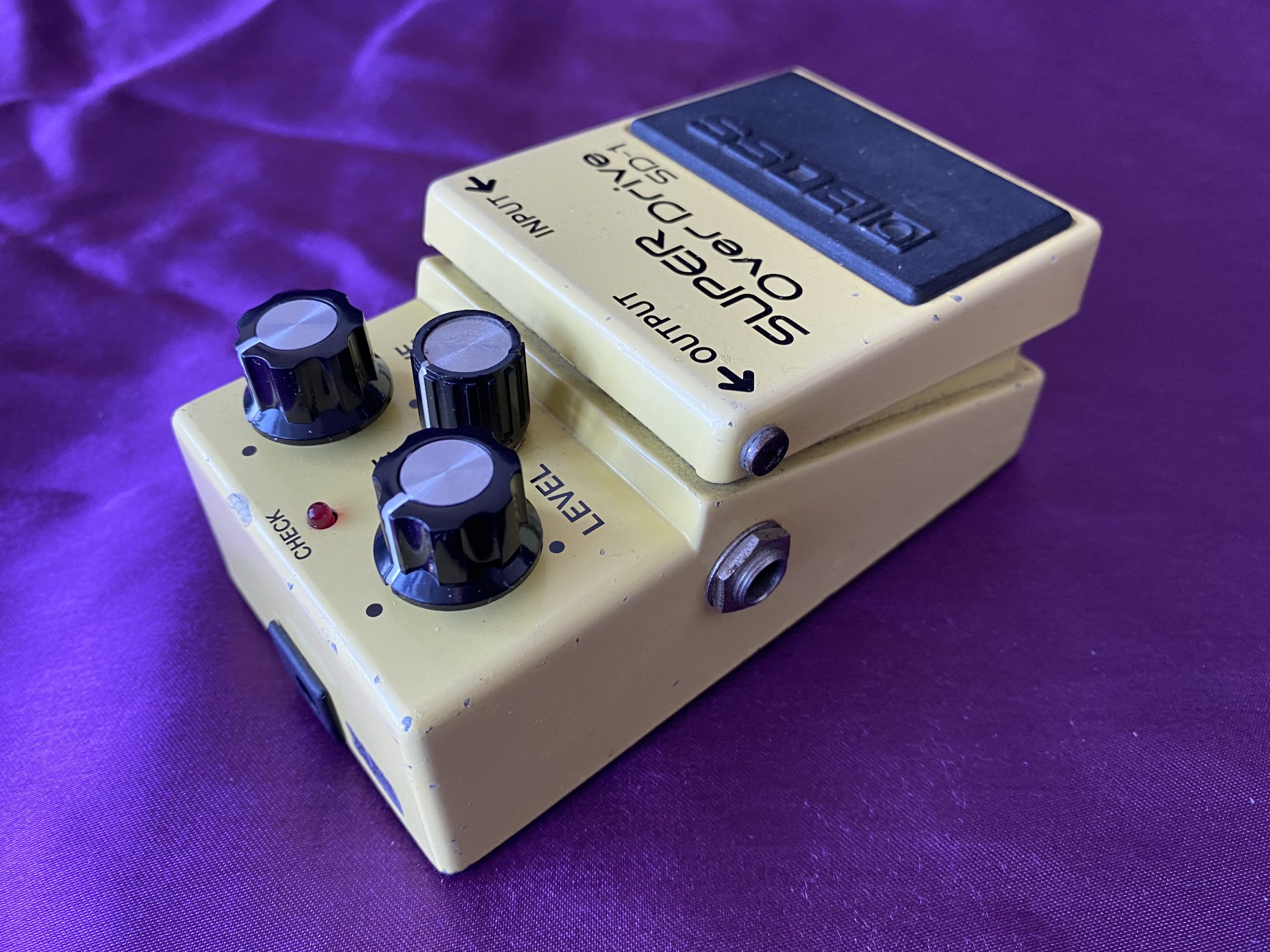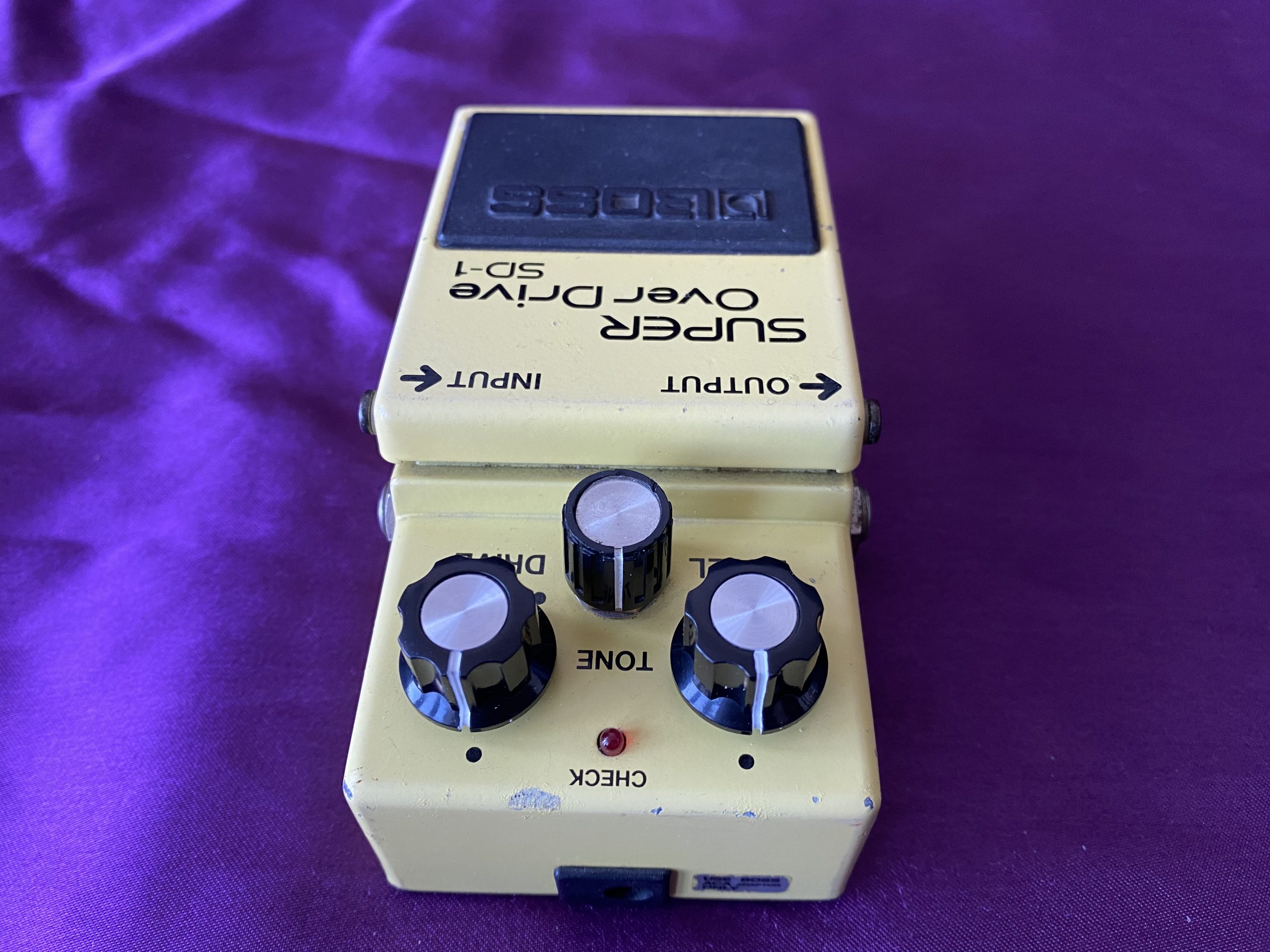 The highly popular BOSS SD‑1 Super Over Drive was introduced in 1981 and has not been withdrawn to‑date. The SD‑1 wasn’t, however BOSS’s original or only overdrive pedal. The seemingly very similar BOSS OD‑1 Over Drive was introduced in c.1977. Crucially, the difference between the two is that the SD‑1 adds a variable tone control. This addition was necessitated by strong competition from the legendary Ibanez TS‑808 Tube Screamer Pro, which also featured a tone control. The ability to fine-tune the tone of the effect was seen as important and something that the original OD‑1 simply could not do. Quite why BOSS didn’t simply update the existing model remains a mystery (BOSS later introduced the OD‑2 and OD‑3). The SD‑1 uses the same patented asymmetric overdrive circuit as the OD‑1, which sets its tone apart from that of the TS‑808. The SD‑1 is often regarded as a benchmark for dynamic and smooth overdrive tones. At lower gain levels, the SD‑1 works well as a clean boost effect for driving the input circuits of valve amplifiers. The OD‑1 and SD‑1’s ability to maintain the natural tone of the guitar and the guitarist’s playing style has become widely recognised. Nevertheless, it still remains in the shadow of the Ibanez TS‑808. Many illustrious guitarists have become associated with the SD‑1 over the years. As the humble, yet classic BOSS SD‑1 Super Over Drive has been in continuous production from 1981 until today, good vintage examples can be found relatively cheaply on the vintage effect guitar market.