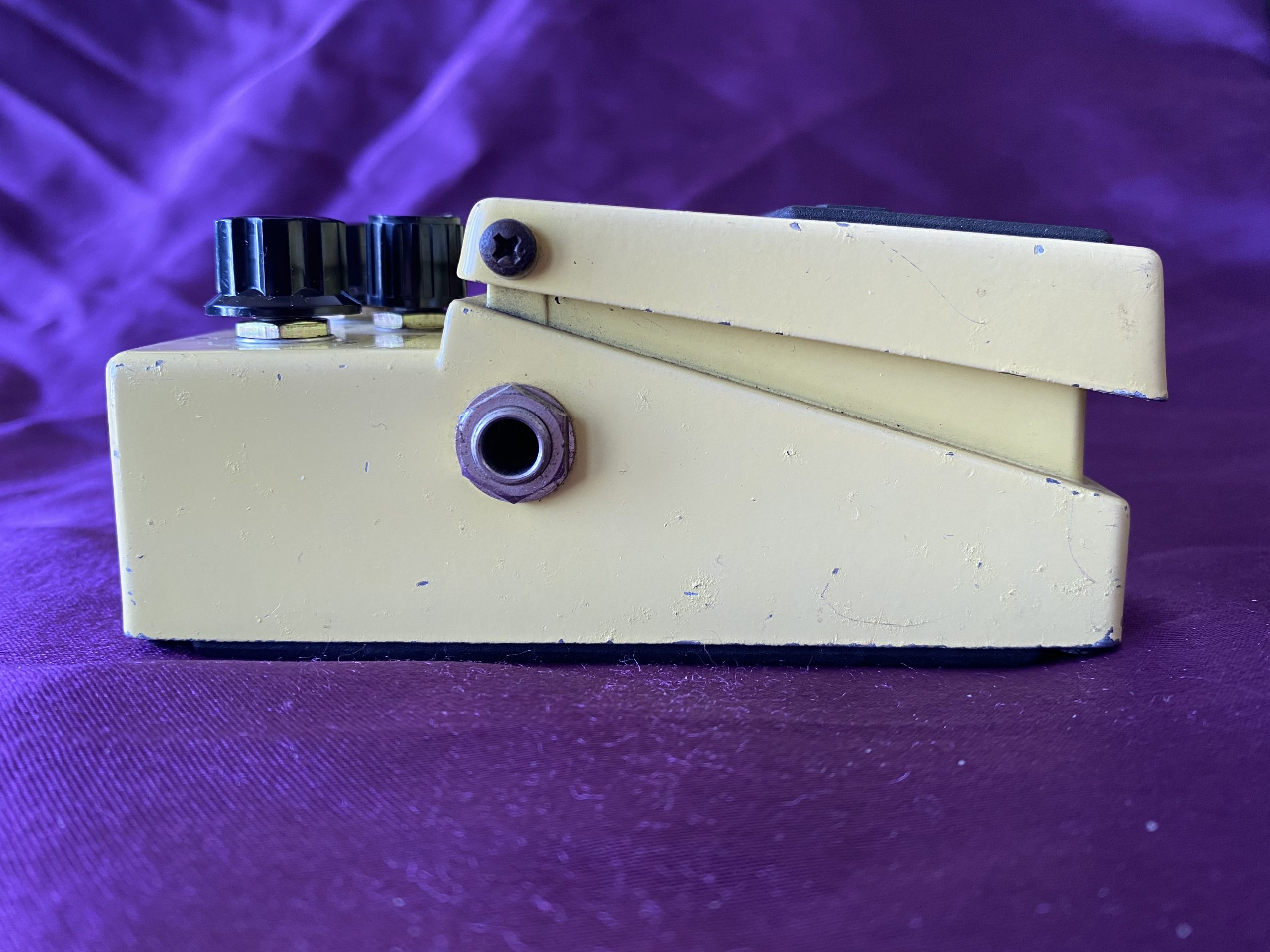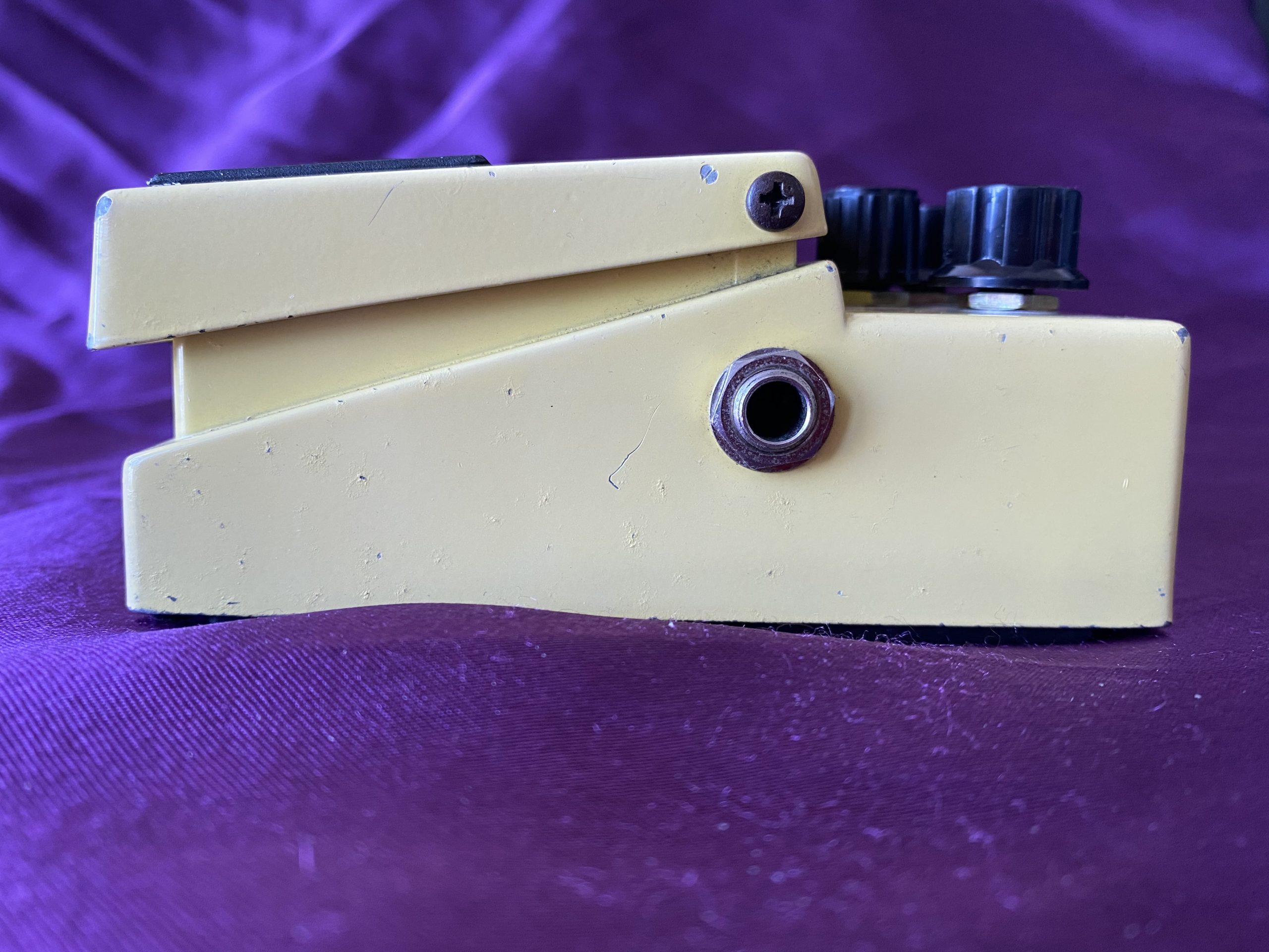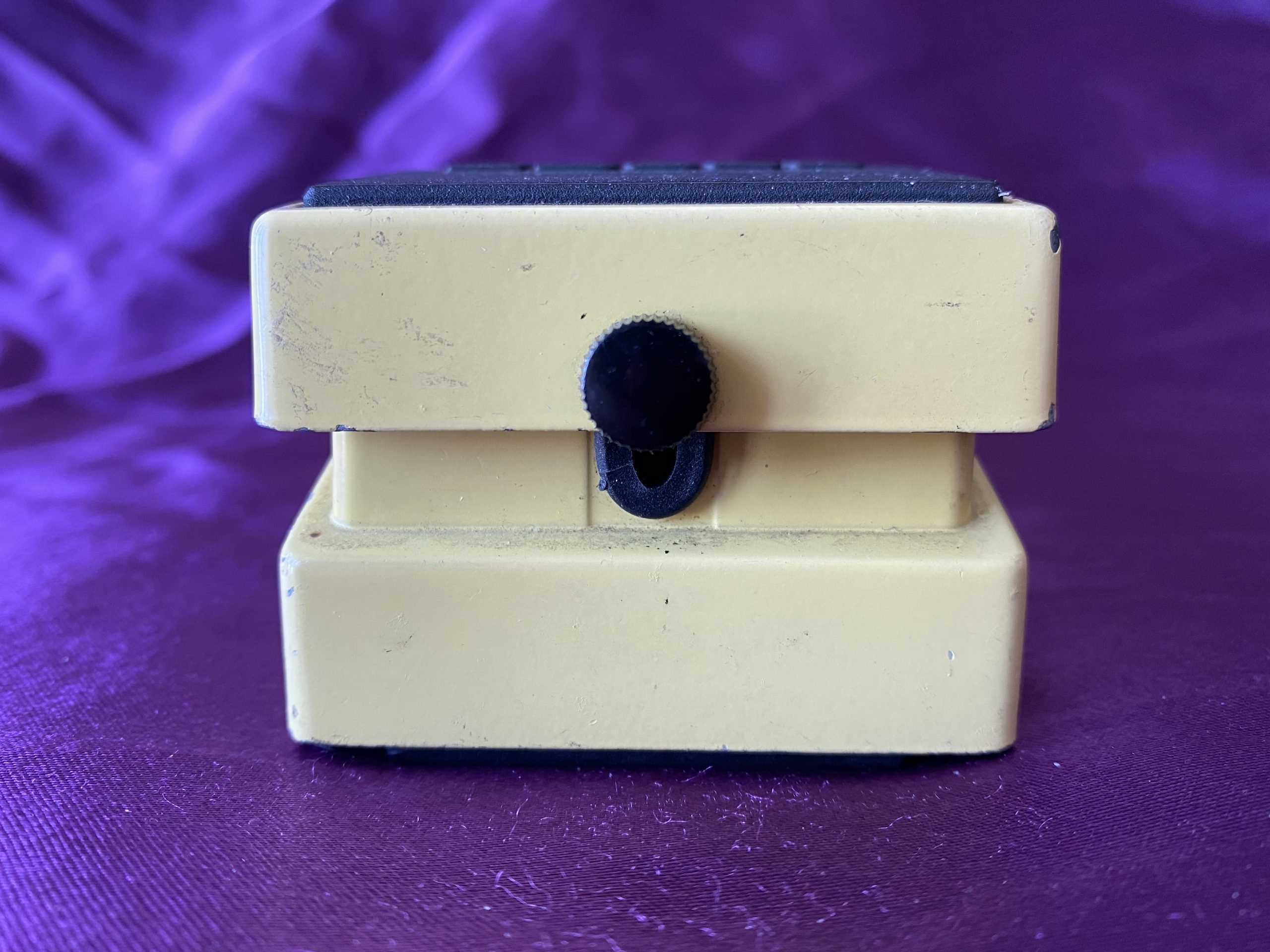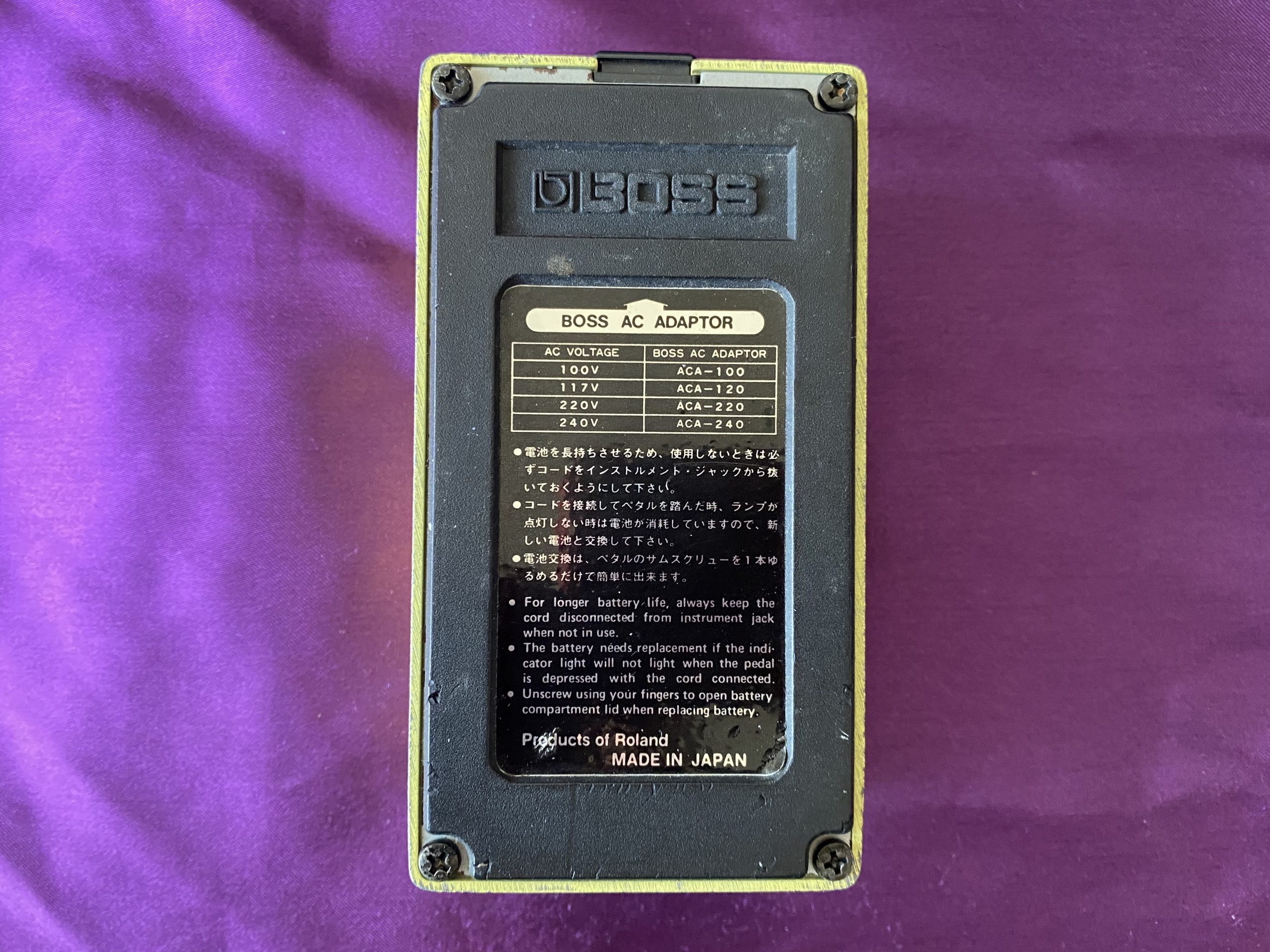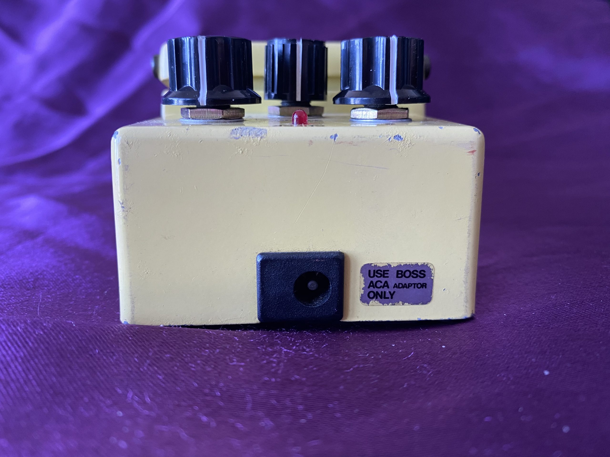 For your consideration is this probably‑familiar primrose yellow 1985 BOSS SD‑1 Super Over Drive. This is another one‑owner pedal, having been in the careful possession of the original keeper for over 35 years before coming to CRAVE Guitars. I have to admit that acquiring this stomp box was a bit of a gap‑filling exercise, rather than it being a must‑have purchase. The BOSS SD‑1 is often hailed as one of the most natural and transparent overdrive effect pedals ever made, which may be a debatable claim. The SD‑1 improves upon the similarly‑hued BOSS OD‑1 by adding a handy, all‑important tone control for versatility. Fans of the OD‑1 and SD‑1 talk about warm, valve‑like overdrive tones and its sensitivity to changes in a guitar’s controls or playing style, making for a very expressive vintage‑like tone. Perhaps it has become so common and the sound has become so familiar that it no longer stands out from its competitors – many of whom have imitated the SD‑1’s specification over the years. This all‑original example is in used but very good condition; just some superficial marks to the paint work in the usual places. While not a huge fan of overdrive or distortion effects, I can appreciate the genuine quality of the tones on show here. To me, it still sounds more like a solid state effect rather than an authentic tube‑like crunch. All things being relative, it does sound pretty darn gutsy. Experts suggest that overdrive pedals like the SD‑1 (and the TS‑808) are often used best at low gain settings to drive a valve amp’s input, pushing it into genuine tube break up. Either way, the SD‑1 and its low gain mild/soft clipping distortion represents an important place in guitar effect history.