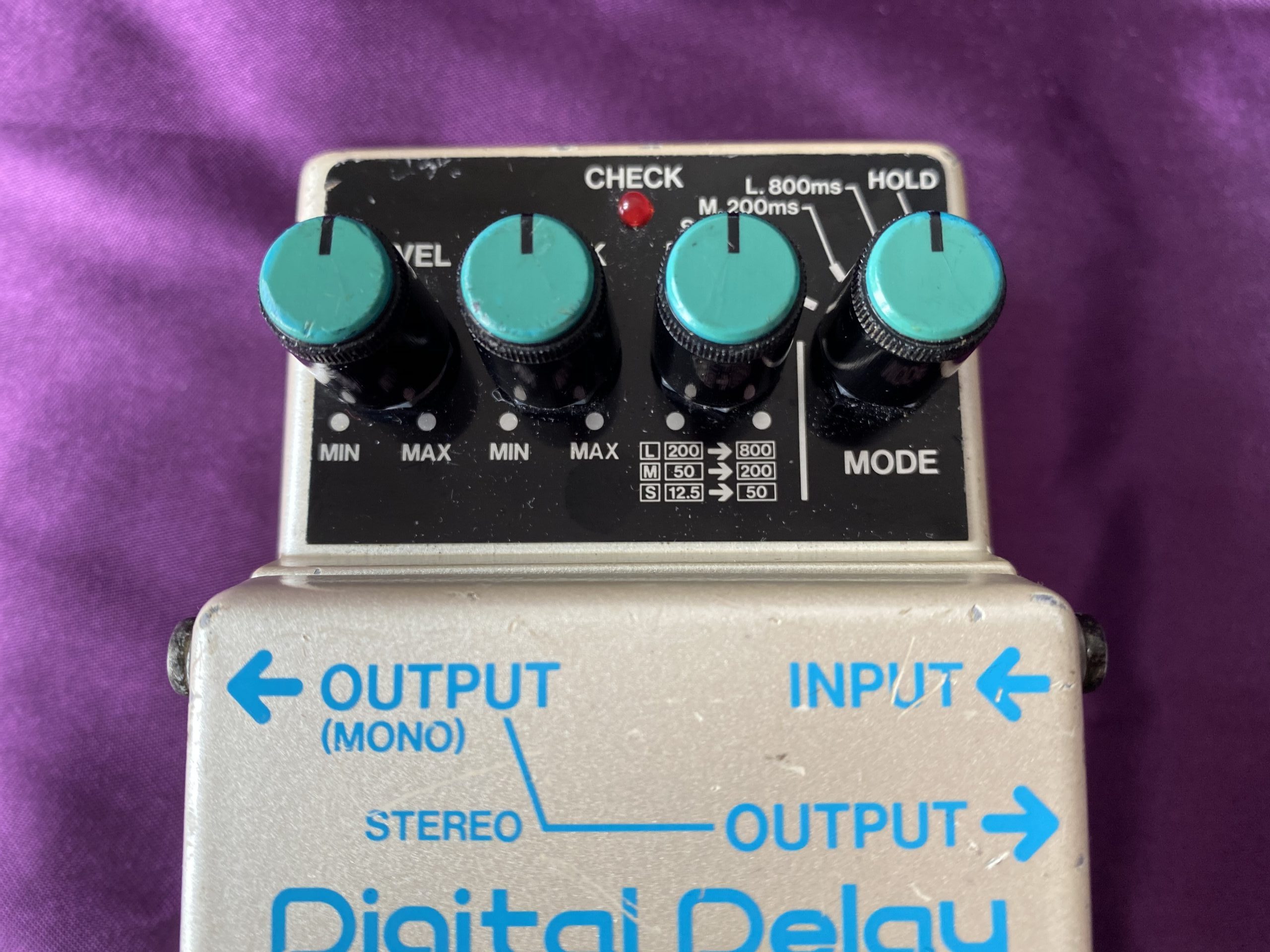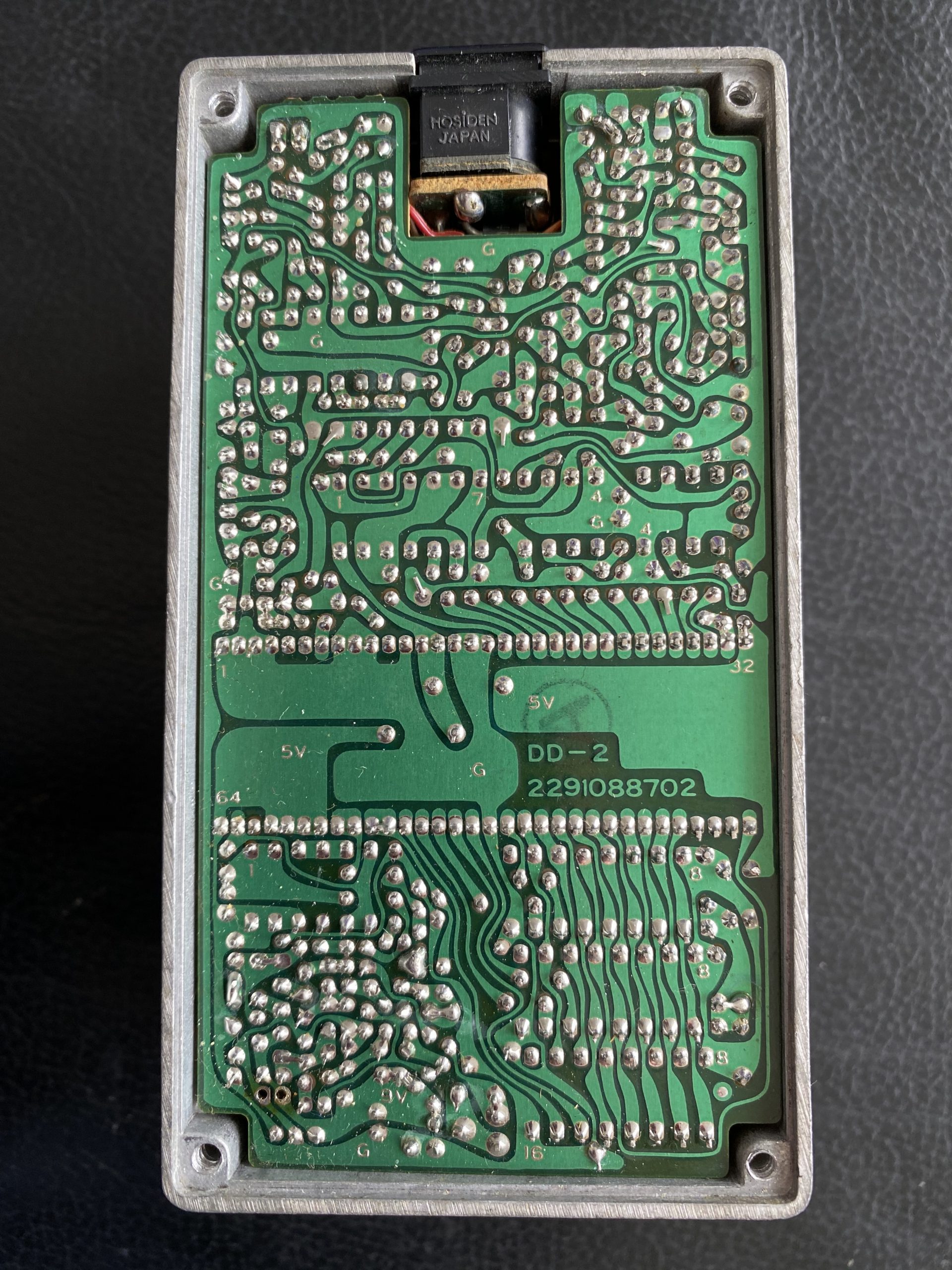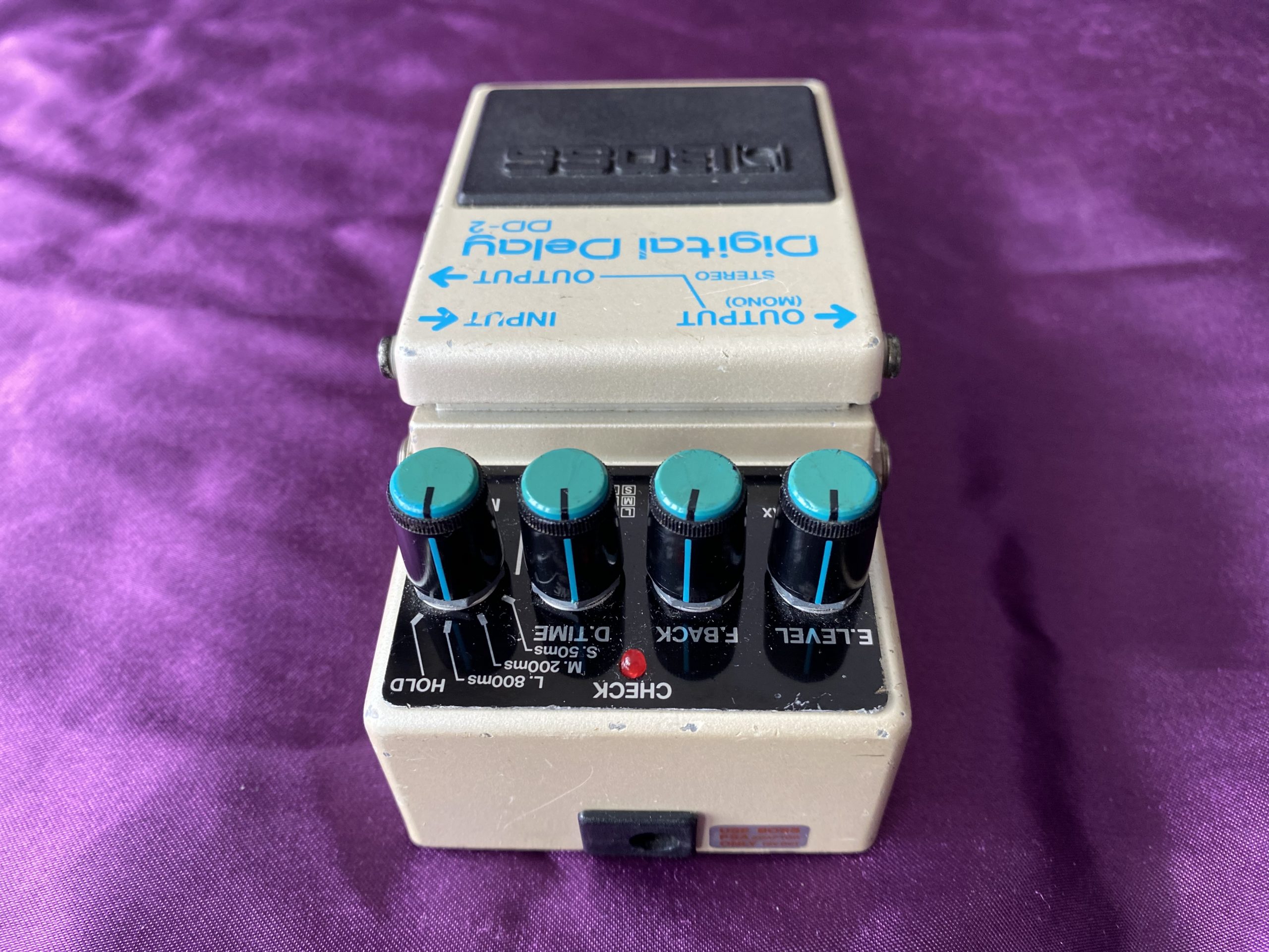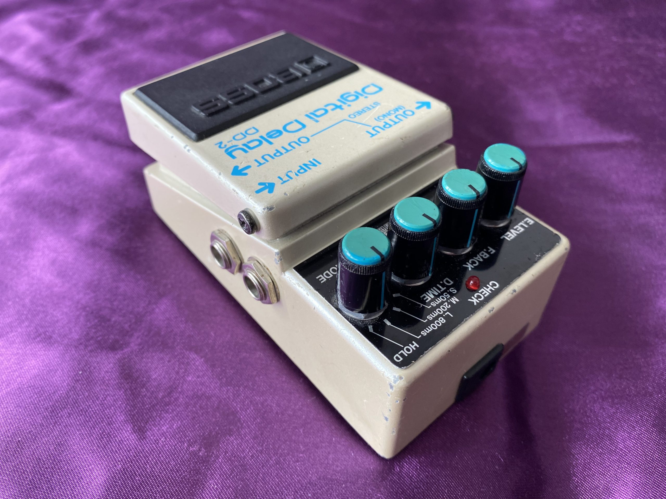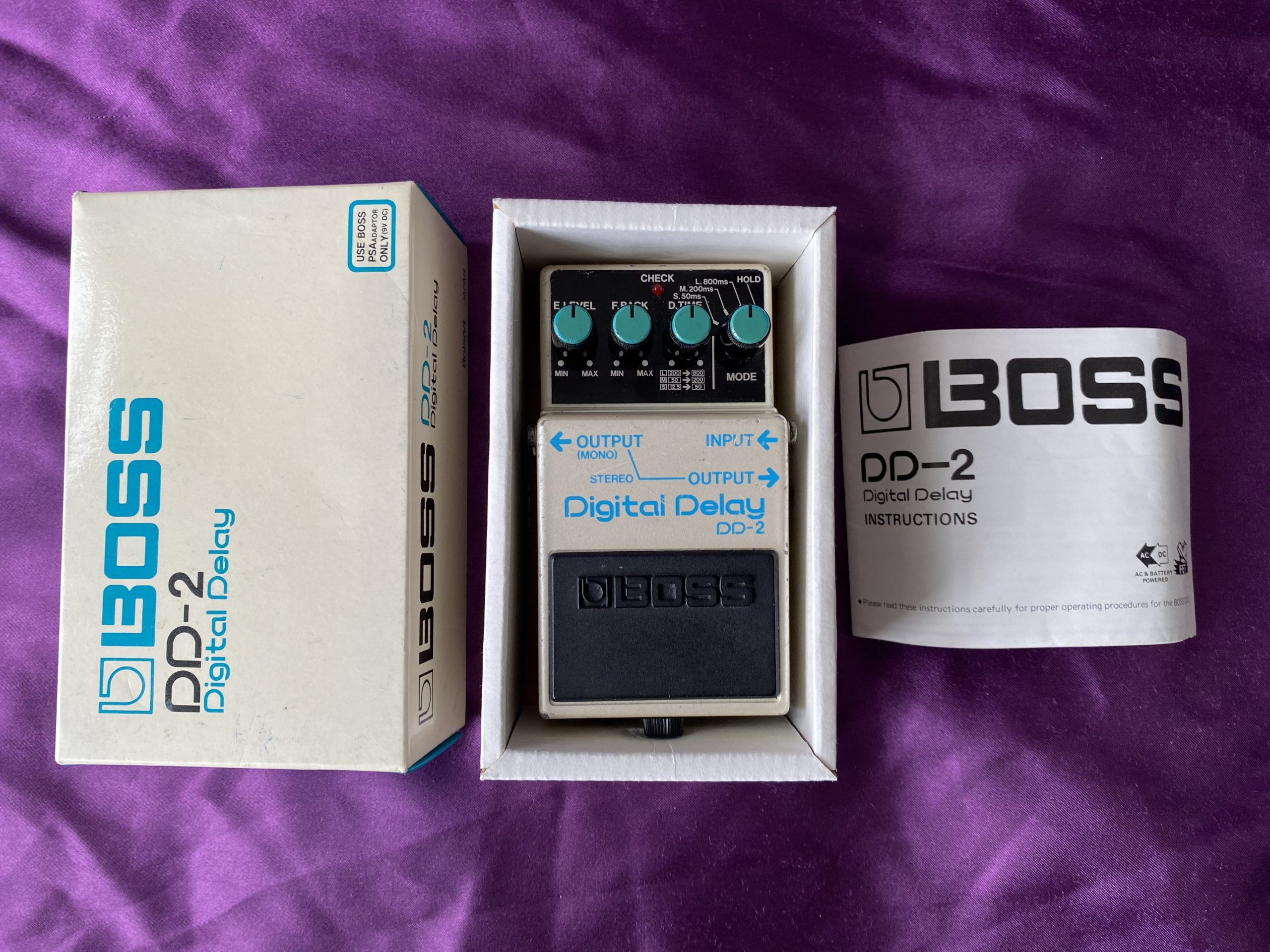 Here we have an all‑original 1986 BOSS DD‑2 Digital Delay, pretty much from near the end of the model’s manufacturing span. The circuit didn’t change much over its lifetime, so the production year is less of an issue. This DD‑2 has the much‑talked‑about ‘long chip’, which is apparently favoured by collectors. I started playing guitar during the time when analogue solid state delay pedals were at their peak, so that was my benchmark and the mainstay of the CRAVE Effects’ pedal family. This is only the second digital pedal in the clan, after the BOSS RV‑2 Digital Reverb (only because vintage analogue solid state reverb pedals are non‑existent). The DD‑2 is undoubtedly a very impressive effect pedal, although I still tend to revert back to the warm, sludgy tone of analogue pedals. However, the DD‑2’s talents really lie in its unique (at the time) extended delay range from 300ms upward to a maximum of 800ms. Just on this basis alone, it earns its place in the CRAVE Effects ‘collection’. The most important thing with effects like this is that they should be great fun to play around with, especially at the longer delay times, which is where it really excels with pristinely clean and clear echoes. There are hours of boundless pleasure to be had from playing with oneself (oo‑er missus!). Seriously though, the DD‑2 is a very effective and productive sound shaping tool for the creative guitarist. This particular pedal is not in pristine condition and it shows quite a few surface marks to the enclosure, although nothing serious. Due to its high current demand, the DD‑2 works best by using the correct BOSS 9V PSA power supply. It comes with its original box and instruction manual, which is always a nice addition to have. All in all, there is much to admire about the world’s first compact digital stomp box. Repeat after me…