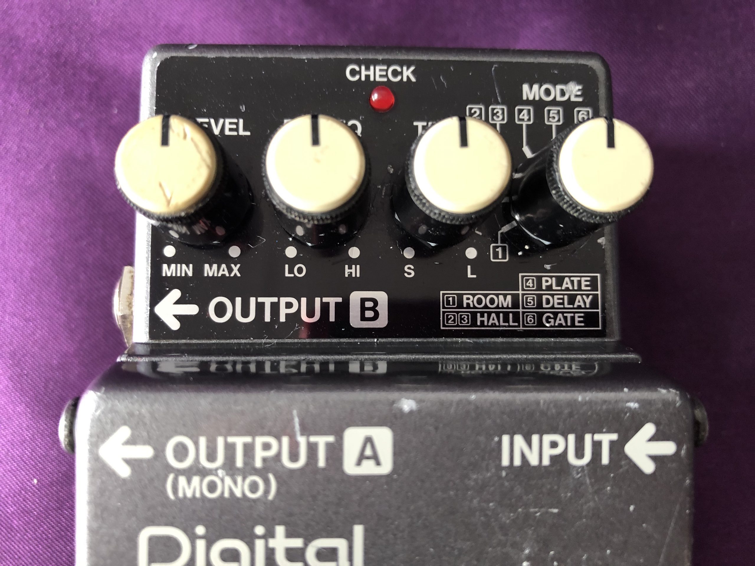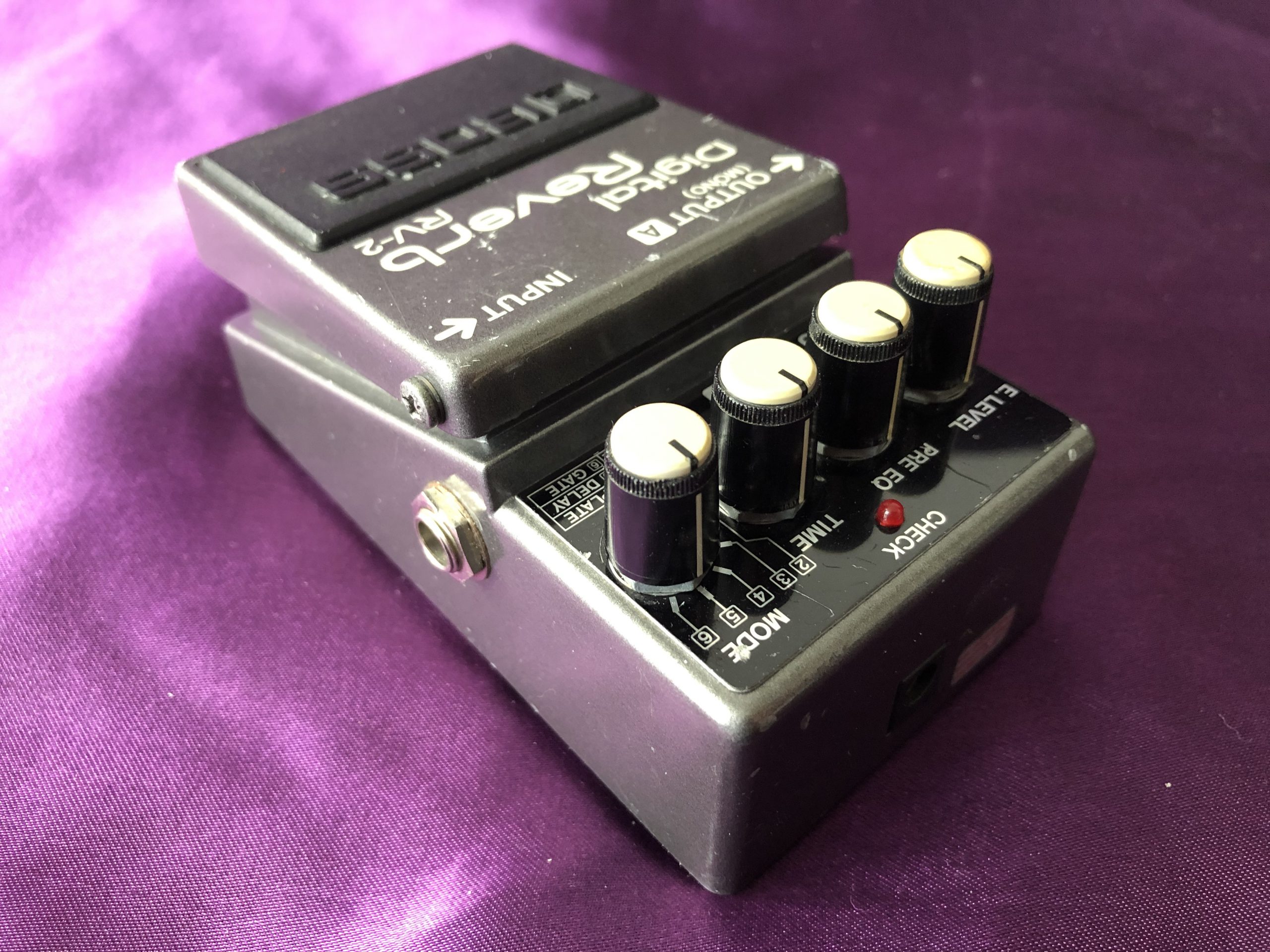 The dark grey Japanese BOSS RV‑2 Digital Reverb was noteworthy as the world’s first digital reverb compact pedal, introduced to the market in 1987. It wasn’t BOSS’s first digital delay pedal, that was 1983’s DD‑2 Digital Delay echo pedal. At its most basic, reverb is simply a delay effect but it is differentiated from echo effects largely due to the length of delay. Digital processing enabled the higher audio fidelity and increased delay range of studio rack processors to be available in a convenient stomp box. I am led to believe that reverb cannot be achieved in the analogue domain in stomp box form, which may explain the rarity of vintage reverb pedals. The RV‑2 didn’t stay in production for long and was discontinued in 1988, although it was marketed up to the end of 1989. It was superseded by the more refined RV‑3 in 1994. The circuit uses a powerful‑for‑its‑time DSP chip set that was taken from the BOSS RRV‑10 micro rack system. There are 6 modes comprising Room, Hall (x2), Plate, Gate and Delay. Like the equally digital DD‑2, the RV‑2 was also an example of the now‑familiar modern styling used by BOSS, with 4 colour‑capped control knobs. The RV‑2 has a high current draw (130ma), so it only runs off a 9V power supply unit with no option to run on a battery. There have been many digital reverb pedals since the RV‑2 that not only do more but also do it better. The pioneering RV‑2 began the on‑going development of digital reverb as we know it today. We tend to take music making in the digital domain for granted in the 21st Century but it was in its infancy back in the mid‑1980s. As a ground breaking innovation in effect pedals, the RV‑2 is beginning to become collectable, despite – or possibly because of – its binary digital signal processing.