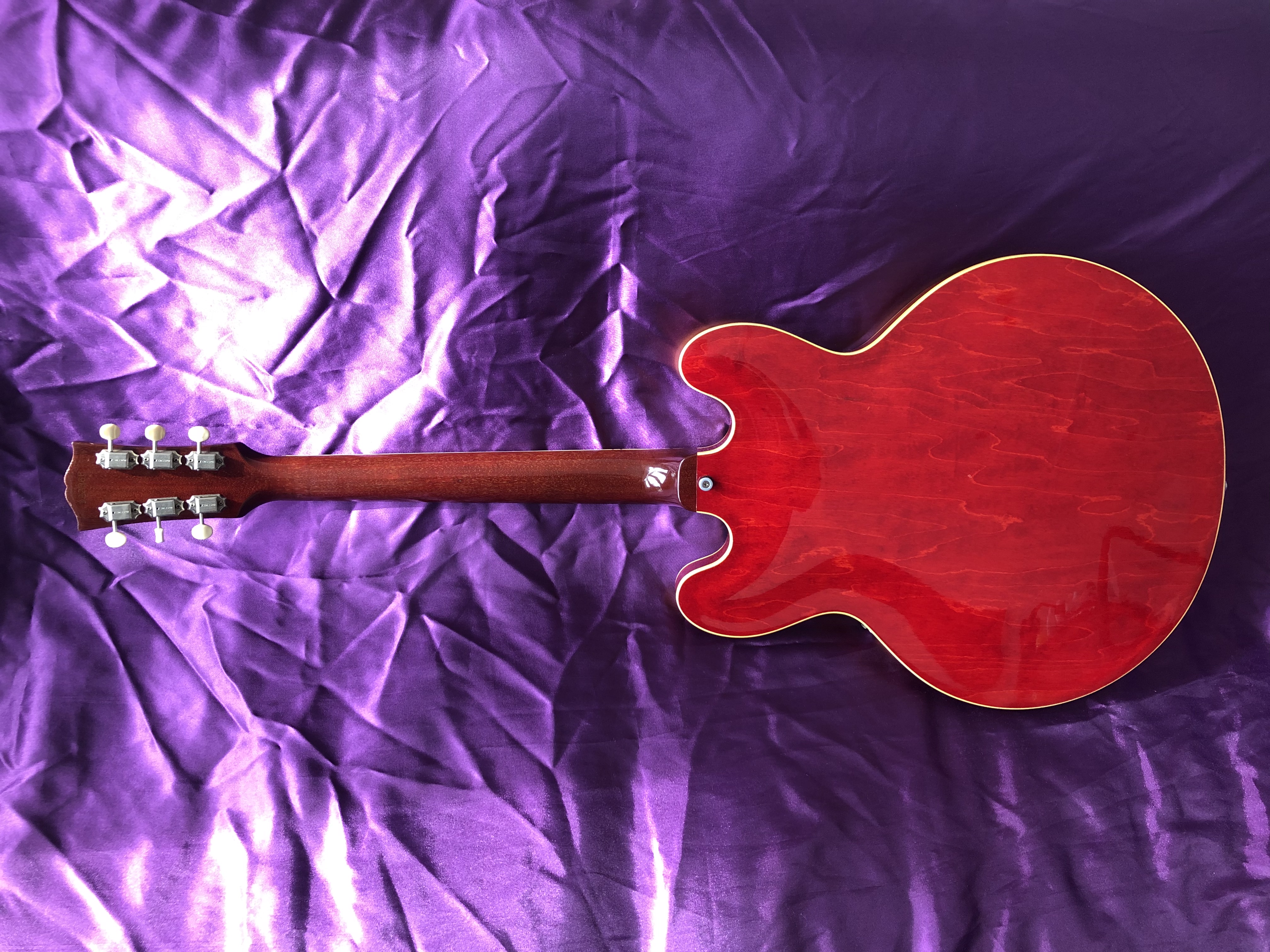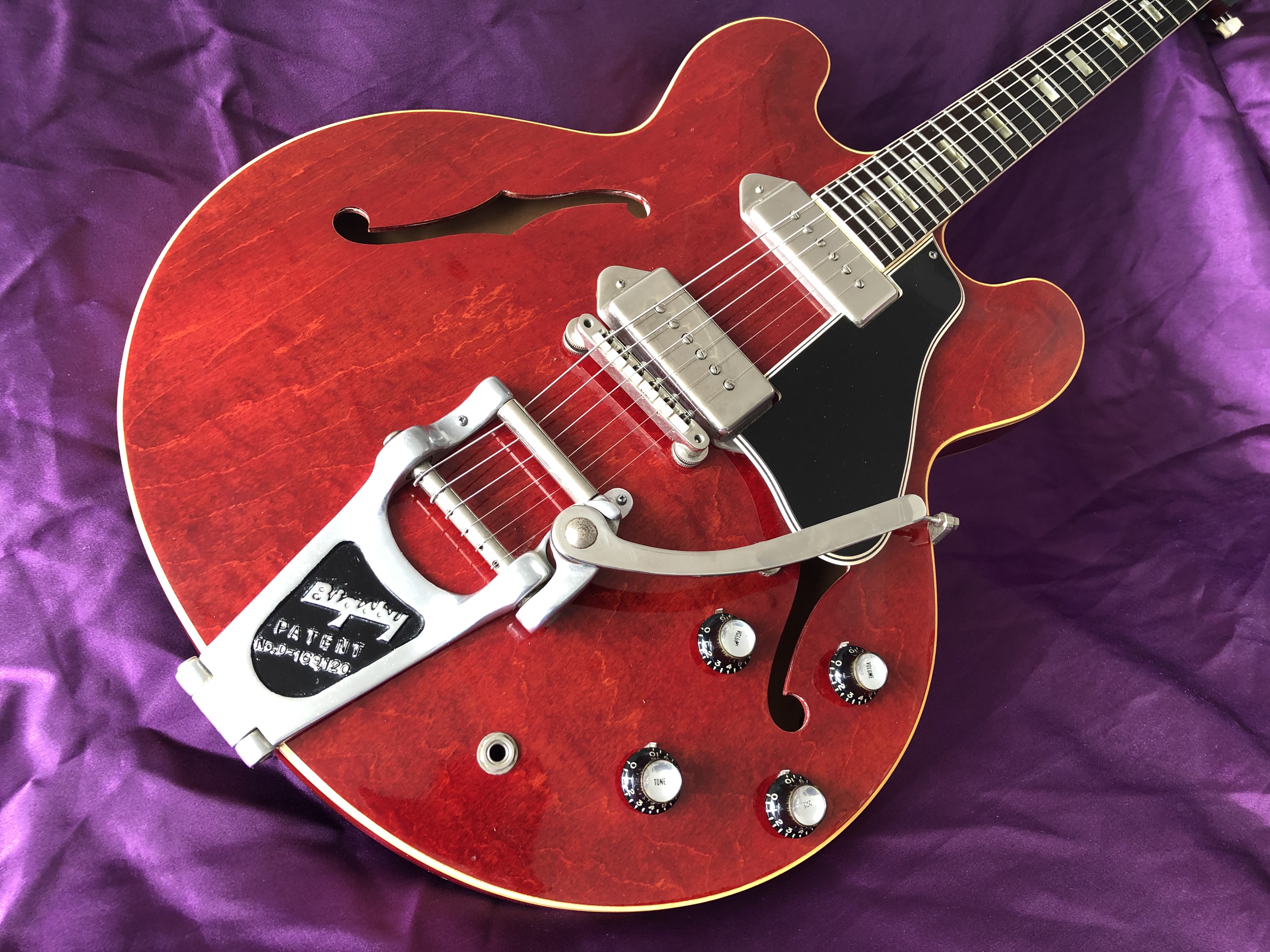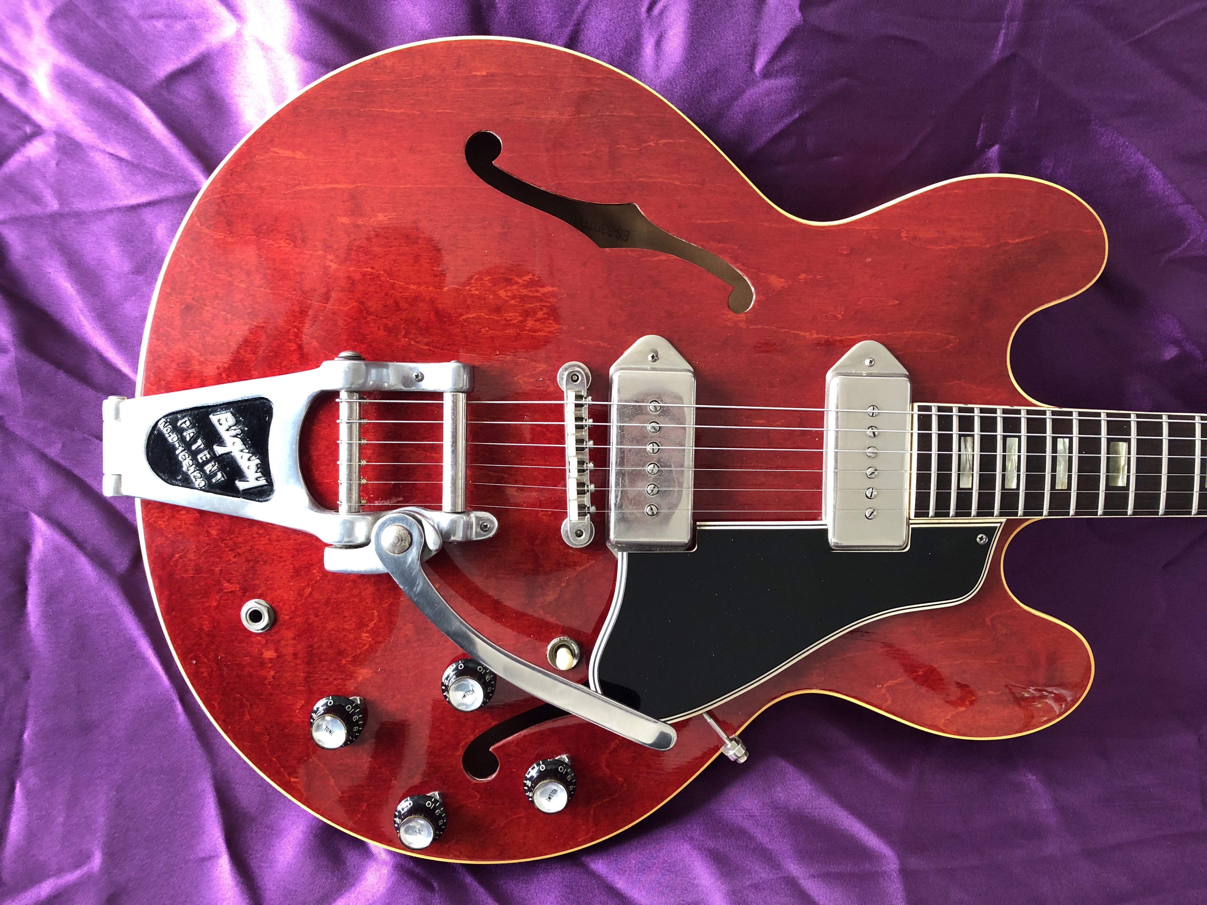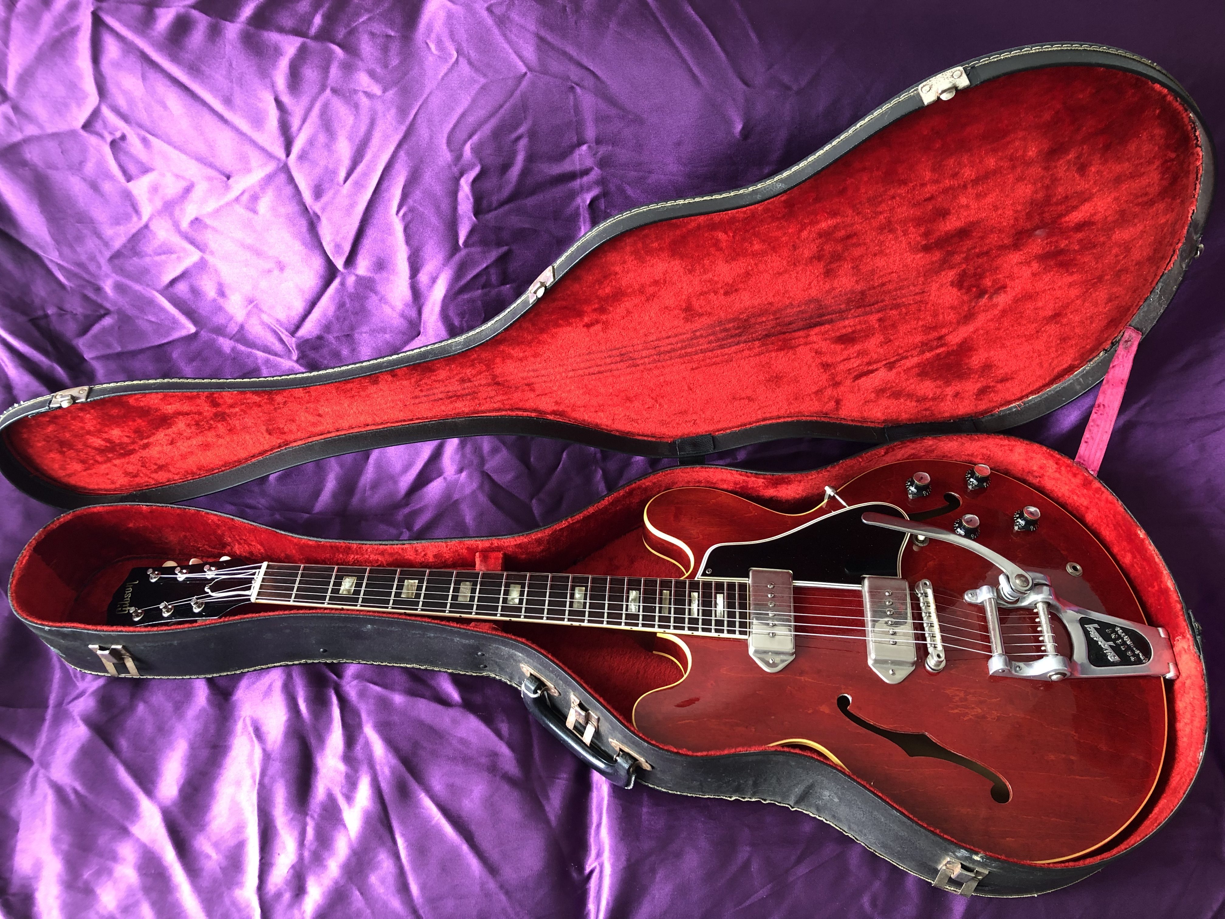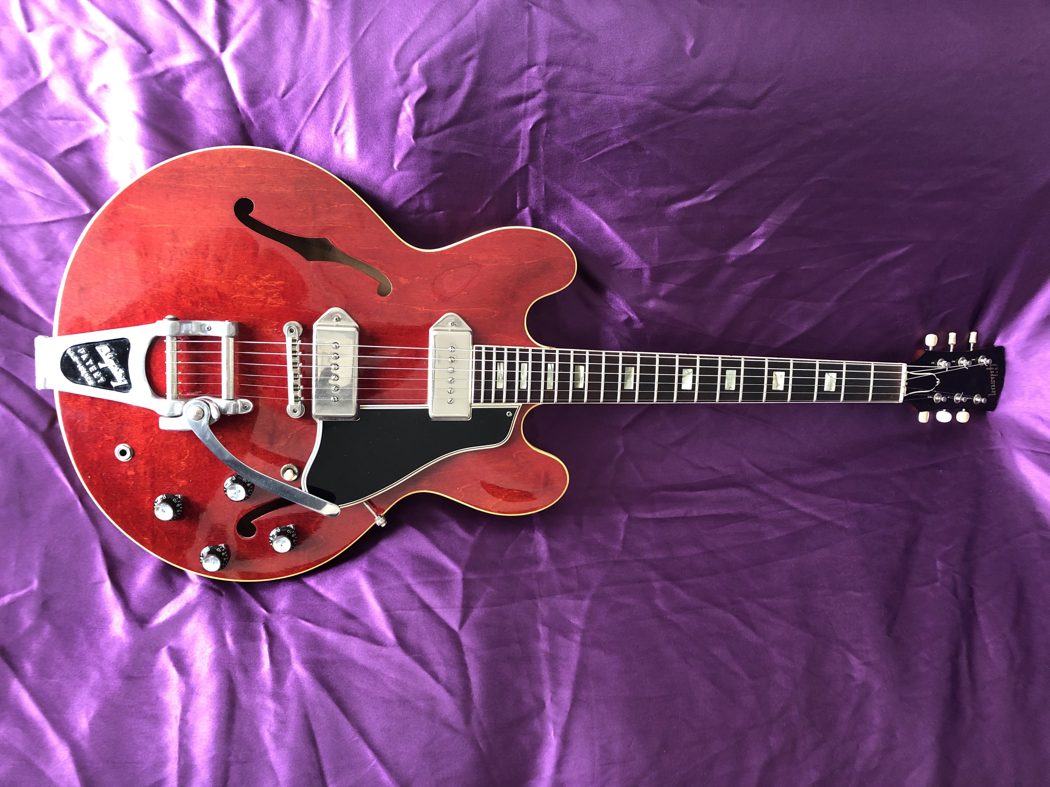 This is a truly, truly stunning, all‑original ES-330 TDC in sumptuous deep cherry (1962‑1972) with lovely nickel – rather than chrome – hardware and original factory Bigsby vibrato. It is in superb condition, especially for its age, with very minimal play wear. There is one very minor blemish to the finish and one of the original nylon bridge saddles may have been replaced. Basically, that’s all there is to comment on – not bad at all – aging gracefully well into the 21st Century. The (1963‑1964 only) nickel‑covered dual P90s give it so much more bite, grit and flexibility, perfectly complementing the open, woody sound of the hollow body. It feels, sounds and behaves differently, compared to the more sought after semi‑hollow ES‑335/345/355. Yes, the ES‑330 can be noisy and prone to feedback in high-volume situations because of the lack of the centre block but in every other instance, it has a distinctive voice all of its own and, in my view, just as worthy of consideration as any other model in Gibson’s formidable ES line up. There is an advantage to the hollow body in that it makes the guitar much lighter than its counterparts and very comfortable to play. The original Bigsby vibrato adds that additional bit of 1960s warble and it suits the 330’s sound and looks perfectly. This gorgeous ES‑330 is SO cool that, although I don’t have ‘favourites’, this is one of the most impressive instruments in CRAVE Guitars’ ‘collection’. This is one all-round exceptional guitar to die for.