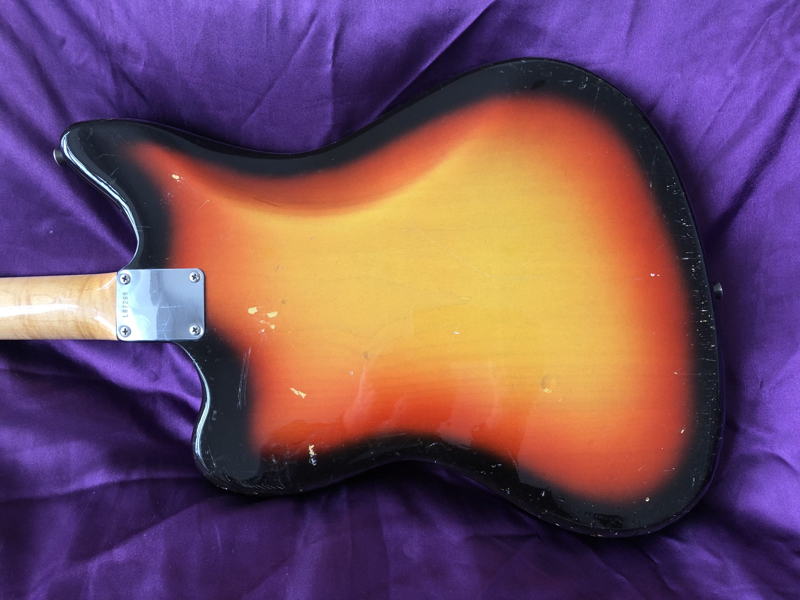 Here we have a gorgeous sunburst 1965 Fender Jaguar with the distinctive offset contoured body and desirable pre-CBS ‘L’ serial number. The Brazilian rosewood fingerboard on this example is particularly impressive – very dark, almost black, set atop a lovely subtle flame maple neck – it really is ϋber‑cool. The combination of the Jaguar’s unique shielded single coil pickups, the complicated electronics, bouncy vibrato/bridge and shorter scale neck give it a very unique playing experience and sound. It is very different to other Fenders of the period, and all the better for it. The body can feel a bit on the large side and it is quite heavy compared to other, smaller Fender offset models. Plugging the Jaguar in, you can immediately tell that it wasn’t really in competition with Gibson or anyone else’s models. The Jaguar holds an inimitable place in the Fender canon not only because of its looks but also its hugely flexible sounds. While it looks a bit like the similar Jazzmaster, it has as much to contrast as to compare. It is great to play with its tight vintage 7¼” radius fingerboard and the dedicated Jaguar pickups bestow it with a lovely, jangly single coil timbre. Often derided, the vibrato sounds like nothing else, especially with slightly heavier strings to help give sufficient string tension to make it sing (and stay in tune). The Fender Jaguar has certainly found a good home in the post‑punk, alternative and indie genres since the late 1970s to the current day. The offset body style has also become very much an in‑vogue aesthetic in the 21st Century. The Jaguar’s novel feature set all add to the formidable charisma that these old guitars exude – they really are like nothing else. OK, so this one has the ‘standard’ sunburst, rather than a rare (and much more expensive) custom colour but that doesn’t stop it being a great instrument in its own right. It has a few nicks and scrapes but it is well over half‑a‑century old and signs of use give it ‘that’ much‑craved (sic!) vintage look and feel.