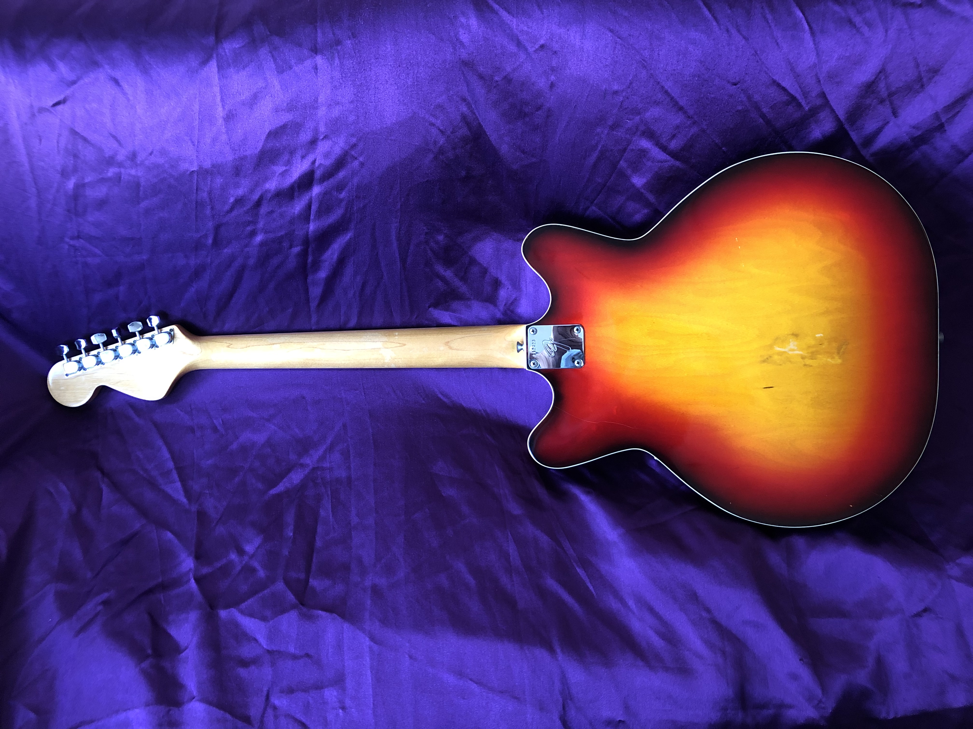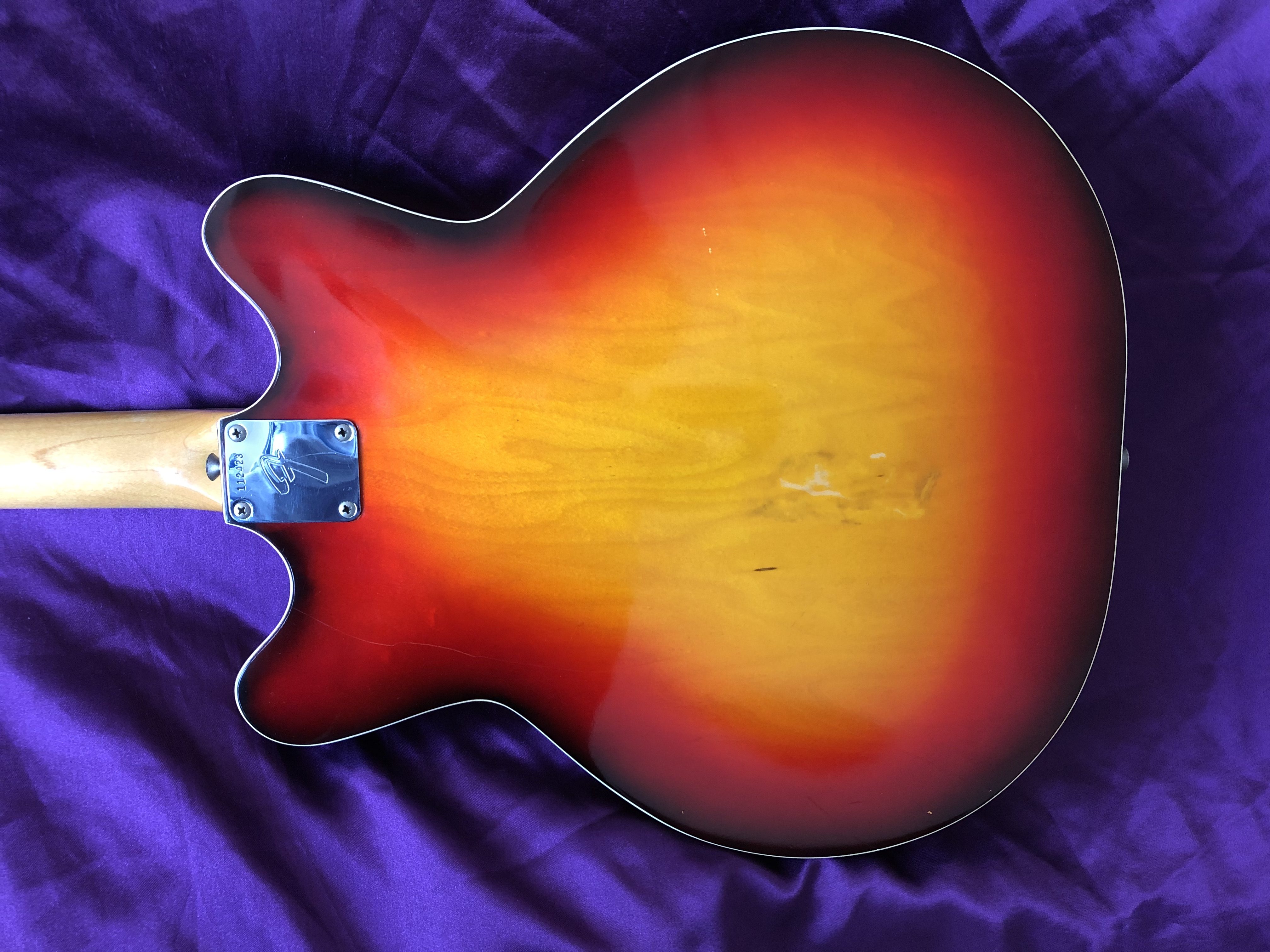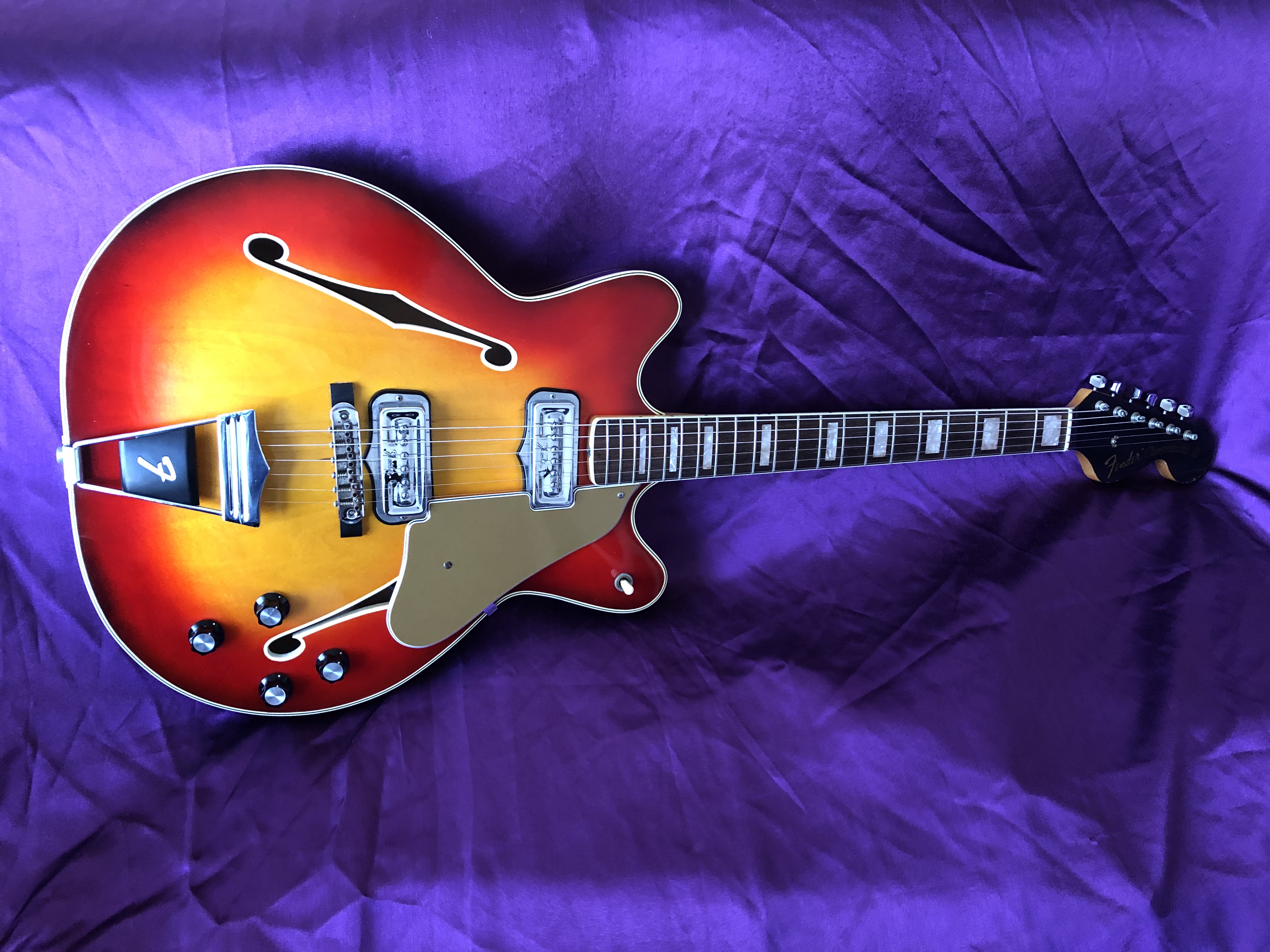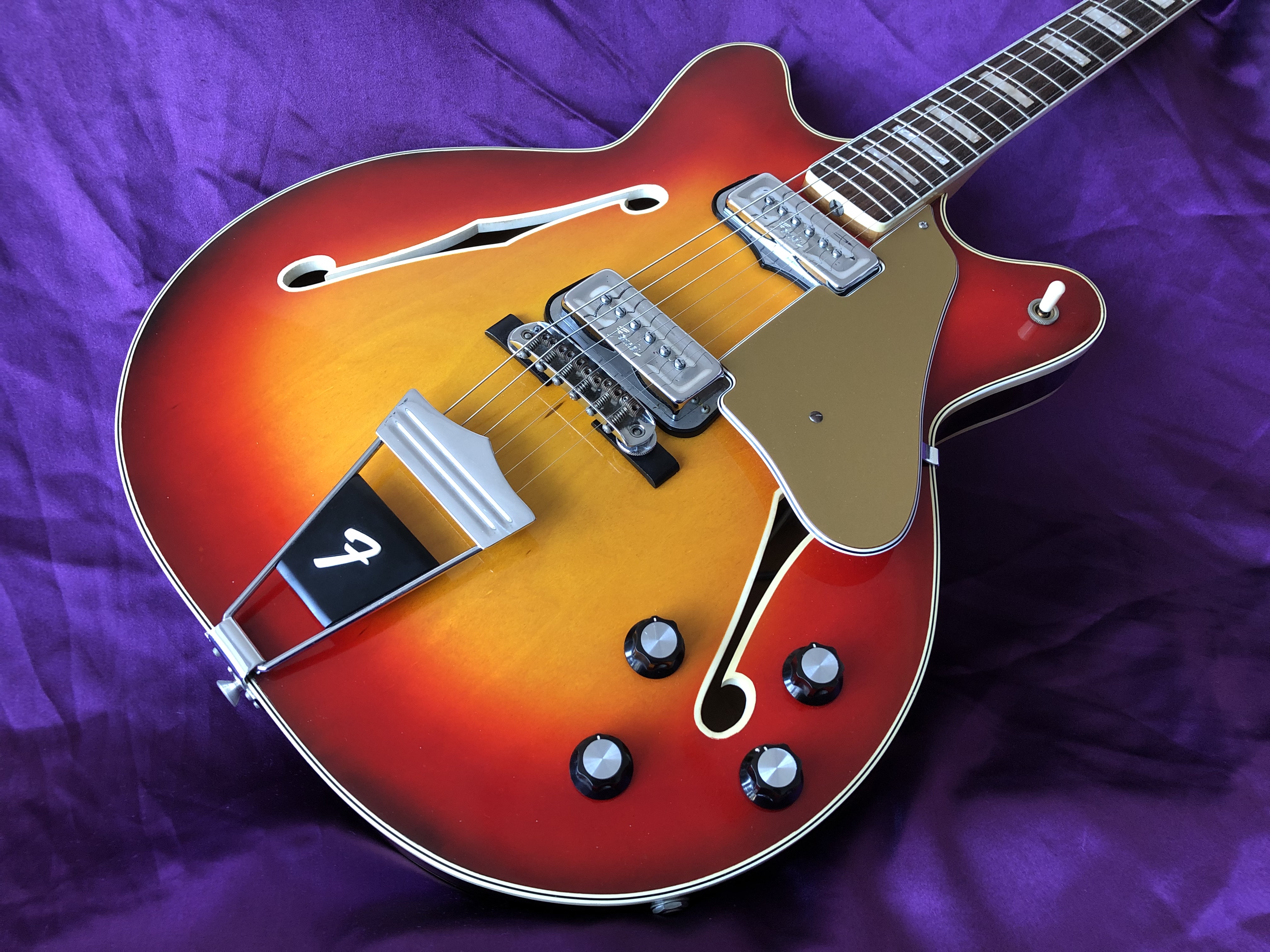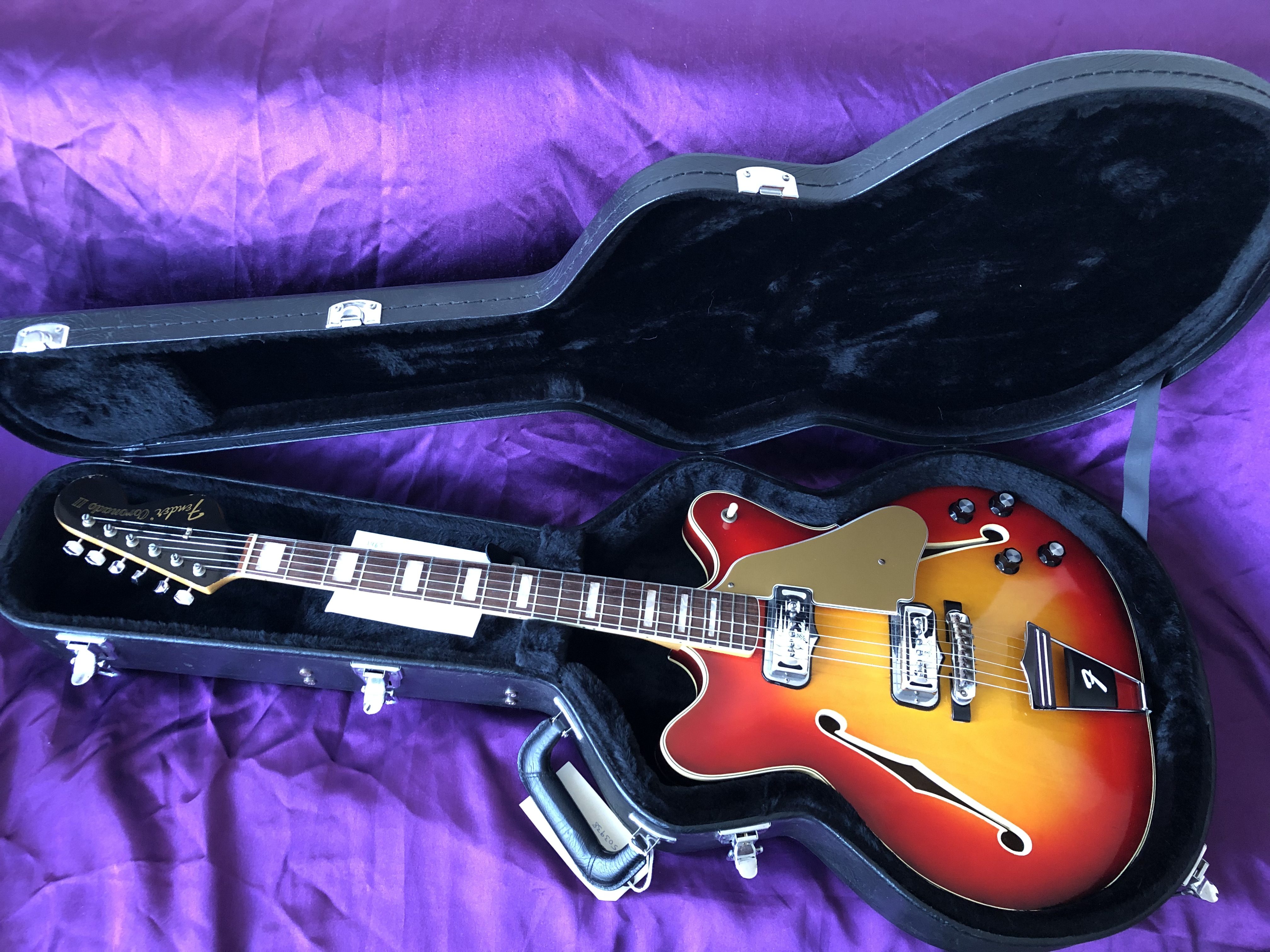 This wonderful first‑year Fender Coronado II from 1966 has a really cool retro-vibe to it and a distinctive sound all of its own. The ‘swinging sixties’ aesthetic certainly grows on one; bound maple neck, rosewood fingerboard with block markers and black headstock. The vivid cherry sunburst allied to the off‑white binding to the body and f‑holes, bright chrome work, non‑vibrato trapeze tailpiece and gold floating scratchplate add to the mix. The neck code and serial number date it firmly to 1966. OK, so this is no heavy metal rock machine; it is much better suited to rock ‘n’ roll or for jangly indie and alternative music and this seems to be where it has found a loyal following today. One distinct advantage of a hollow body is its light weight, making it easy on the spine. This example is in very good condition, although the back of the neck seems to have a thin clear overspray which I can’t explain, as it hasn’t had a refret and the underlying finish looks in good condition. Strange. One can understand why the Coronado didn’t appeal to Gibson aficionados when it was released, the very Fender-y neck, the distinctly thinner sounding single coil pickups and the resonance of the fully hollow body, make it sound and feel very un‑Gibson-y. The Coronado isn’t really in the same league as the P90‑equipped Gibson ES-330/Epiphone Casino, which was the industry benchmark. Maybe the Coronado should really be judged on its own unique merits, rather than compared to something else. The Coronado is likely to remain a niche guitar for guitarists looking for something out of the ordinary and it is, perhaps, all the better for it. These underrated cool guitars are coming back into fashion and perchance it is beginning to get some well‑deserved righteous lovin’ at long last. Sweet.