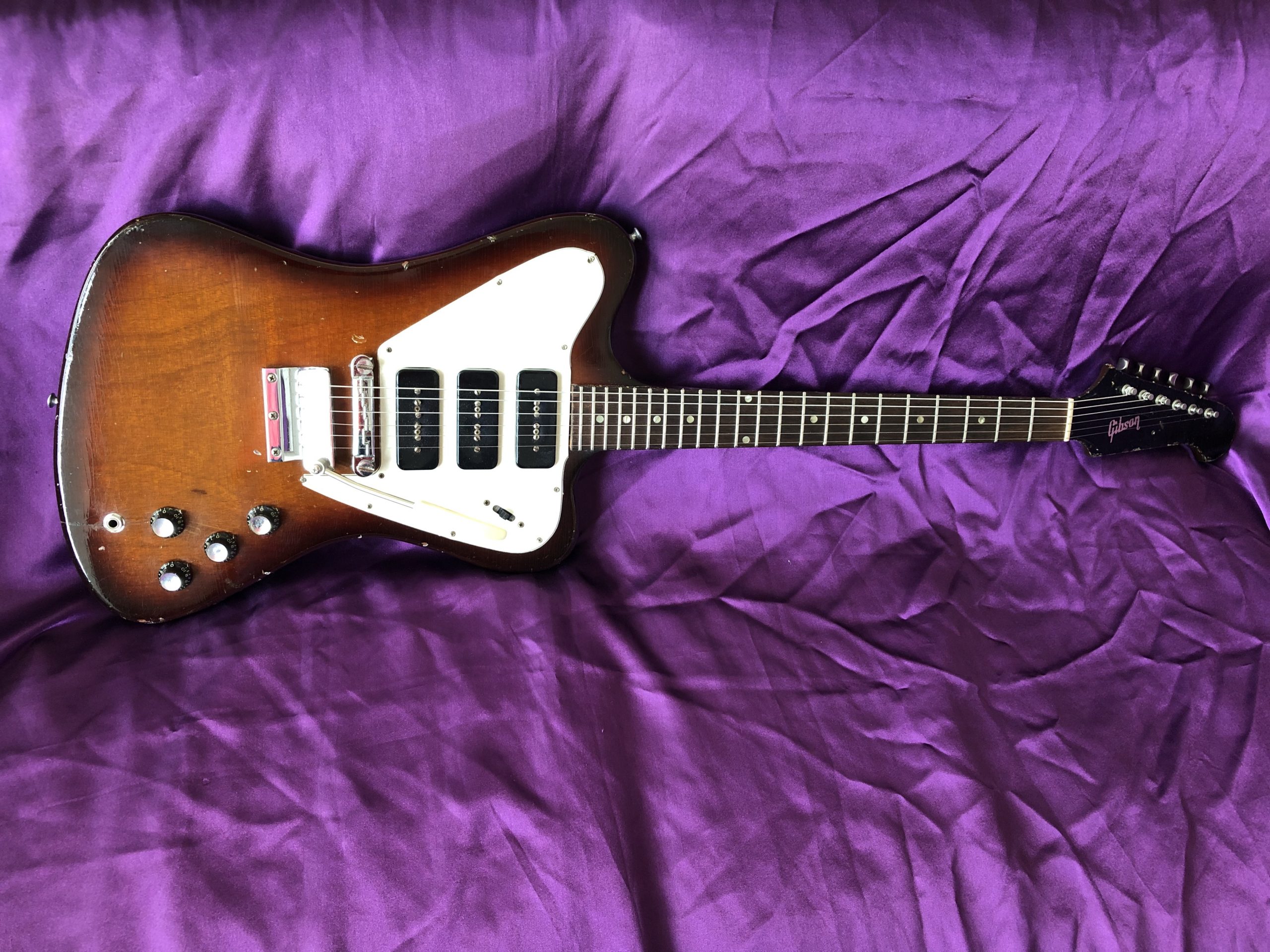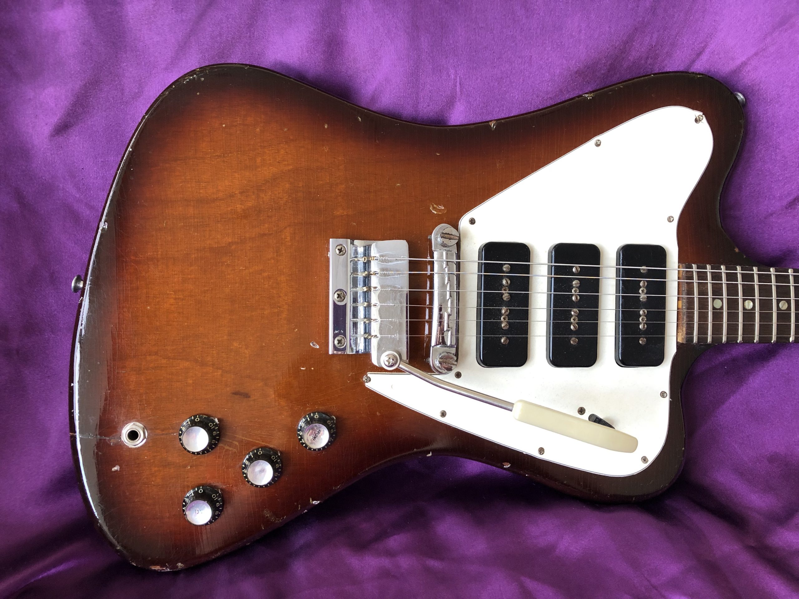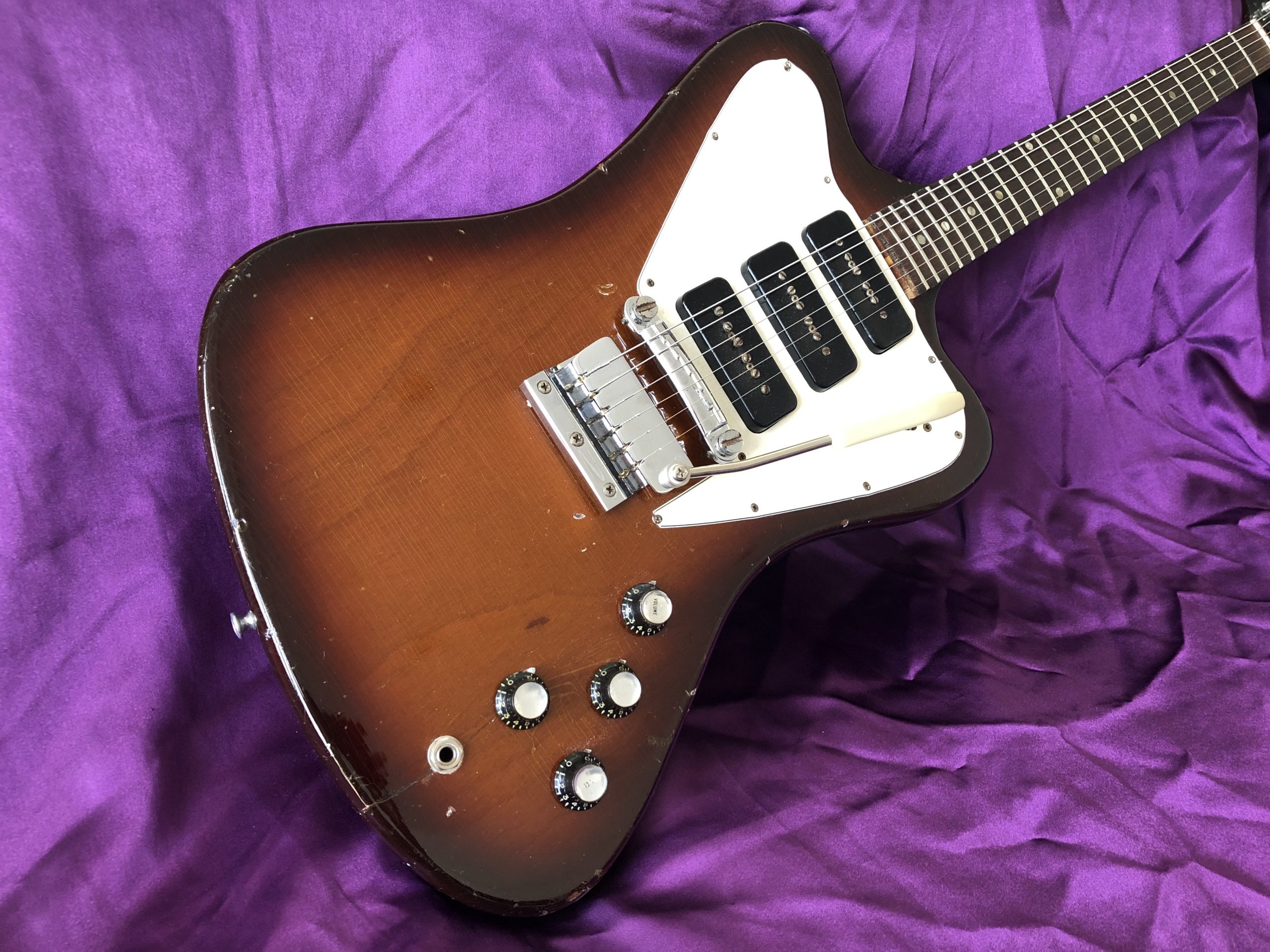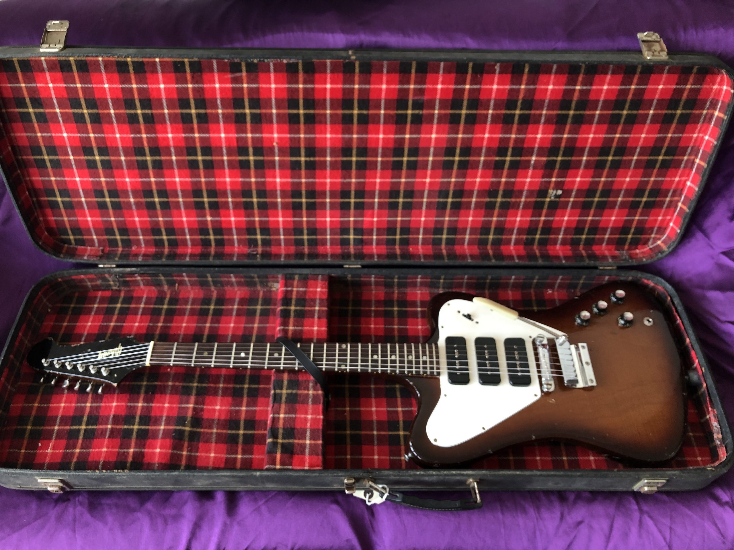 Like the proverbial phoenix rising from the ashes, here is a really cool and reasonably rare ‘non‑reverse’ 1966 Gibson Firebird III in standard sunburst finish. This one is all original apart from having had replacement tuners at one point – the originals are now back in place. Unlike the somewhat bulky original ‘reverse’ Firebirds, this example is nicely svelte, being relatively light and very well balanced. The three P90 ‘soap bar’ pickups have plenty of that meaty single coil growl to keep you entertained. The Firebird was, and still is, a great guitar for blues, rock, indie and alternative music. The factory Gibson Maestro Vibrola adds a touch of fluttery flexibility if needed. The neck is full and fills the hand to give it a real bold feel. The original etched Firebird logo is still just about visible on the scratchplate but the colour from the indents has long since worn away. This Firebird is all‑original but is not in pristine condition. It exhibits some extensive finish crazing and quite a few scuffs, scrapes, nicks and bumps acquired along the way. However, it is certainly not in poor abused condition either and there are no structural issues to be concerned about. Good guitars get played and this one certainly wears its heart on its sleeve. Overall, the well‑lived‑in look gives it enormous character and one wonders what stories it could tell about its many years of music making. What you see is more than half a century’s genuine play wear and not the result of some modern day ‘relic’ job. This lovely non‑reverse Gibson Firebird from the height of the ‘swinging sixties’ nails the period look, feel and sound perfectly. The original case with its groovy tartan interior adds a bit of 1960s funky flair. All‑in‑all, this Firebird III is a rare bird and a genuine example of its breed, exemplified (and amplified!) with plenty of vintage mojo.