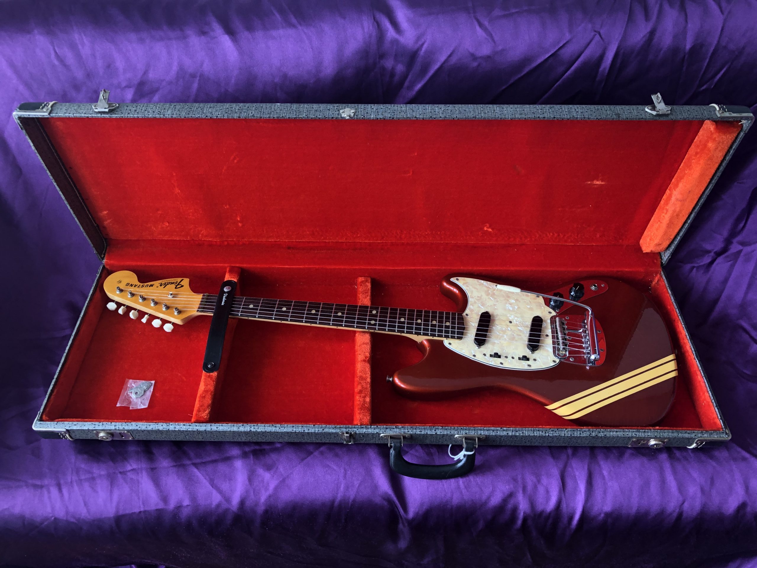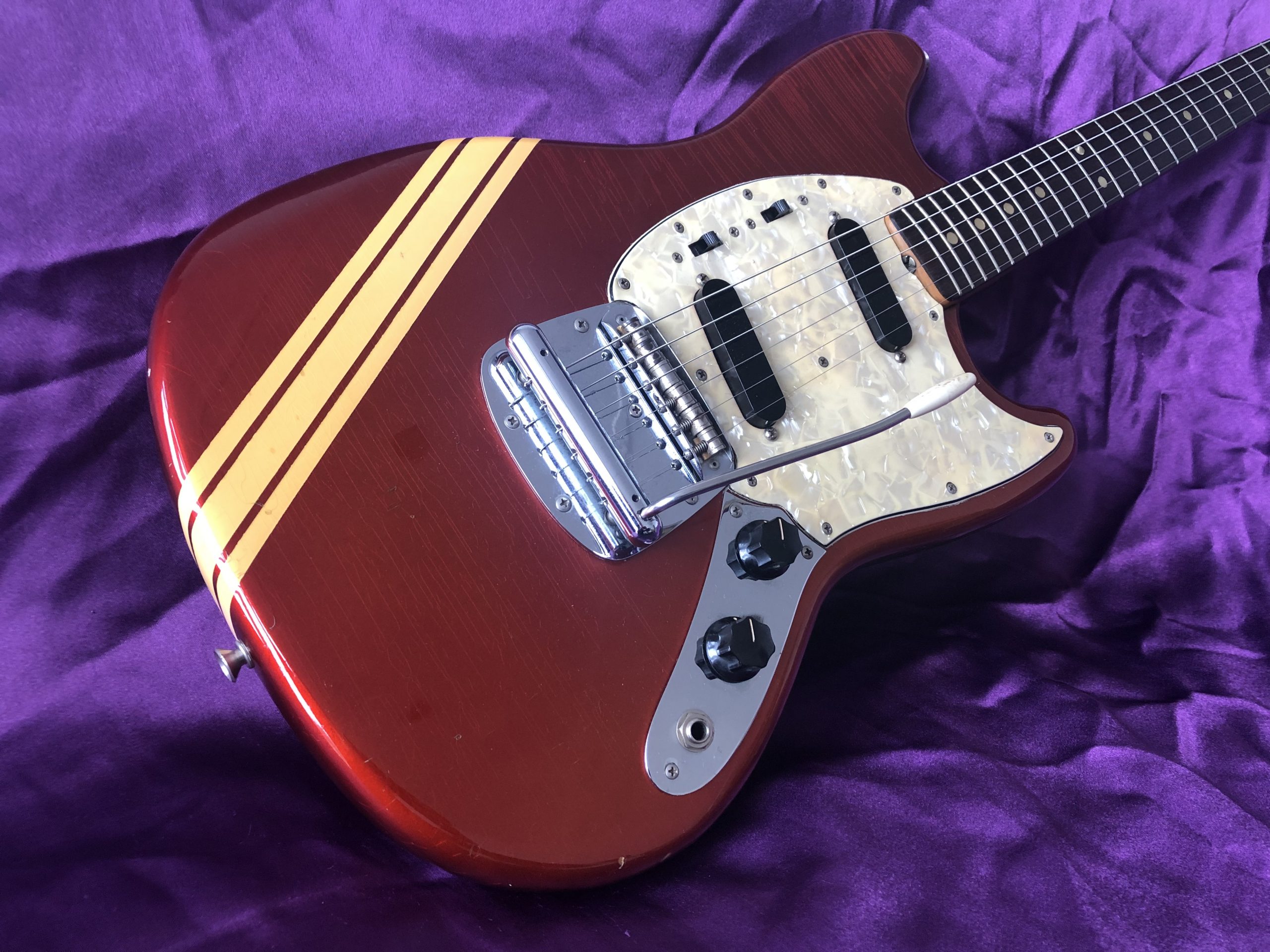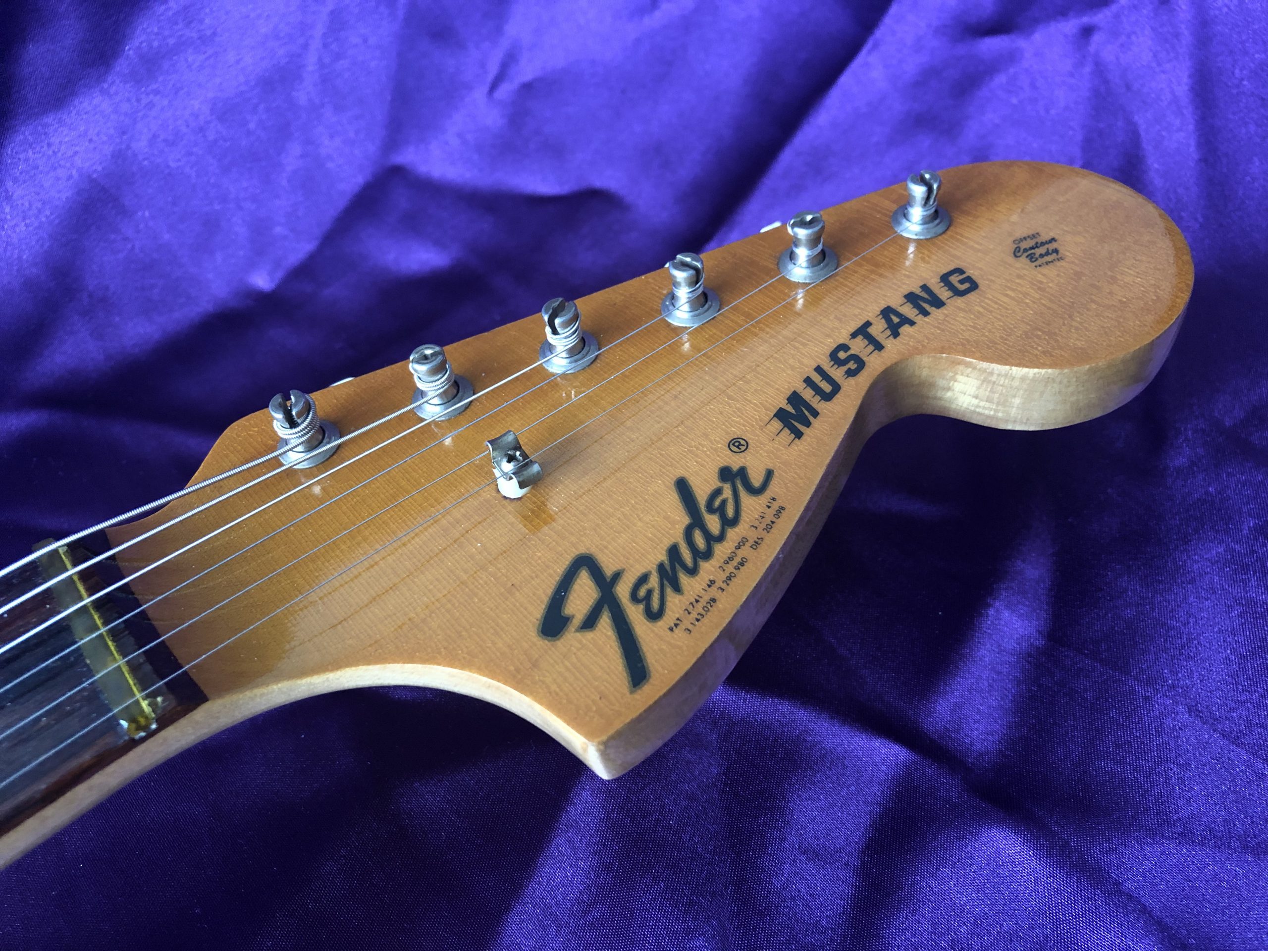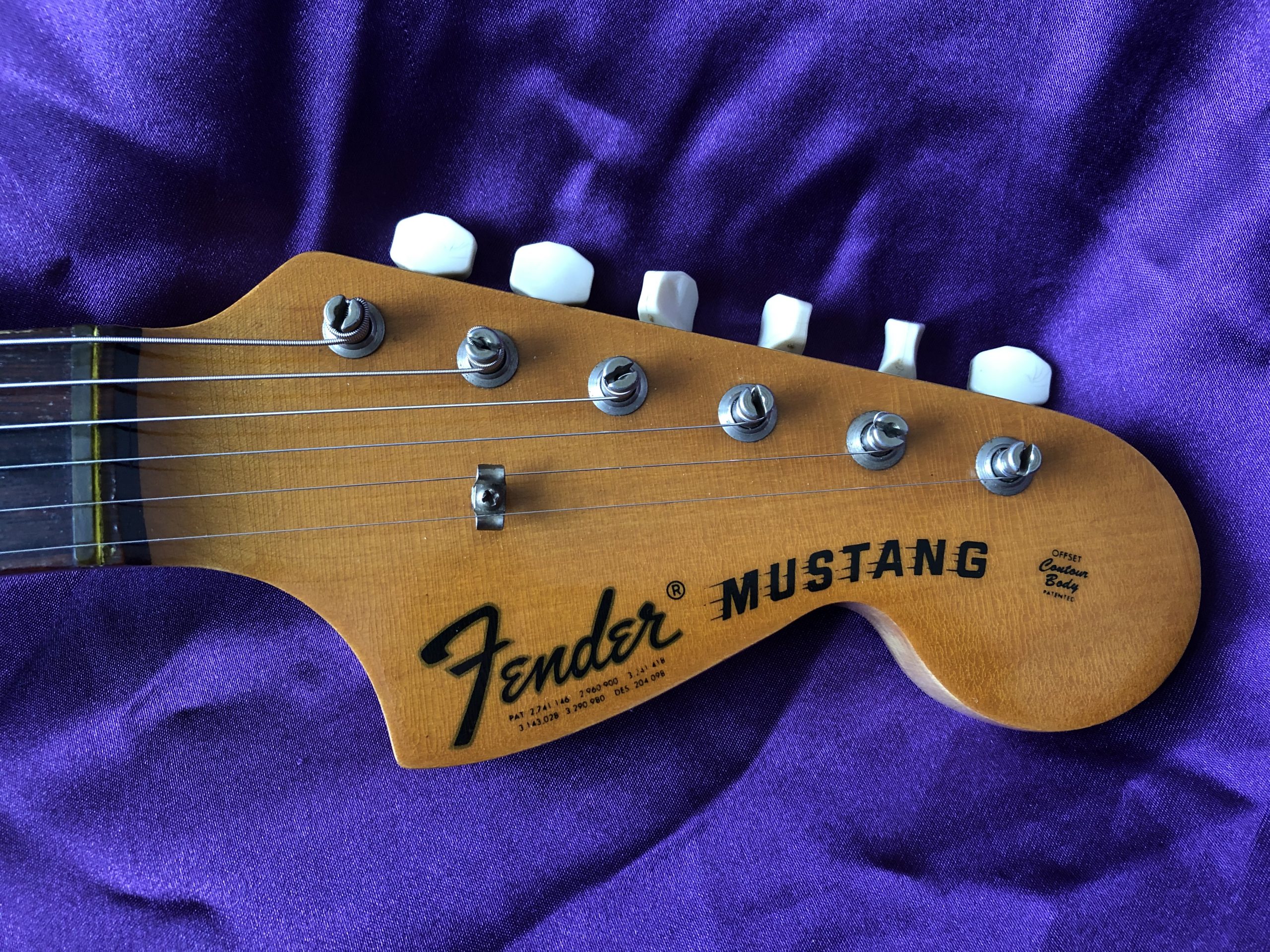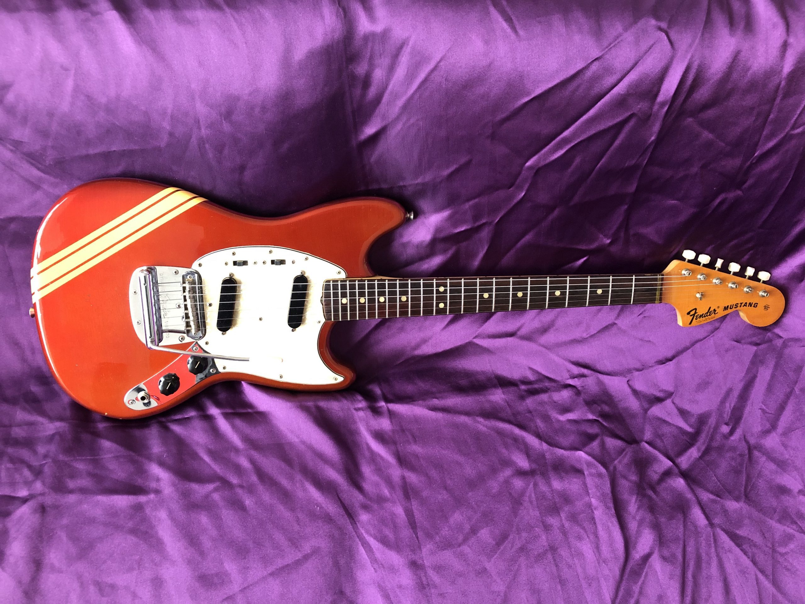 The humble Fender Mustang ‘student’ model was originally introduced in 1964 to supplement the Musicmaster and Duo‑Sonic models. After 5 years in production, it was time for a dramatic facelift. In 1969, forearm and ribcage contours are added to the body, making them more comfortable than the earlier slab bodied guitars. It was also the year that Fender introduced the snazzy new Competition Mustangs. The overall styling of the guitars was inspired by automobile culture of the late 1960s and were derived from the designs used on Ford Mustang muscle cars. Basically, the Competition Mustangs were standard guitars with a different range of colours, replacing the outgoing Red, White and Blue patriotic colours. The new image included the addition of contrasting ‘thin‑thick‑thin diagonal racing stripes on the forearm contour on the front side of the body. The stripes were only applied to the front of the body and not on the back. The Competition Mustangs came in three new colour schemes Competition Red (metallic maroon with cream stripes), Competition Burgandy (metallic blue with light blue stripes) and the short‑lived Competition Orange (with dark orange stripes). While the oddly misspelt Burgandy is an unusual name for a dark blue colour, it was apparently referenced in car advertisements during the 1960s. It is hard to be definitive but the early Competition models tended to have colour‑matched headstocks as standard, while the later ones tended to have natural headstocks. The Fender headstock logo also received an added ® to signify Fender’s Registered Trade Mark. The 22½” shorter‑scale Mustang necks were finally phased out around 1971. Around 1972, the Competition Mustangs were discontinued and finish colours were changed again, this time to more common three‑color sunburst, natural, walnut, black, white and blonde. At the same time, the pearloid scratchplates were also discontinued to be replaced with plain white. Cool and rare, the Competition Mustangs are highly fashionable and therefore increasing in collectability and value, particularly the Competition Orange model.