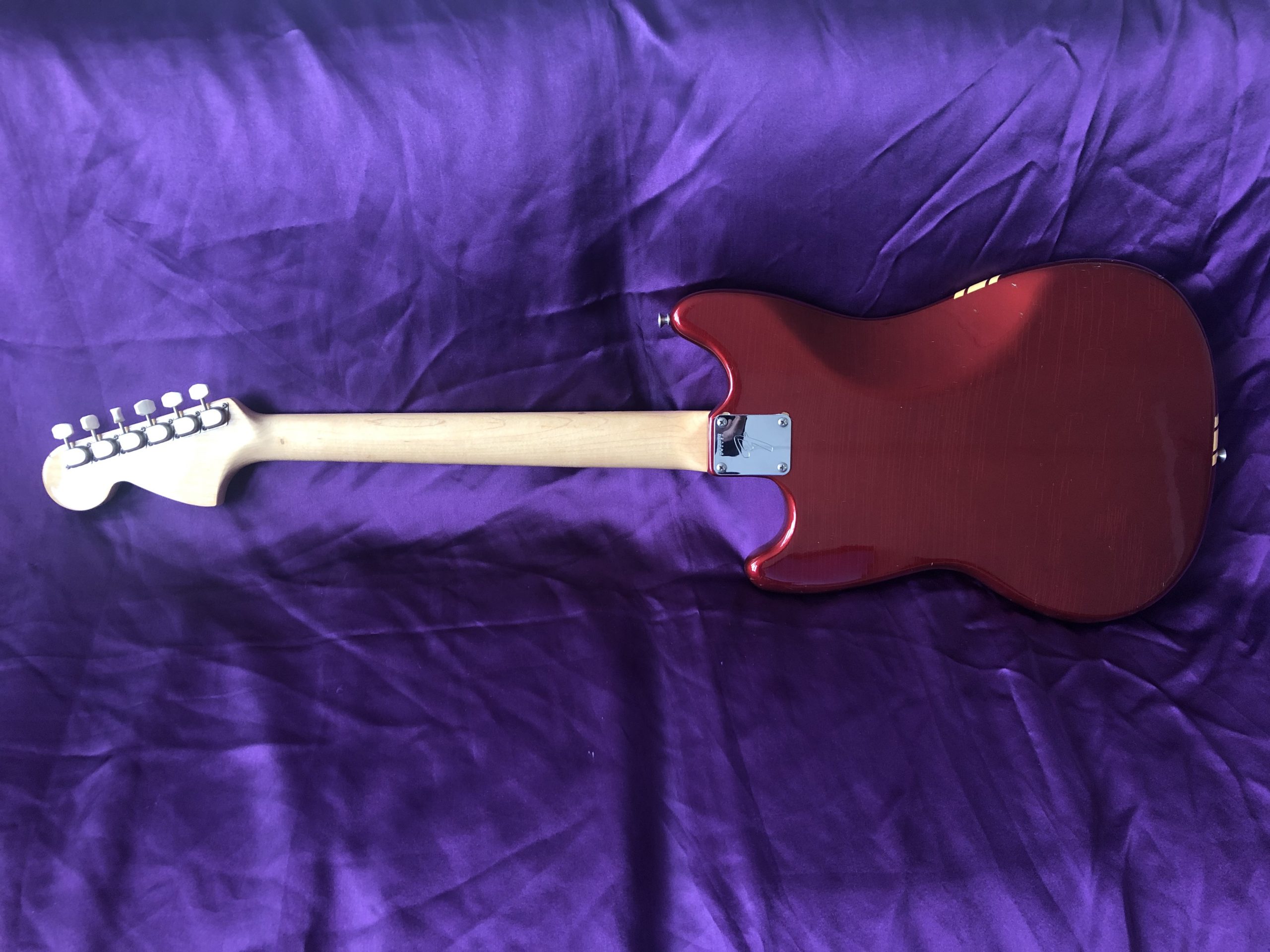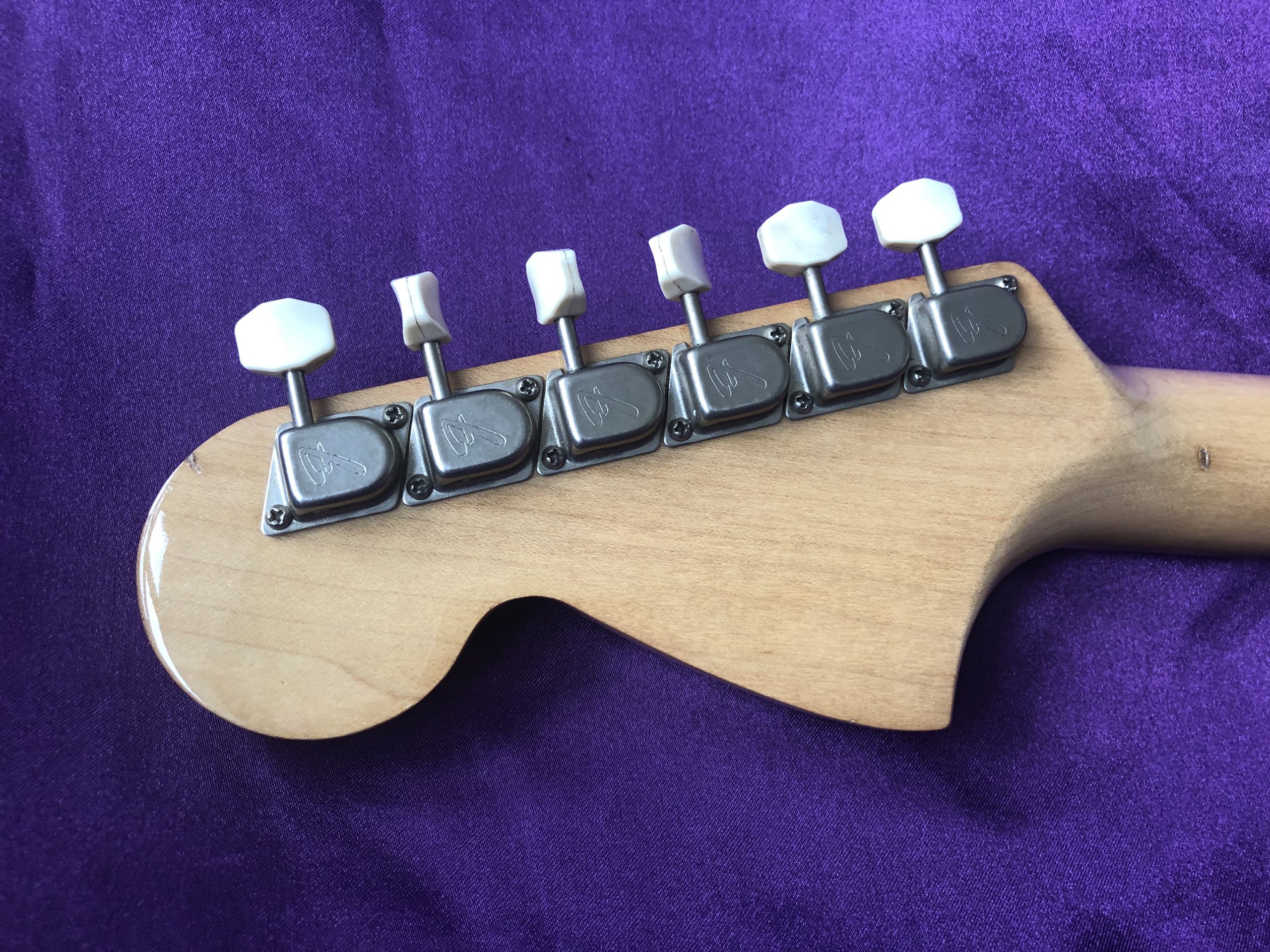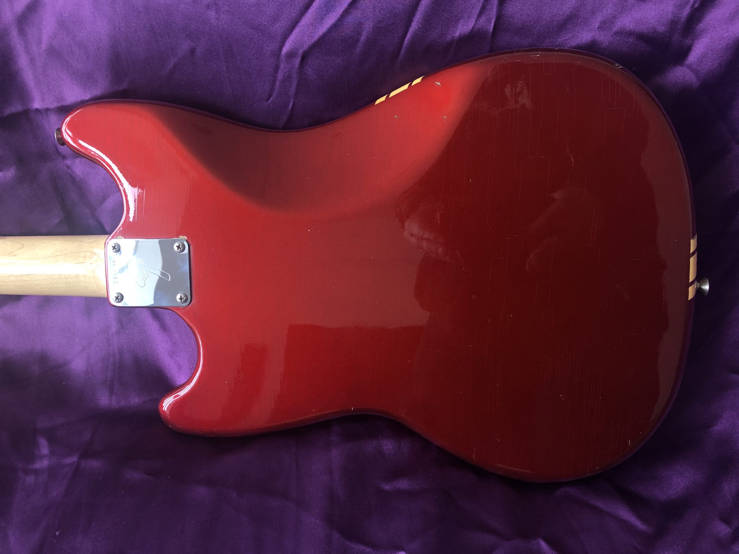 Here on the starting grid is a fantastic CBS‑era 1972 Fender Mustang in unfaded Competition Red with trendy (at the time) contrasting cream ‘competition’ stripes. Some surface crazing gives it a lovely naturally aged vintage look and the patina is the result of pure age. The nut on this example looks at first glance as though its brass but it isn’t; the plastic seems to have discoloured to an odd tobacco-stained dark brown colour – I don’t think it’s a replacement but I could be mistaken. Otherwise, it is in lovely all-original condition with no issues. The Competition Mustang was not just a case of form over function, it was a seriously well‑made instrument designed with the player in mind. The fashionable offset‑body Competition Mustang’s neat new contoured body with a ribcage cutaway on the back and a forearm chamfer on the front, endow it a very different playing feel to the earlier slab-body Mustangs. Fortunately, the Mustang’s unique single coil pickups and novel switching, along with the guitar’s distinctive Dynamic Vibrato system were retained. The distinctive sounds are pure Fender tone and the low string tension afforded by the 24” shorter scale neck makes it a doddle to play, especially if you have short fingers like I do. Despite the contours, this Competition Mustang weighs about a pound more than CRAVE Guitars’ 1966 slab body Mustang and about a pound less than my 1978 Mustang suggesting a trend of increasing weight over time. The smart combination of metallic reddish‑purple burgundy (spelled correctly), white pearloid scratchplate, black plastic, shiny chrome and those cream ‘go faster’ stripes gives the Mustang an unmistakable cool vintage vibe. Sadly, the racy image doesn’t make you play any harder or faster but it sure has some class and style. The Competition Mustangs lived their lives in the fast lane; as soon as they appeared over the horizon, they had gone again. Blink and you’ll miss them. Vrooooom. Sounds good to me.