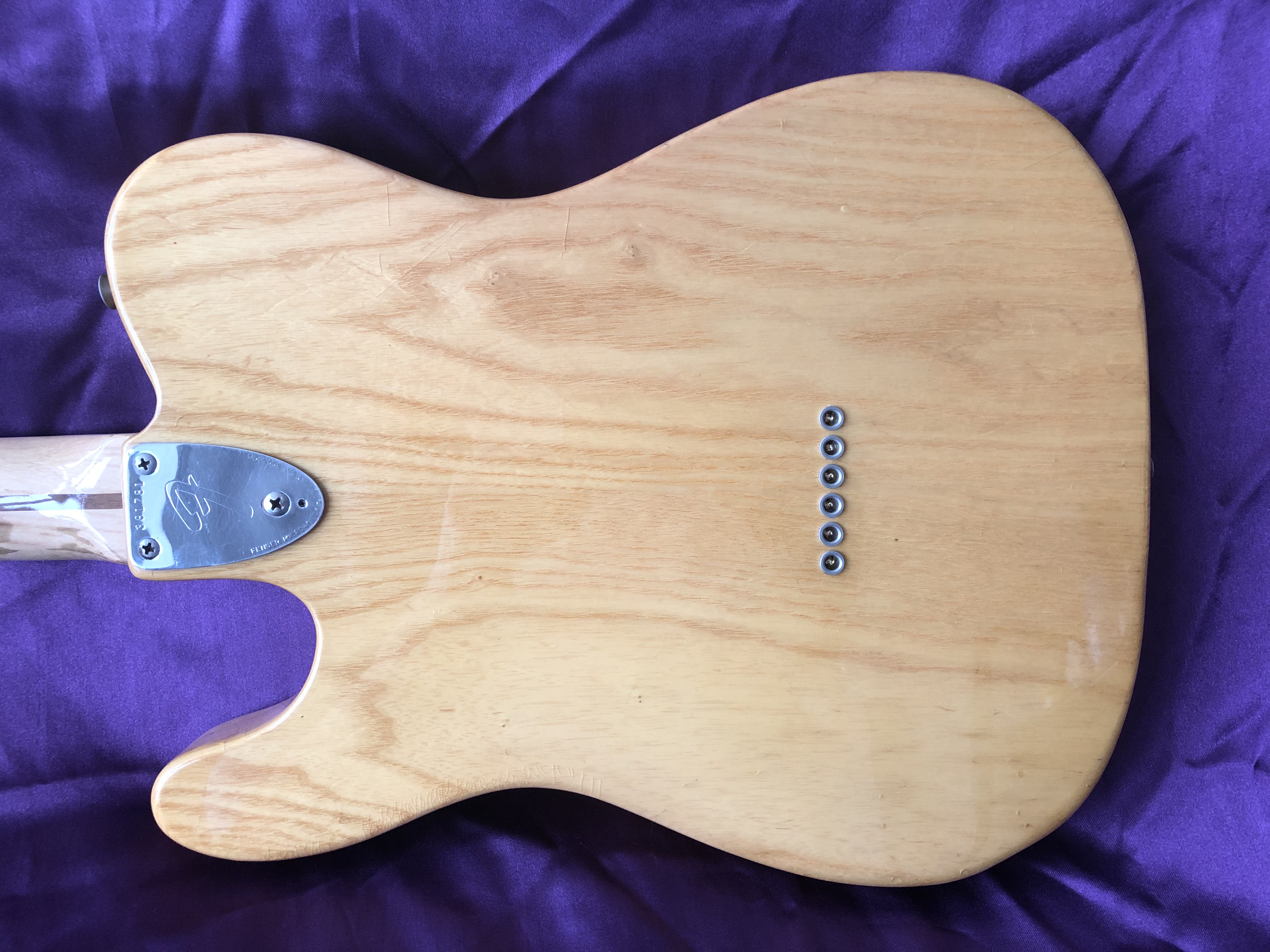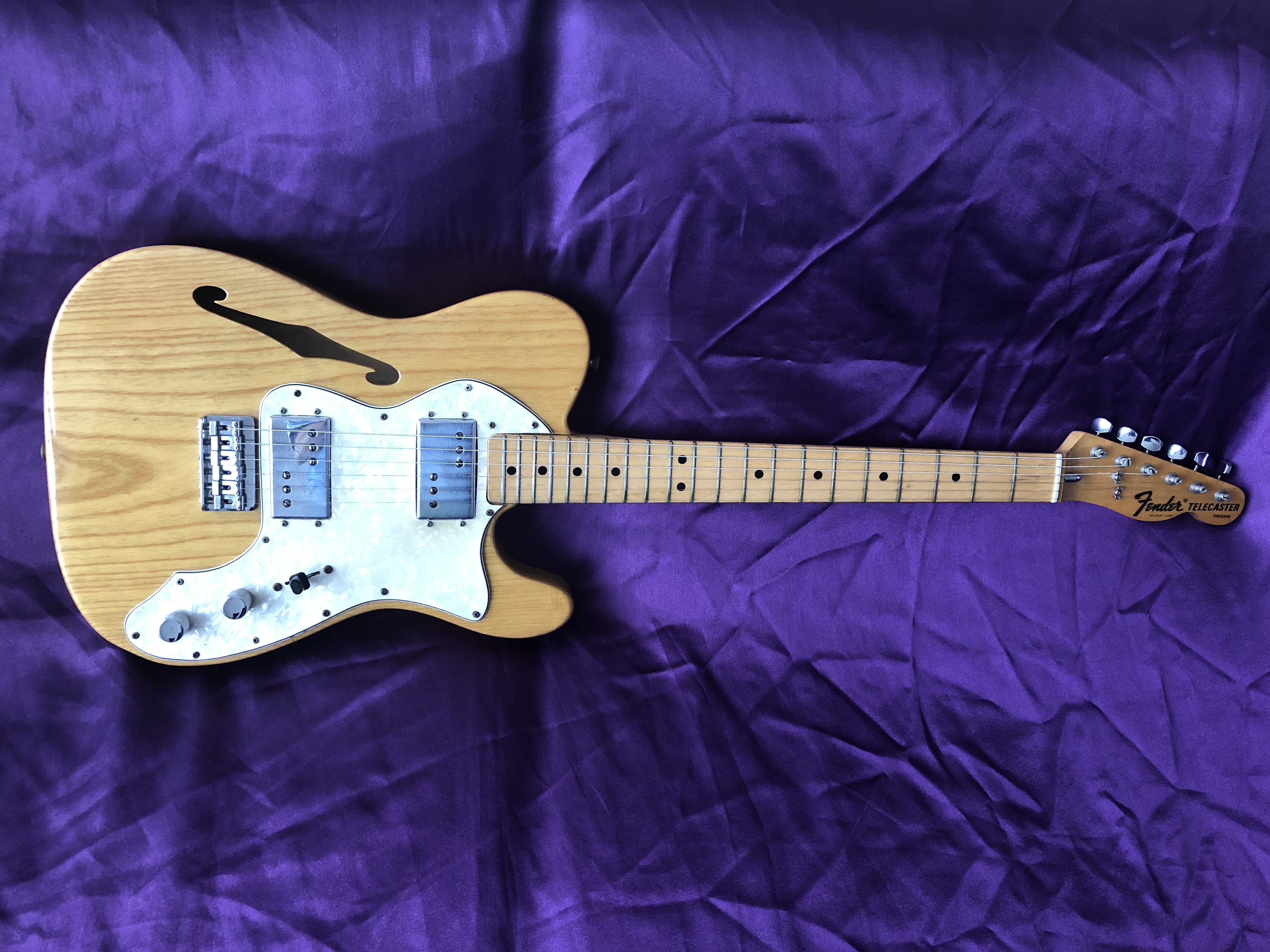 During late 1960s and the early 1970s, Fender, under the management of CBS, tried to expand the appeal of the stalwart (but perceived to be rather drab) Telecaster by introducing alternative variations based on the standard Telecaster template. Over a period of a few years, Fender introduced versions known as the Custom, Deluxe and Thinline. The first of these was perhaps the most innovative of the variants; the Fender Telecaster Thinline, designed by German luthier Roger Rossmeisl in 1968. The distinguishing feature of the Thinline from all other Telecasters is the use of a semi‑hollow chambered ash (and occasionally mahogany) body with a single unbound f‑hole, intended to reduce weight. The body was routed out from behind to produce the cavities and leaving a solid centre block for the pickups and bridge. A thin back was then glued on to cover the chambers. Earlier ‘type 1’ Thinlines (1968‑1971) used the normal twin Telecaster single coil pickups and bridge. The later ‘type 2’ Thinlines (1972‑1980) uses two Seth Lover‑designed ‘wide range’ humbucking pickups, a larger scratchplate and a Stratocaster bridge, while retaining the Telecaster’s through‑body stringing. The Thinline’s necks were standard Telecaster maple bolt‑on necks, albeit with a 3‑bolt neck plate and ‘bullet’ truss rod adjuster. The Seth Lover ‘wide range’ pickups are instantly recognisable and notable for using copper, nickel and iron (CuNiFe) as part of their construction and had offset pole pieces under Fender engraved covers. Modern reissues of Seth Lover’s pickup design are not built in the same way. Early ‘type 2’ Thinlines had a fancy pearloid scratchplate while later ones had a plain white one. Unlike its other more adventurous cousins, the Thinline keeps the simple Tele like control layout. The short‑lived ‘type 1’ Fender Thinlines, particularly with mahogany bodies, are already highly collectable and the ‘type 2’ are also now becoming highly sought after on the vintage market. Fender has sensibly reissued the Thinline several times from budget Squier models through to Custom Shop specials.