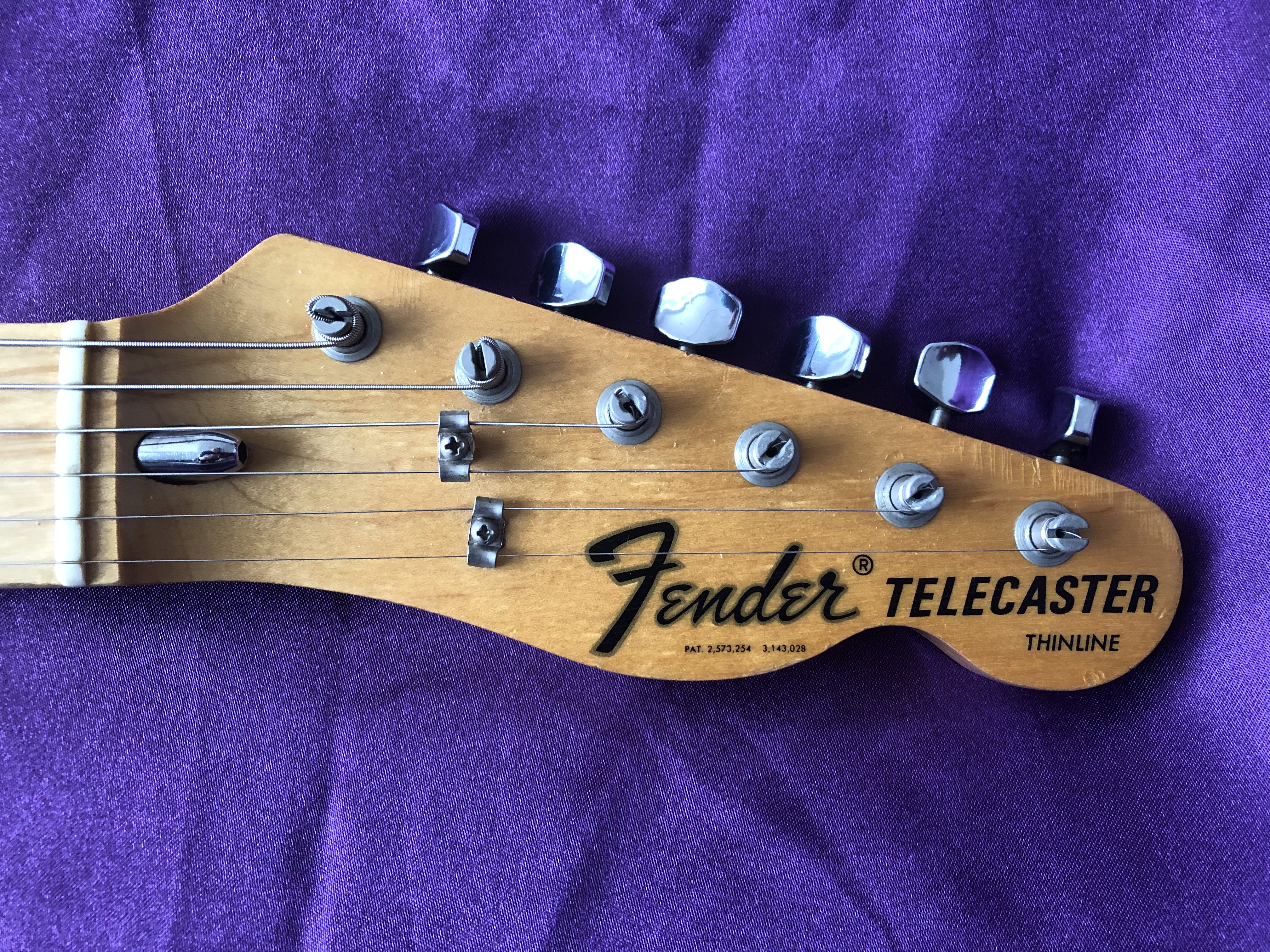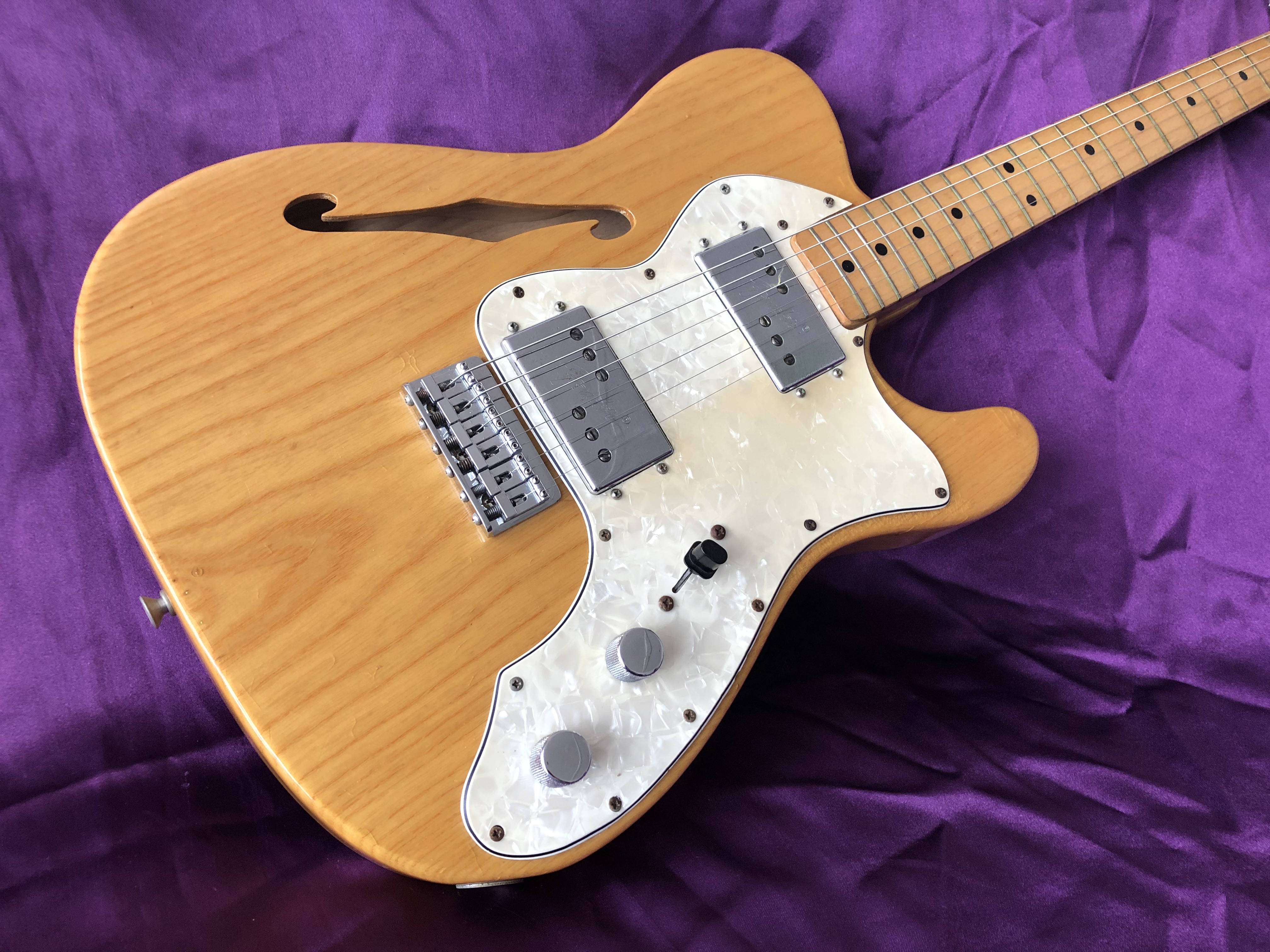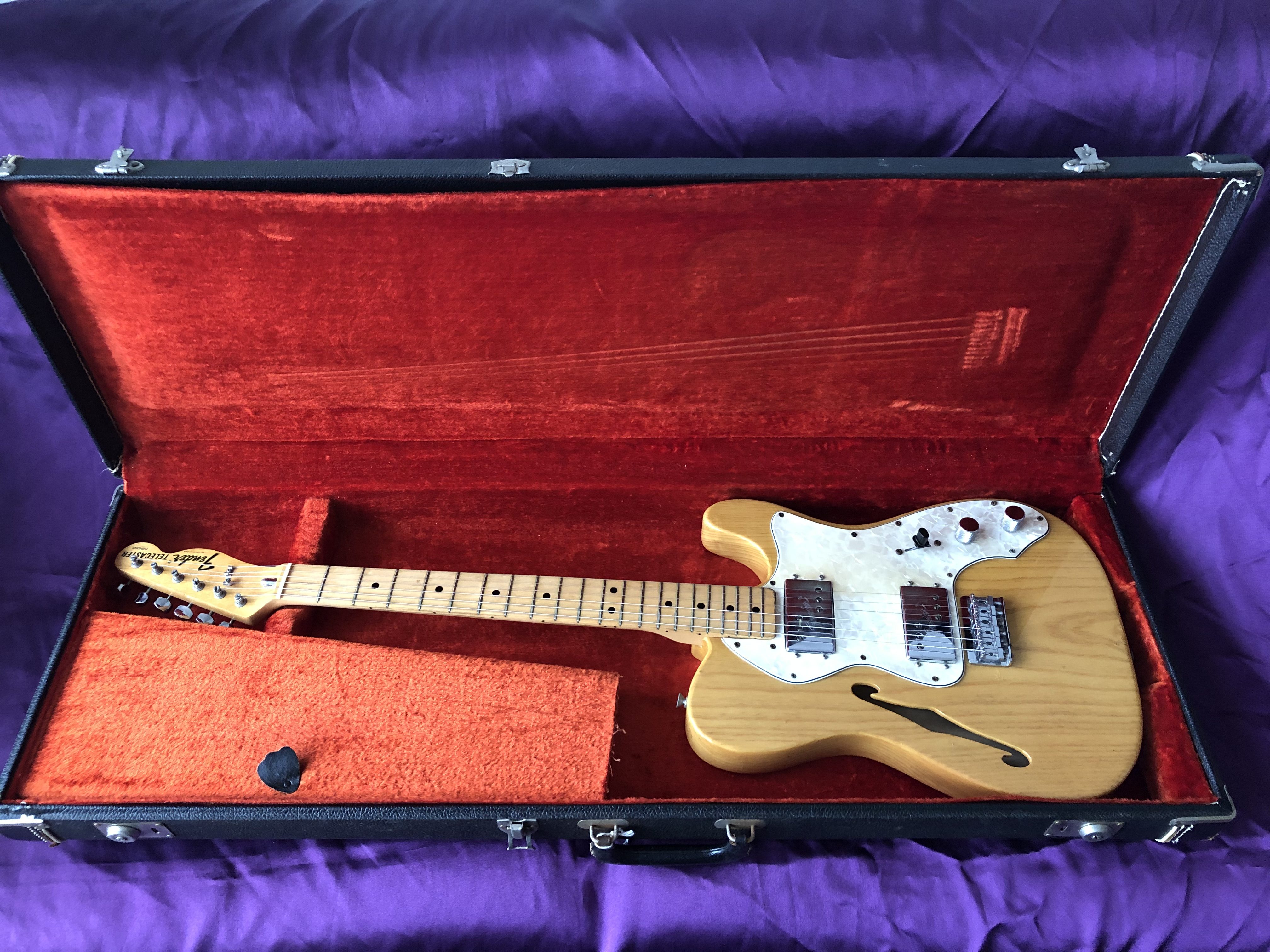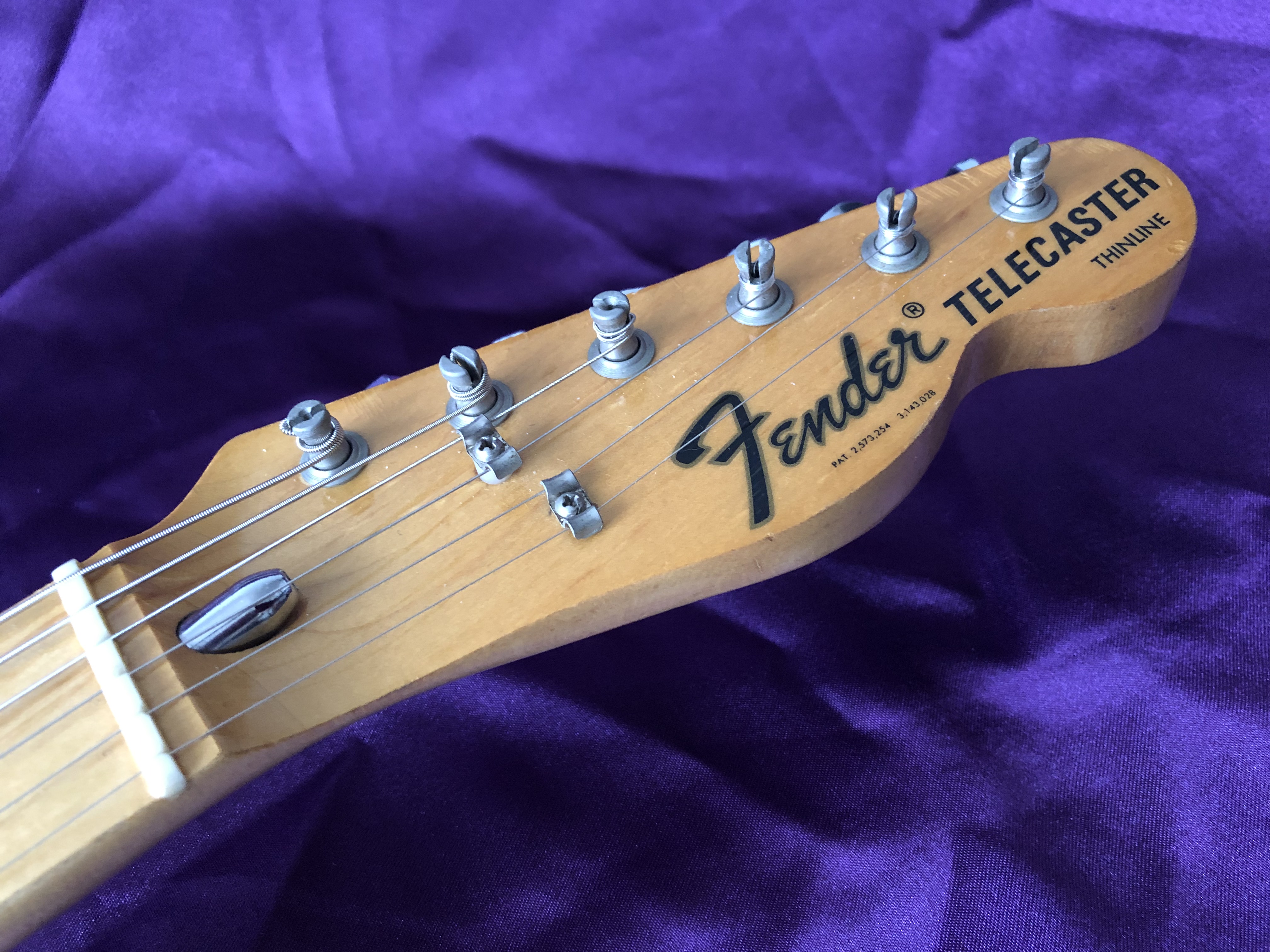 Here we have a beautiful example of a very desirable first‑year ‘type 2’ 1972 Fender Telecaster Thinline. She is in very good all‑original condition (bar one pot) with some minor wear on the back of the neck and the scratchplate is slightly warped – both very common characteristics. This particular example is probably the classic Telecaster Thinline aesthetic that most people might recognise. The finish is clear polyester natural over an ash chambered body with the pearloid scratchplate and a pair of outstanding Seth Lover ‘wide range’ pickups. The Thinline is probably my favourite variant on the Tele theme, as well as being one of the prettiest guitars of its type. The classic maple neck, chrome hardware, semi‑hollow body, single f‑hole and the attractive scratchplate looks just right. The combination of Telecaster functionality and those fantastic and powerful humbuckers make the ‘type 2’ Thinline not only a hugely flexible guitar but also a unique and ultra-cool version of a classic Fender design. The sound is predictably unlike a standard Telecaster but it retains the Tele’s unique ability to adapt to just about any style of music from rock, blues, country, indie, reggae, etc. and being effortless to play. The Thinline is a truly remarkable instrument. Classic, attractive and versatile what more could you really ask for? Many naysayers of the CBS‑era Fenders clearly don’t know what they are missing. The perfect guitar? Not quite – such a thing doesn’t exist – but it possibly comes darned close.
