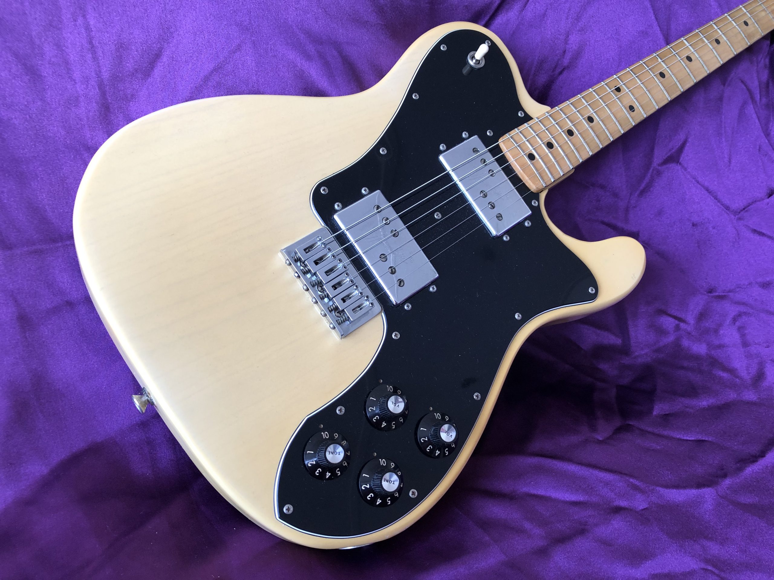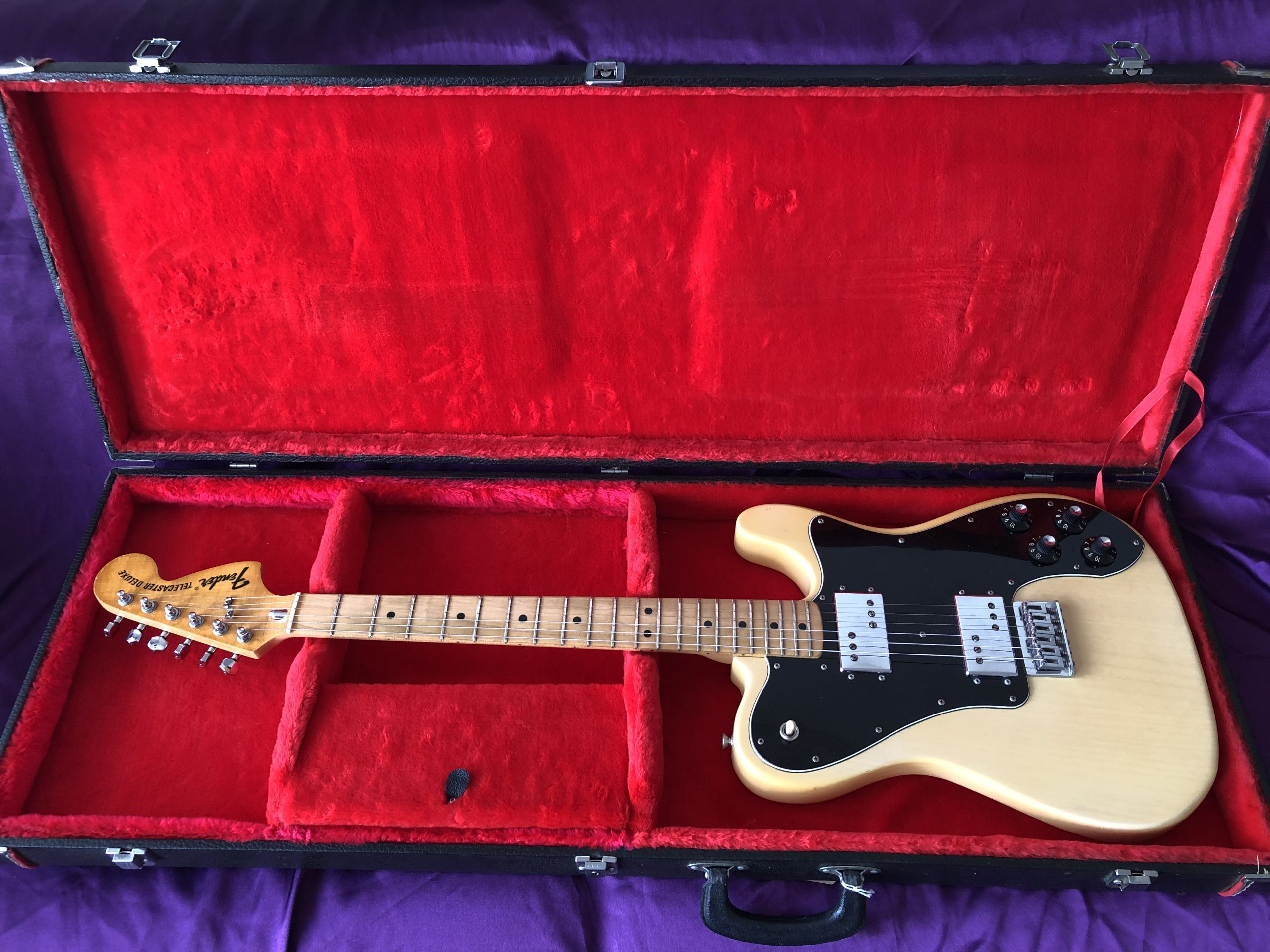 The Telecaster Deluxe is essentially a hybrid guitar, introduced by Fender in January 1973 and discontinued 8 years later in 1981. Although it is clearly derived from the familiar Telecaster, the body shape is just about the only part of the ‘standard’ Telecaster template to make the transition to the Deluxe. The list of dissimilarities between the Deluxe and the standard Telecaster is long. For instance, the Deluxe is unusual for having the typical Stratocaster-like neck with typical (and infamous) CBS‑era features including its distinctive large headstock, ‘bullet’ truss rod and 3‑bolt neck plate. The Deluxe also adopts the Stratocaster’s ‘hardtail’ bridge with through‑body stringing. It also has a very un‑Telecaster‑like rib cage contour on the back of the body but no forearm contour to go with it. Like the ‘type 2’ Telecaster Thinline, the Deluxe uses two Seth Lover ‘wide range’ humbucking pickups rather than the standard pair of Telecaster single coil pickups. Like the Telecaster Custom, it has the Gibson Les Paul‑like control layout on a large scratchplate. Despite its apparent mix‑and‑match construction, the Telecaster Deluxe is a clever, well thought‑through instrument and a hugely versatile guitar with a different feel and sound to a standard Telecaster (or anything else for that matter!). Fender has reissued the Deluxe on several occasions from 2004 onwards, appealing to a whole new generation of guitarists. The Telecaster Deluxe is a fascinating, cool and rare ‘variation‑on‑a‑theme’ that will undoubtedly become a classic collectable. Like the Telecaster Custom, the Deluxe has slightly lower vintage market values than a standard format Telecaster of the same year, despite its rarity.