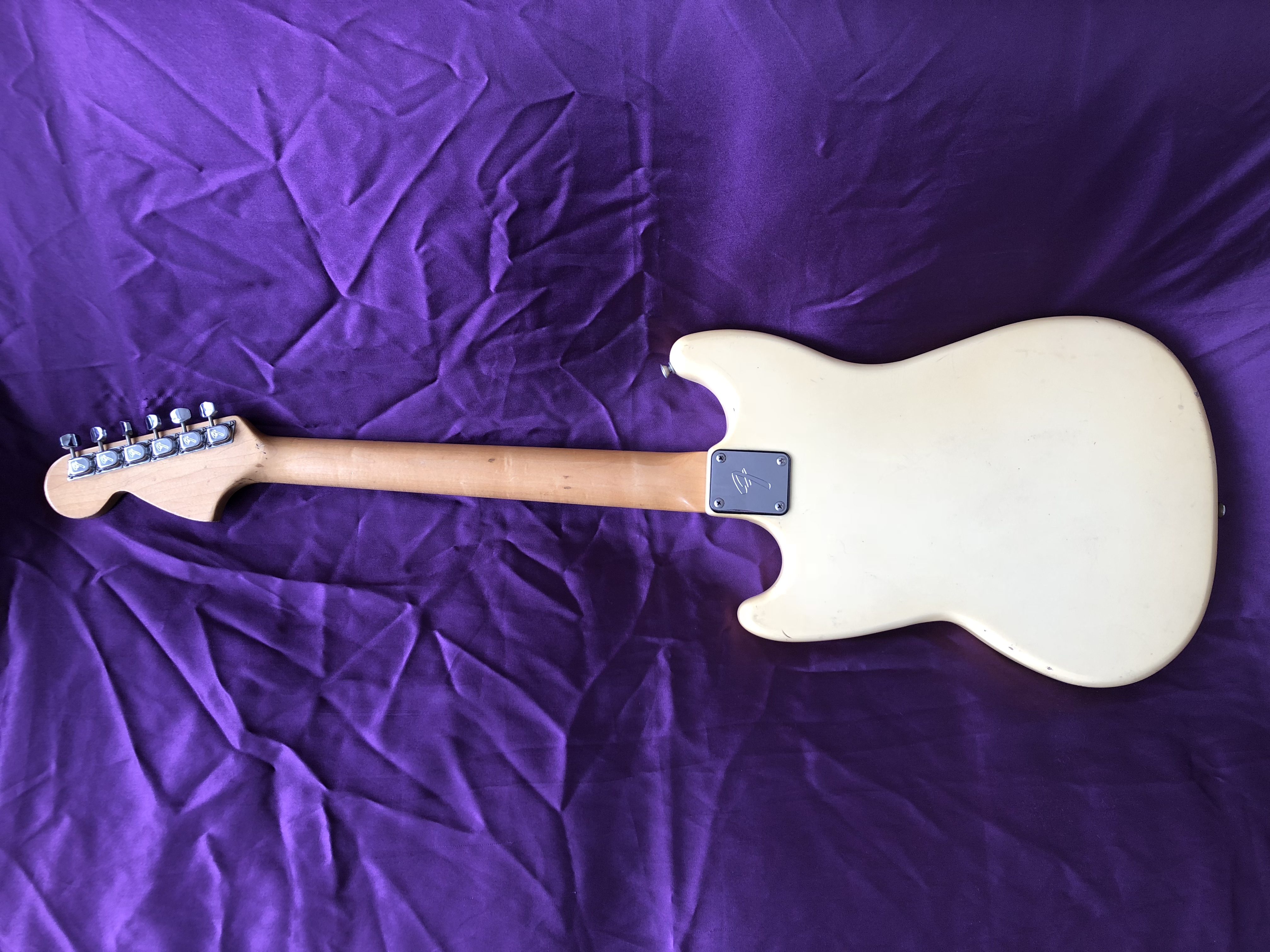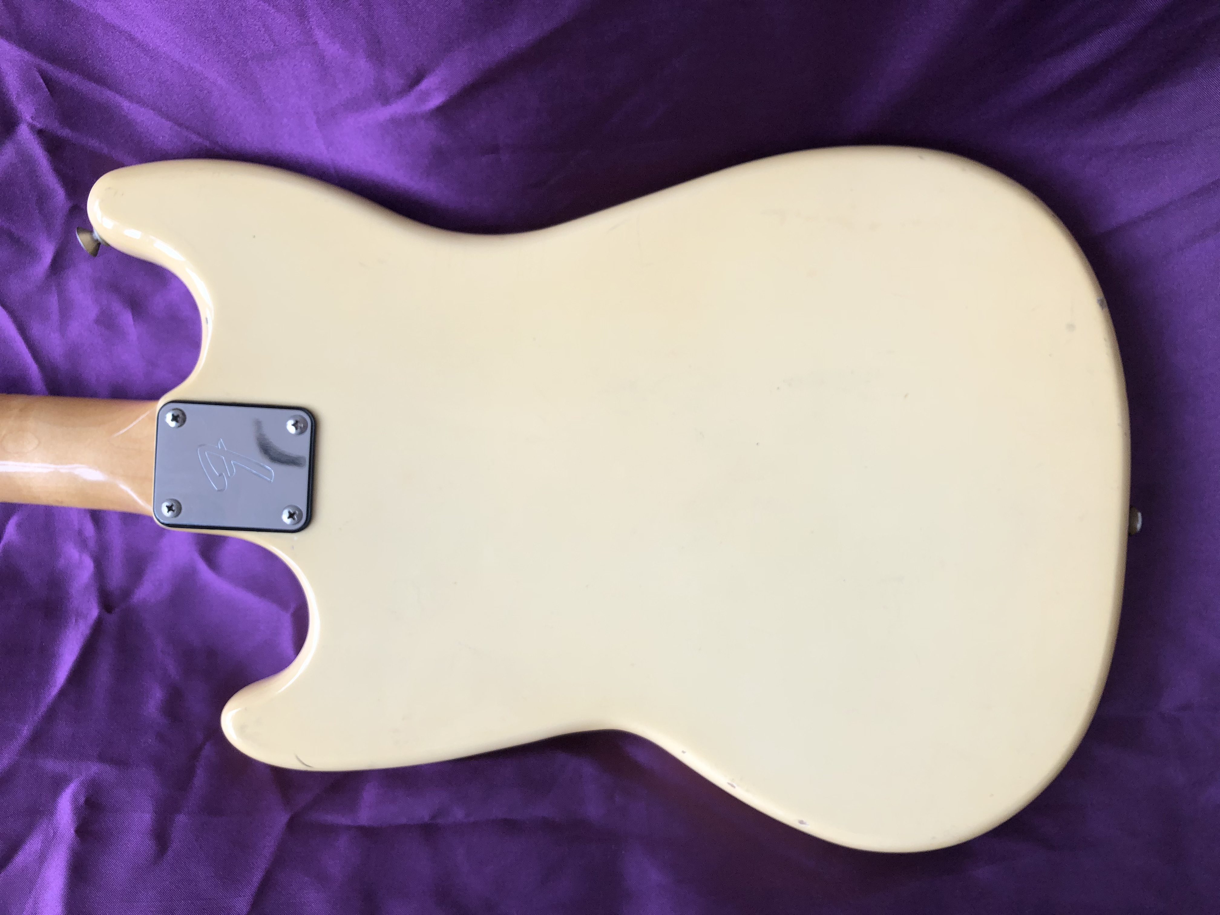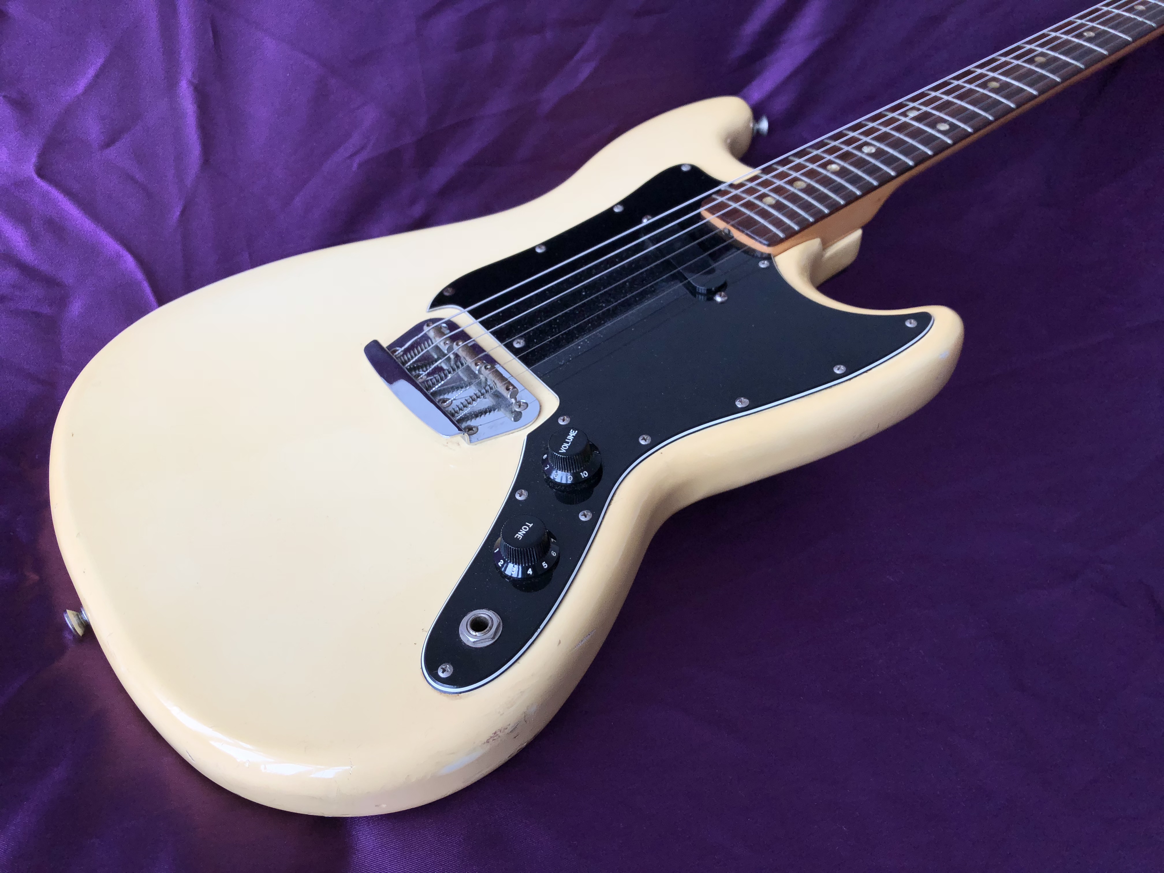 Acquisition of this white(‑ish) 1978 Fender Musicmaster was one of those opportunities to fill a gap in the ‘collection’. CRAVE Guitars already has two Musicmasters, one from the 1950s and one from the 1960s, so it was a chance to pick one from near the end of its original production period in the 1970s and to compare it with ones from previous decades. By 1978, the Musicmaster was a bit of a ‘plain Jane’ and one of the period’s so‑called ‘forgotten Fenders’, often overshadowed by its more ‘flashy’ siblings. This Musicmaster retains the light weight and 24” scale on a chunky neck, which makes for a lively, resonant guitar that, when combined with that funky single coil neck pickup makes for one of those addictive instruments that is easy to pick up and hard to put down. Such is the ‘student’ simplicity of the breed, just one pickup, no (dodgy) slide switches, one volume and one tone control, and a fixed bridge. That’s it; there is nothing to get in the way of making pure, sweet music. Form follows function as they say. Just plug it straight into a vintage valve amp and away you go, pure straightforward vintage tone. I adore the unpretentious approach to both the aesthetic and the sound. This example is in great condition for its age, all‑original, with enough nicks, dents and scratches to show that it’s been used to make some music along the way without it being spoiled or modified. No fake relic work here, just genuine, honest play wear. The finish on this example is sound and not affected by the issues experienced by Fender in the late 1970s, although it has faded to a lovely warm cream and a dull‑ish patina, ideally counterpointing the stark black plastic. It is still beyond me why these fantastic little offset Fenders don’t have a more credible reputation. Forget all the well‑worn waffle about woeful quality and one‑trick‑ponies and try one for yourself. The advantage of being overlooked is that there are still some bargains out there to be had if look hard enough and wait long enough… but for how long? P.S. Insider tip; the same goes for vintage Musicmaster basses and amps as well but shush, don’t tell anyone.