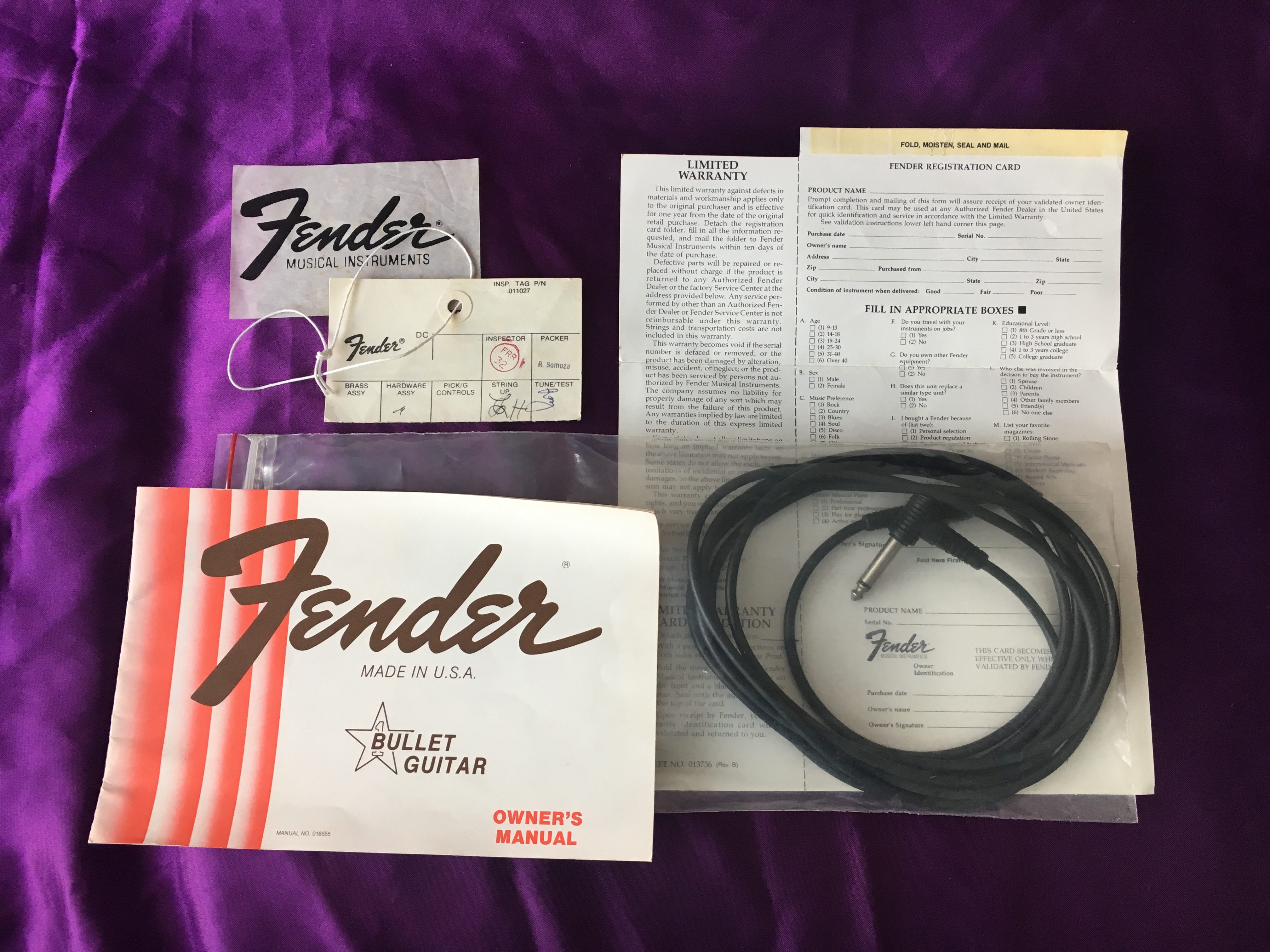 Well… what do we have here? It’s a very cool single cutaway series 1 1981 Fender Bullet in gorgeously vibrant red and white (and black). CRAVE Guitars is keen on Fender’s budget ‘student’ models and wanted to explore whether the Bullet is a credible low‑cost vintage guitar. I am not alone in thinking that there is merit here; Bullets have a very strong following, even including an owners’ club dedicated to the model. The necks in particular are well-regarded – this one is quite chunky with some lovely subtle flame maple, a lovely dark, relatively flat rosewood fingerboard and 25½” scale that feels very modern. I am not fazed by the innovative construction techniques used. In fact, it is because of its idiosyncrasies that the Bullet sounds unique, and is therefore all the more interesting. Some commentators disregard the Bullet as a crude anomaly of a troubled and desperate corporation but I take no heed of such cynicism and I suggest that the guitar speaks for itself. This example is in exceptional unmolested, all‑original condition complete with its paperwork and dedicated case (specially designed for the model). Despite the heavy Telecaster influence, the tones on offer are distinctly un‑Tele like and much more akin to the Mustang. The pickups are quite low‑powered, so it is not a high‑gain axe for metal heads; it is probably better suited to jangly, clean indie, funk or country styles. Currently, American Bullets are relatively numerous and largely overlooked, so they represent a relatively risk-free and good-value entry to vintage guitars. Despite the inconclusive debates over origin, I reckon that the early ‘Made in U.S.A.’ Fender Bullet is on the verge of becoming trendy and collectable. Why not ‘lock ‘n’ load’ and take a shot (sic!)?