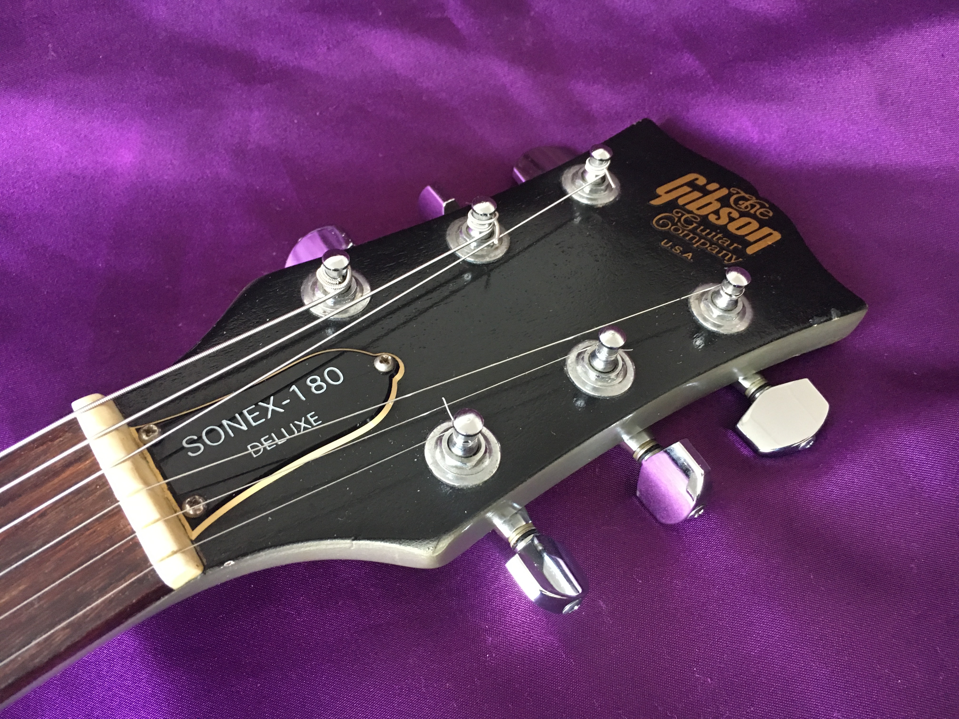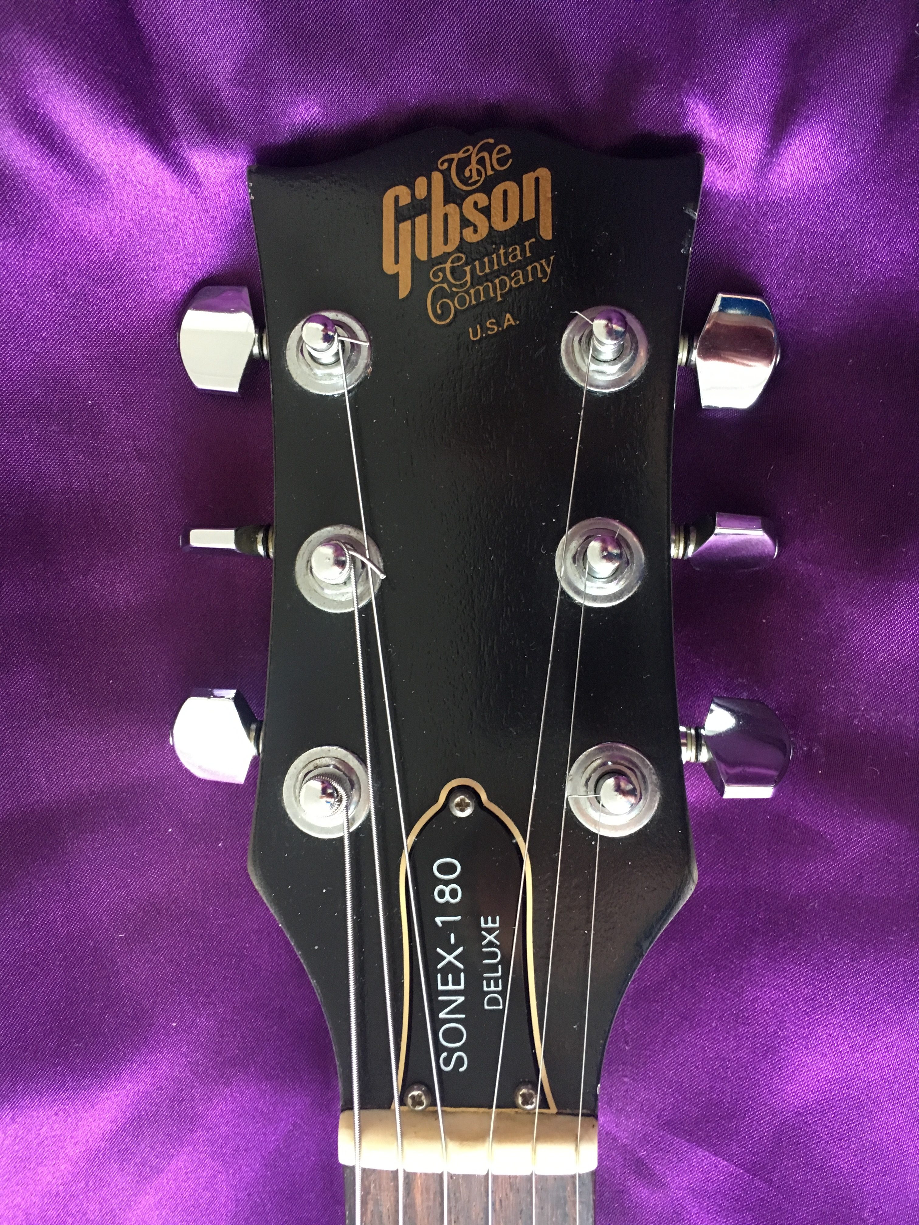 The Sonex‑180’s headstock logo varied over the 4 years it was in production, including the normal Gibson logo, ‘The Gibson Guitar Company U.S.A.’ design (as here), and even ‘Sonex by Gibson’. The variant logo(s) not only differentiated the model from other Gibson lines, it was apparently also used by the company to circumvent their existing high‑end dealerships so that they could distribute the budget Sonex‑180 through a broader distribution network.