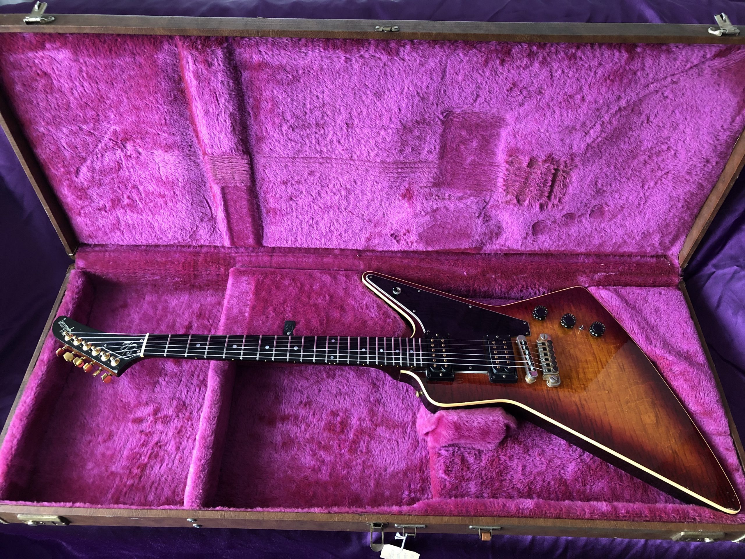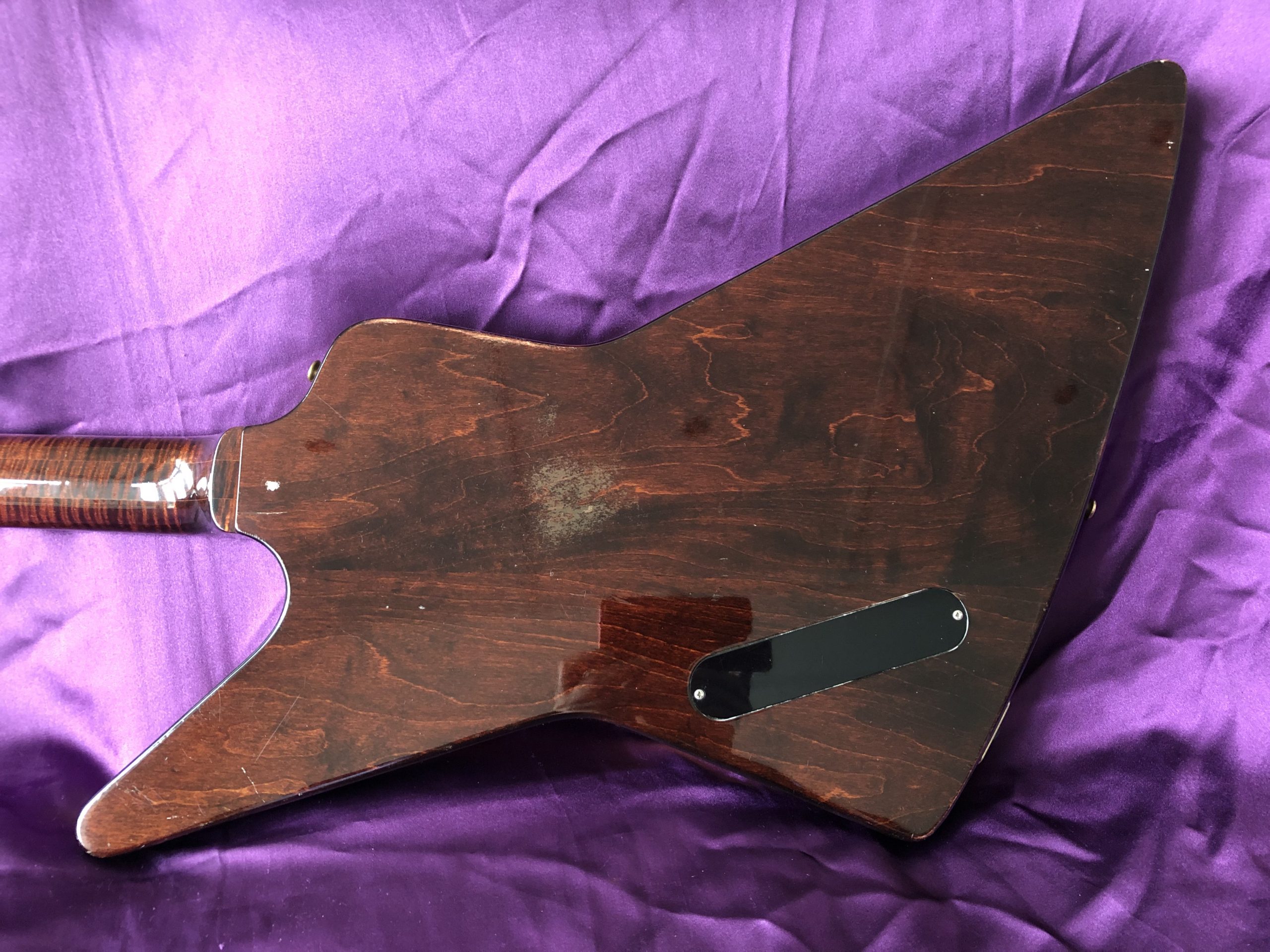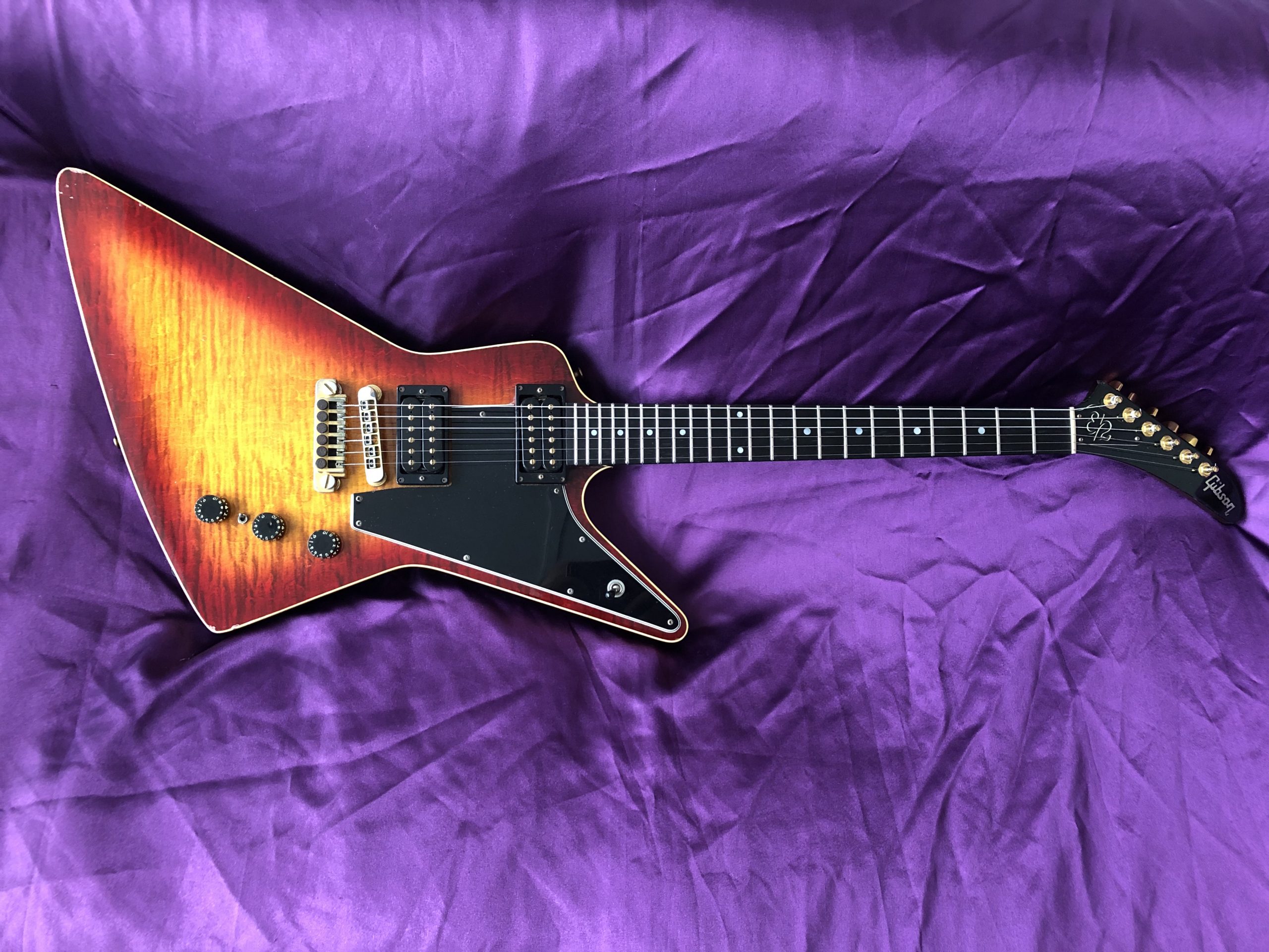 This stunning 1982 Gibson Explorer CMT is NOT a lightweight for lightweights. This is a real, muscular HEAVY ROCK guitar – one for strong people with spines of steel out there, playing music to match. The spectacular, cool and rare CMT model was only made between 1981 and 1984 and this is a beauty. The very attractive body was constructed of layers of solid, weighty maple and walnut, with its very striking bound single piece flame maple top and unbound flame maple/walnut neck with its ebony fingerboard. In my view, the dark cherry sunburst is much prettier than the dowdy tobacco sunburst or the insipid natural finish. The authentic aging nitrocellulose lacquer has a fine patina that offsets the gold bling nicely. The CMT retains the traditional Explorer scratchplate with the pickup selector switch on the upper treble bout and the three control knobs in a line. The Gibson ‘Dirty Fingers’ pickups are a favourite of mine and live up to their reputation combining beefy strength with finesse and subtlety – truly an exceptional pickup (unlike the reissues). The gold hardware, unusual bridge and original fine‑tuning TP‑6 tailpiece complete the picture. Despite what it says on the truss rod cover, this Explorer CMT model should not be confused with the earlier distinctive layered and contoured walnut/maple E2 model (1979‑1982), which is actually similar in style to the unique Gibson Flying V2. An active treble boost circuit had been added with a small toggle switch between the volume and tone knobs (now removed). This particular Explorer has undocumented provenance with the previous owner claiming that it was owned by the guitarist from English alternative rock band Hundred Reasons, citing a number of appearances on MTV videos. While the location and timing are about right, I cannot confirm this, so it is best regarded only as an anecdote. Heavy (in more ways than one) if your back can take it.