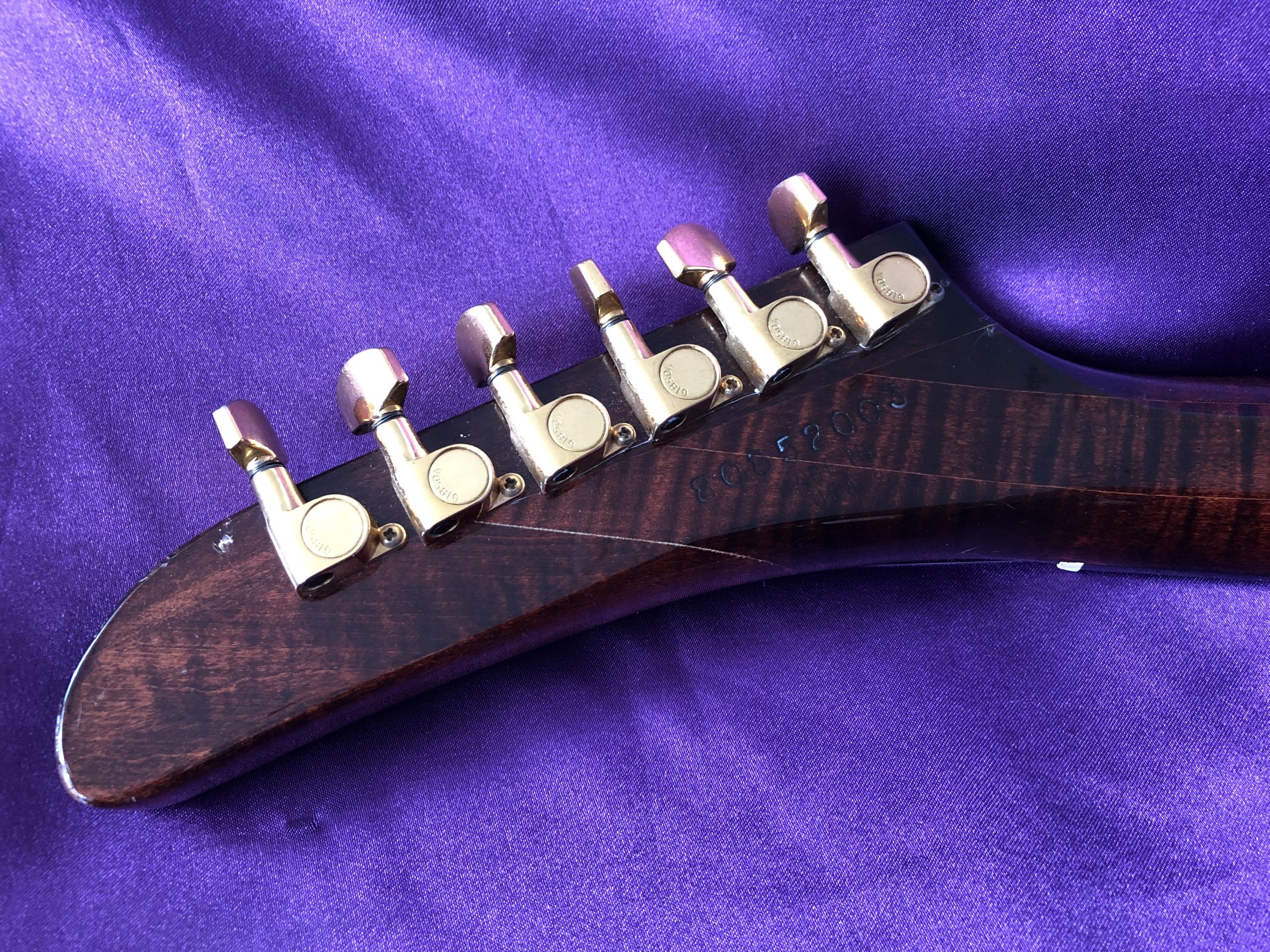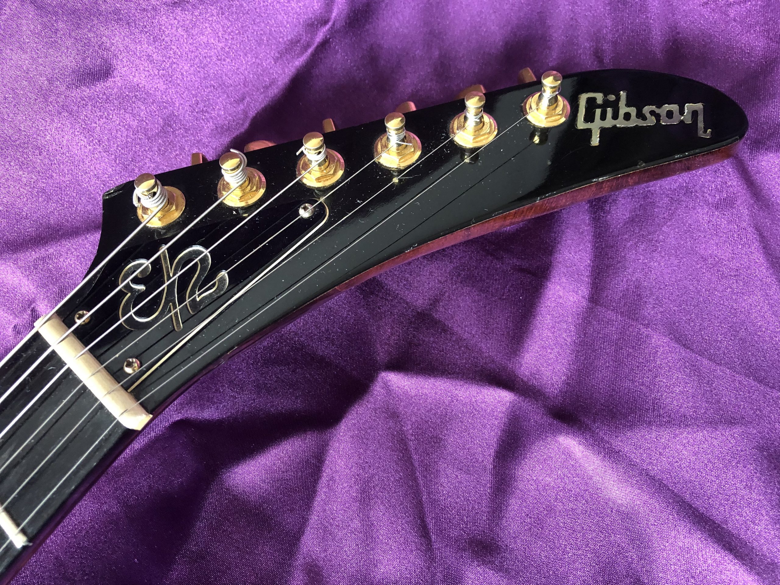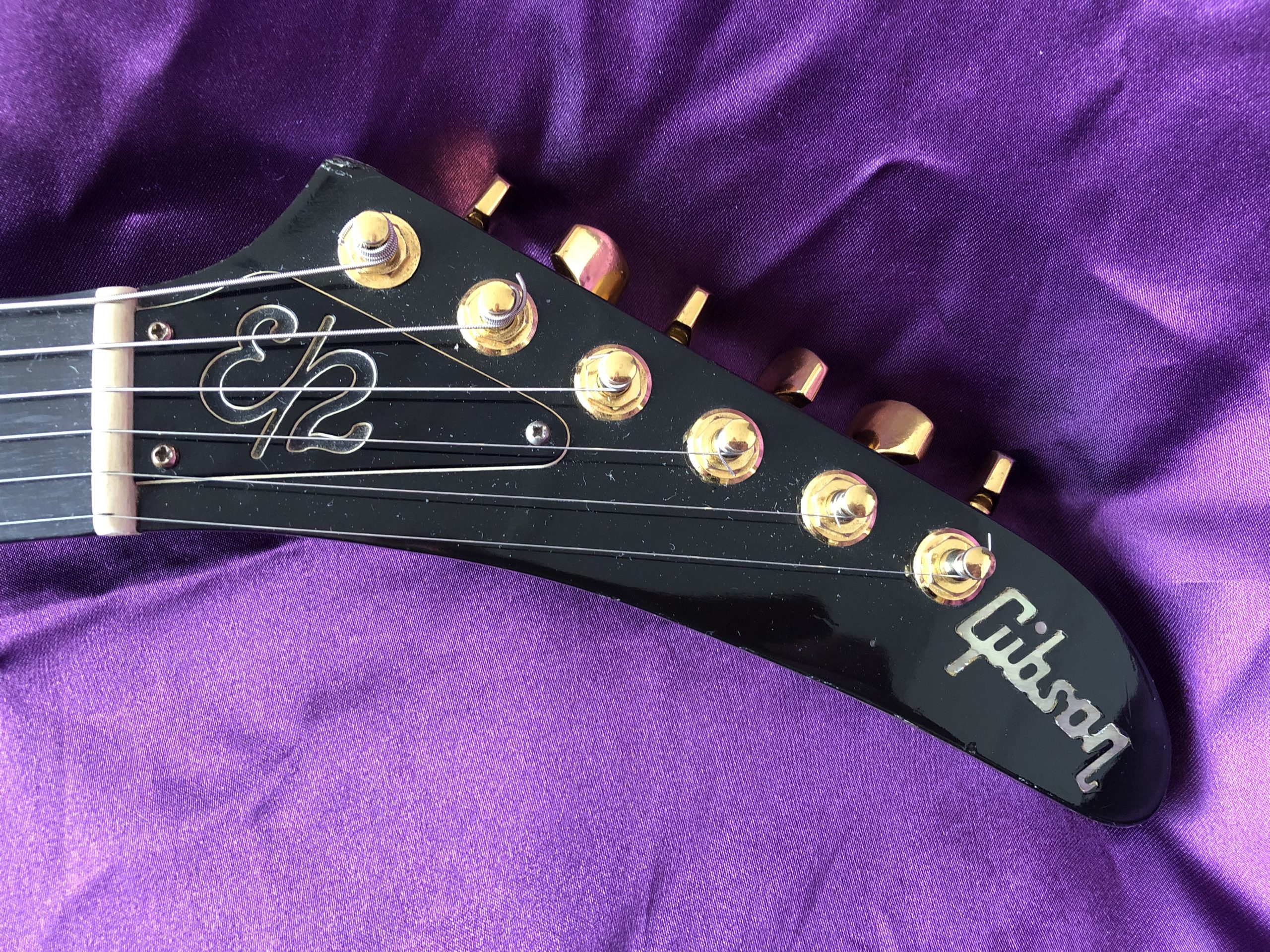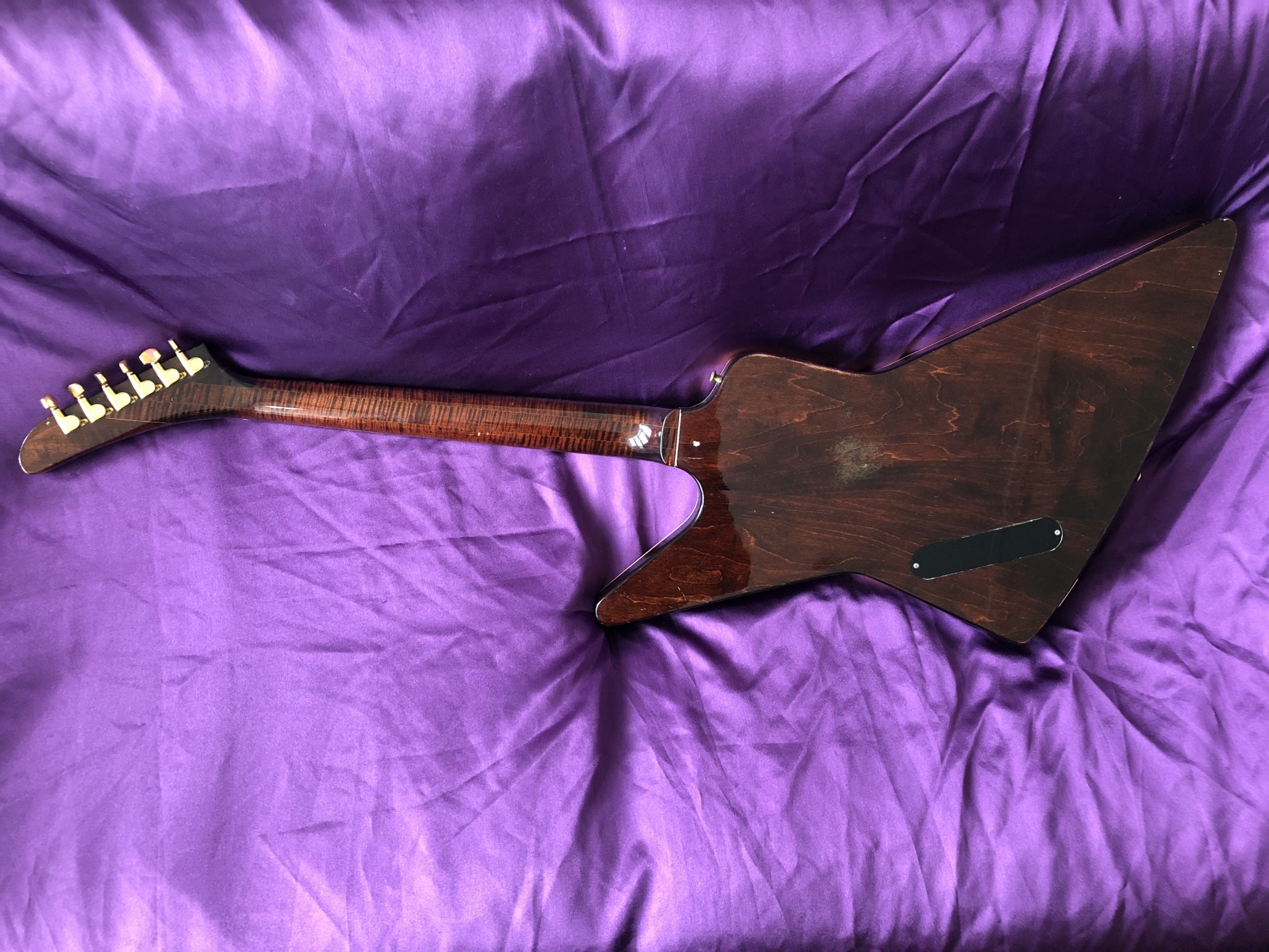 This stunning 1982 Gibson Explorer CMT is NOT a lightweight for lightweights. This is a real, muscular HEAVY ROCK guitar – one for strong people with spines of steel out there, playing music to match. The spectacular, cool and rare CMT model was only made between 1981 and 1984 and this is a beauty. The very attractive body was constructed of layers of solid, weighty maple and walnut, with its very striking bound single piece flame maple top and unbound flame maple/walnut neck with its ebony fingerboard. In my view, the dark cherry sunburst is much prettier than the dowdy tobacco sunburst or the insipid natural finish. The authentic aging nitrocellulose lacquer has a fine patina that offsets the gold bling nicely. The CMT retains the traditional Explorer scratchplate with the pickup selector switch on the upper treble bout and the three control knobs in a line. The Gibson ‘Dirty Fingers’ pickups are a favourite of mine and live up to their reputation combining beefy strength with finesse and subtlety – truly an exceptional pickup (unlike the reissues). The gold hardware, unusual bridge and original fine‑tuning TP‑6 tailpiece complete the picture. Despite what it says on the truss rod cover, this Explorer CMT model should not be confused with the earlier distinctive layered and contoured walnut/maple E2 model (1979‑1982), which is actually similar in style to the unique Gibson Flying V2. An active treble boost circuit had been added with a small toggle switch between the volume and tone knobs (now removed). This particular Explorer has undocumented provenance with the previous owner claiming that it was owned by the guitarist from English alternative rock band Hundred Reasons, citing a number of appearances on MTV videos. While the location and timing are about right, I cannot confirm this, so it is best regarded only as an anecdote. Heavy (in more ways than one) if your back can take it.