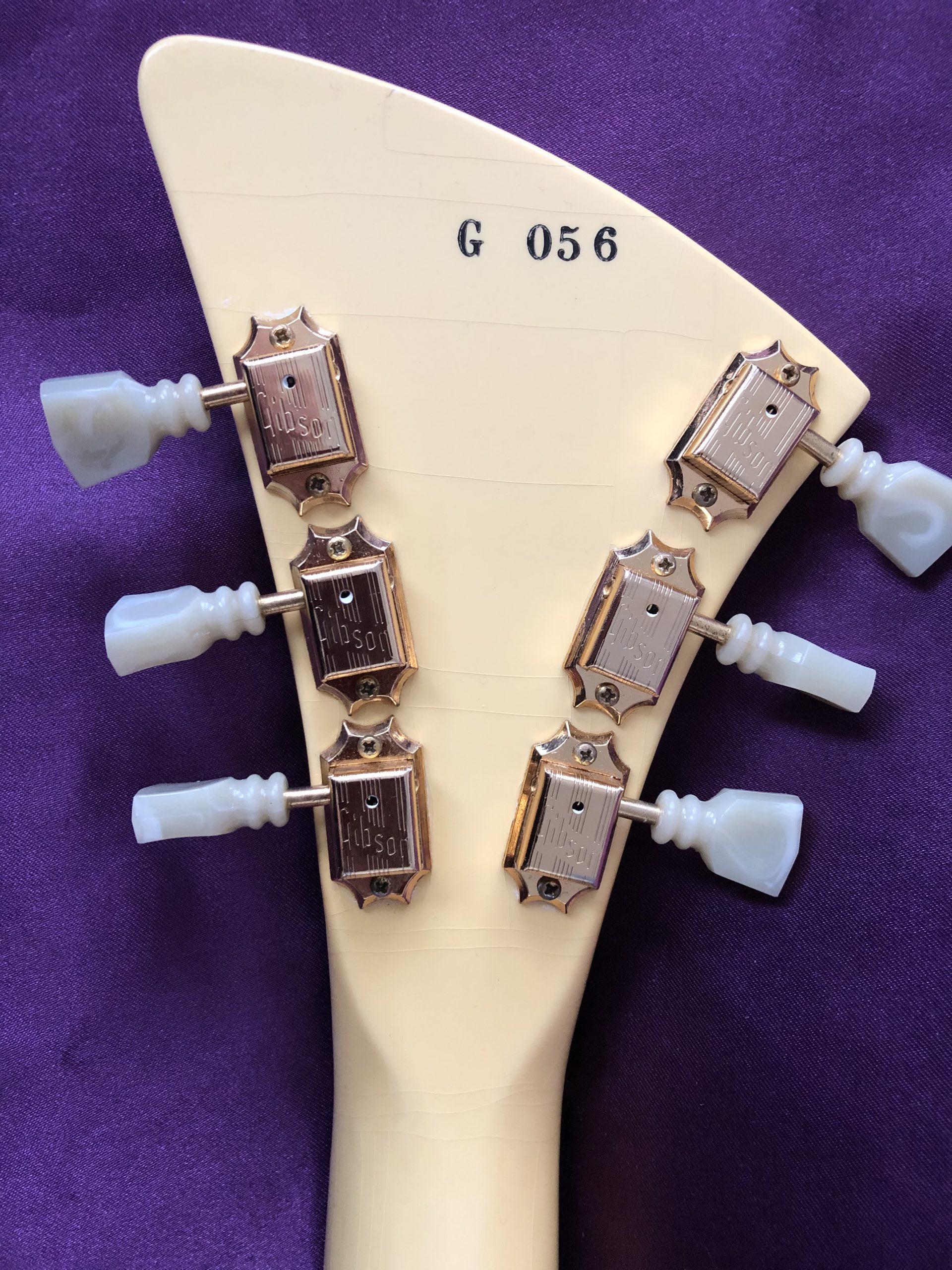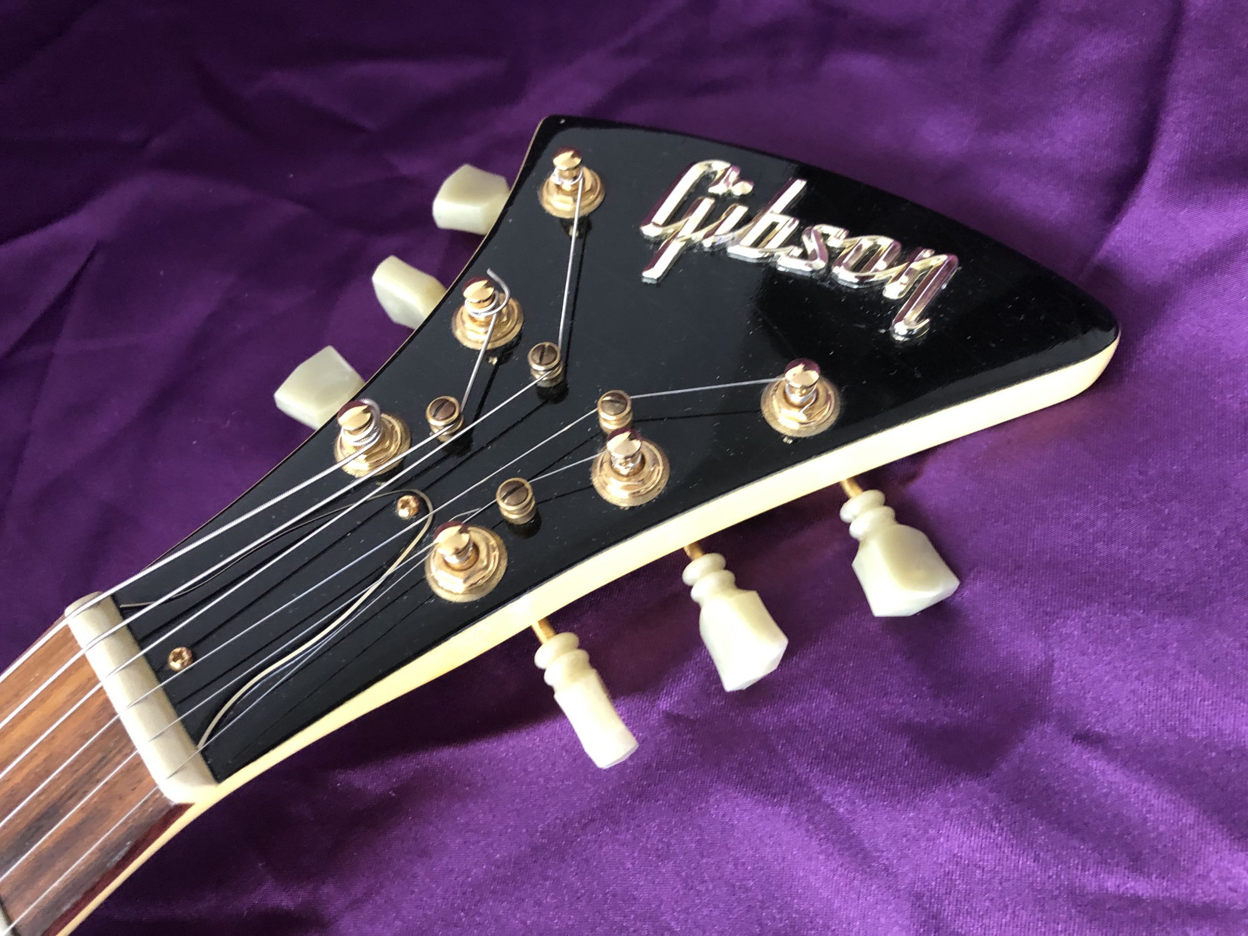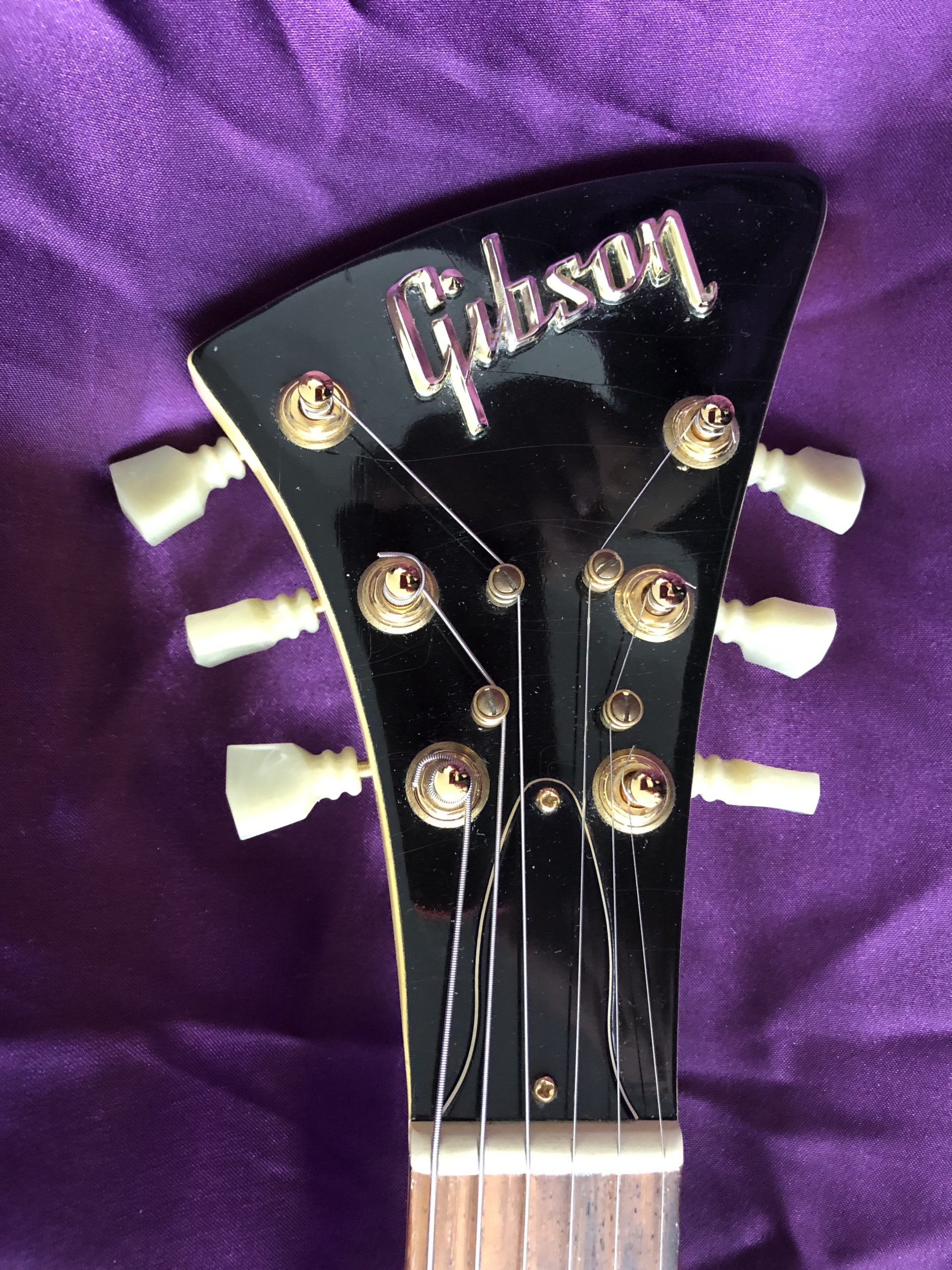 - Oversized asymmetric ‘Gumby’ headstock with raised gold Gibson logo and 4 string tees