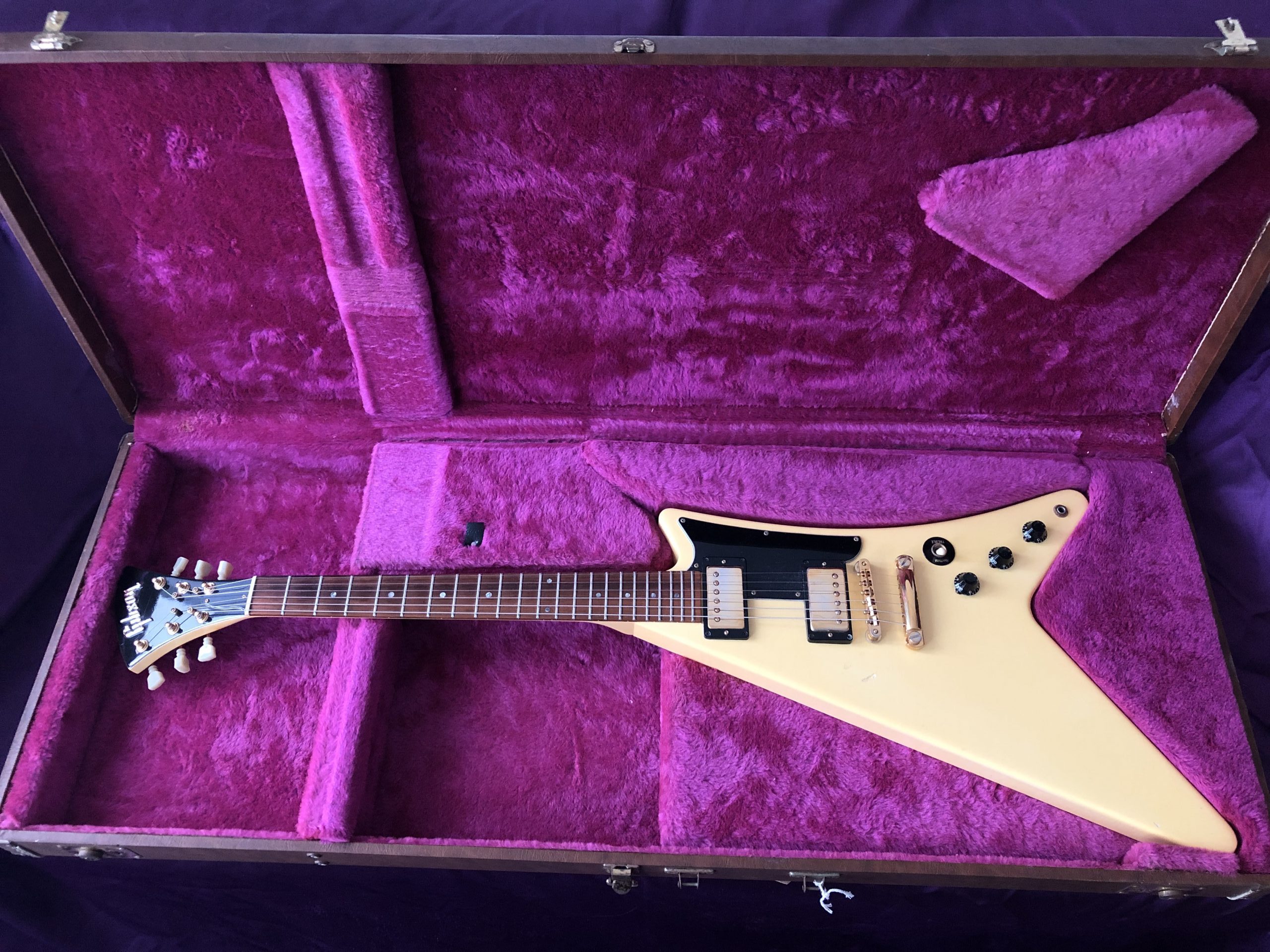 Wow! Now this super rare 1982 Gibson Moderne is extremely cool, albeit a bit aesthetically divisive. Is it an ‘ugly duckling’ or an underappreciated classic? Beauty, as they say, is in the eye of the beholder and that may very well prove to be the case here. In addition, there were very few that were finished in solid white or black, as opposed to the more common natural finish. Although described as white, it is more of a buttery creamy/ivory/custardy colour. The only vintage Moderne’s you can legitimately lay your hands on are these rare early 1980s ‘reissue’ models made at Gibson’s plant in Kalamazoo, Michigan. As the years pass, the scarcity and eccentricity has attracted a growing cult following. In use it feels light and comfortable despite its ungainly looks, certainly more ergonomic than its nearest relations, the Flying V and an Explorer. The Moderne’s tone wood is acoustically very resonant and this is reinforced when plugged in. Flying V/Explorer users will be well‑accustomed to the control layout too. In use, it plays well and sounds just as you would expect from a humbucker‑equipped Gibson, so it can do pretty much what most comparable solid body Gibsons can do. The whole playing experience is reassuringly familiar and you soon forget about the outline. This example is in excellent condition, apart from one noticeable mark on the front just above the bridge and some minor finish crazing. It even comes with its rare original fitted Gibson hard shell case. The Moderne is clearly not one for the traditionalists out there! It is certainly no shrinking violet and it just wouldn’t look right in a conservative function band setting. However, if you really want to stand out from the crowd and get noticed, the Moderne may well be an ideal instrument for you. The Gibson Moderne could easily now be described as post‑Moderne.