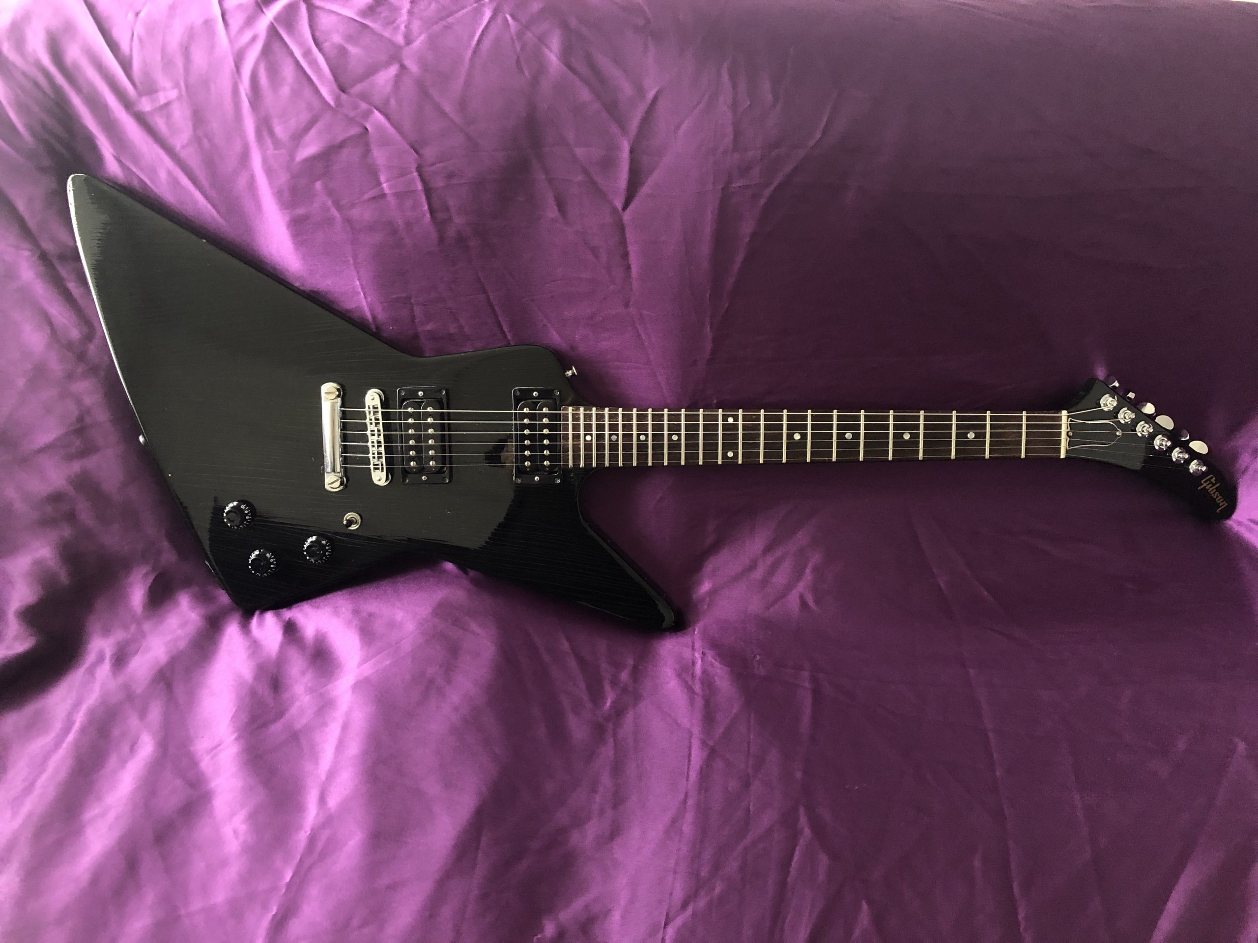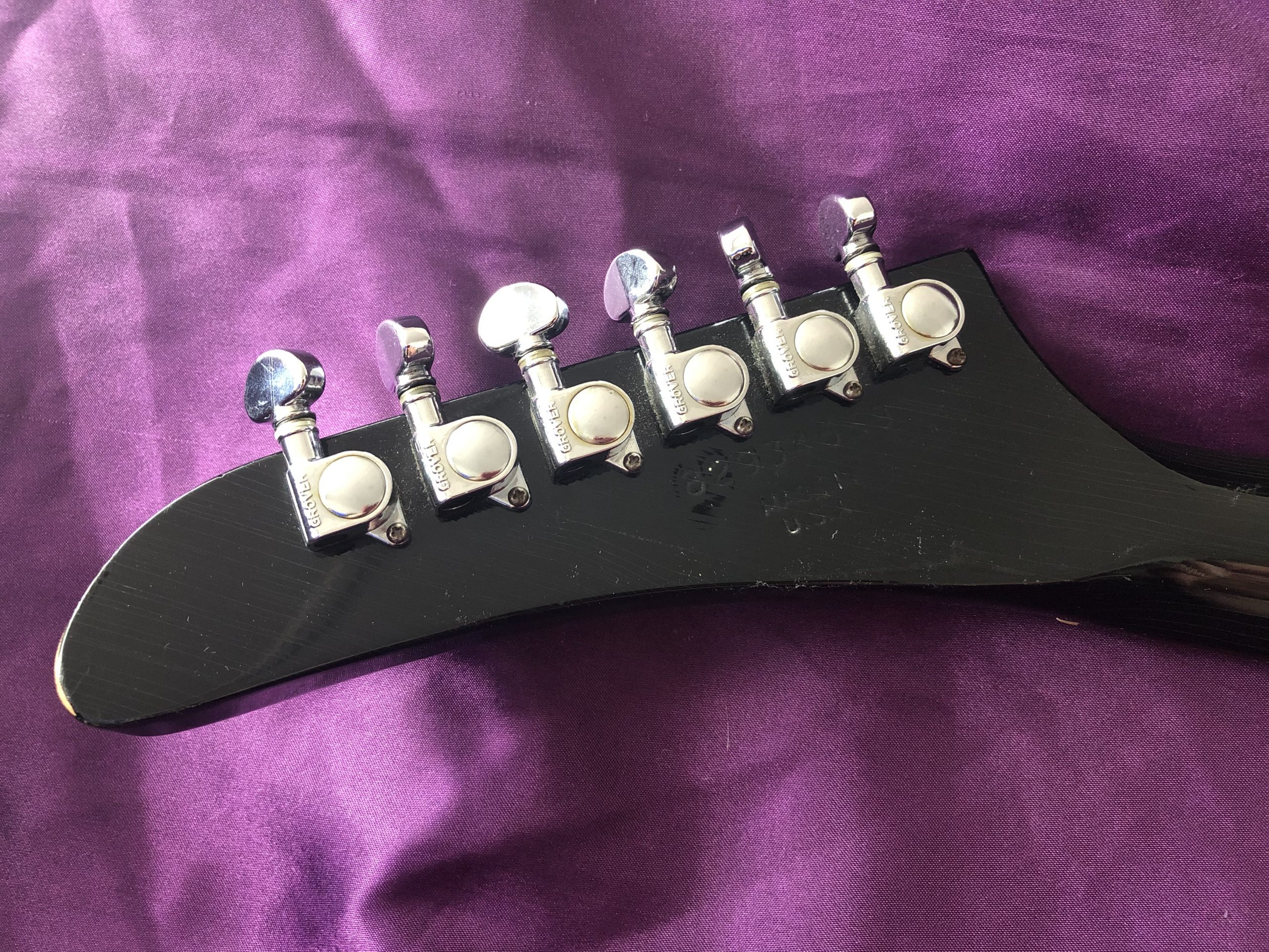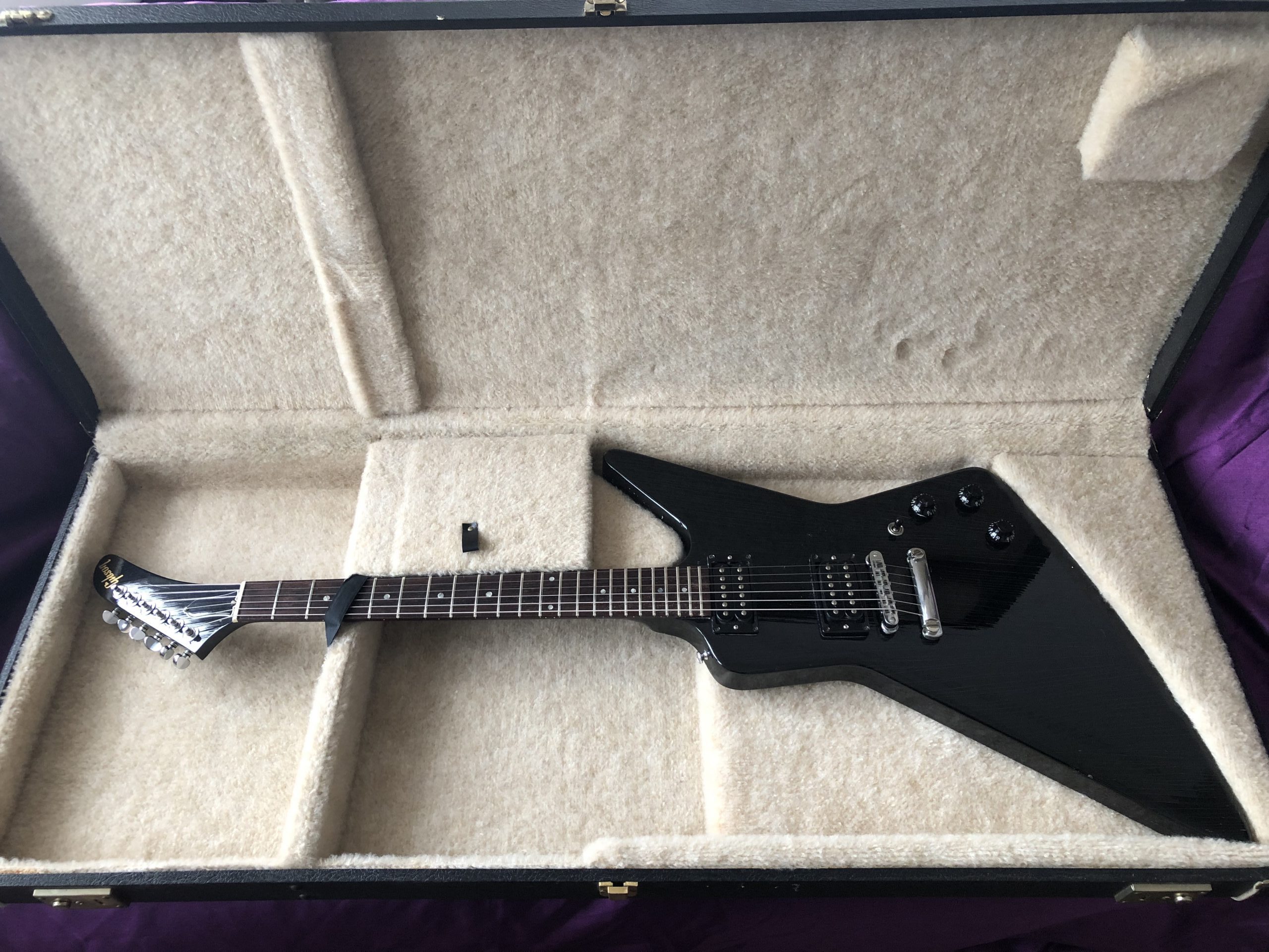 Darkness abounds! Here is a 1984 Gibson Explorer in almost gothic black about to creep up on you. If ever there was a quintessential pointy 1980s heavy metal ROCK guitar, it would probably look something like this. It is astounding to think that the Explorer was designed way back in 1958 and was a commercial disaster at the time! The approach that Gibson took here is quite straightforward – create a minimalist all‑black Explorer with chrome hardware – job done. This example is both darkly sinister and strikingly cool at the same time. The very desirable Gibson ‘Dirty Fingers’ humbucking pickups are extraordinarily powerful yet articulate and not at all muddy. They are confident, strong, gutsy and, as the name suggests, can get down and dirty when needed. The fabulous pickups ensure the guitar sounds incredible not only for hard rock but for just about any electric musical style that could be thrown at it. It is a very versatile guitar and by no means the one‑trick‑pony it may seem prima facie, which undermines just about all preconceptions of the model. This Explorer is typical of the 1980s reinterpretation of the classic design, alder body, maple neck, no scratchplate and having the triangular control layout with the pickup selector switch adjacent to the knobs. A previous owner had temporarily fitted a Les Paul‑type scratchplate at one time (since removed), resulting in 3 small screw holes on the front. Why? Otherwise, she is in reasonable all‑original condition for her age, although the finish shows extensive nitrocellulose crazing all over the body and headstock and, weirdly, it almost looks as if it was intentional (it wasn’t), following the lines of the body as it does. This crazing wasn’t actually uncommon for guitars from this period. Old black finishes can also be notorious for showing any marks and imperfections, and this one is no different. If you can buy into the spec and the genuine ‘relic’ look, it works quite well. I think the imperfections suit it but perhaps that is just me. The construction makes it very strong, lightweight at just 6½lbs, and very comfortable to play with a great vibe, so grab one, turn the amp up to 11 and rock on.