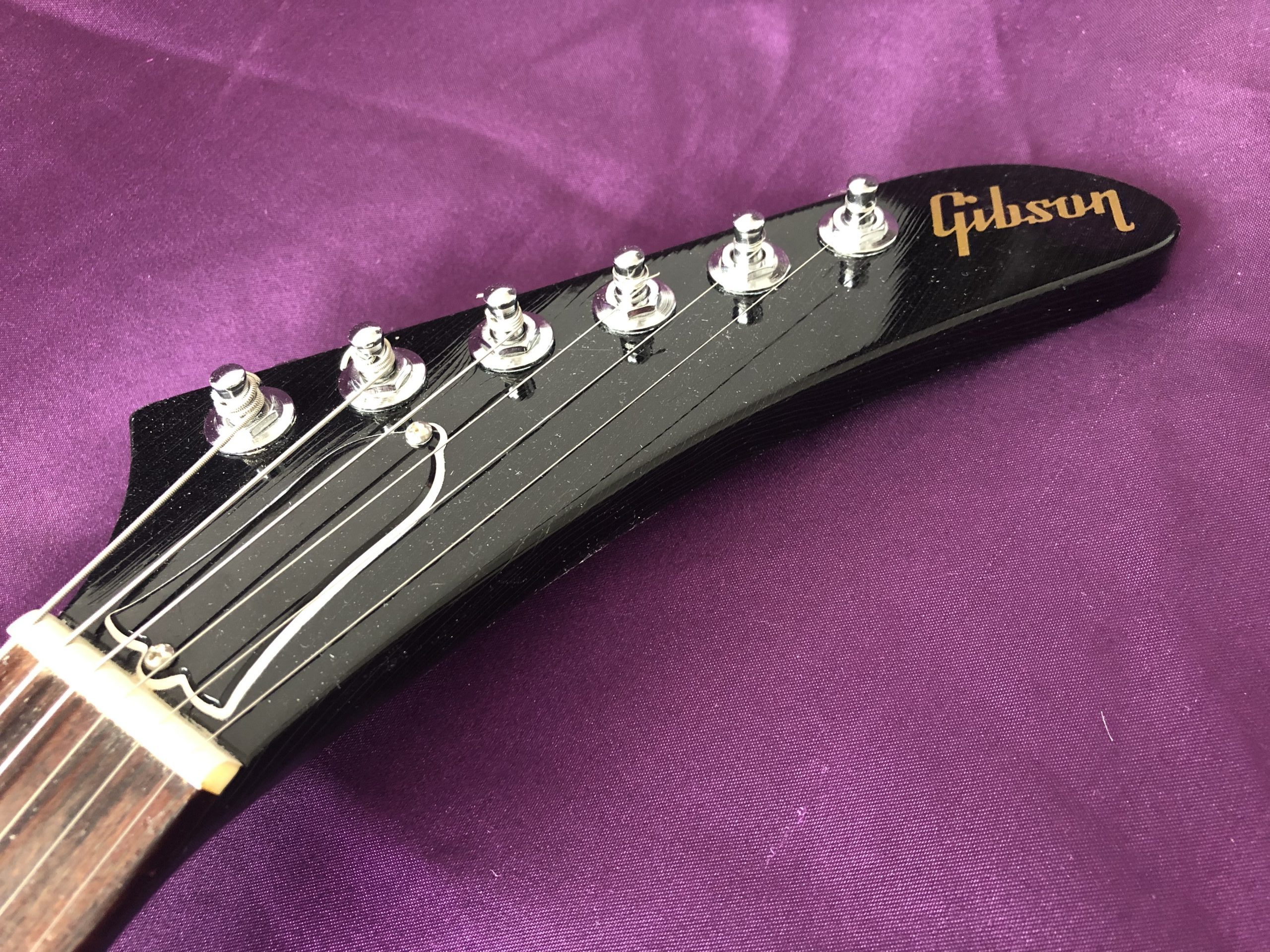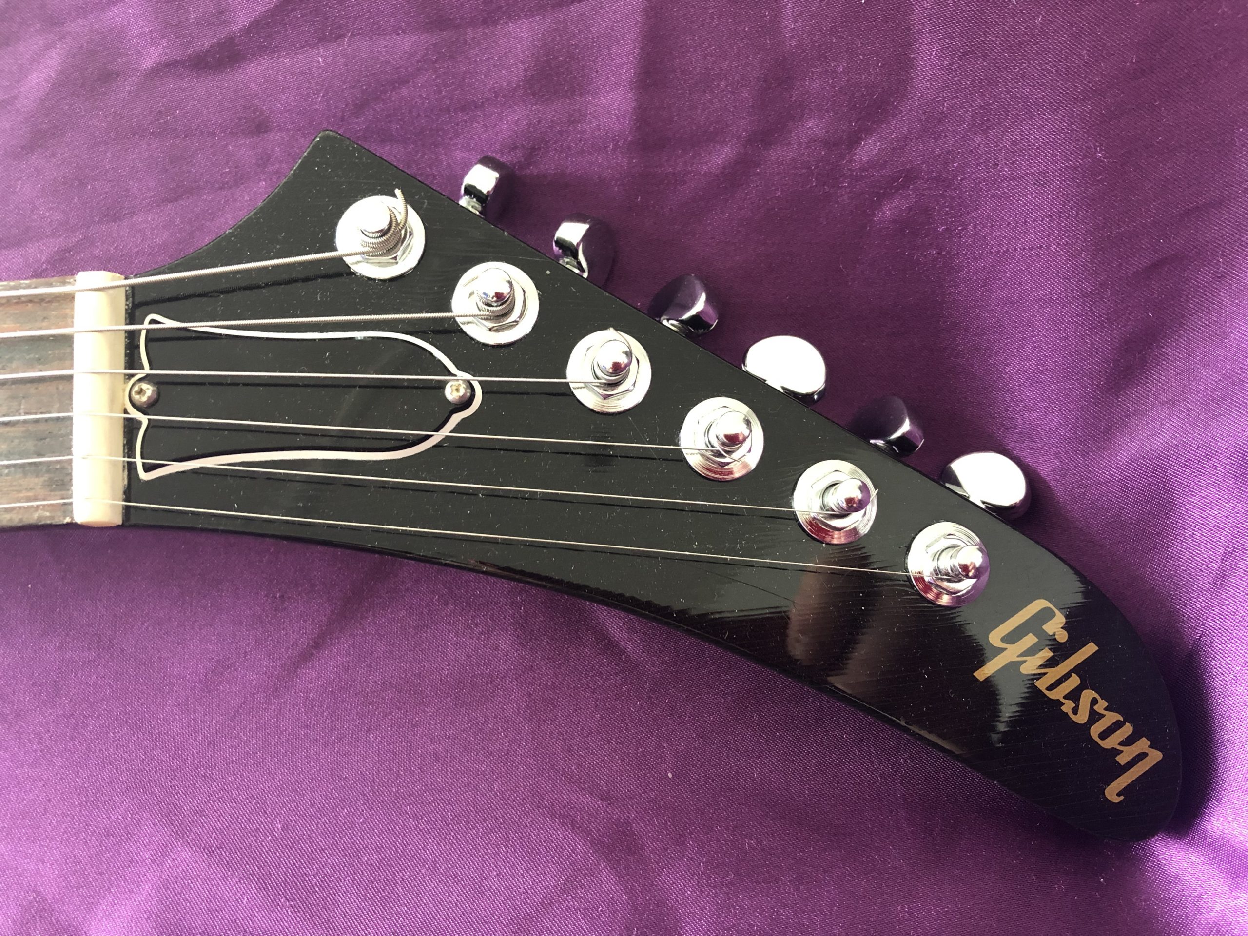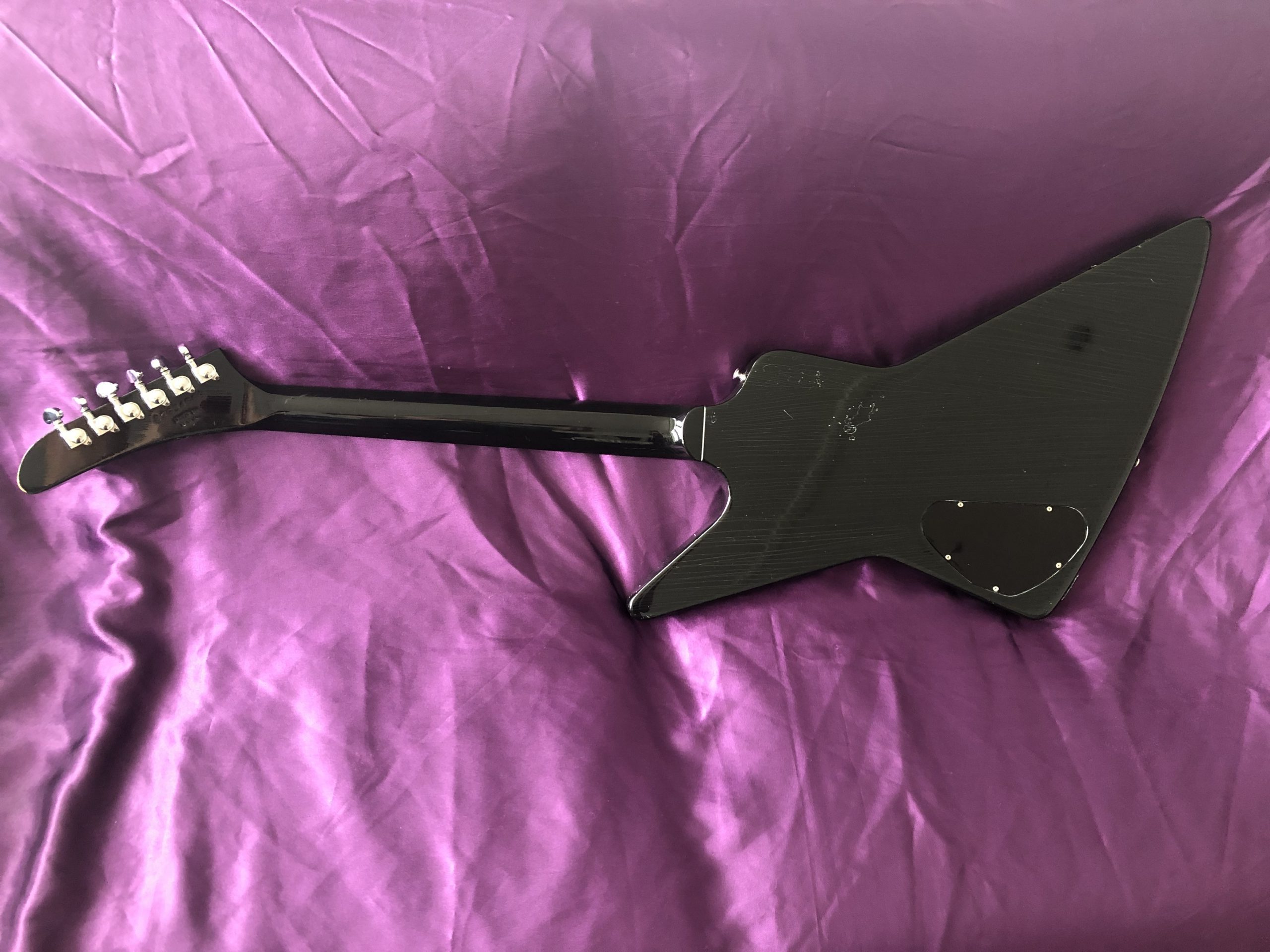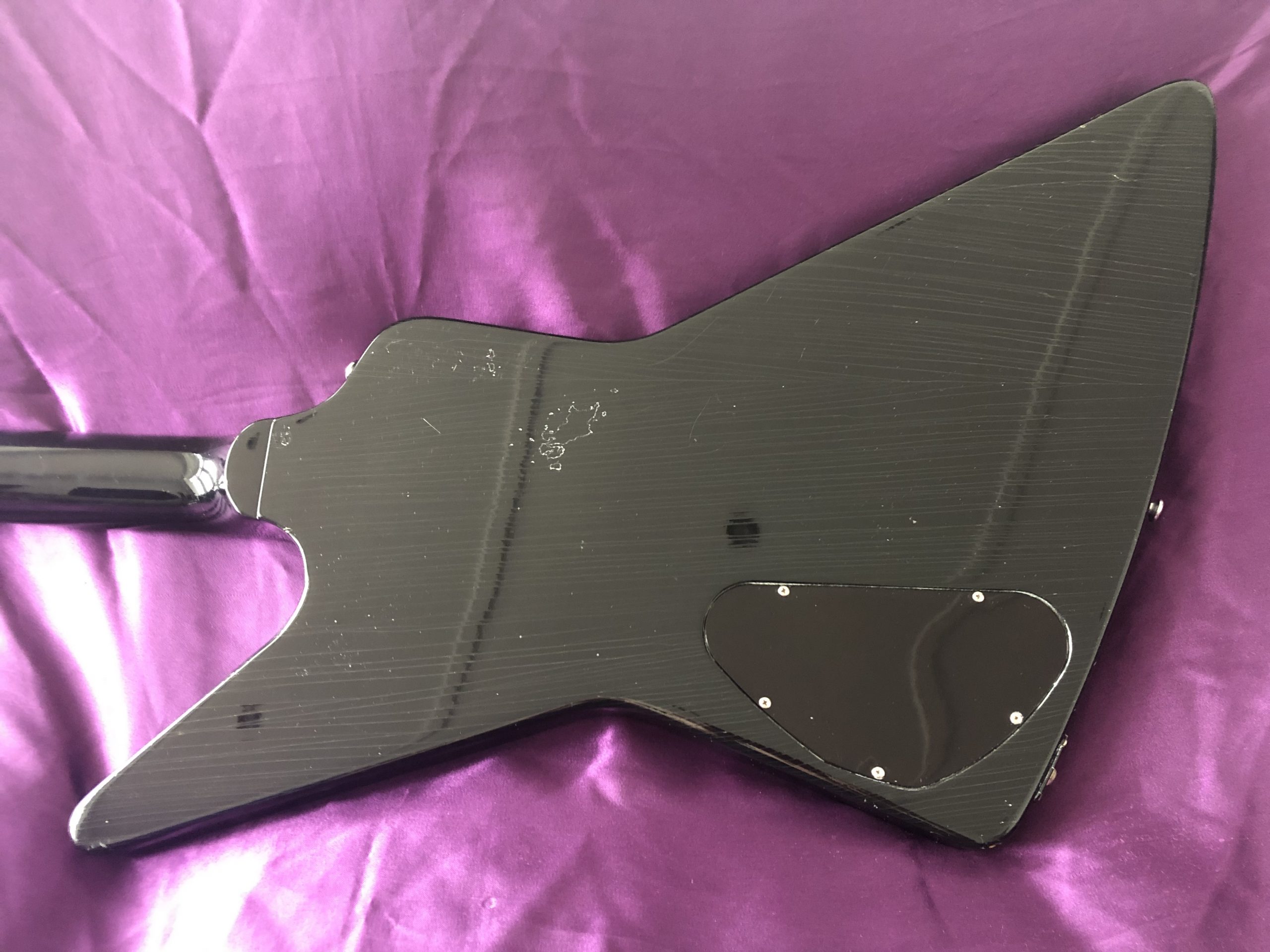 Darkness abounds! Here is a 1984 Gibson Explorer in almost gothic black about to creep up on you. If ever there was a quintessential pointy 1980s heavy metal ROCK guitar, it would probably look something like this. It is astounding to think that the Explorer was designed way back in 1958 and was a commercial disaster at the time! The approach that Gibson took here is quite straightforward – create a minimalist all‑black Explorer with chrome hardware – job done. This example is both darkly sinister and strikingly cool at the same time. The very desirable Gibson ‘Dirty Fingers’ humbucking pickups are extraordinarily powerful yet articulate and not at all muddy. They are confident, strong, gutsy and, as the name suggests, can get down and dirty when needed. The fabulous pickups ensure the guitar sounds incredible not only for hard rock but for just about any electric musical style that could be thrown at it. It is a very versatile guitar and by no means the one‑trick‑pony it may seem prima facie, which undermines just about all preconceptions of the model. This Explorer is typical of the 1980s reinterpretation of the classic design, alder body, maple neck, no scratchplate and having the triangular control layout with the pickup selector switch adjacent to the knobs. A previous owner had temporarily fitted a Les Paul‑type scratchplate at one time (since removed), resulting in 3 small screw holes on the front. Why? Otherwise, she is in reasonable all‑original condition for her age, although the finish shows extensive nitrocellulose crazing all over the body and headstock and, weirdly, it almost looks as if it was intentional (it wasn’t), following the lines of the body as it does. This crazing wasn’t actually uncommon for guitars from this period. Old black finishes can also be notorious for showing any marks and imperfections, and this one is no different. If you can buy into the spec and the genuine ‘relic’ look, it works quite well. I think the imperfections suit it but perhaps that is just me. The construction makes it very strong, lightweight at just 6½lbs, and very comfortable to play with a great vibe, so grab one, turn the amp up to 11 and rock on.