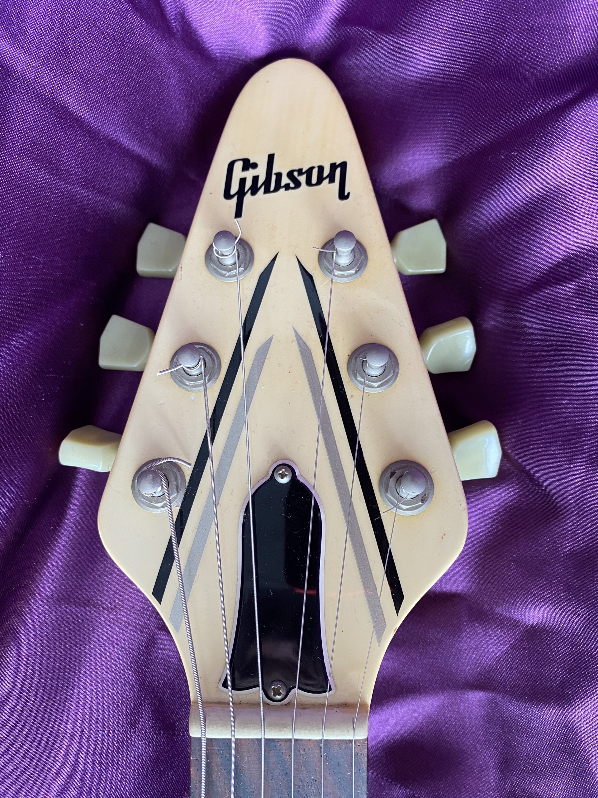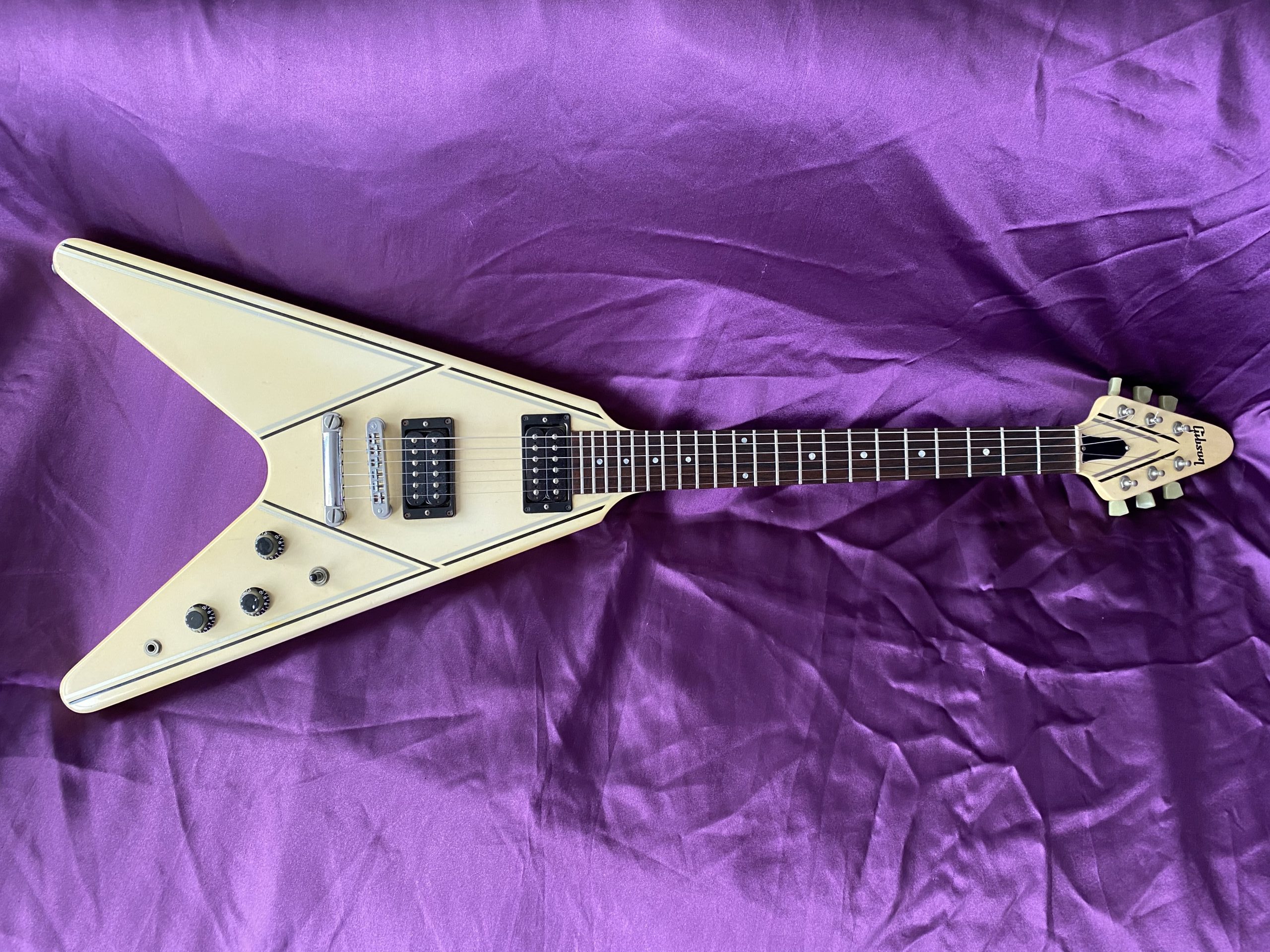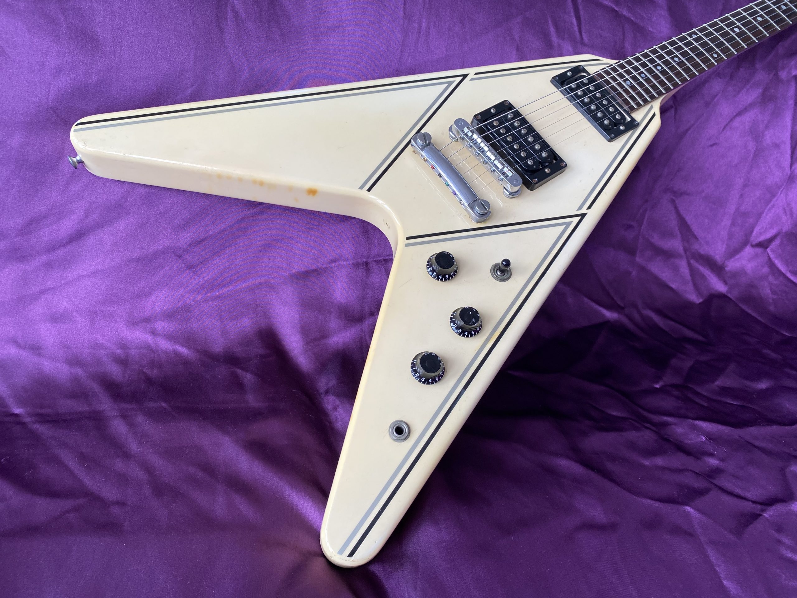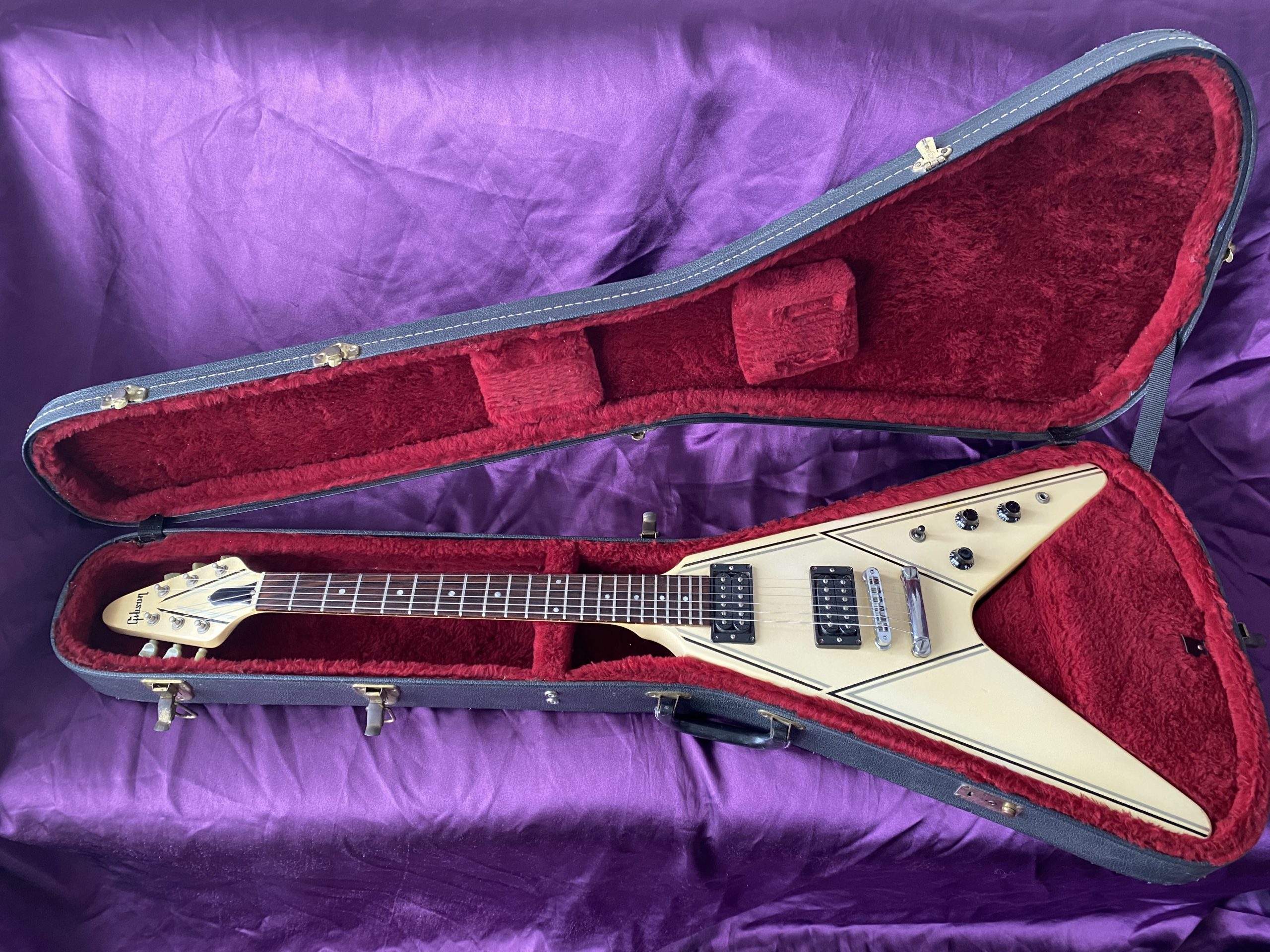 ‘I’m Mandy – Fly Me’. Landing at CRAVE Guitars is this fantastically cool 1984 Gibson Flying V, one of the company’s short‑lived but very distinctive ‘Designer Series’ models. These particular guitars are relatively scarce in the UK and I had to import this one from Florida in the USA. Thankfully, CITES regulations introduced in 2017 have been relaxed and no longer inhibit rosewood used in finished guitars from being traded across international borders. The combination of exchange rates, customs duty, VAT and fees, however, means that it cost significantly more than it is actually worth. Thankfully, I am not motivated by profit or ‘return on investment’, which is just as well, as I’ll probably never recover its value. Basically, I was on the lookout for a great Flying V and, thankfully, I bit the bullet. The ‘Designer Series’ was a bit of an experiment for Gibson, comprising a limited‑run of custom finishes. This specific Custom Graphic design is called ‘Style 31’ (ivory with black and silver pin‑stripes), one of just three special finishes available for Flying Vs in 1984. The unique and somewhat understated design cleverly accentuates the Flying V’s otherwise aggressive lines and was ideally suited to the 1980s ‘hair metal’ music scene. The original uncovered ‘Dirty Fingers’ pickups are simply superb, producing high power but retaining a clear articulate timbre, much more versatile than they might first appear. The whole package is ideal for classic and hard rock styles as well as venturing capably into blues, funk and country. Many Flying Vs and Explorers have had the pickups stripped out and replaced with aftermarket alternatives, which was a popular thing to do at the time. This one has thankfully remained all‑original and untouched, including its OHSC. The alder body makes this a light weight guitar compared to its more traditional mahogany peers as well. Like all Flying Vs, they are a pain to play sitting down but that’s par for the course. The neck is very comfortable and great to play. The old‑school Kluson tuners are rare to find as originals on this model. This V is completely stock and in excellent condition for its age, with a couple of small nicks and finish discolouration to give it a lightly aged look. It has probably spent quite a lot of its life hidden away in its case which is sad. A Flying V is clearly a guitar for confident exhibitionists rather than conservative shrinking violets with musical tastes to match. With a cool and rare Gibson Flying V Designer Series, one certainly stands out from the plain (or should that be plane) multitude. Get ready for take‑off.