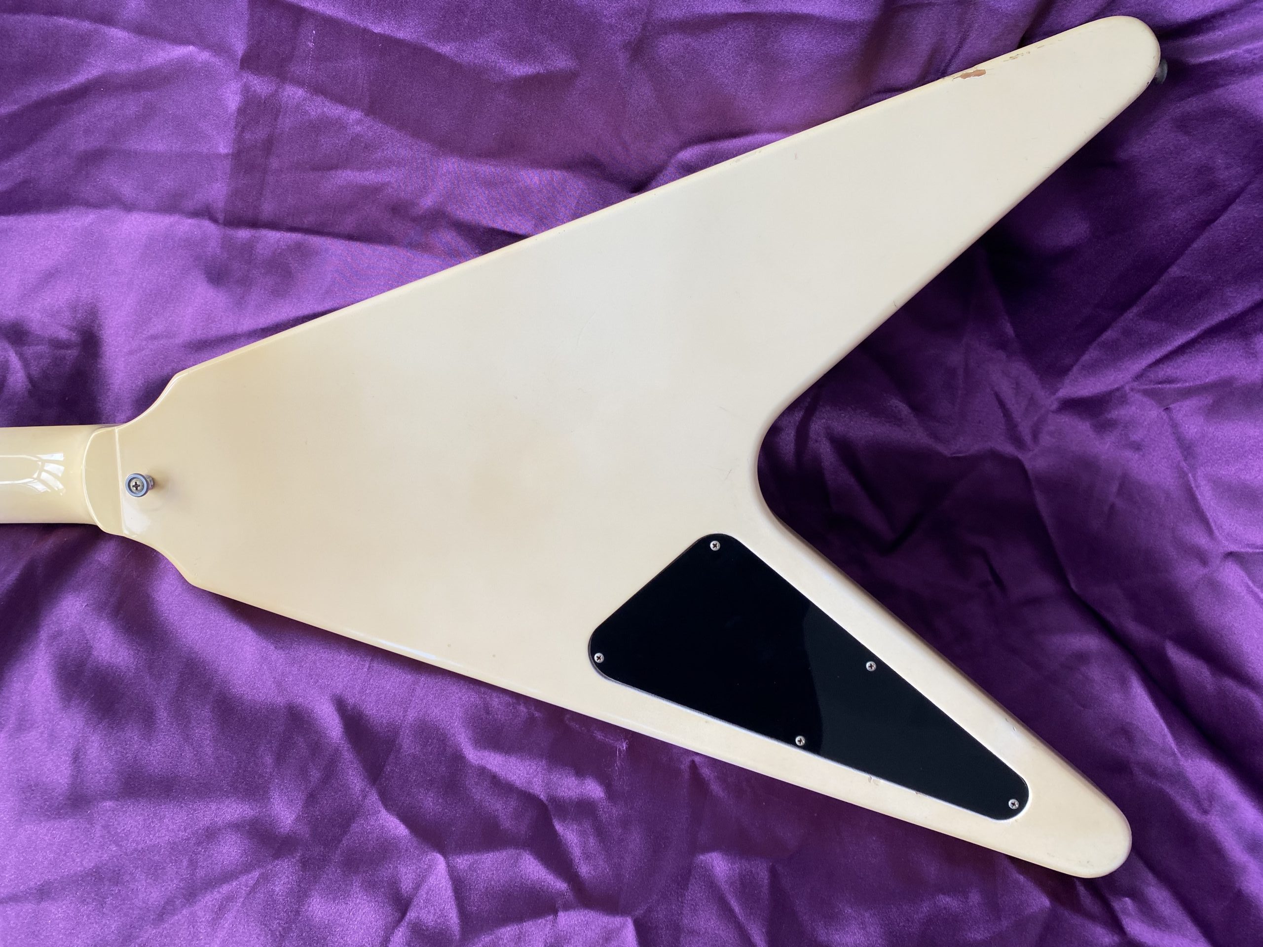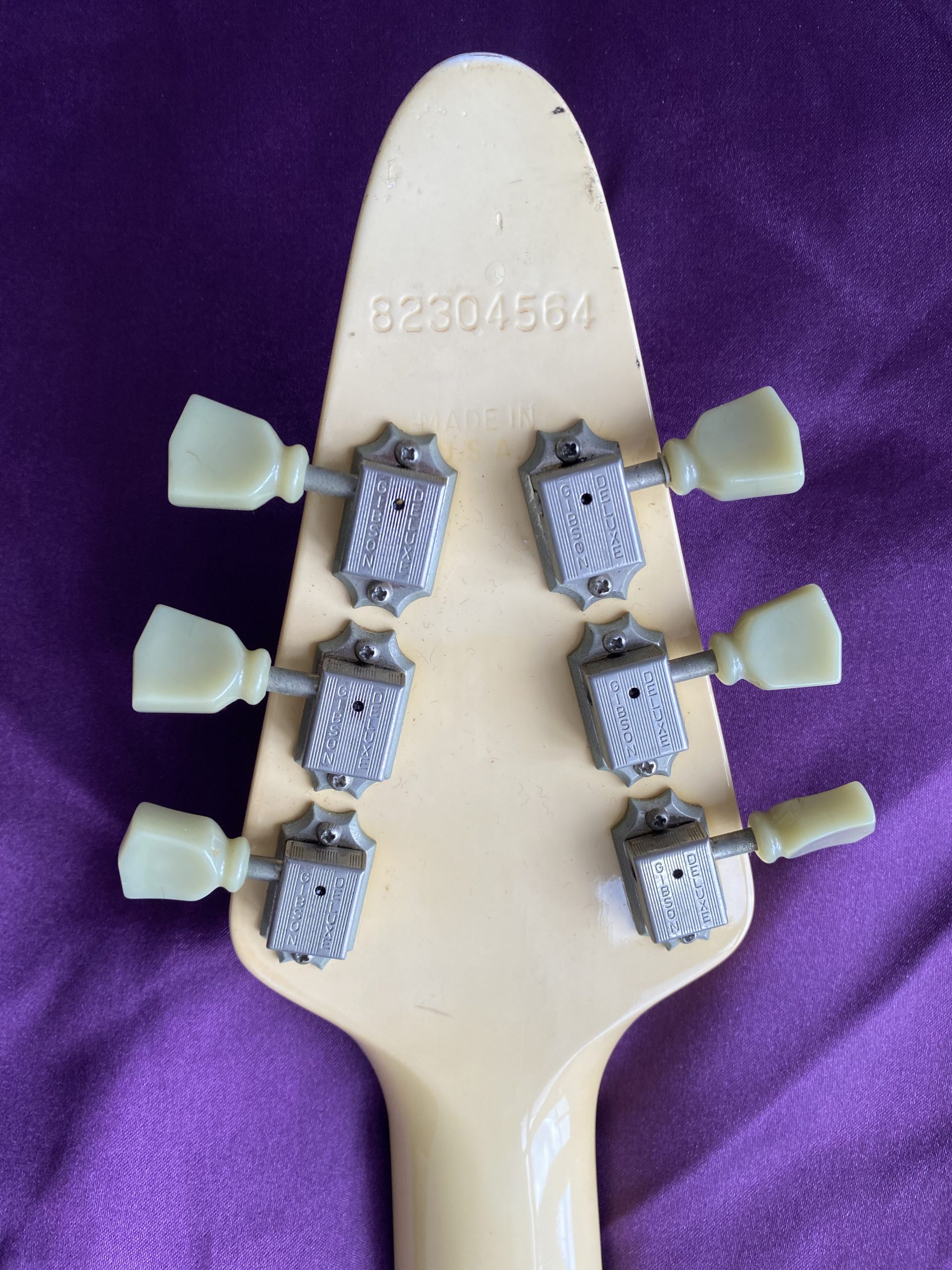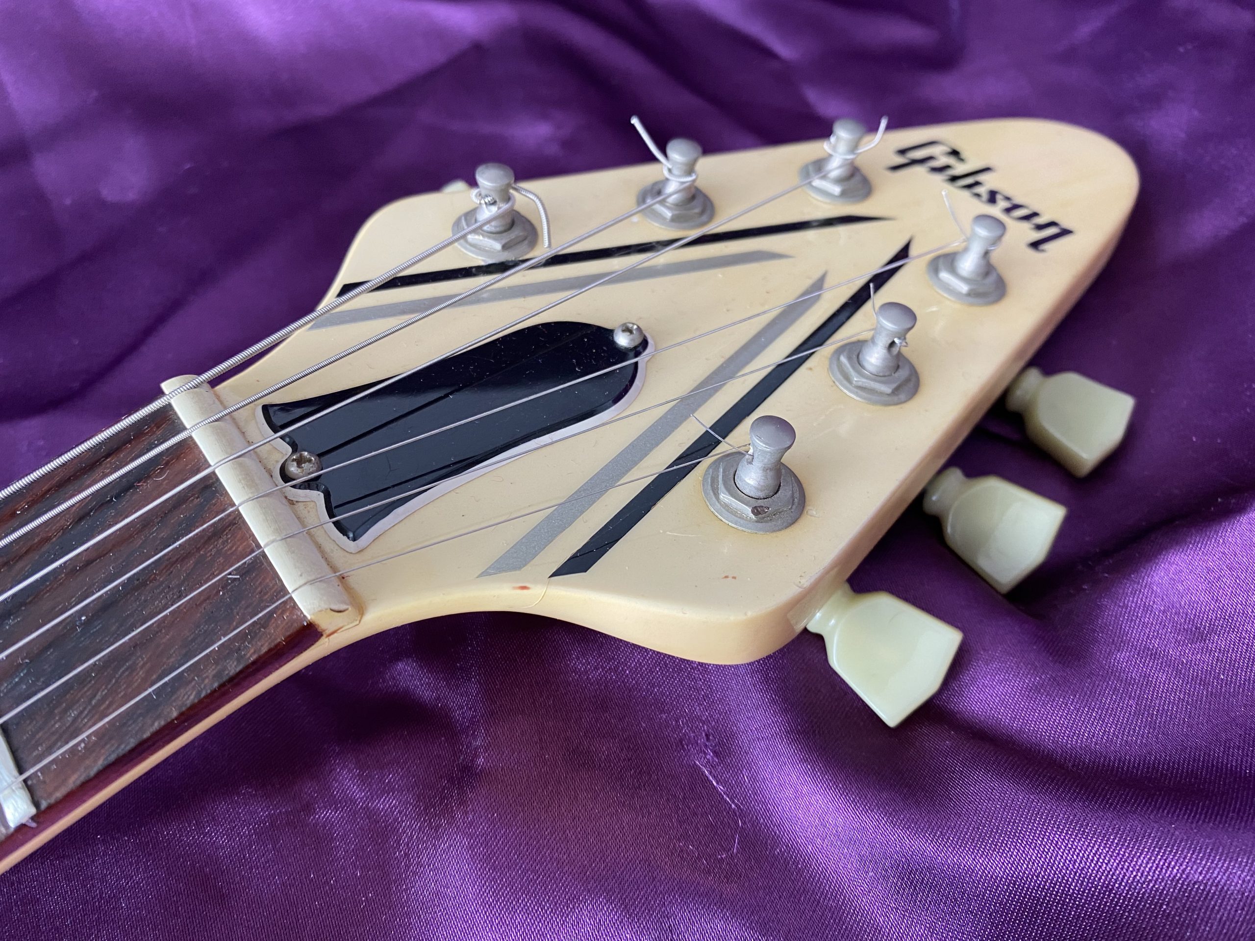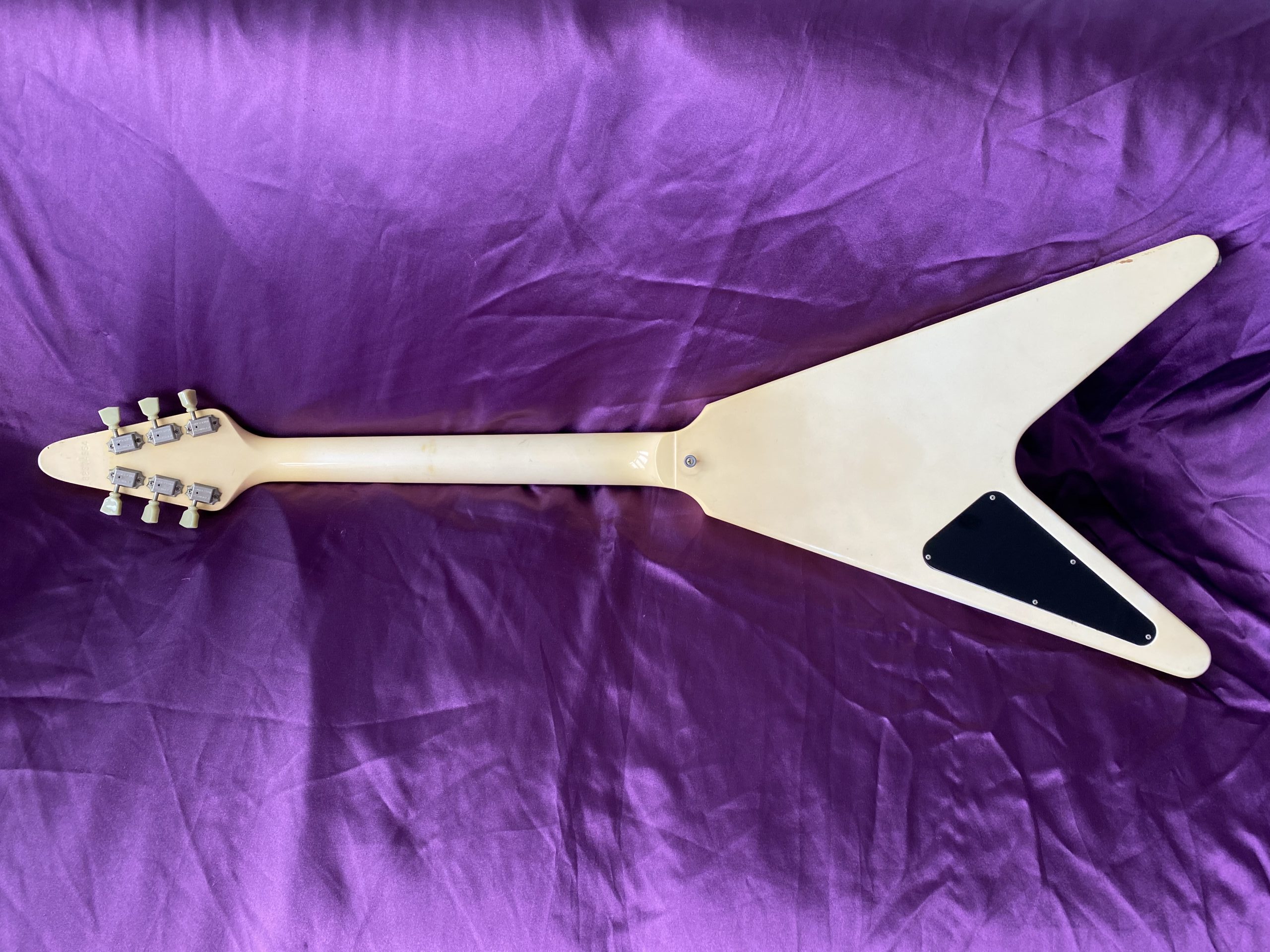 ‘I’m Mandy – Fly Me’. Landing at CRAVE Guitars is this fantastically cool 1984 Gibson Flying V, one of the company’s short‑lived but very distinctive ‘Designer Series’ models. These particular guitars are relatively scarce in the UK and I had to import this one from Florida in the USA. Thankfully, CITES regulations introduced in 2017 have been relaxed and no longer inhibit rosewood used in finished guitars from being traded across international borders. The combination of exchange rates, customs duty, VAT and fees, however, means that it cost significantly more than it is actually worth. Thankfully, I am not motivated by profit or ‘return on investment’, which is just as well, as I’ll probably never recover its value. Basically, I was on the lookout for a great Flying V and, thankfully, I bit the bullet. The ‘Designer Series’ was a bit of an experiment for Gibson, comprising a limited‑run of custom finishes. This specific Custom Graphic design is called ‘Style 31’ (ivory with black and silver pin‑stripes), one of just three special finishes available for Flying Vs in 1984. The unique and somewhat understated design cleverly accentuates the Flying V’s otherwise aggressive lines and was ideally suited to the 1980s ‘hair metal’ music scene. The original uncovered ‘Dirty Fingers’ pickups are simply superb, producing high power but retaining a clear articulate timbre, much more versatile than they might first appear. The whole package is ideal for classic and hard rock styles as well as venturing capably into blues, funk and country. Many Flying Vs and Explorers have had the pickups stripped out and replaced with aftermarket alternatives, which was a popular thing to do at the time. This one has thankfully remained all‑original and untouched, including its OHSC. The alder body makes this a light weight guitar compared to its more traditional mahogany peers as well. Like all Flying Vs, they are a pain to play sitting down but that’s par for the course. The neck is very comfortable and great to play. The old‑school Kluson tuners are rare to find as originals on this model. This V is completely stock and in excellent condition for its age, with a couple of small nicks and finish discolouration to give it a lightly aged look. It has probably spent quite a lot of its life hidden away in its case which is sad. A Flying V is clearly a guitar for confident exhibitionists rather than conservative shrinking violets with musical tastes to match. With a cool and rare Gibson Flying V Designer Series, one certainly stands out from the plain (or should that be plane) multitude. Get ready for take‑off.